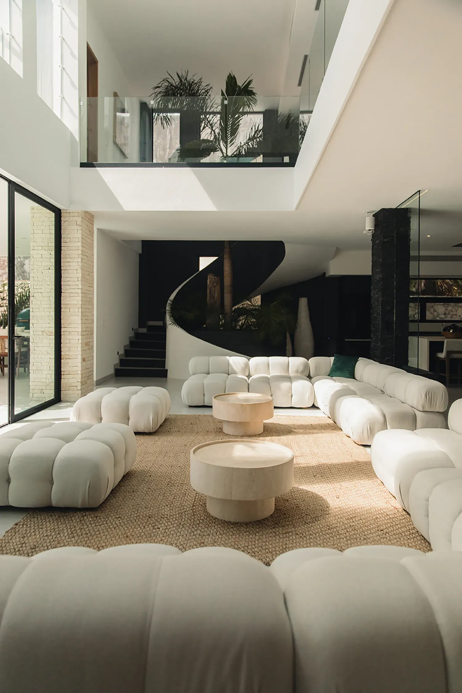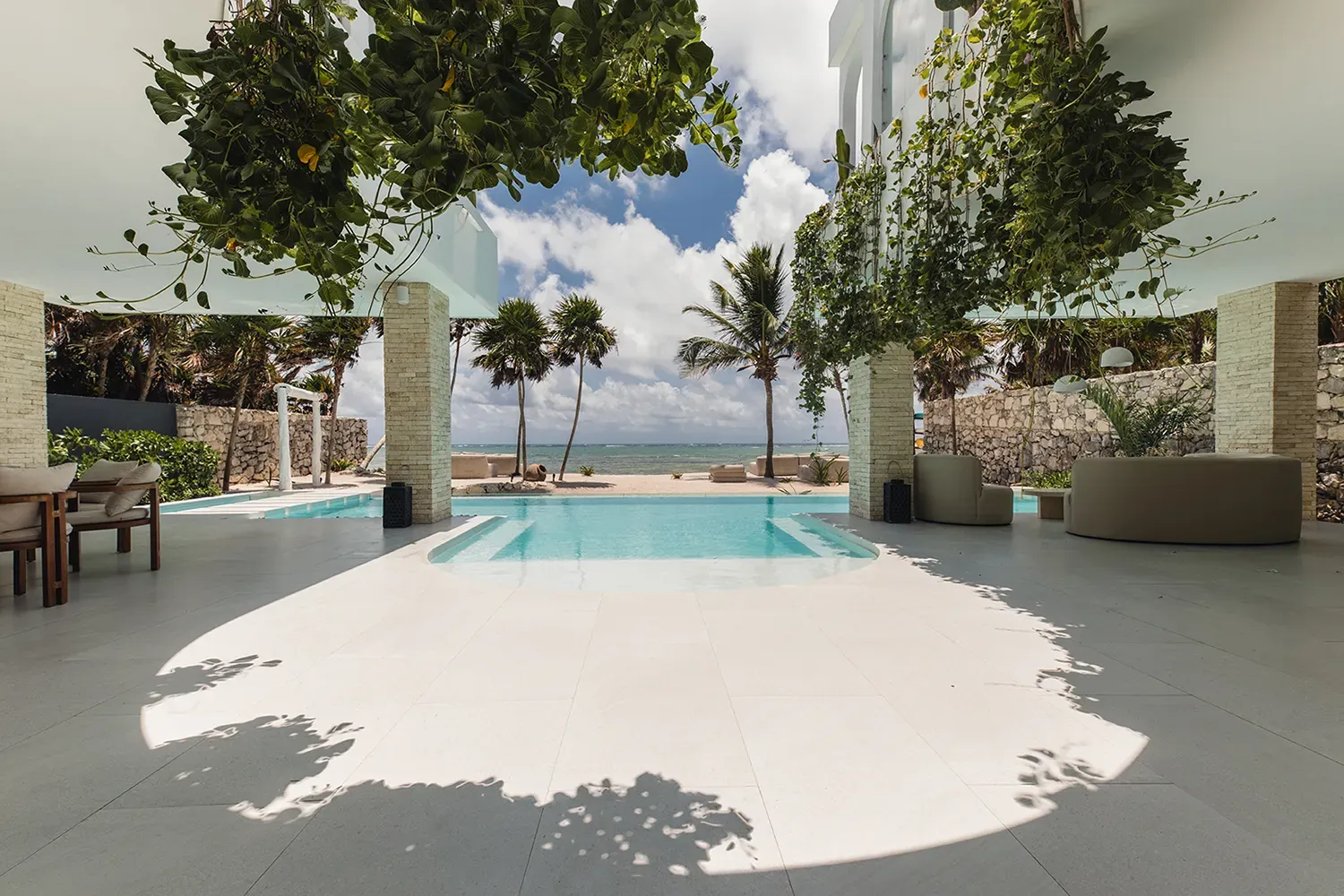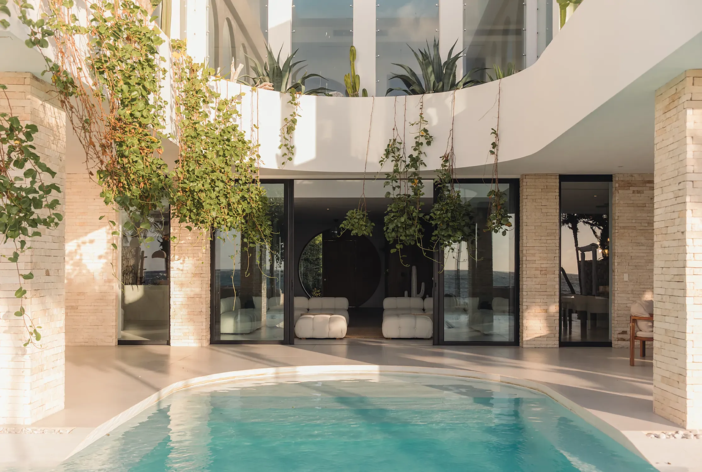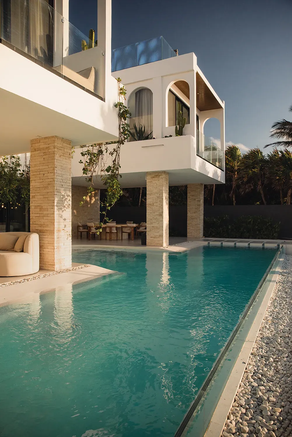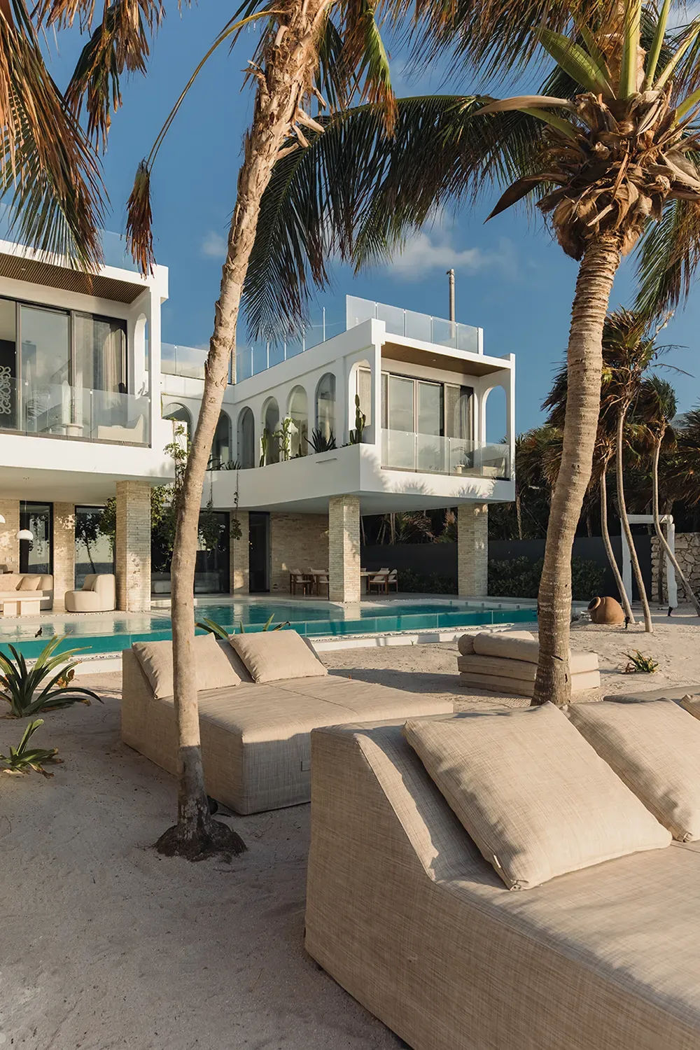 Studio 54 is a five-bedroom beachfront contemporary villa on Soliman Bay, Tulum, accommodating up to 10 guests across 800 square meters of architectural design that fuses clean modern lines with warm natural materials and a confident sense of showmanship. Named after the legendary New York nightclub, the villa is theatrical, comfortable, and unapologetically stylish — from the mirrored disco ball in the grand entryway to the floor-to-ceiling glass wine and champagne cellar built into the architecture beside the sculptural spiral staircase.