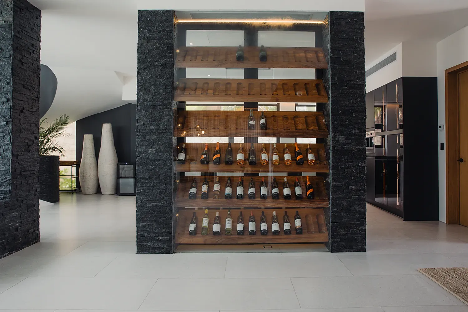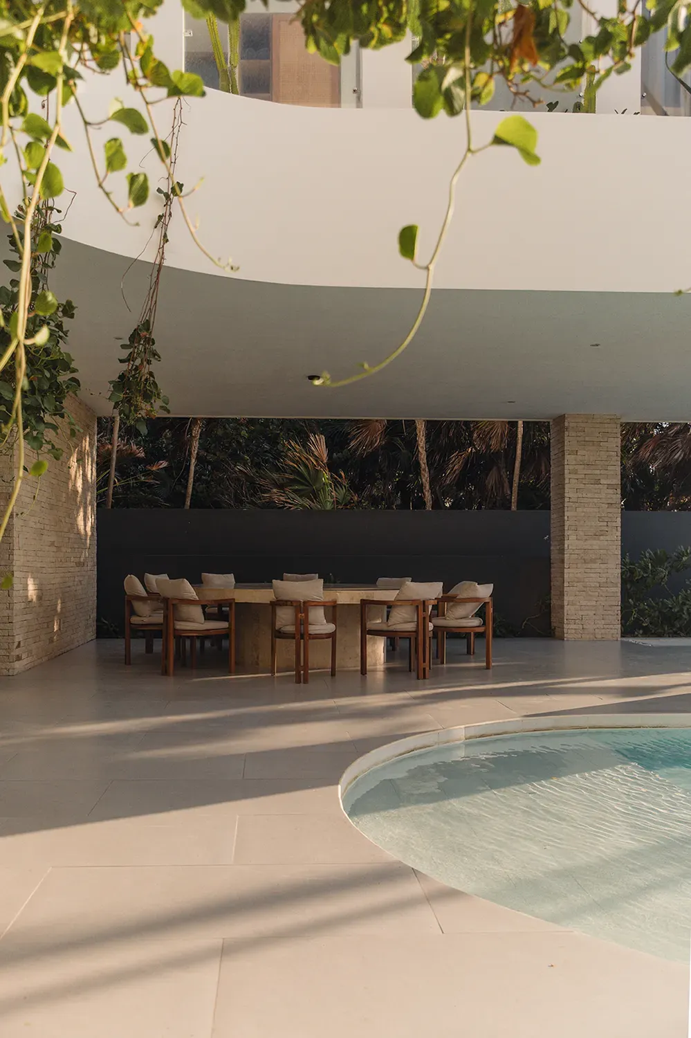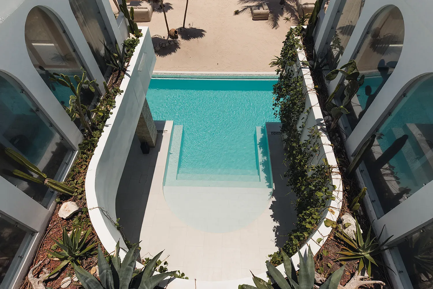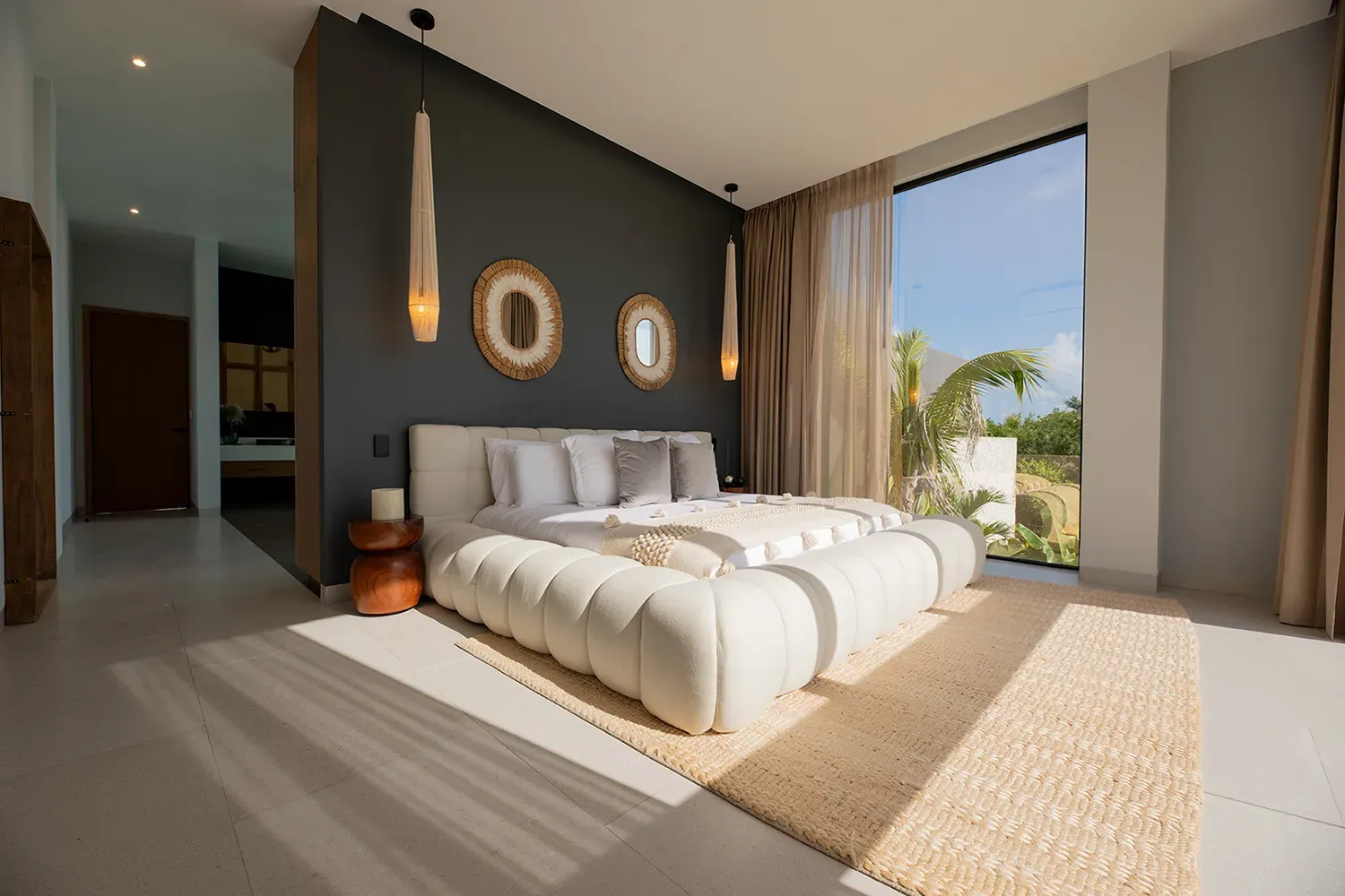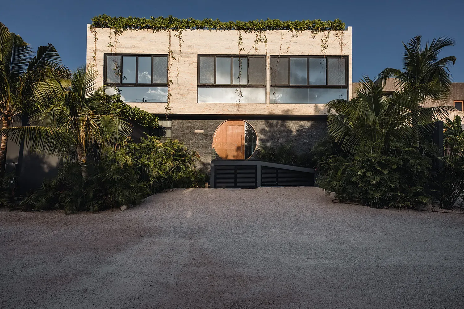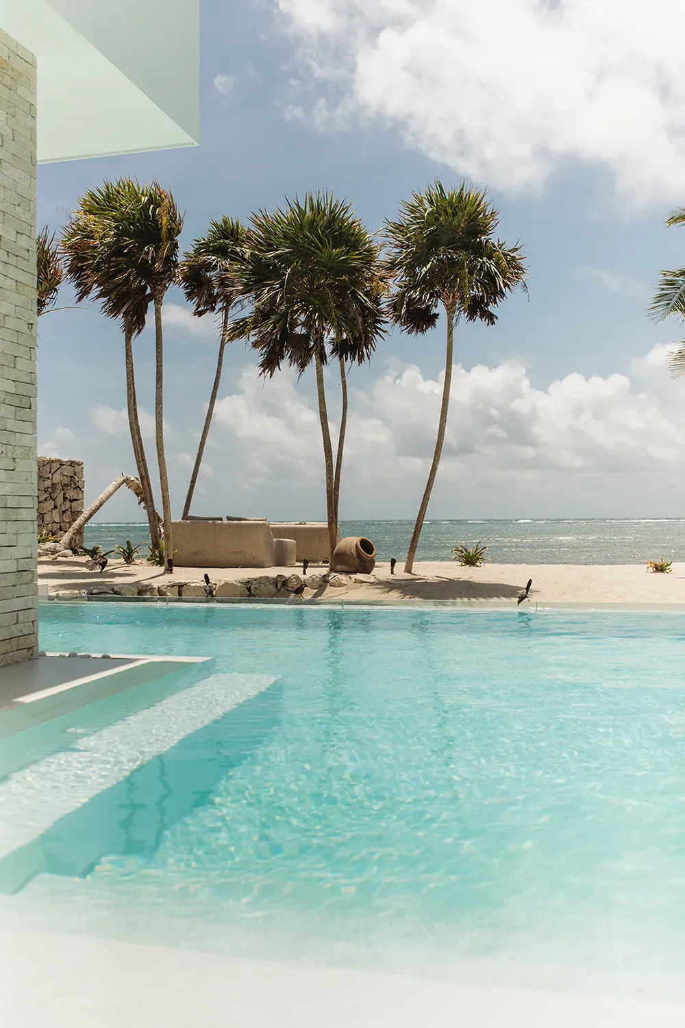 Studio 54 is a five-bedroom beachfront contemporary villa on Soliman Bay, Tulum, accommodating up to 10 guests across 800 square meters of architectural design that fuses clean modern lines with warm natural materials and a confident sense of showmanship. Named after the legendary New York nightclub, the villa is theatrical, comfortable, and unapologetically stylish — from the mirrored disco ball in the grand entryway to the floor-to-ceiling glass wine and champagne cellar built into the architecture beside the sculptural spiral staircase.