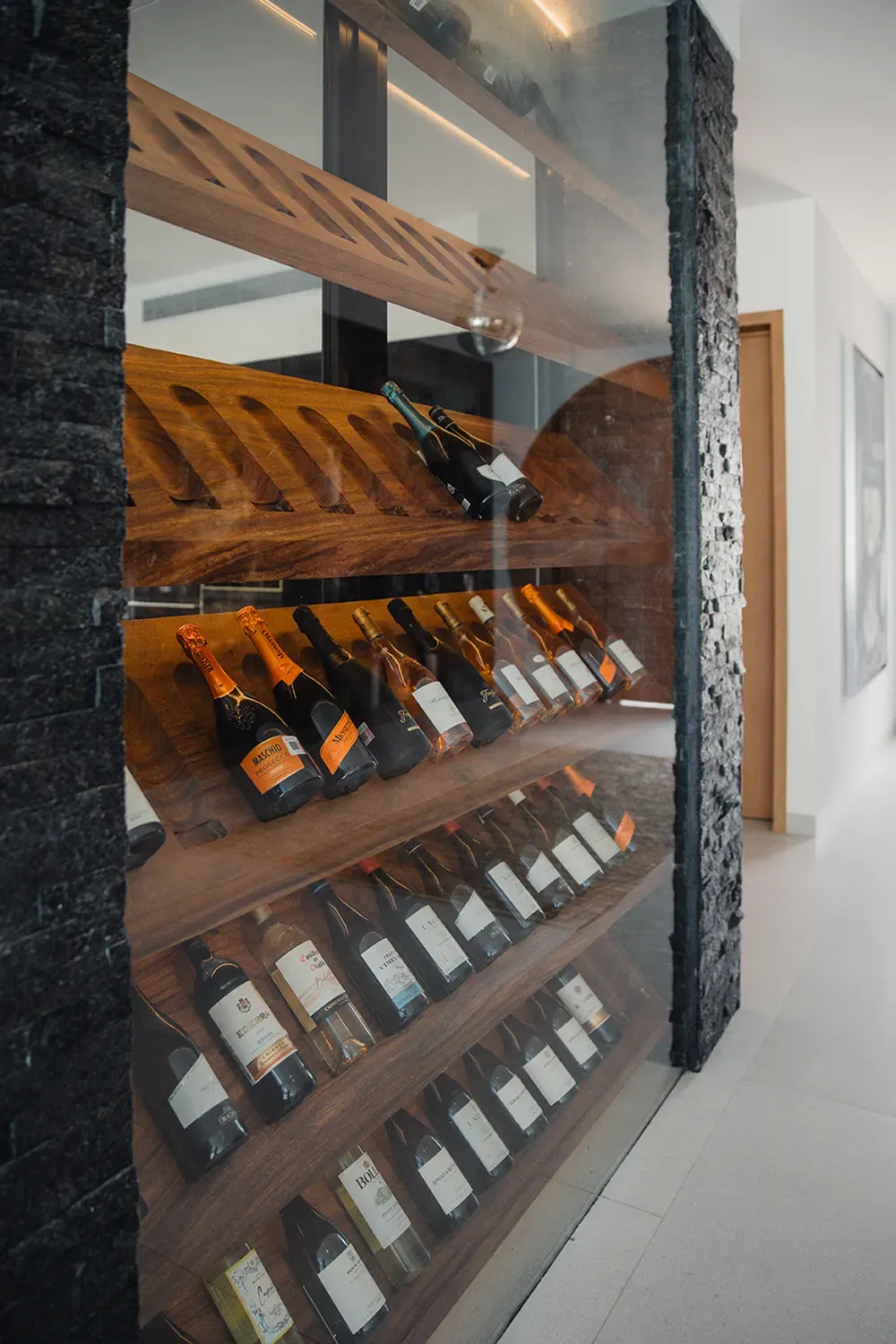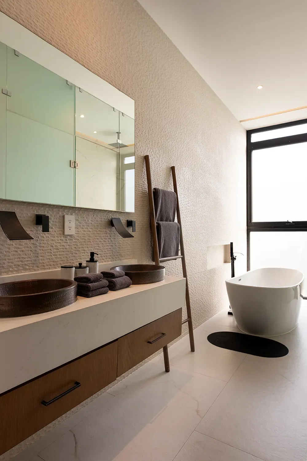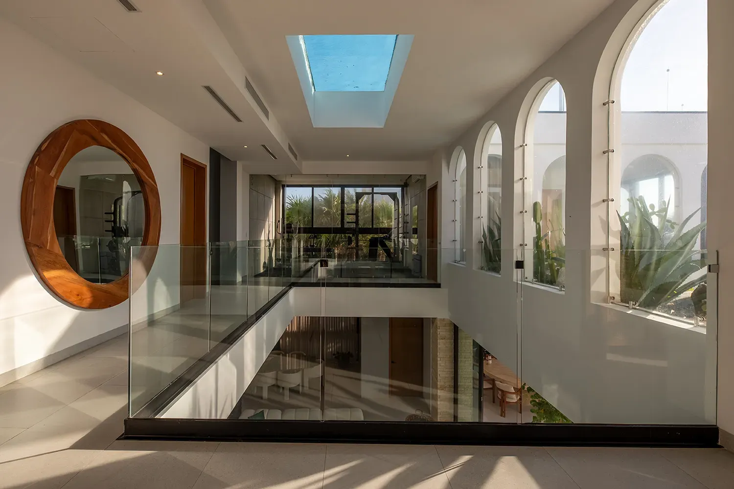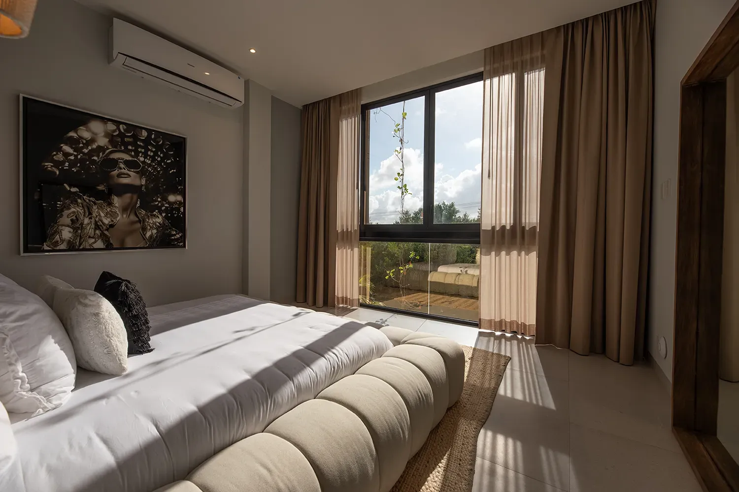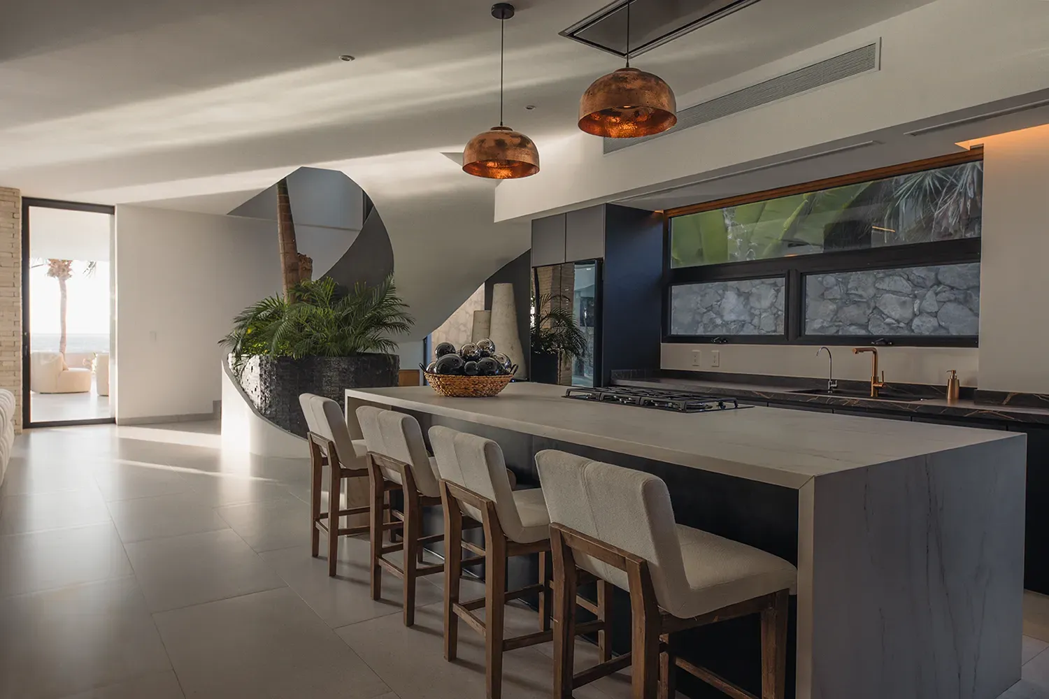 Studio 54 is a five-bedroom beachfront contemporary villa on Soliman Bay, Tulum, accommodating up to 10 guests across 800 square meters of architectural design that fuses clean modern lines with warm natural materials and a confident sense of showmanship. Named after the legendary New York nightclub, the villa is theatrical, comfortable, and unapologetically stylish — from the mirrored disco ball in the grand entryway to the floor-to-ceiling glass wine and champagne cellar built into the architecture beside the sculptural spiral staircase.