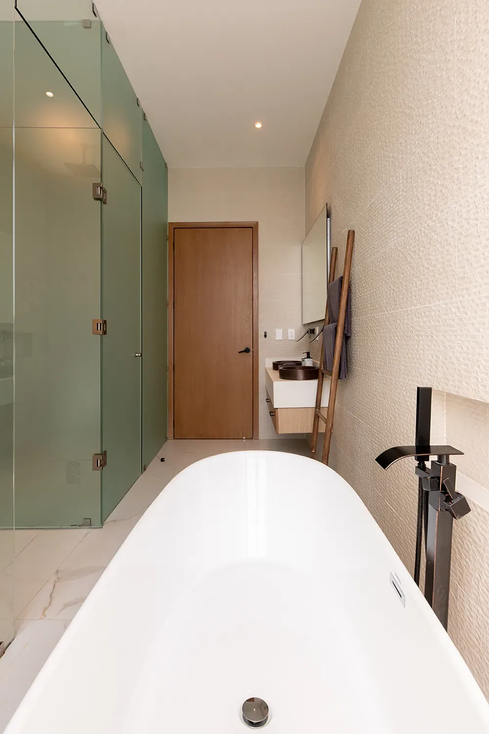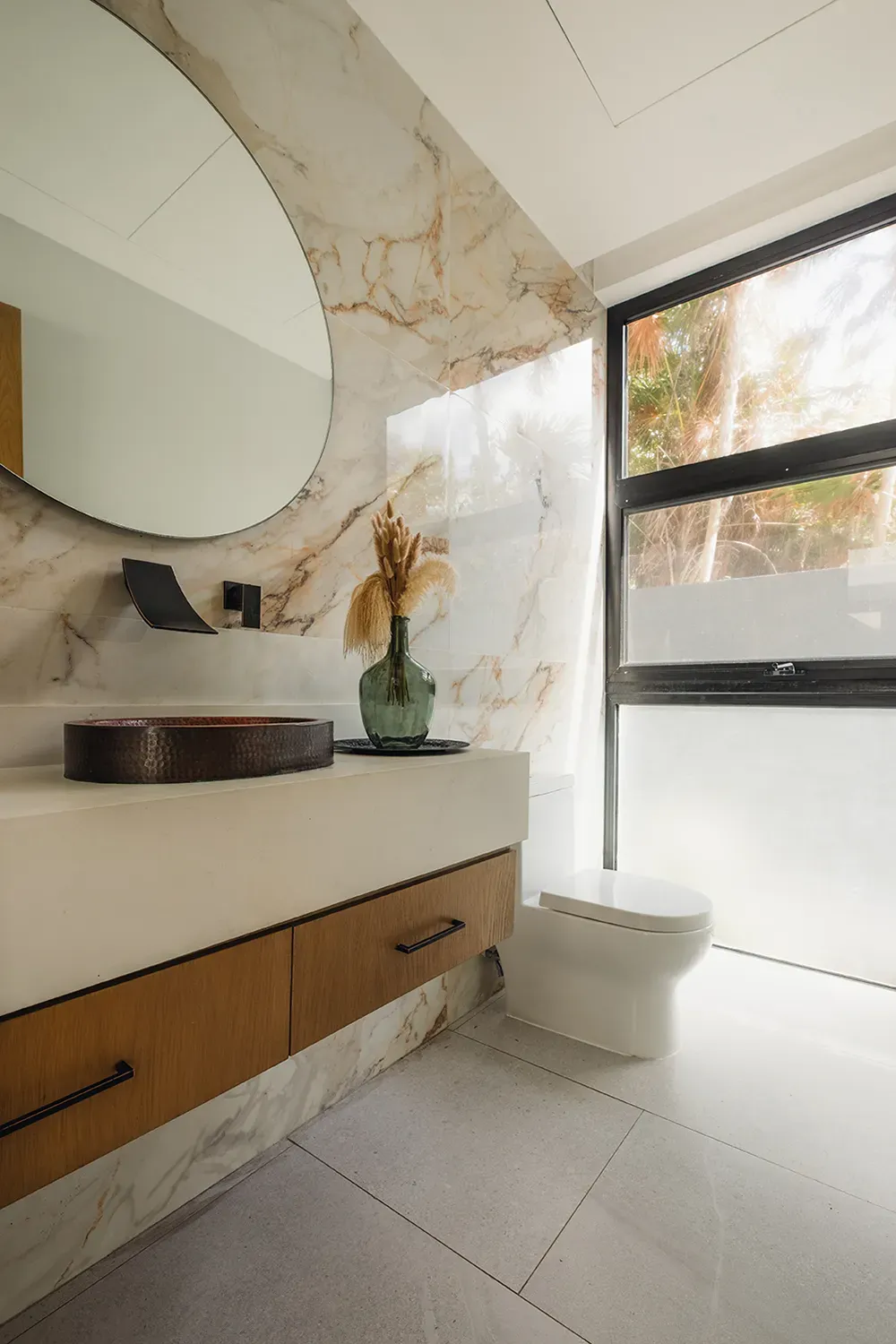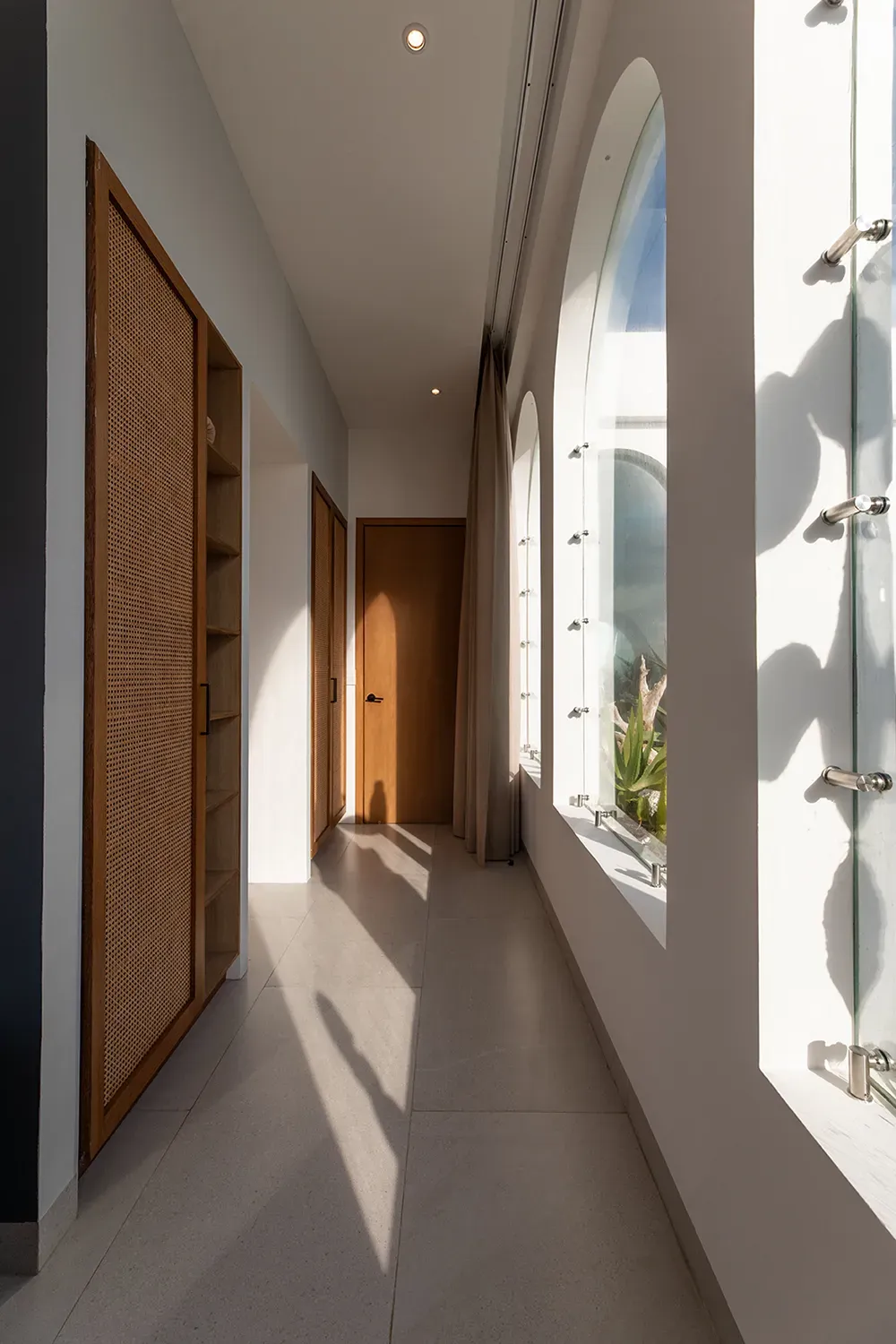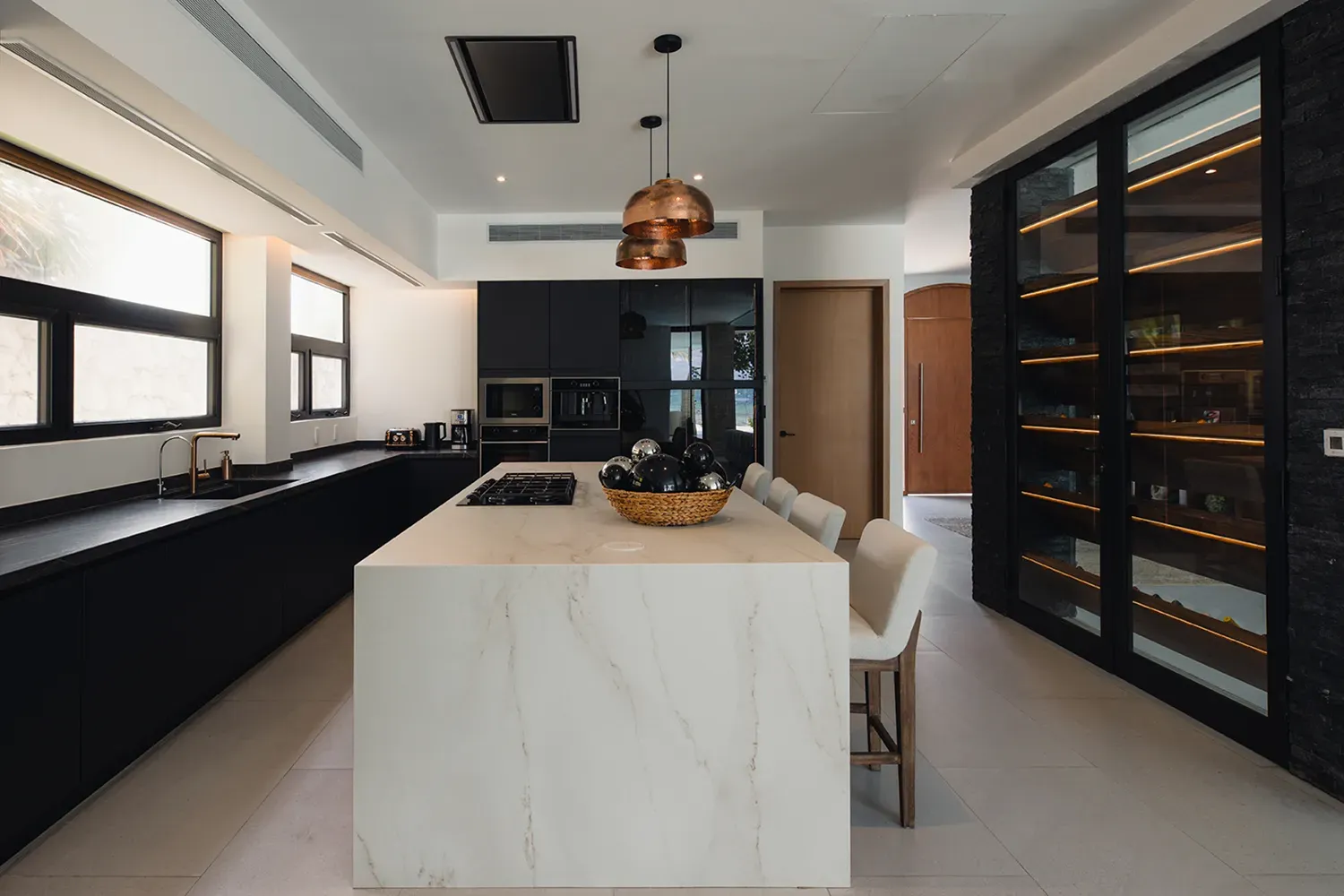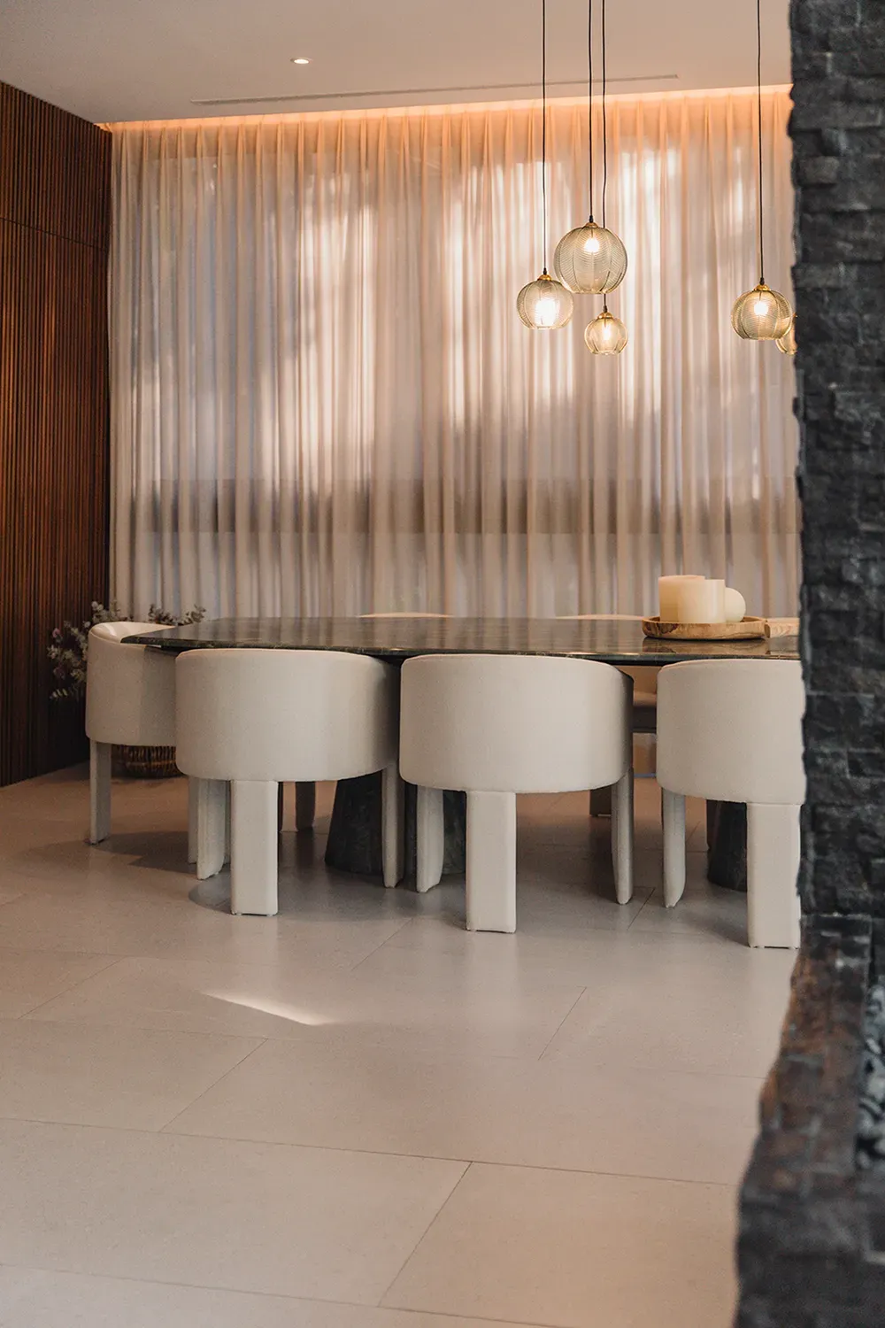 Studio 54 is a five-bedroom beachfront contemporary villa on Soliman Bay, Tulum, accommodating up to 10 guests across 800 square meters of architectural design that fuses clean modern lines with warm natural materials and a confident sense of showmanship. Named after the legendary New York nightclub, the villa is theatrical, comfortable, and unapologetically stylish — from the mirrored disco ball in the grand entryway to the floor-to-ceiling glass wine and champagne cellar built into the architecture beside the sculptural spiral staircase.