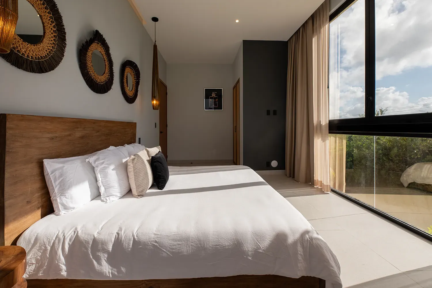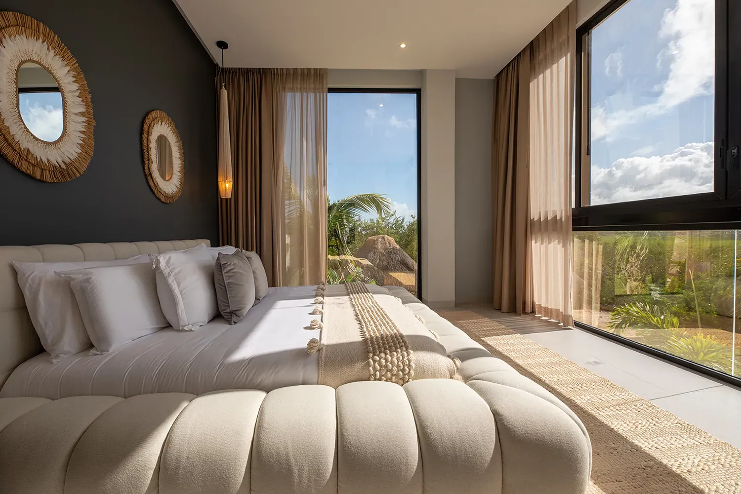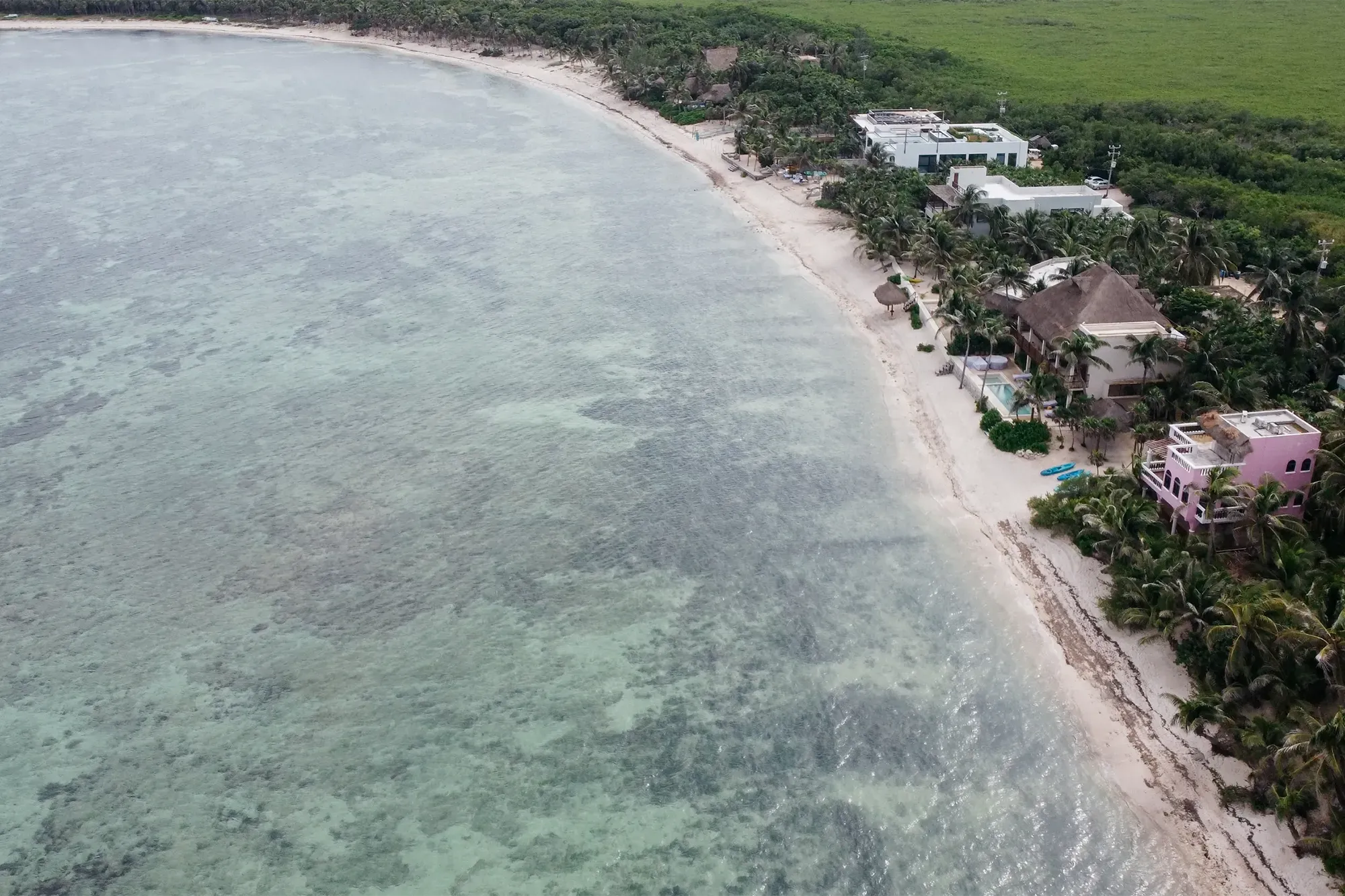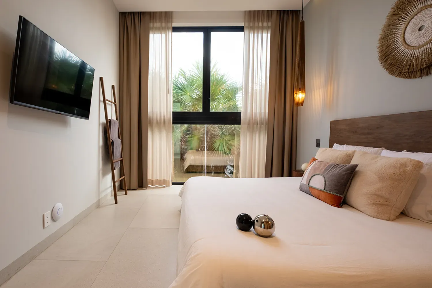 Soliman Bay’s reef-sheltered cove keeps the water consistently calm, clear, and seaweed-free year-round. The gated bay community maintains 24/7 security at the entrance. Tulum town is 14 km, approximately 20 minutes. Playa del Carmen is 42 km (40 minutes). Cancún International Airport (CUN) is 111 km, approximately 90 minutes. Tulum International Airport (TQO) is 52 km, approximately 55 minutes. Studio 54 books quickly across all seasons — contact us to confirm availability. Kayaks are stored beachside and available for reef exploration at any time.