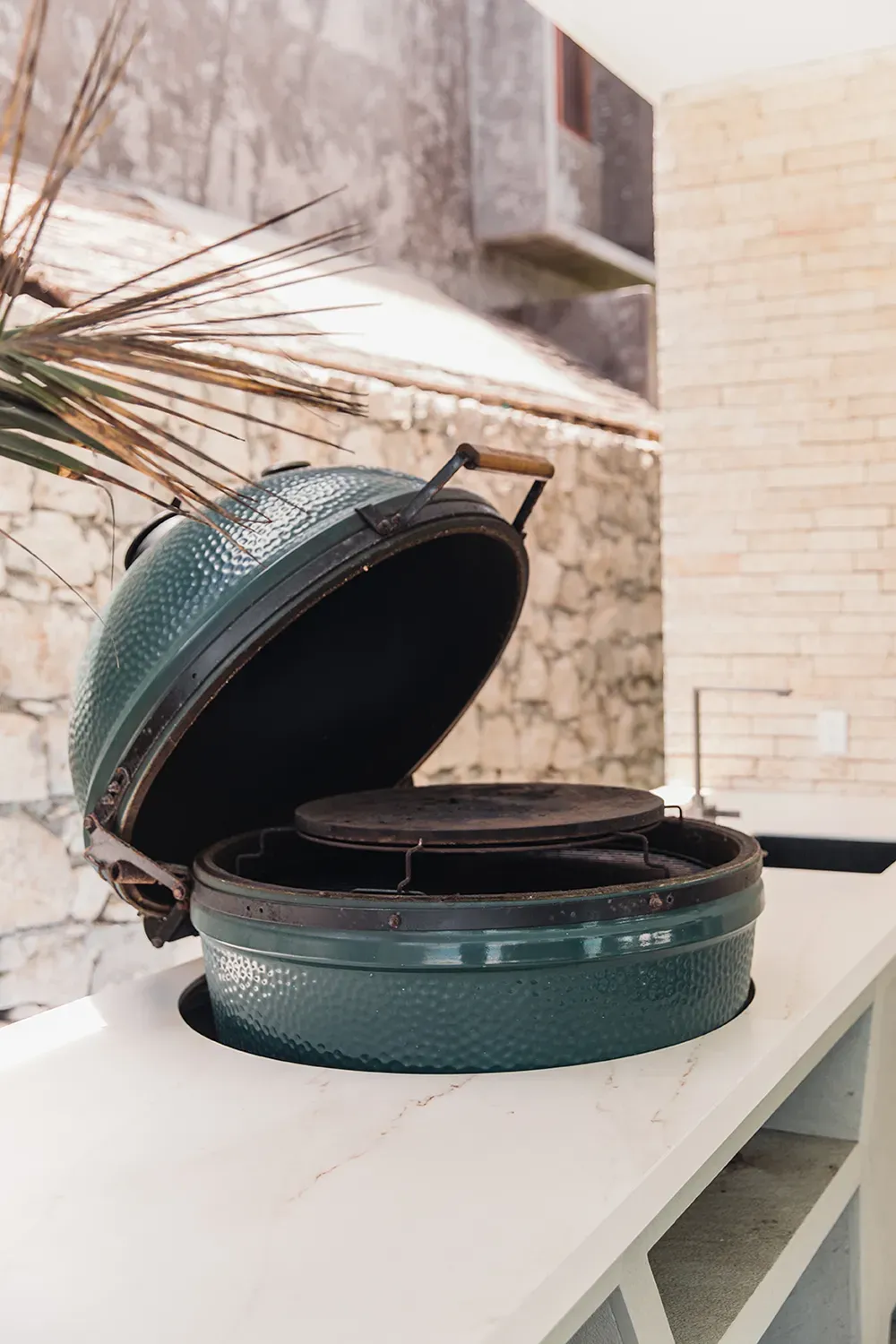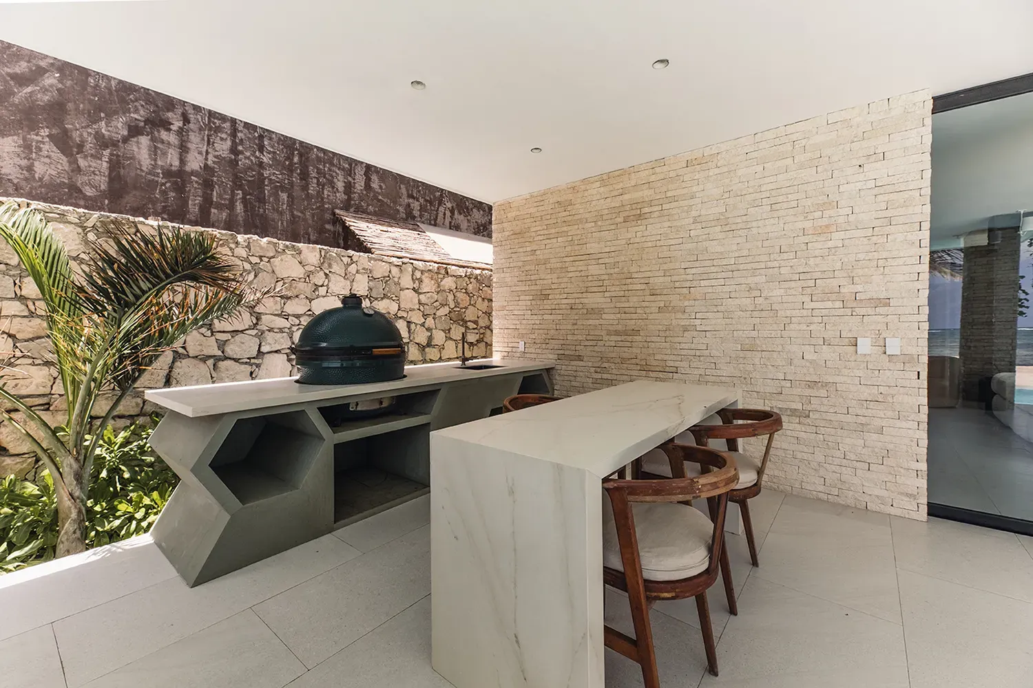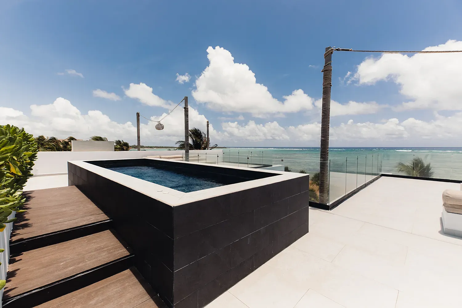 The rooftop plunge pool with dark tiles, hardwood decking, and full-height glass railings delivers unobstructed panoramic views of Soliman Bay and the open Caribbean. A full-time private chef handles breakfast and dinner daily using fresh local ingredients. Daily housekeeping and pre-arrival concierge service are standard. Grocery shopping, airport transfers, spa treatments, and private tours are available at additional cost.