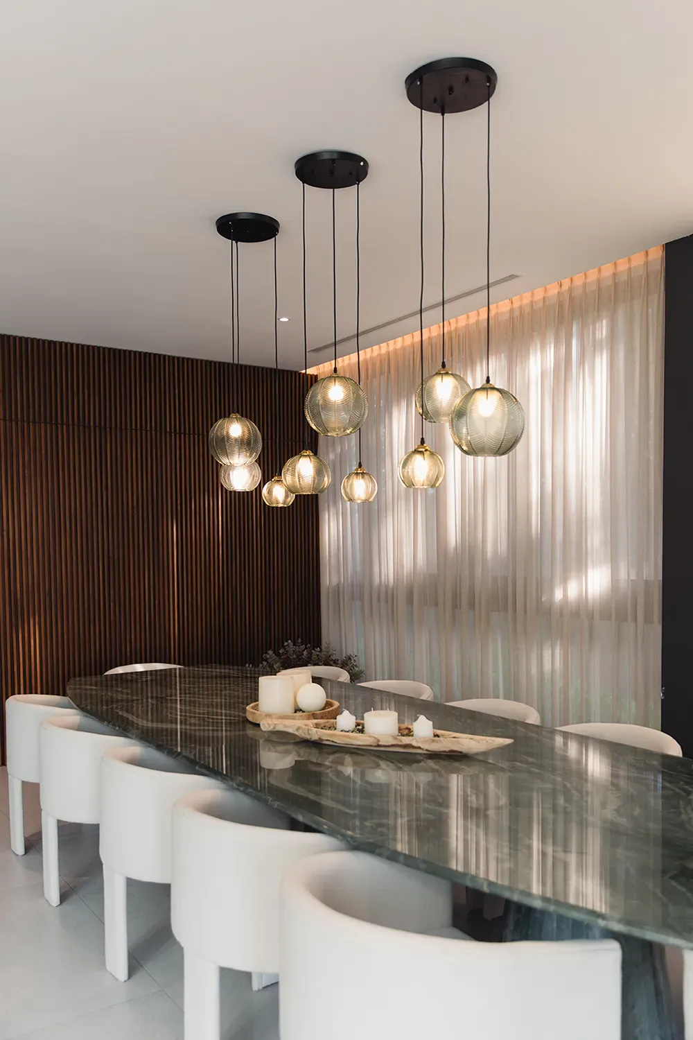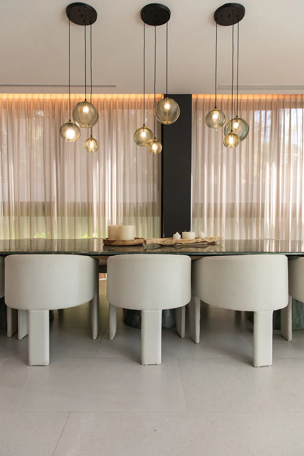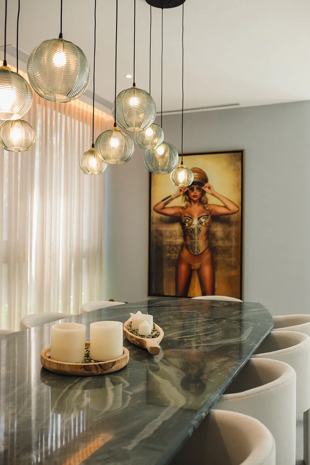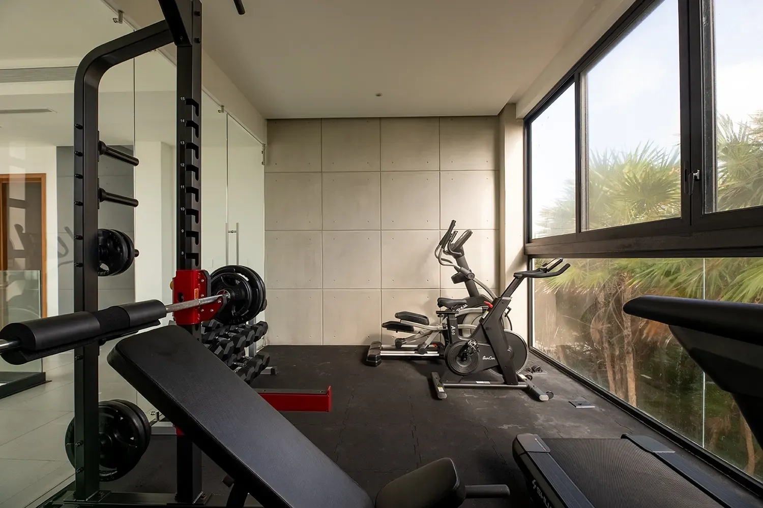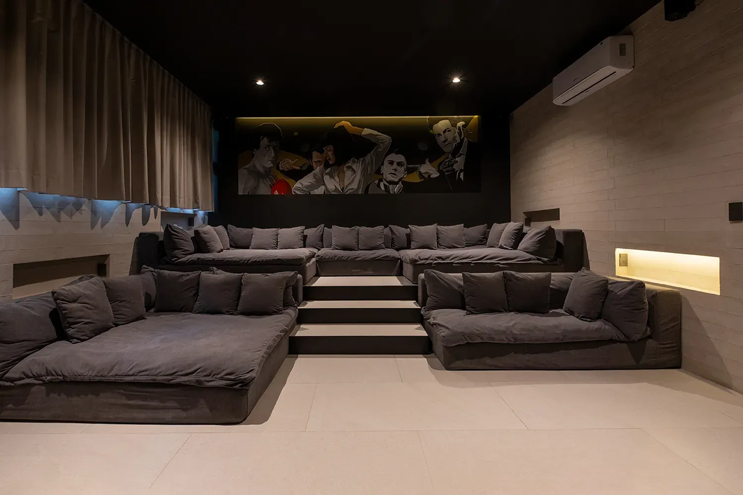 The double-height open-plan living area features modular tufted white sofas on a jute rug, a green marble dining table beneath sculptural globe pendant lights, and a gourmet kitchen with a large marble island, copper pendants, and bar stools. A private cinema with tiered plush seating and a bold pop art mural seats the full group in comfort. An indoor gym with squat rack, treadmill, spin bike, and full dumbbell set with palm garden views is one floor above. An outdoor kitchen with a ceramic Big Green Egg grill and marble bar counter extends the entertaining options to the curved beachfront pool terrace.
