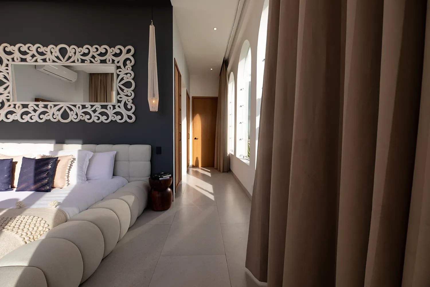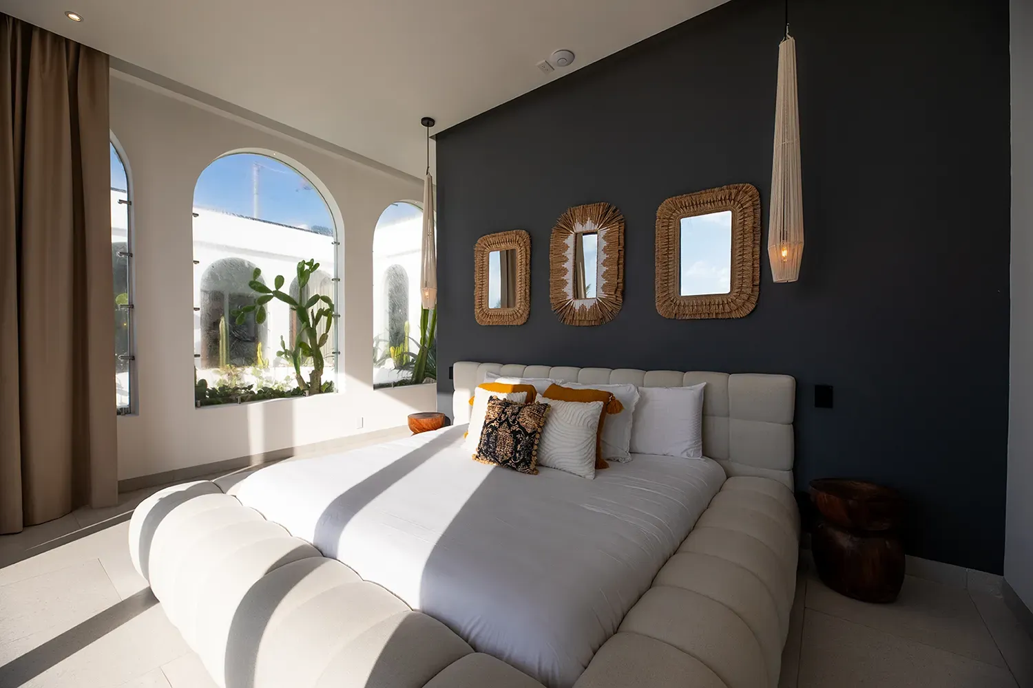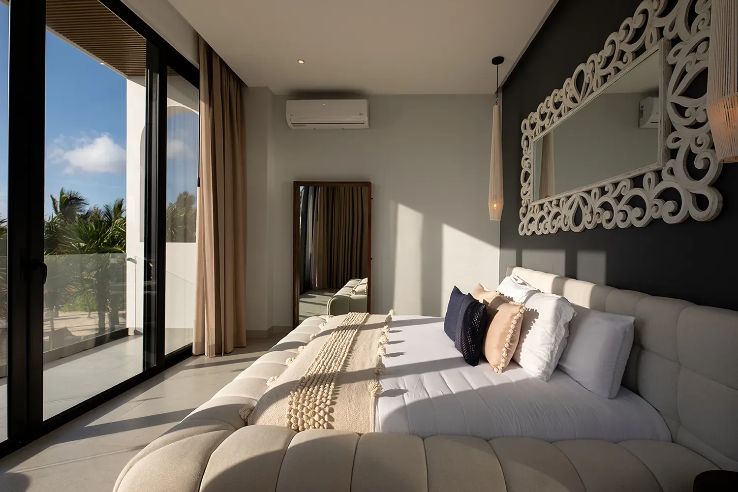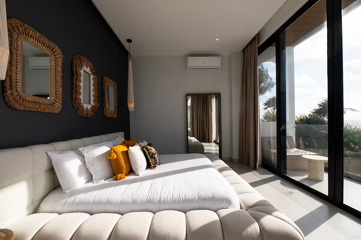 King bed, tufted headboard, arched glass doors to beach, dark accent wall, ensuite dark marble bathroom with soaking tub, rain shower, copper sink, air conditioning, WiFi