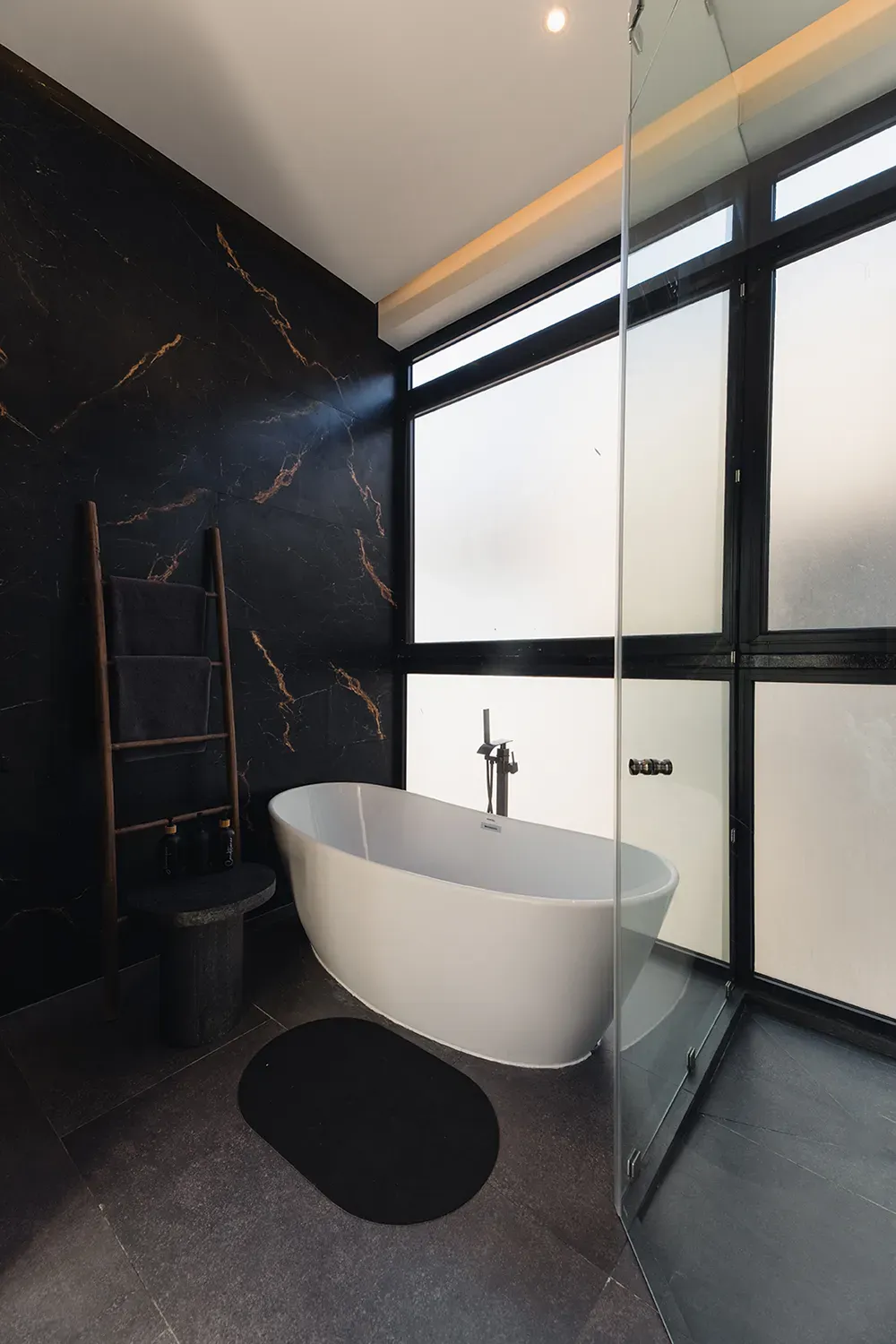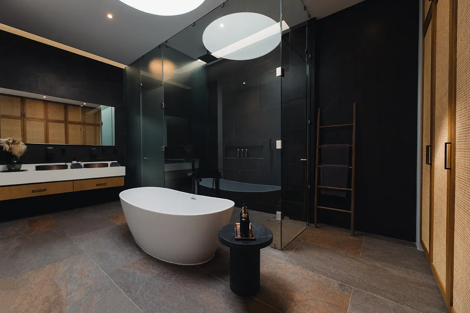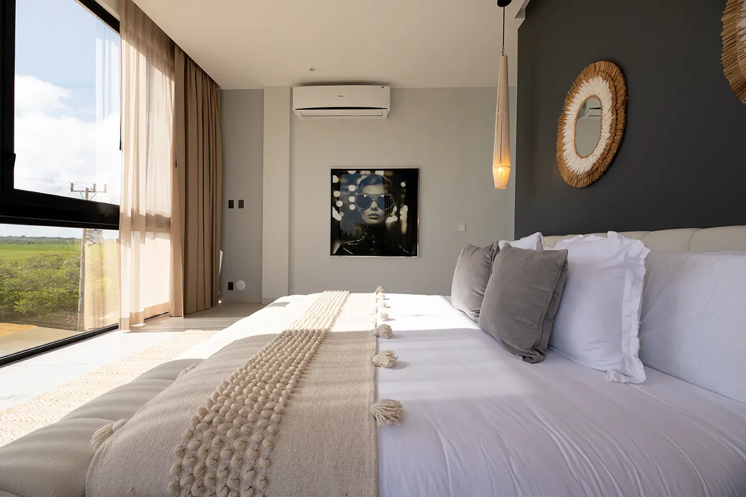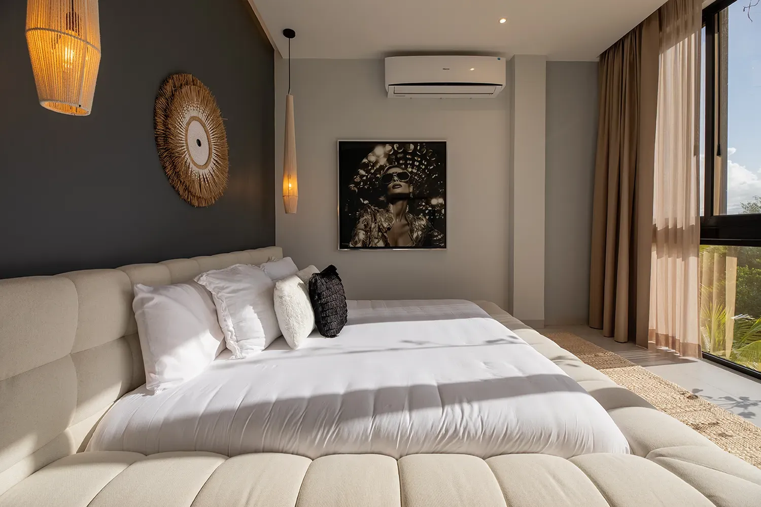 King bed, tufted headboard, arched glass doors to beach, dark accent wall, ensuite dark marble bathroom with soaking tub, rain shower, copper sink, air conditioning, WiFi