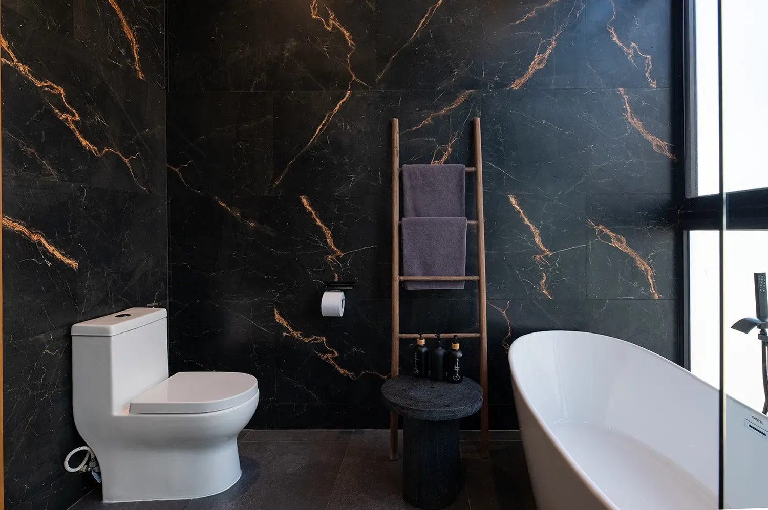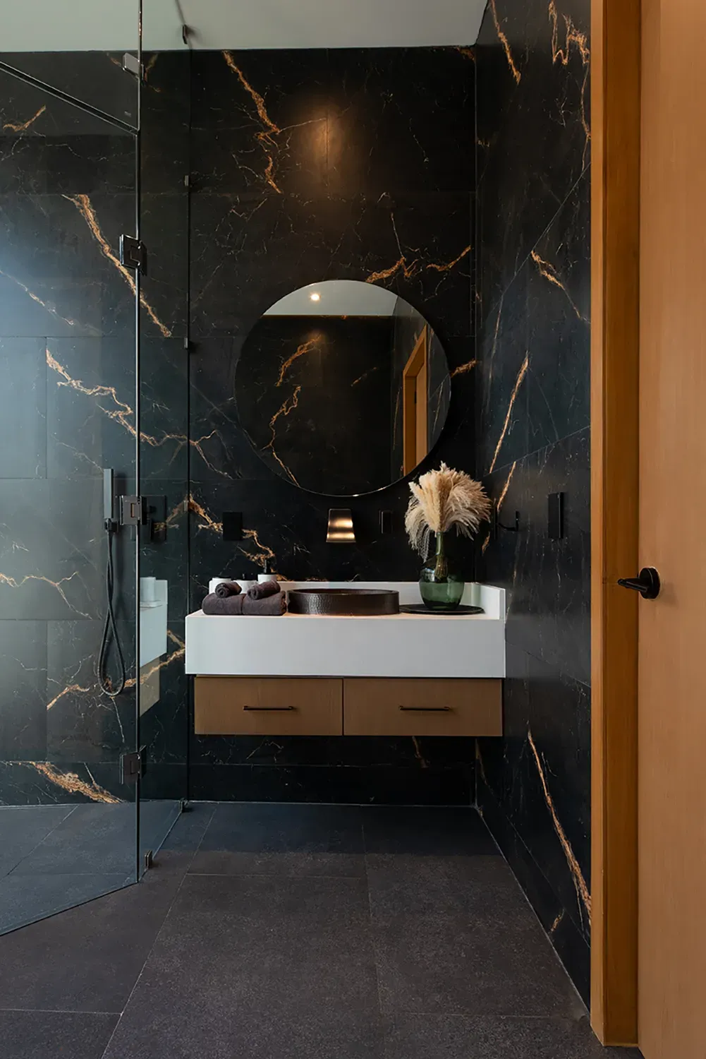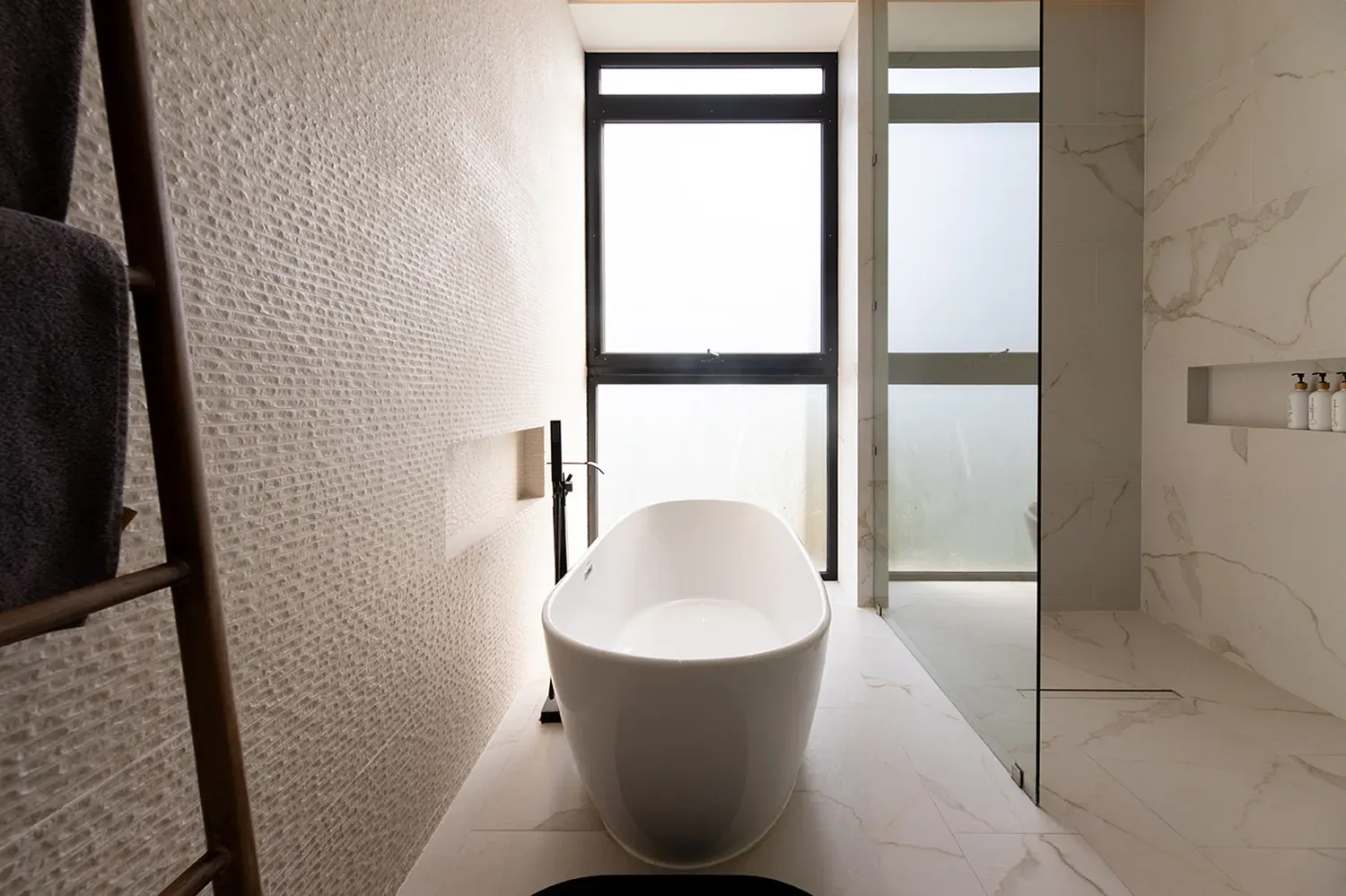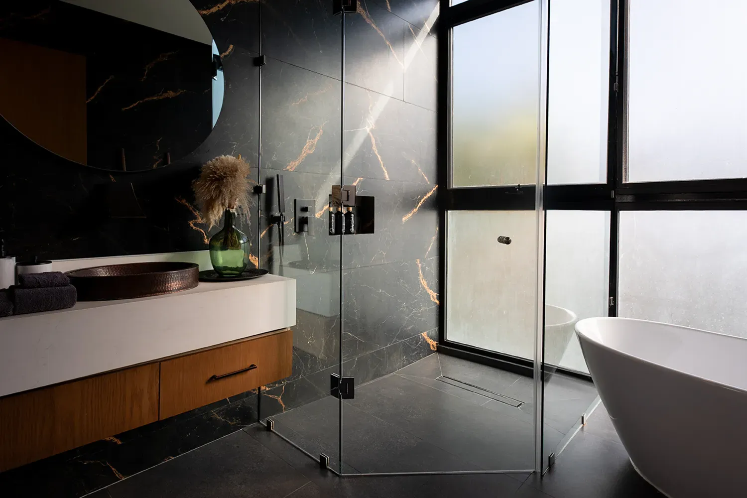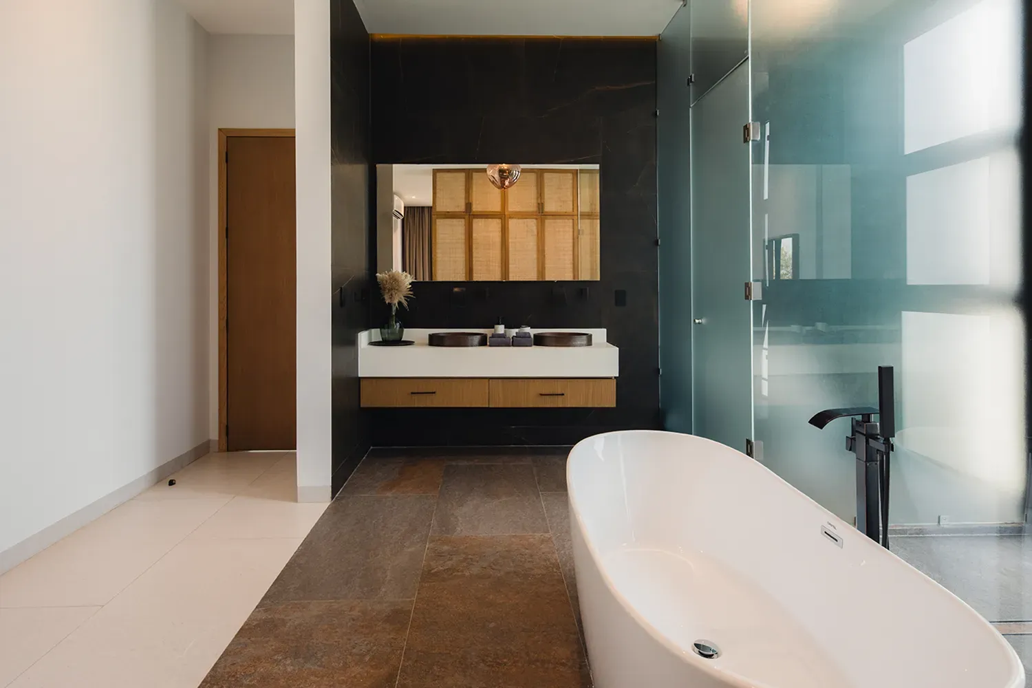 King bed, tufted headboard, arched glass doors to beach, dark accent wall, ensuite dark marble bathroom with soaking tub, rain shower, copper sink, air conditioning, WiFi