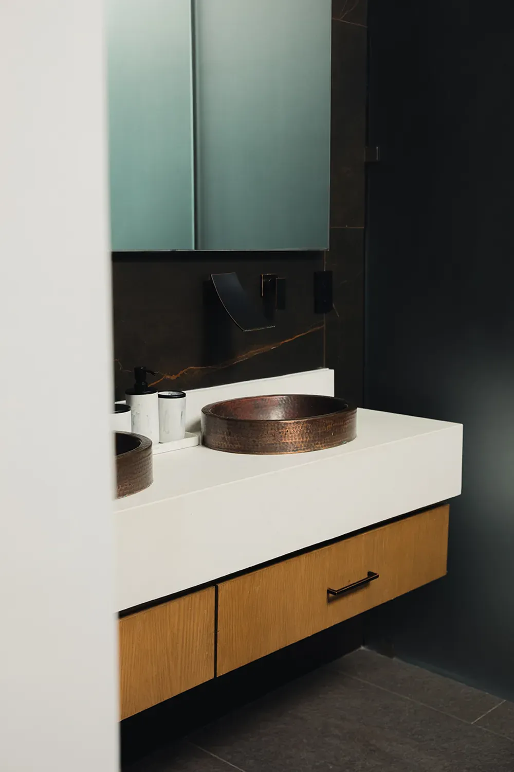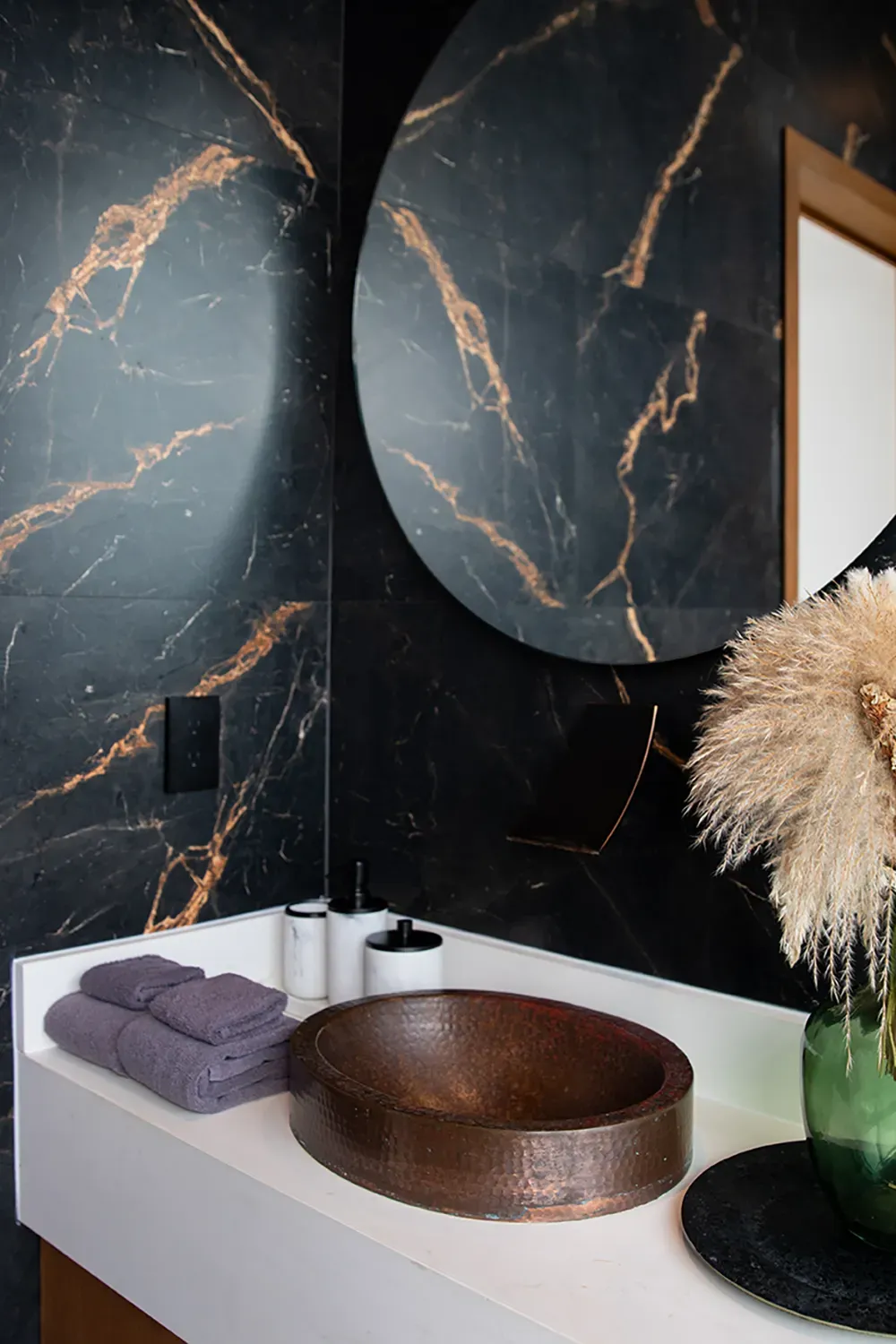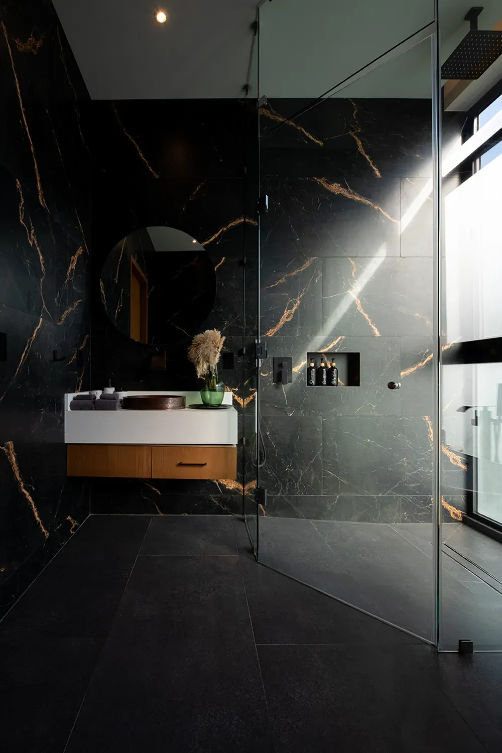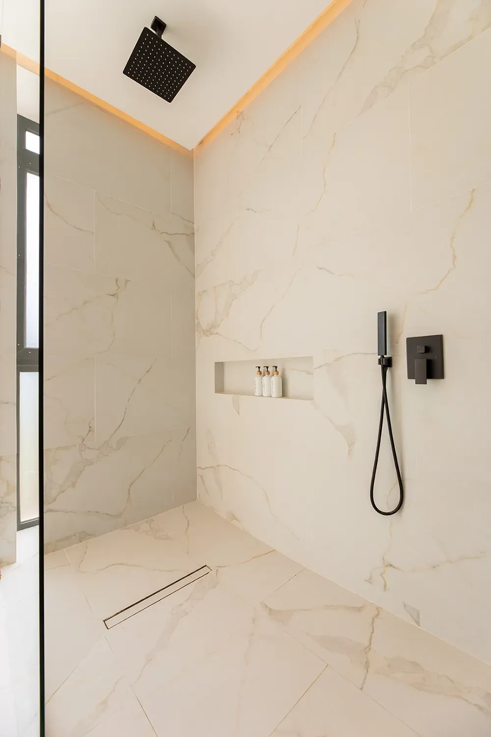 King bed, tufted headboard, arched glass doors to beach, dark accent wall, ensuite dark marble bathroom with soaking tub, rain shower, copper sink, air conditioning, WiFi