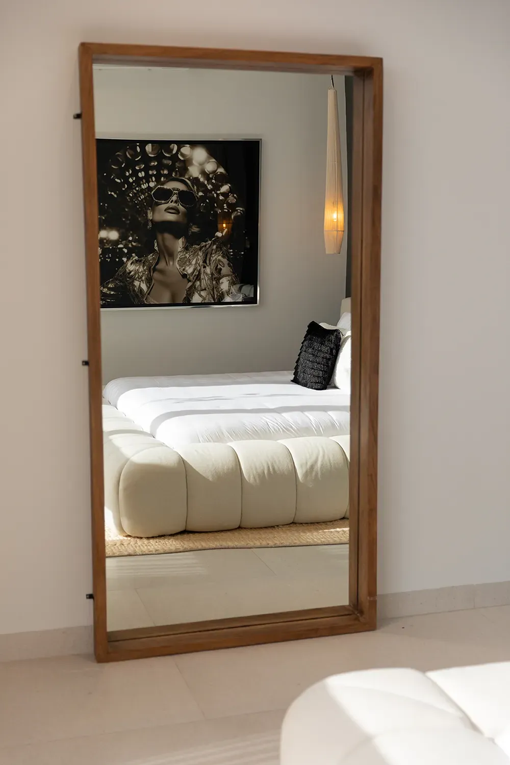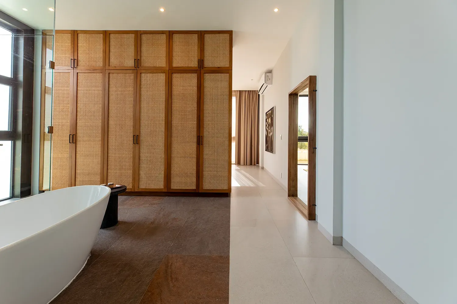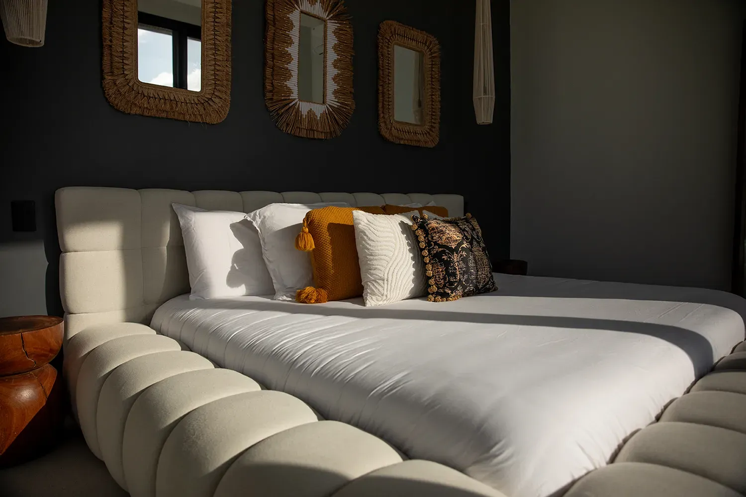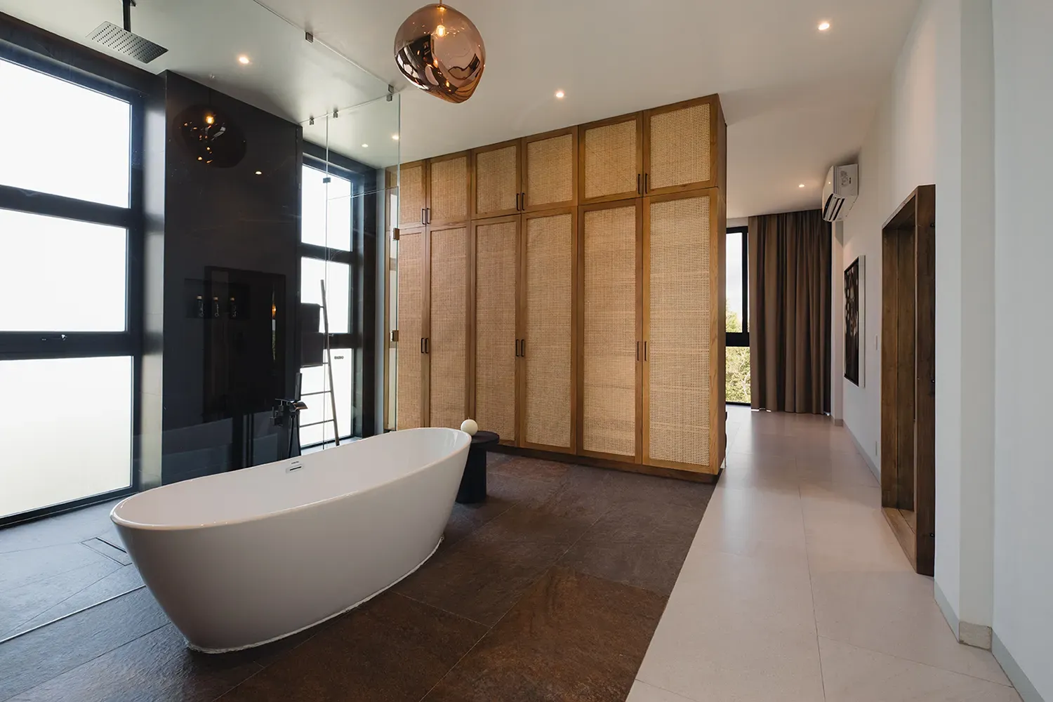 King bed, woven mirrors, pendant lights, rattan wardrobe doors, ensuite bathroom with soaking tub, air conditioning, WiFi
