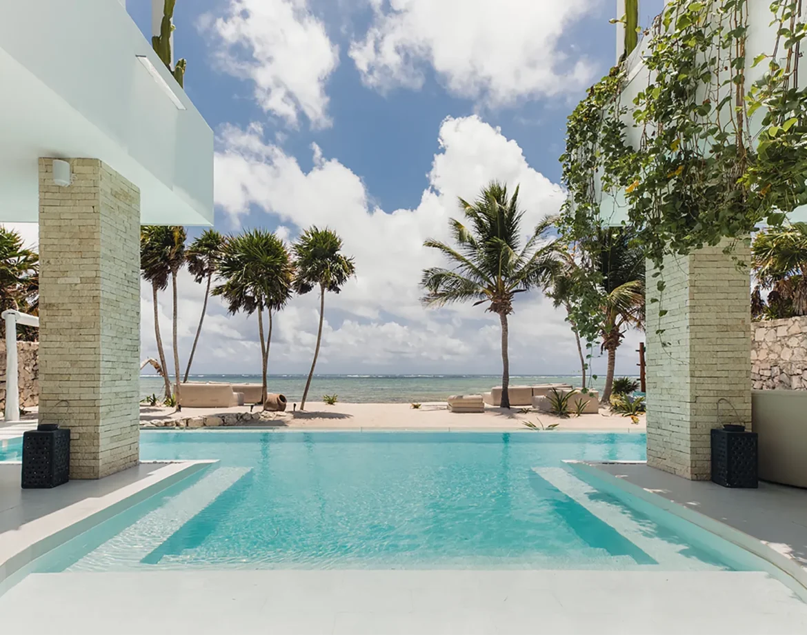 Studio 54 is a five-bedroom beachfront contemporary villa on Soliman Bay, Tulum, accommodating up to 10 guests across 800 square meters of architectural design that fuses clean modern lines with warm natural materials and a confident sense of showmanship. Named after the legendary New York nightclub, the villa is theatrical, comfortable, and unapologetically stylish — from the mirrored disco ball in the grand entryway to the floor-to-ceiling glass wine and champagne cellar built into the architecture beside the sculptural spiral staircase.