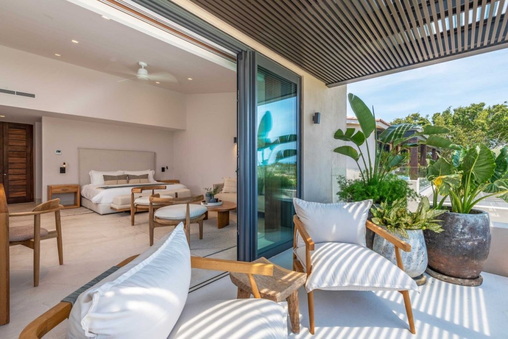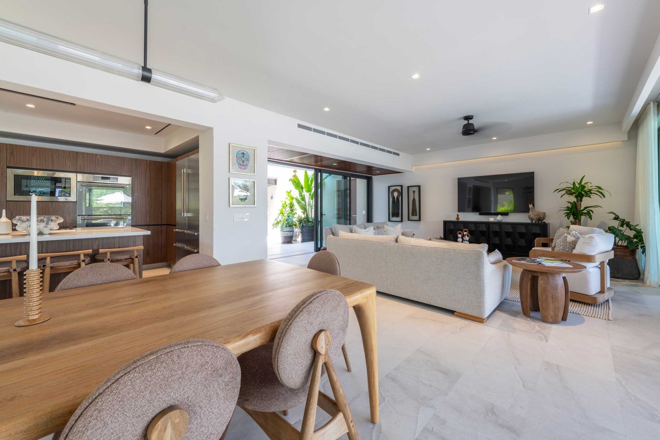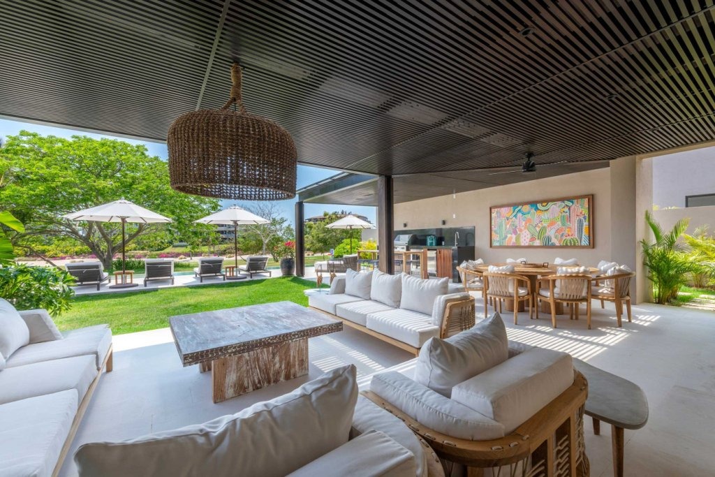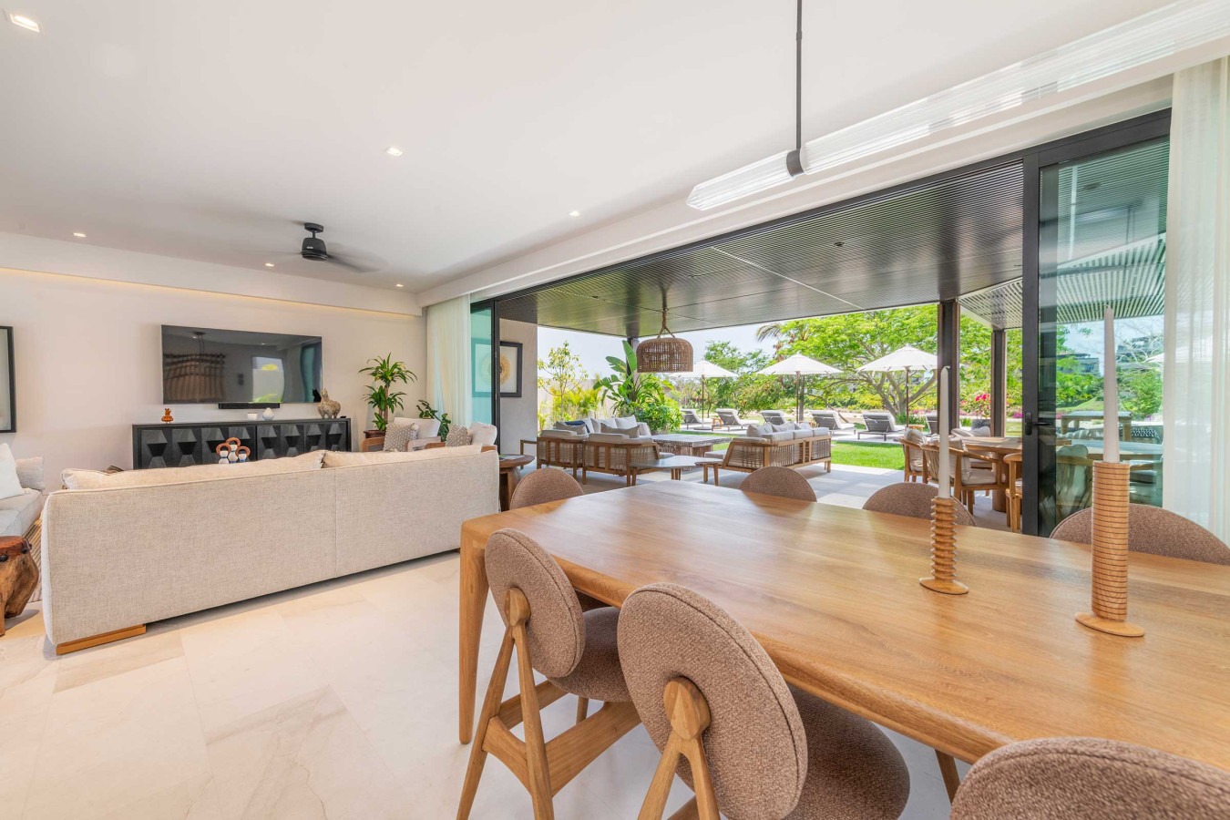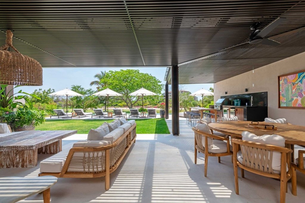 The villa’s open-plan living spaces are designed for both grand entertaining and quiet relaxation. A stylish great room with soaring ceilings and floor-to-ceiling glass doors opens seamlessly onto an expansive covered terrace, where elegant outdoor furniture, a pergola with slatted roof, and panoramic golf course views create a setting that feels both intimate and breathtaking. The fully equipped gourmet kitchen features premium appliances, a wine fridge, and everything needed for a private chef to prepare a memorable meal, while the outdoor kitchen with grill, mini fridge, and ice maker makes poolside entertaining effortless.