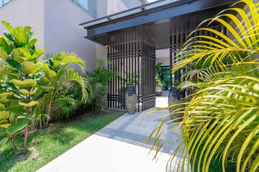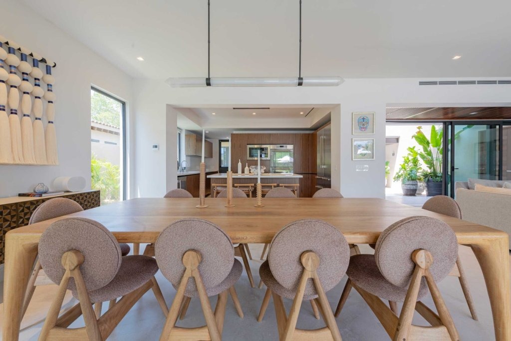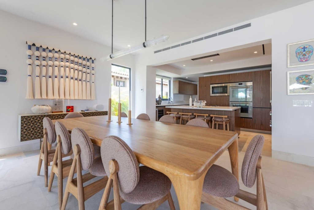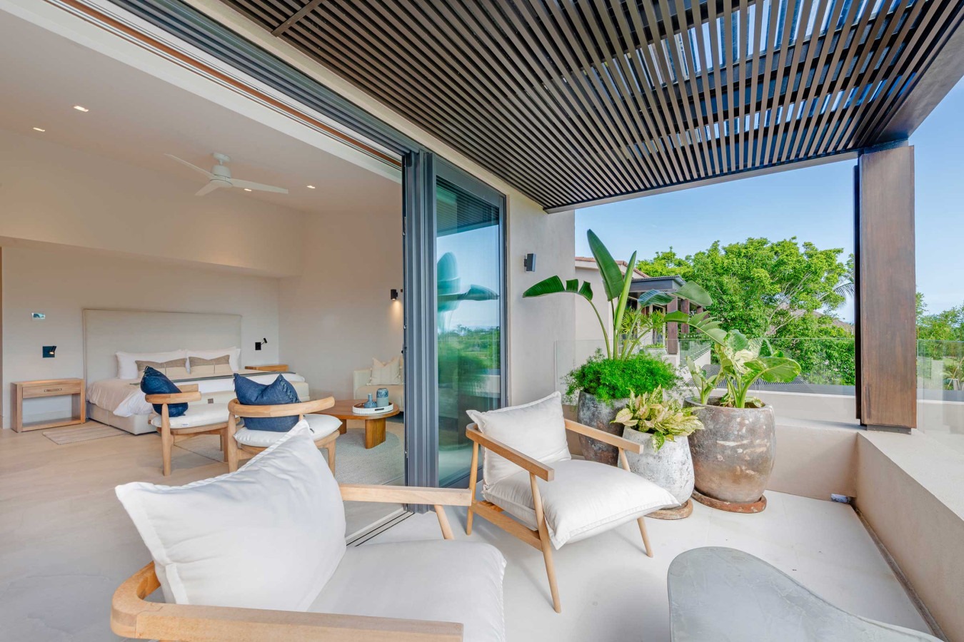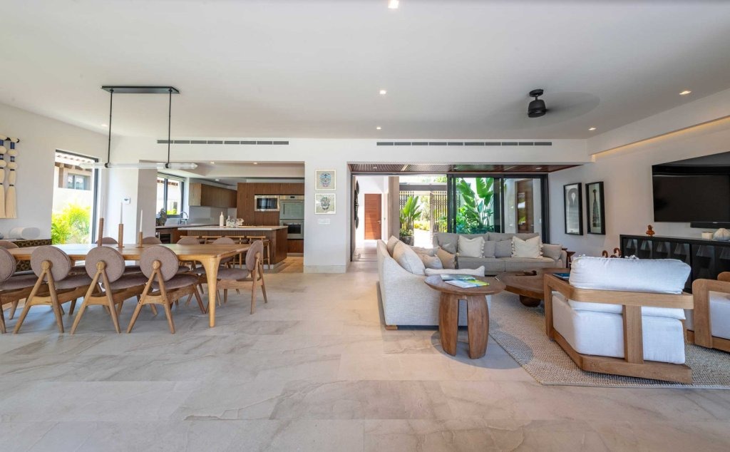 The villa’s open-plan living spaces are designed for both grand entertaining and quiet relaxation. A stylish great room with soaring ceilings and floor-to-ceiling glass doors opens seamlessly onto an expansive covered terrace, where elegant outdoor furniture, a pergola with slatted roof, and panoramic golf course views create a setting that feels both intimate and breathtaking. The fully equipped gourmet kitchen features premium appliances, a wine fridge, and everything needed for a private chef to prepare a memorable meal, while the outdoor kitchen with grill, mini fridge, and ice maker makes poolside entertaining effortless.