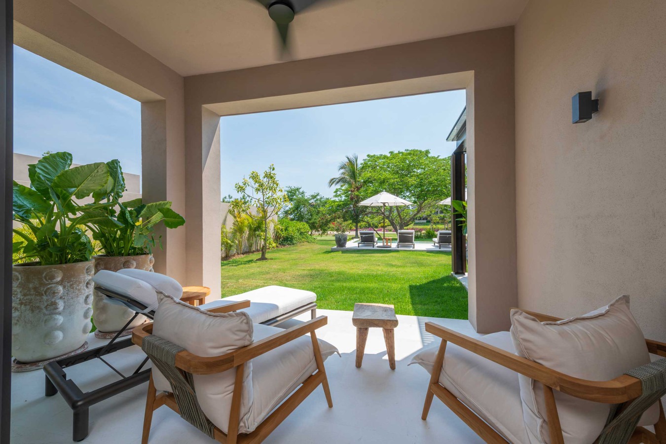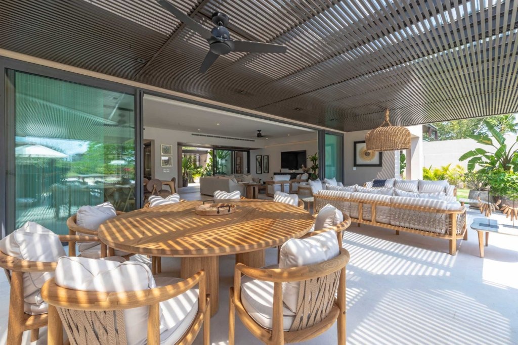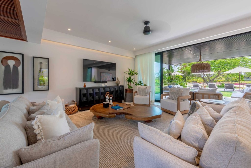 Step outside to the private heated plunge pool and jacuzzi, surrounded by manicured lawns, sun loungers beneath market umbrellas, and the lush green backdrop of the Jack Nicklaus fairways. The covered terrace with its outdoor dining and sitting area is the natural gathering place for sunset cocktails, leisurely breakfasts prepared by your dedicated cook, and evenings spent under the stars.