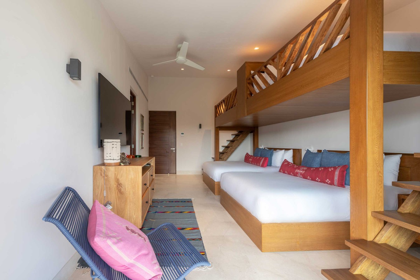 Bunk beds with two queen-size beds and two full beds, ensuite bathroom, smart TV, air conditioning, ceiling fan, ideal for children or teens