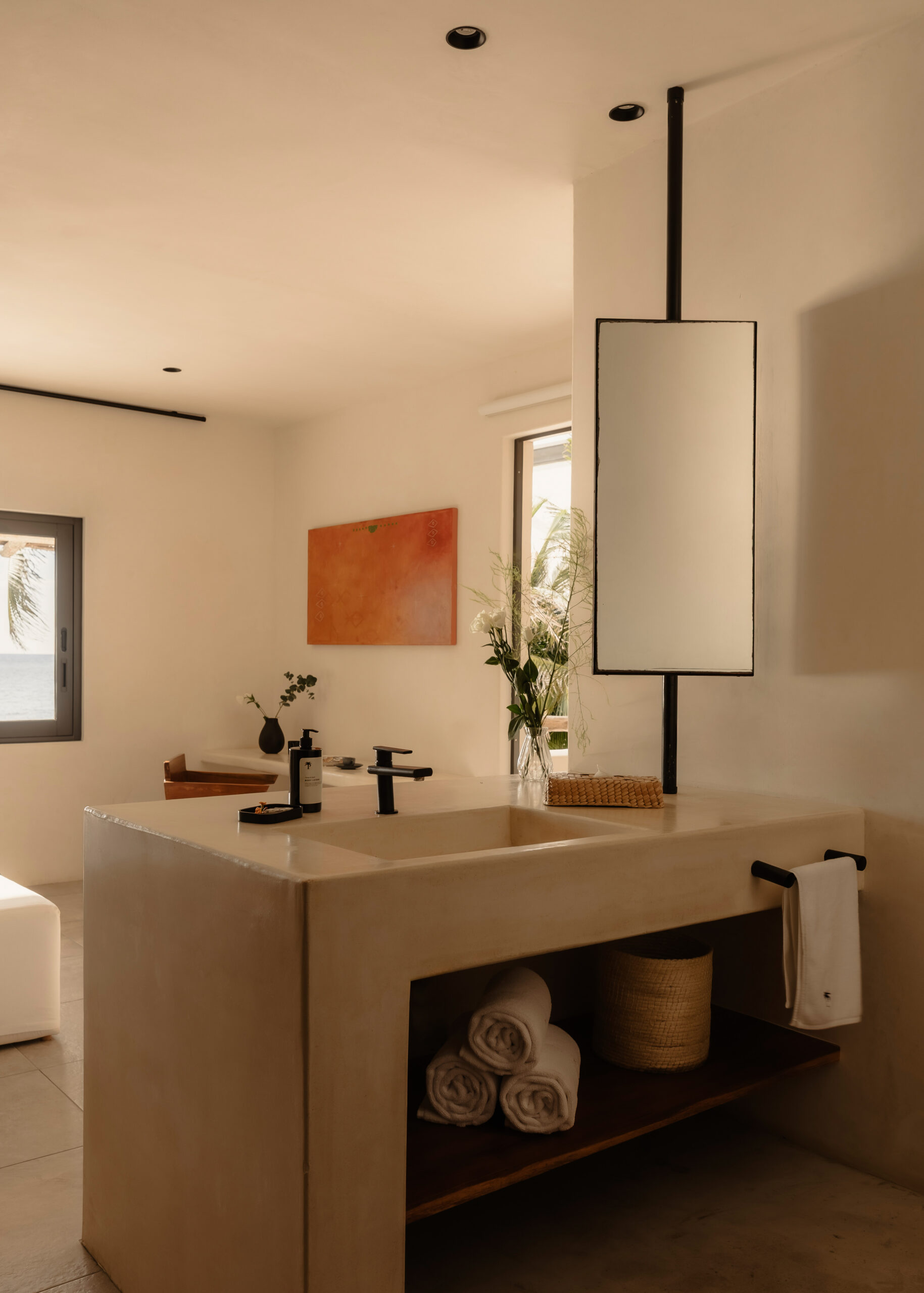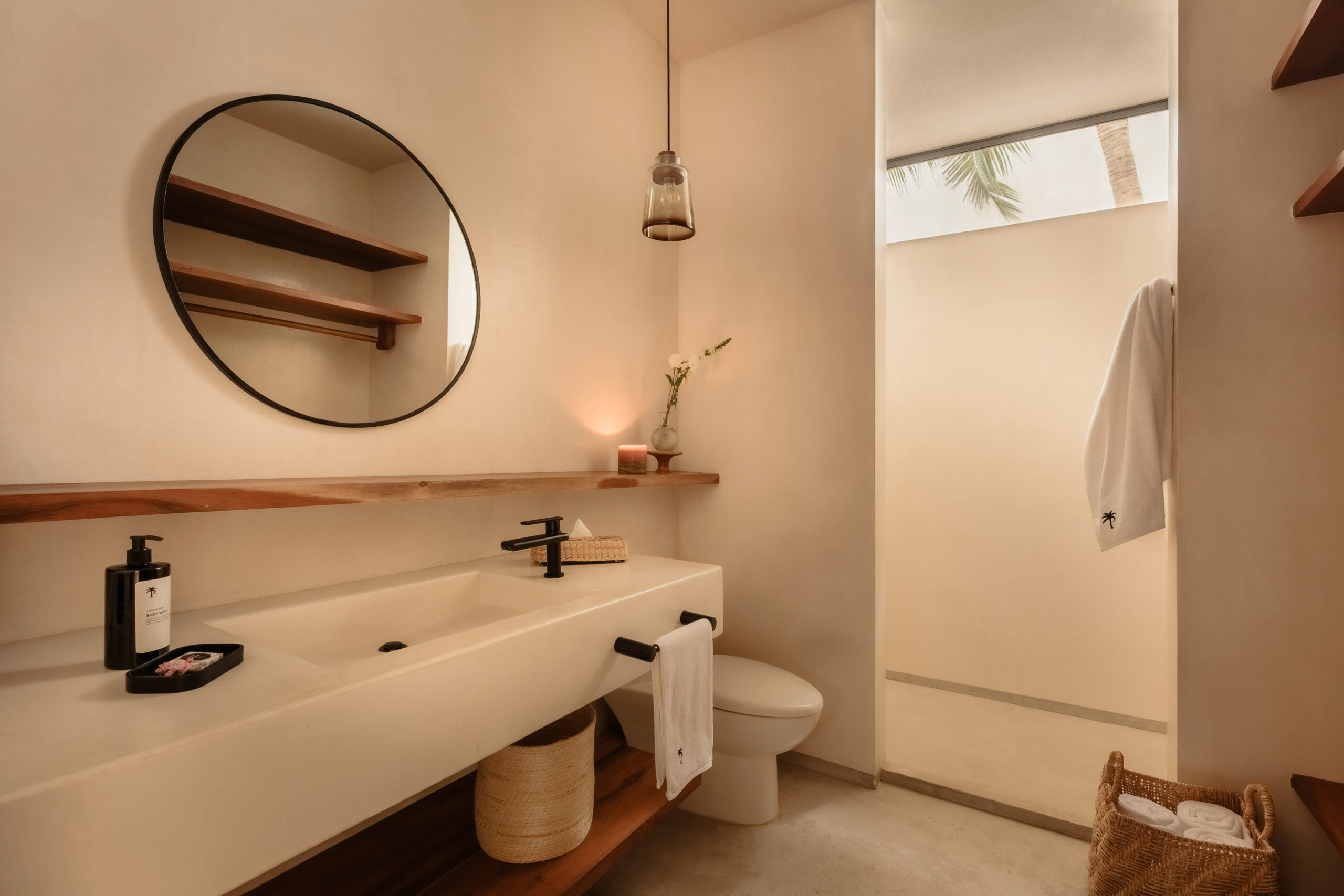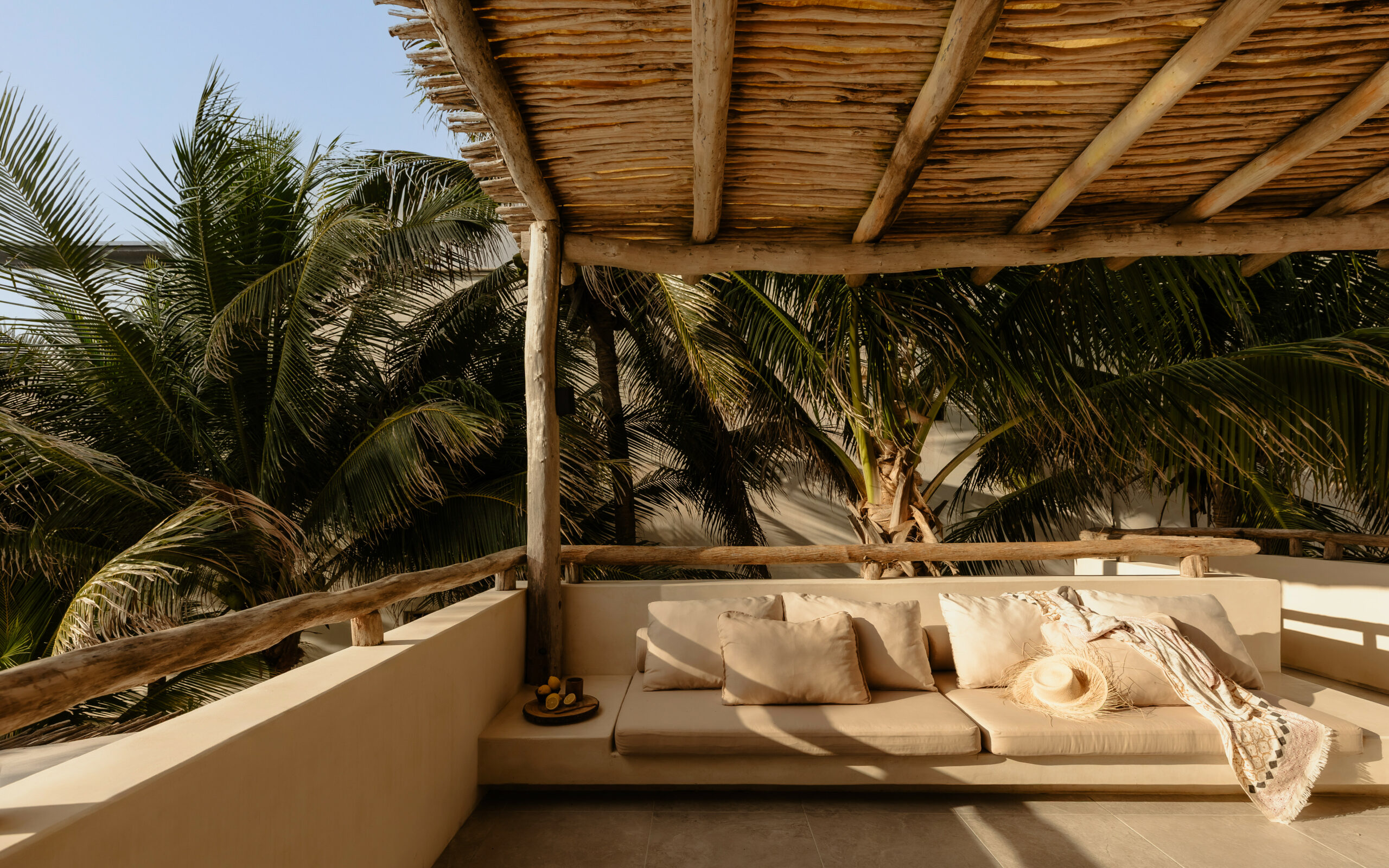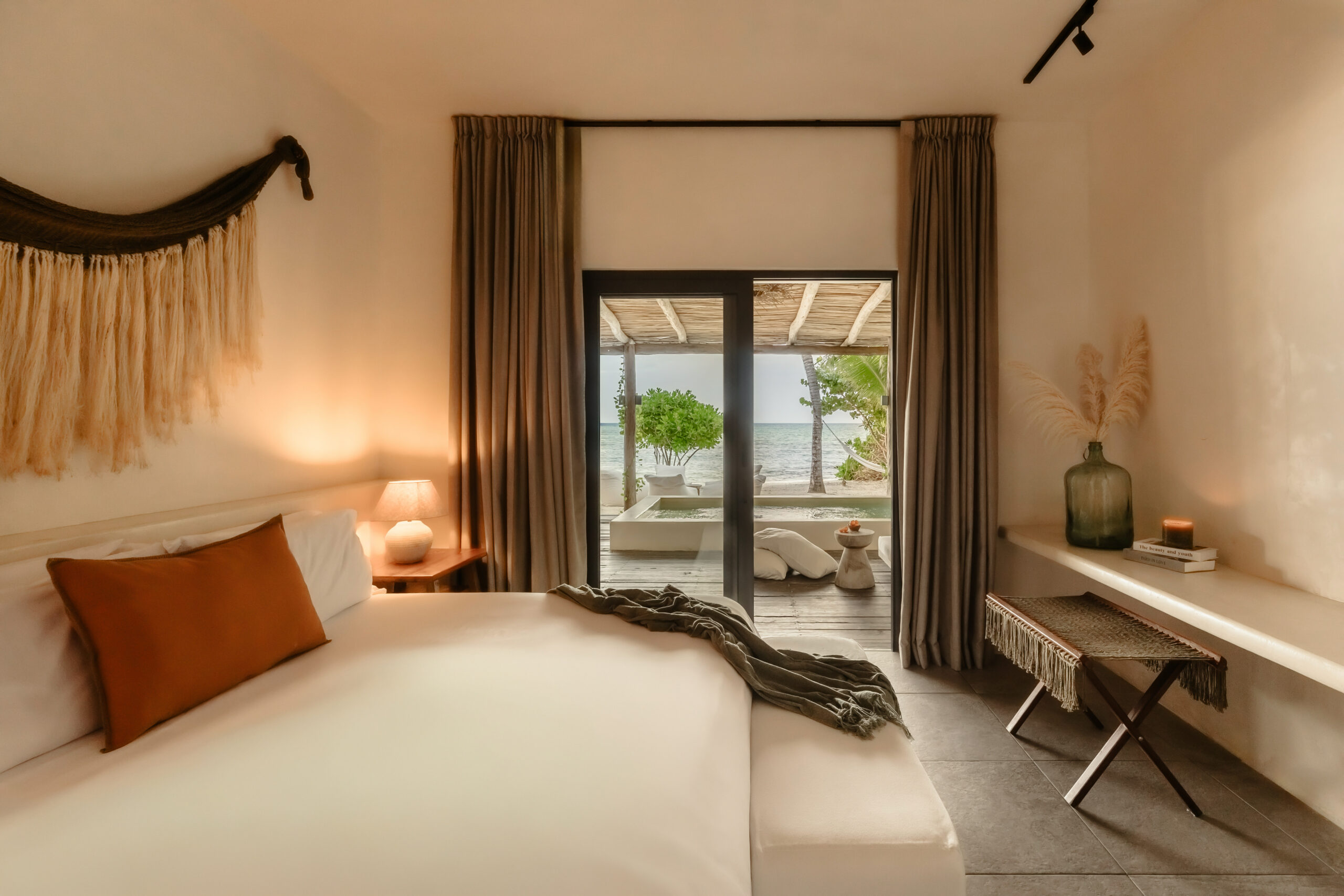 The four bedrooms are individually designed with king beds, bohemian art, macramé wall hangings, woven details, and concrete or stone ensuites with round mirrors, floating vanities, and black fixtures. Several bedrooms have direct terrace or balcony access with hammocks overlooking the sea. An outdoor stone shower sits among the palms. A rooftop daybed platform tucked under palapa offers one of the best sunset viewpoints in Tankah Bay.
