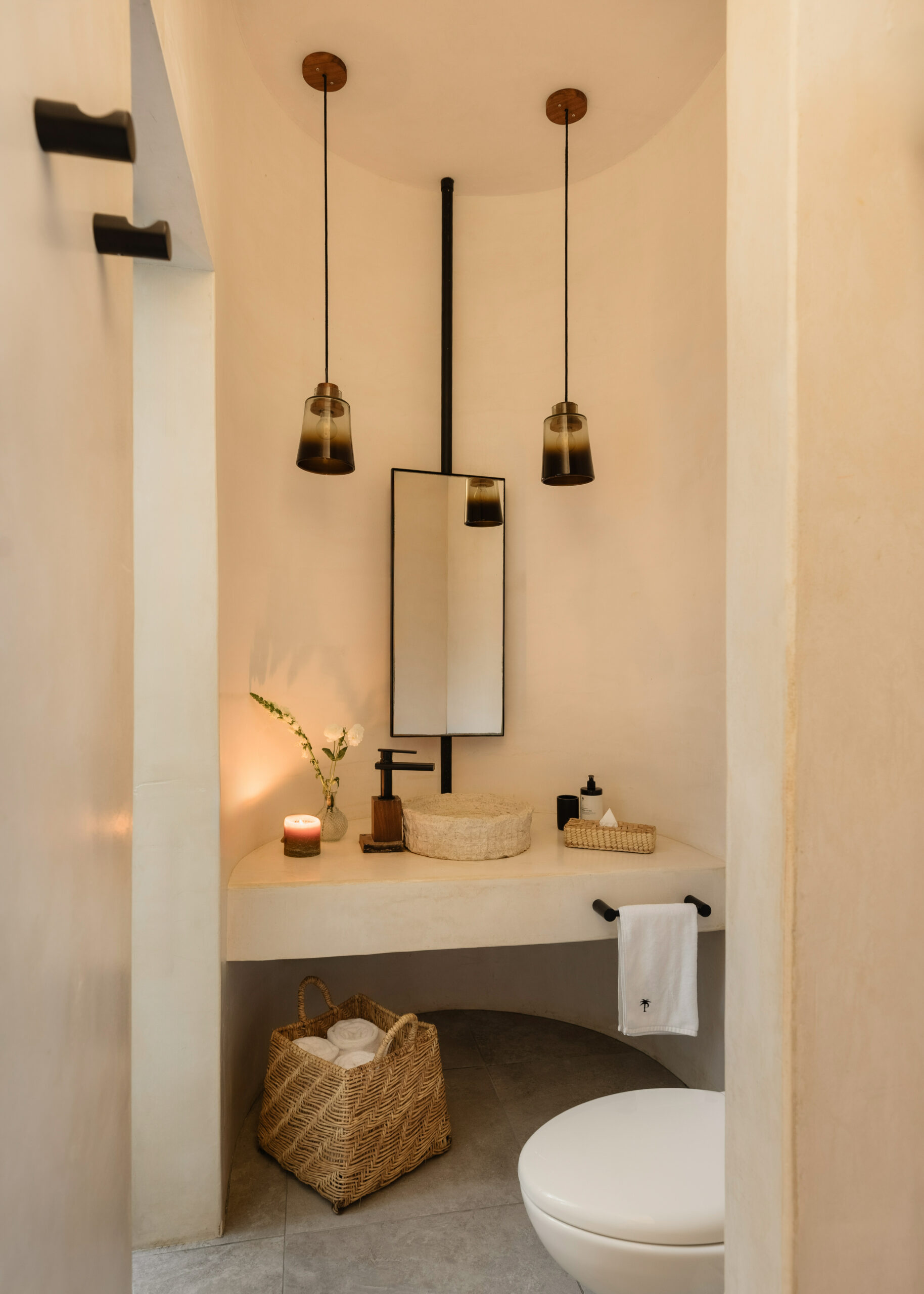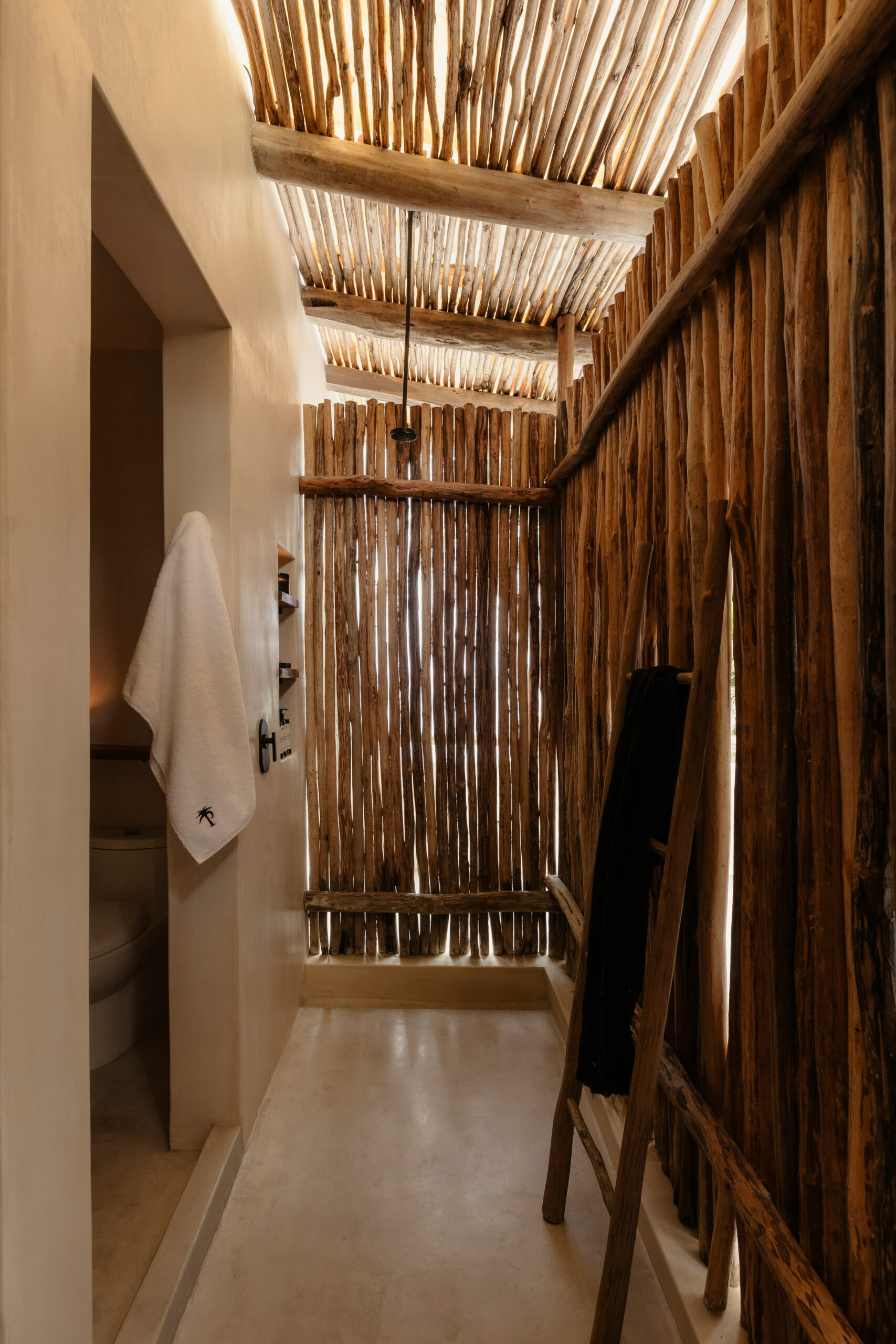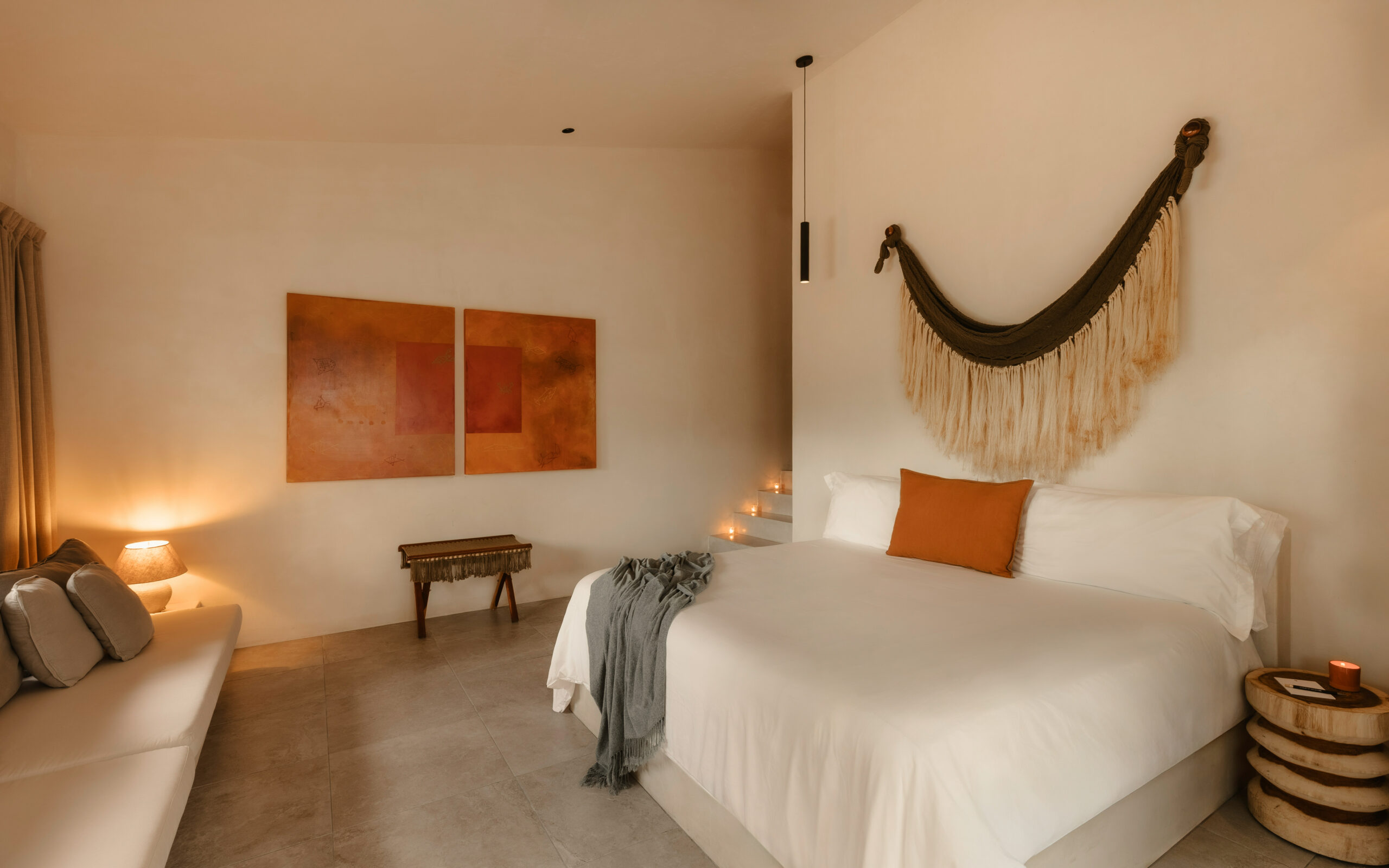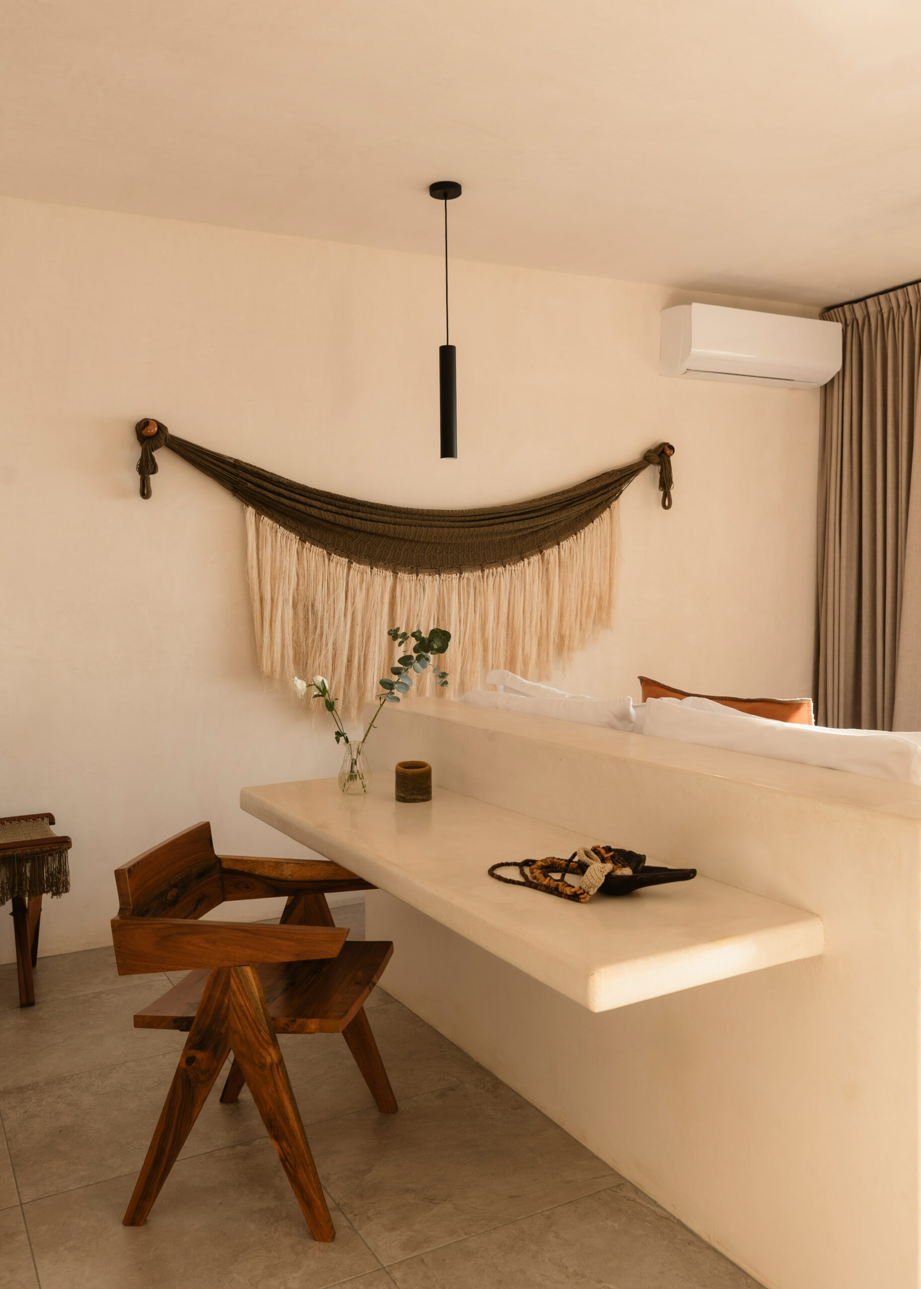 The four bedrooms are individually designed with king beds, bohemian art, macramé wall hangings, woven details, and concrete or stone ensuites with round mirrors, floating vanities, and black fixtures. Several bedrooms have direct terrace or balcony access with hammocks overlooking the sea. An outdoor stone shower sits among the palms. A rooftop daybed platform tucked under palapa offers one of the best sunset viewpoints in Tankah Bay.