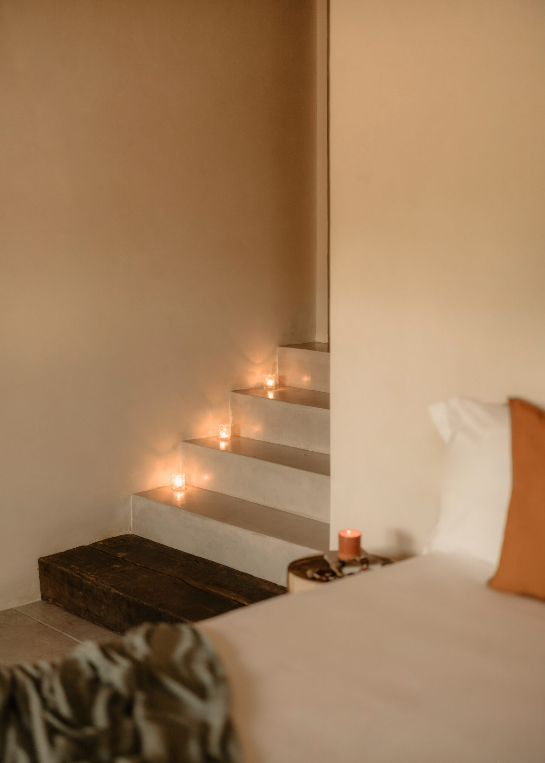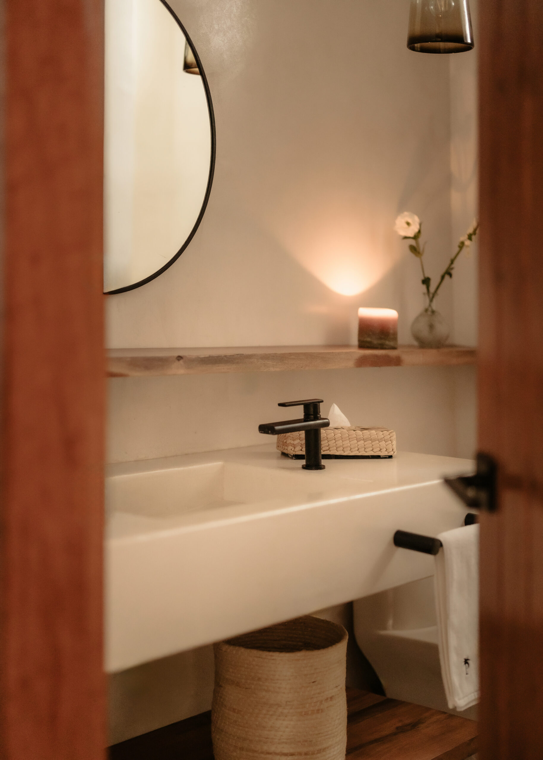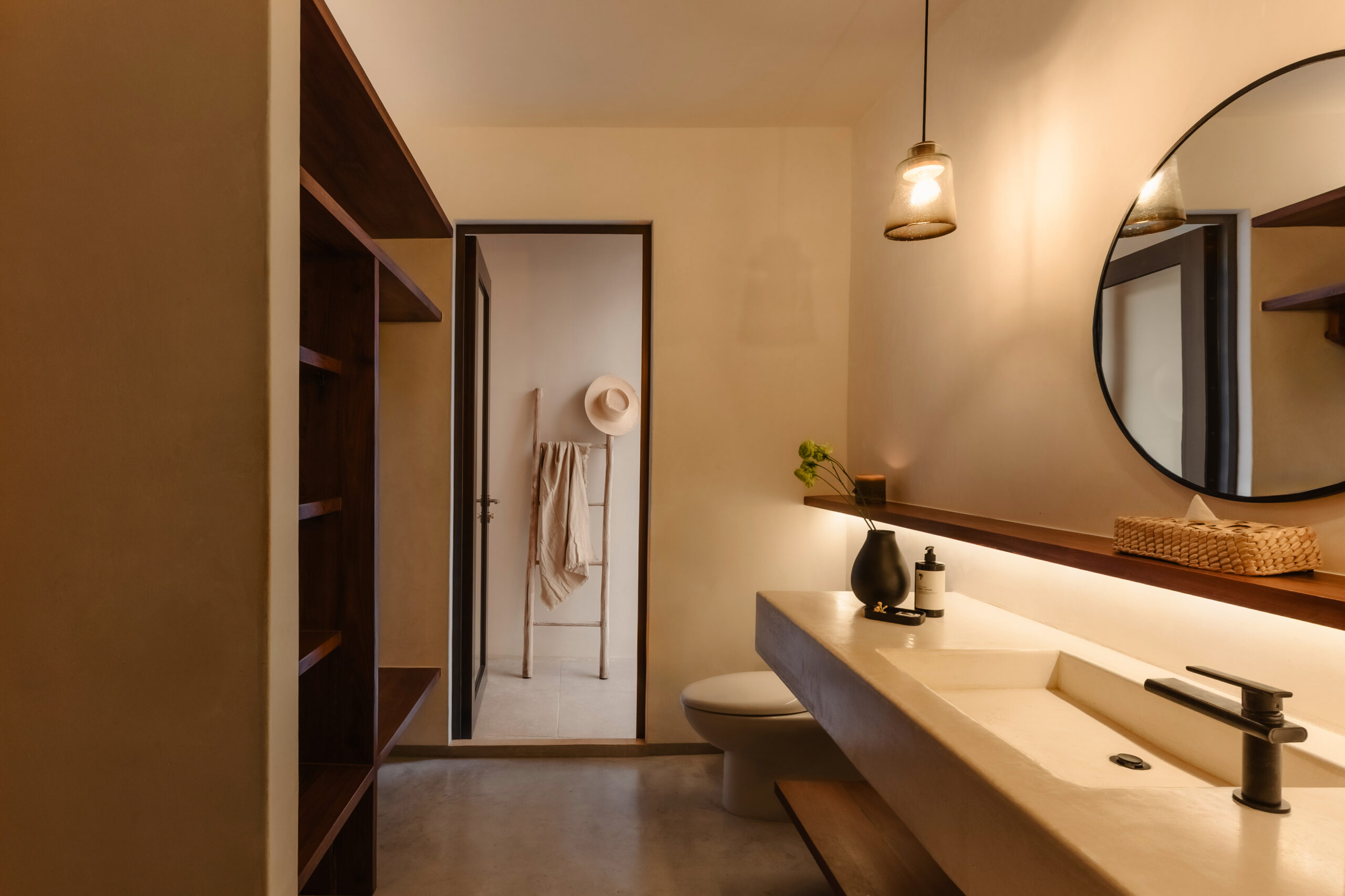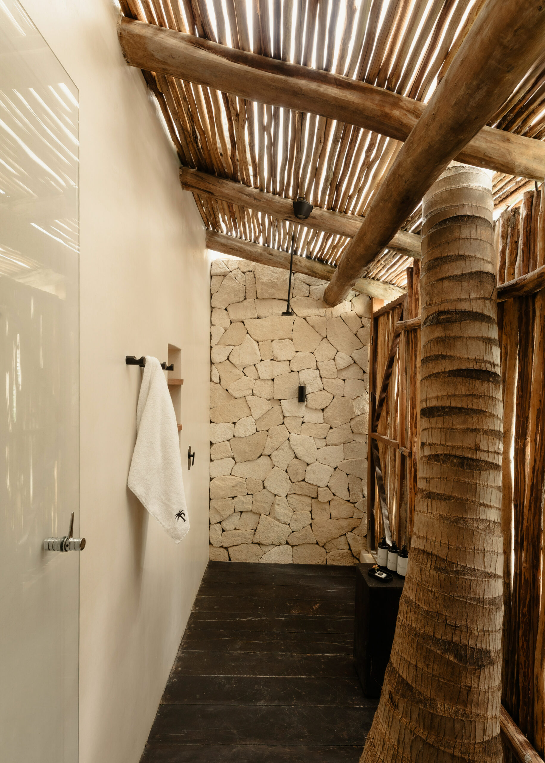 The four bedrooms are individually designed with king beds, bohemian art, macramé wall hangings, woven details, and concrete or stone ensuites with round mirrors, floating vanities, and black fixtures. Several bedrooms have direct terrace or balcony access with hammocks overlooking the sea. An outdoor stone shower sits among the palms. A rooftop daybed platform tucked under palapa offers one of the best sunset viewpoints in Tankah Bay.