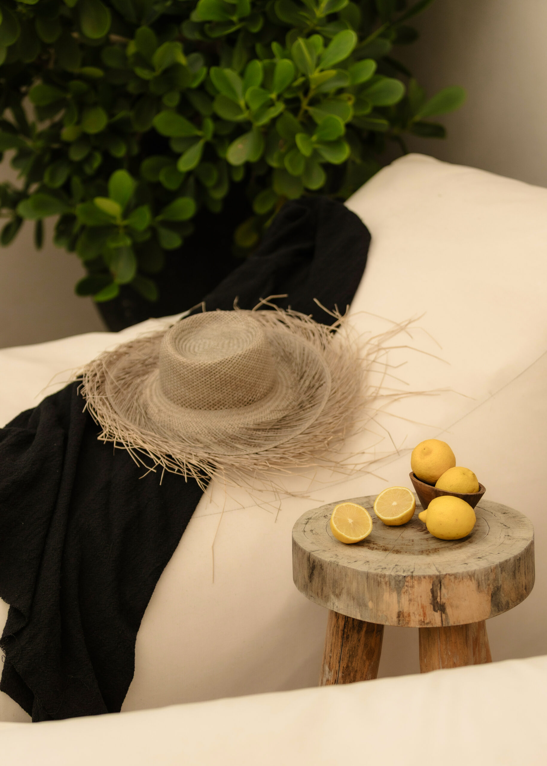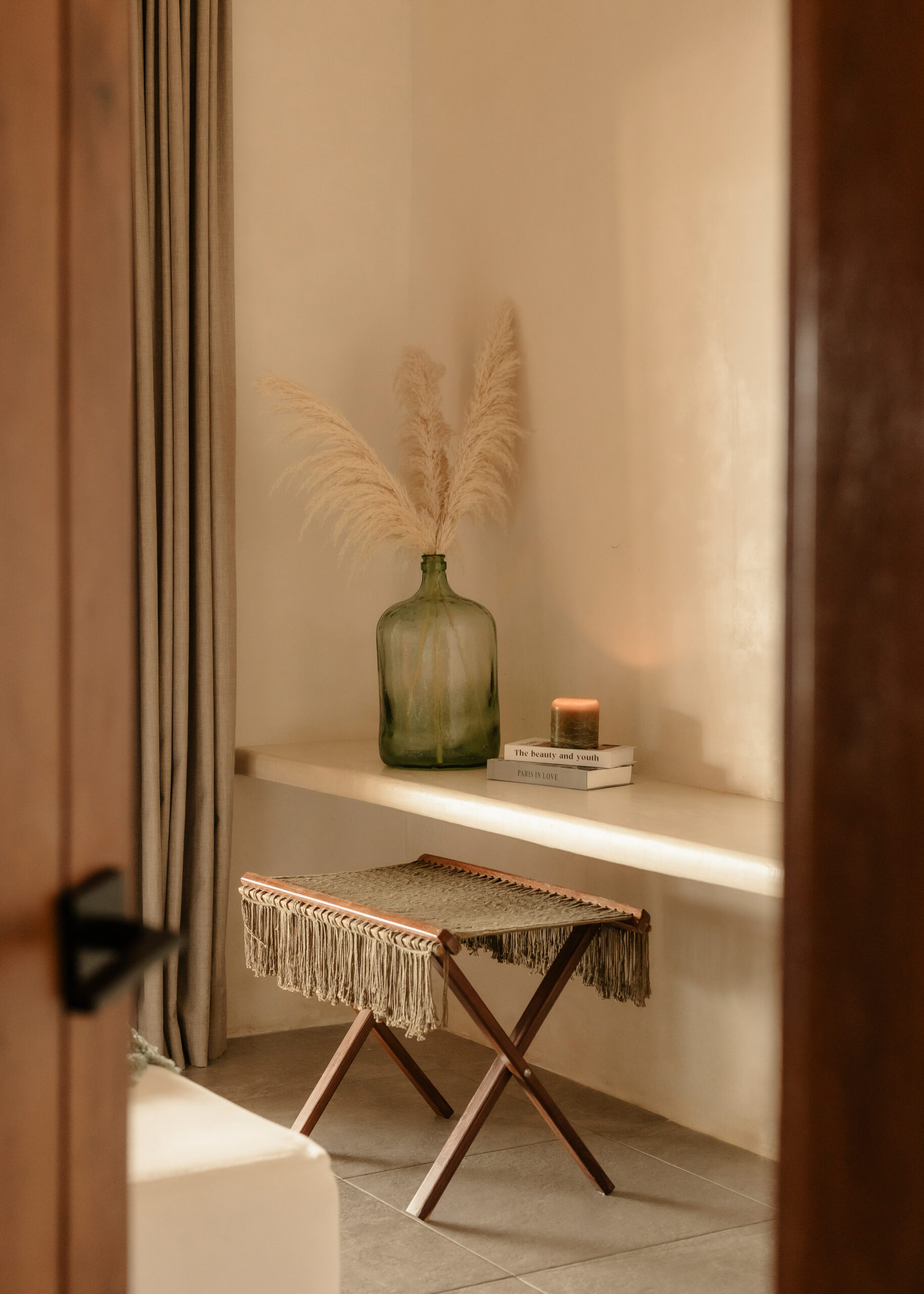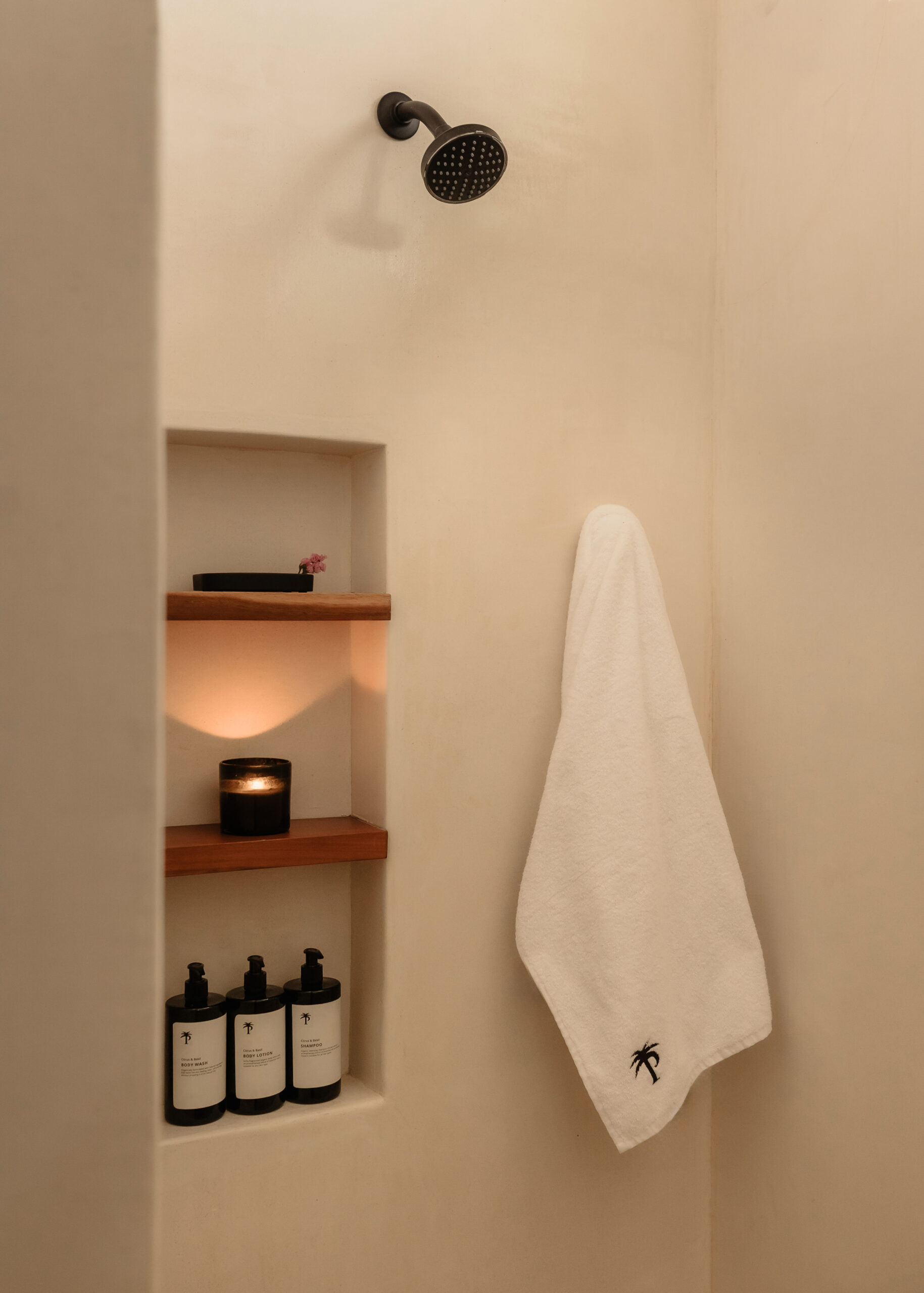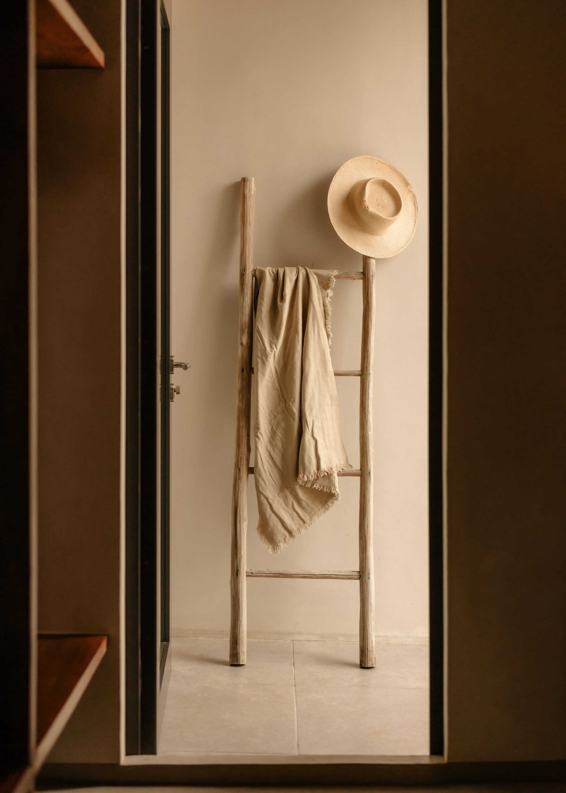 The four bedrooms are individually designed with king beds, bohemian art, macramé wall hangings, woven details, and concrete or stone ensuites with round mirrors, floating vanities, and black fixtures. Several bedrooms have direct terrace or balcony access with hammocks overlooking the sea. An outdoor stone shower sits among the palms. A rooftop daybed platform tucked under palapa offers one of the best sunset viewpoints in Tankah Bay.