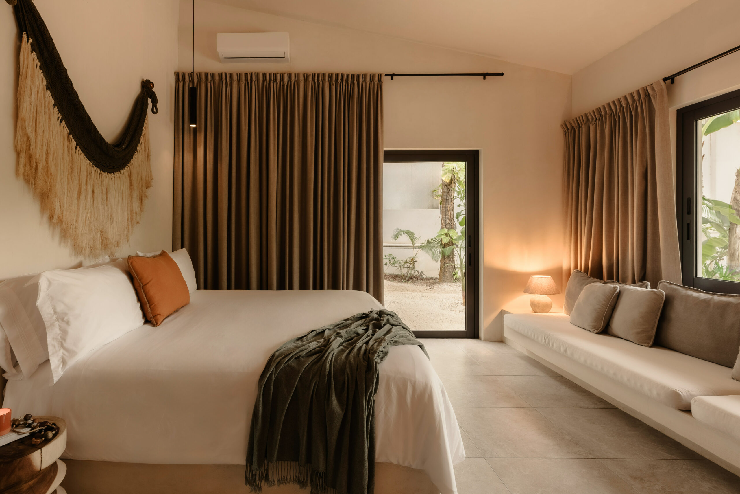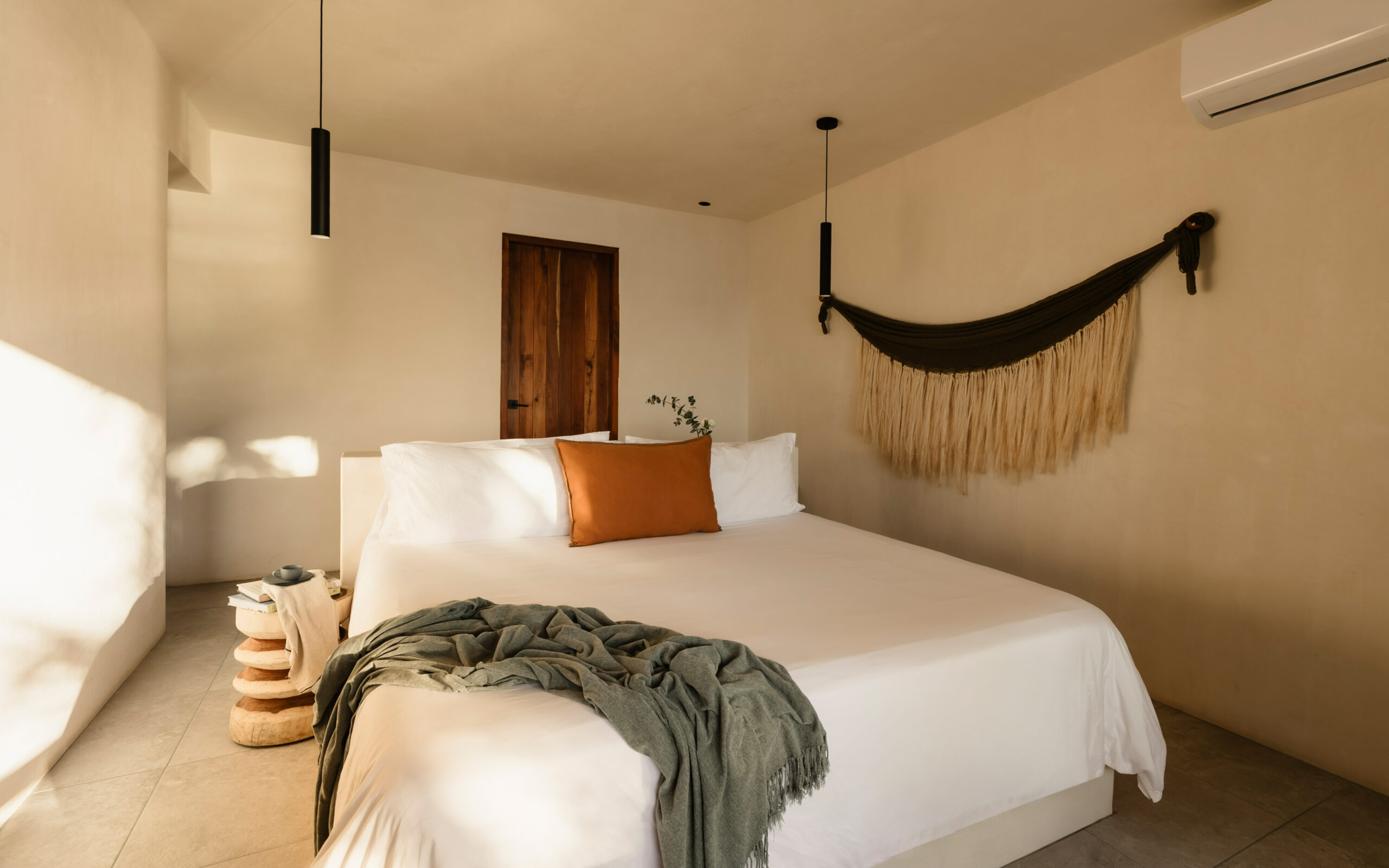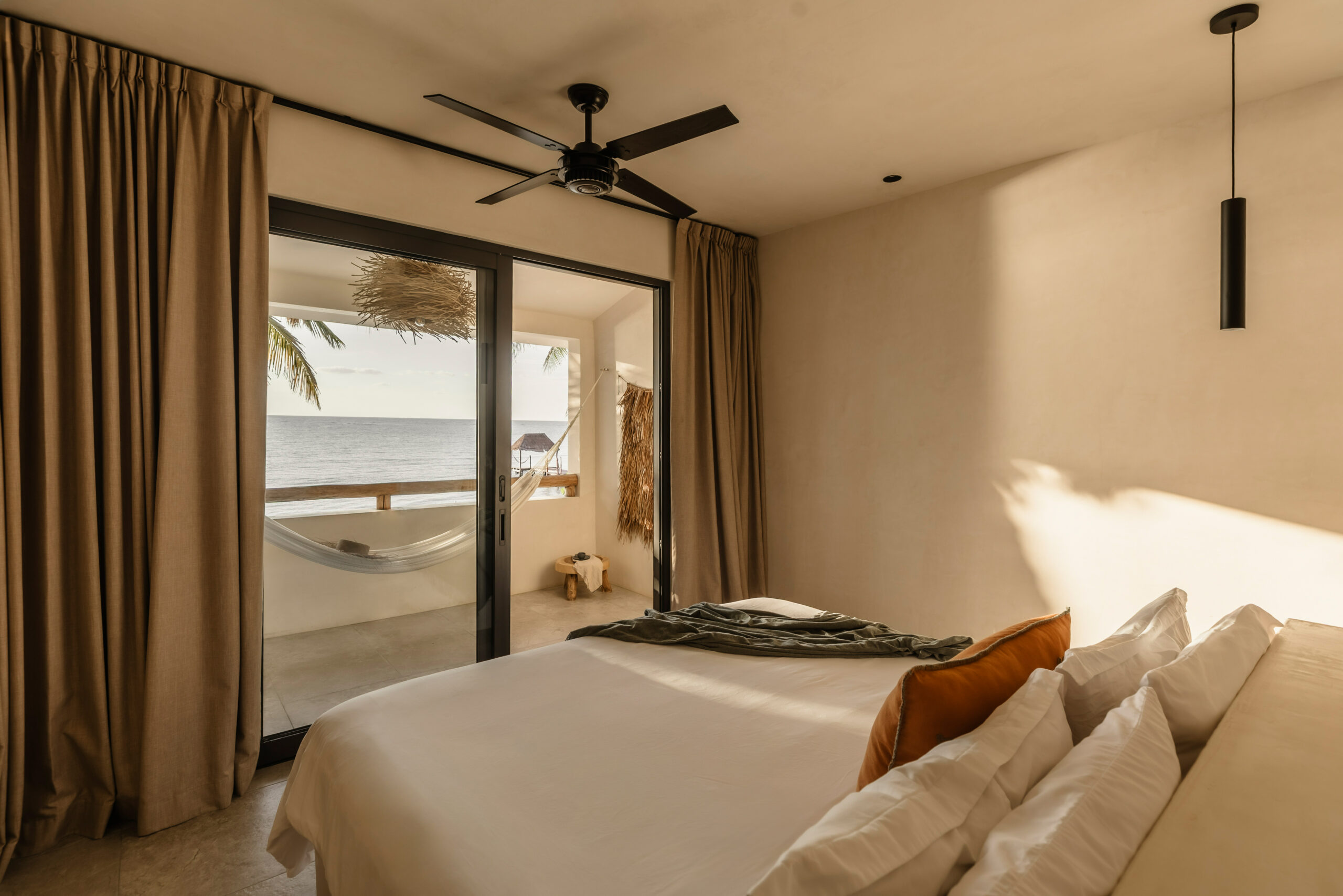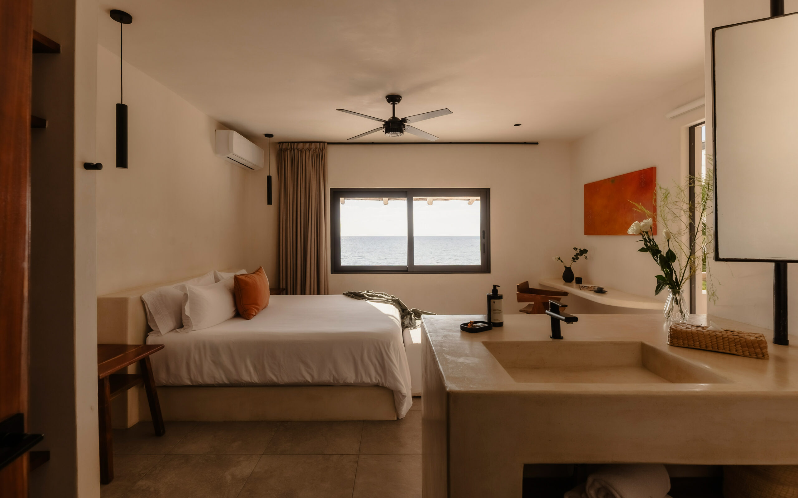 King bed, ocean-view terrace access, hammock, concrete ensuite bathroom, round mirror, black fixtures, air conditioning, WiFi
