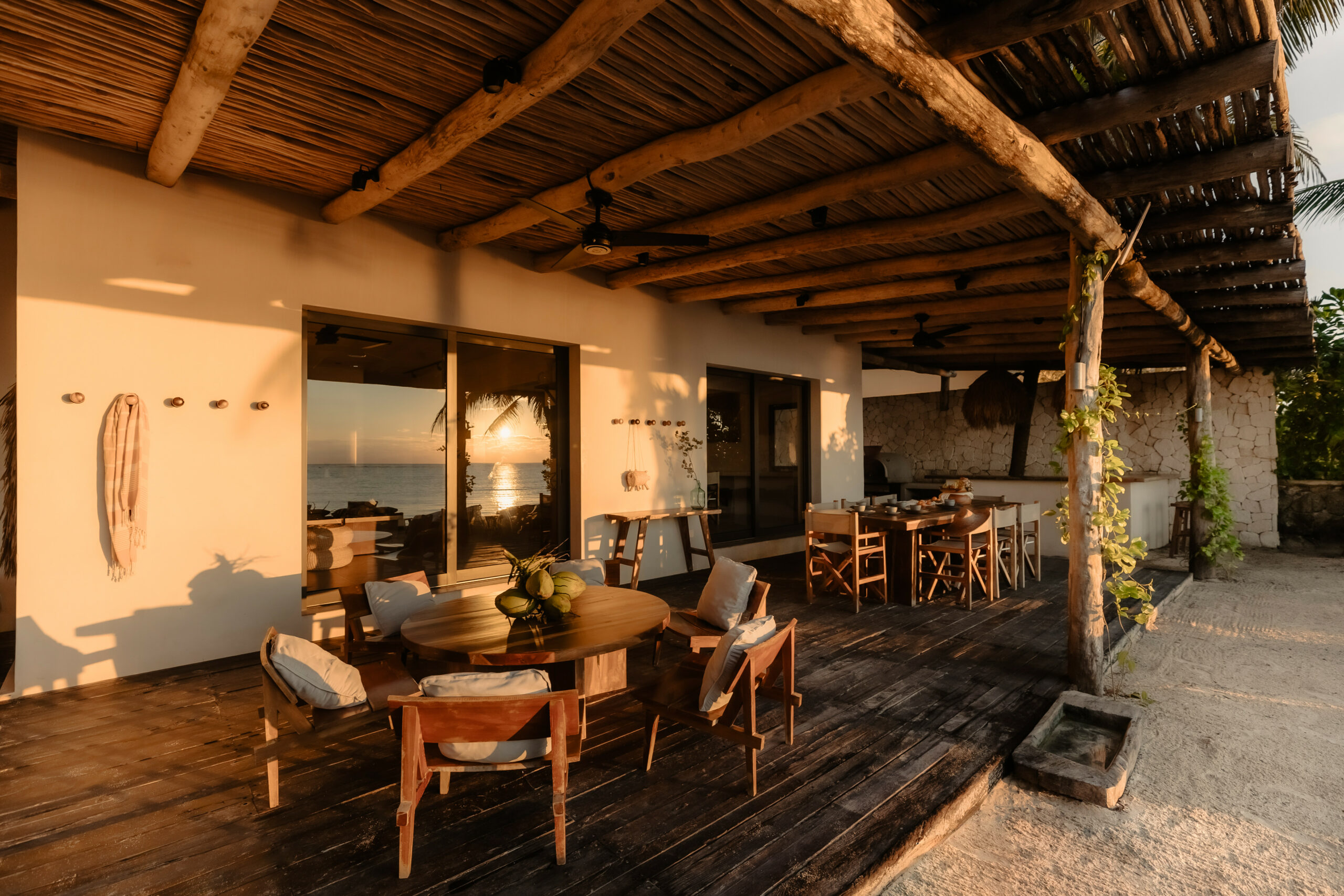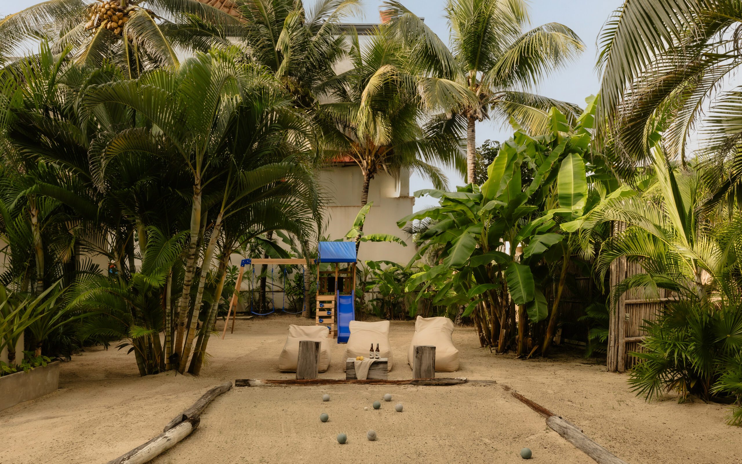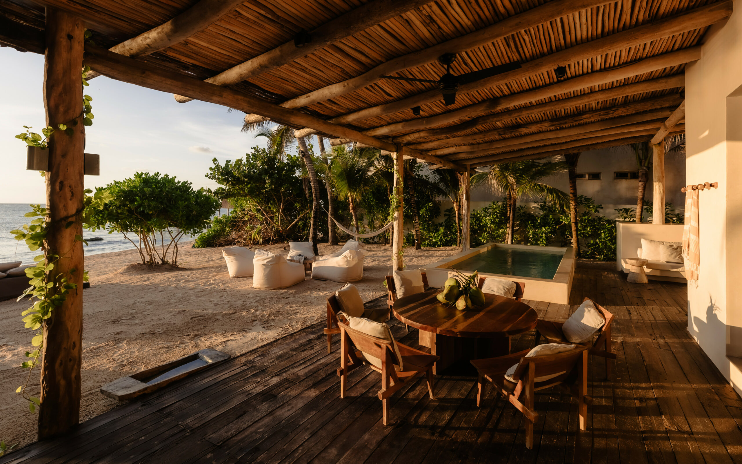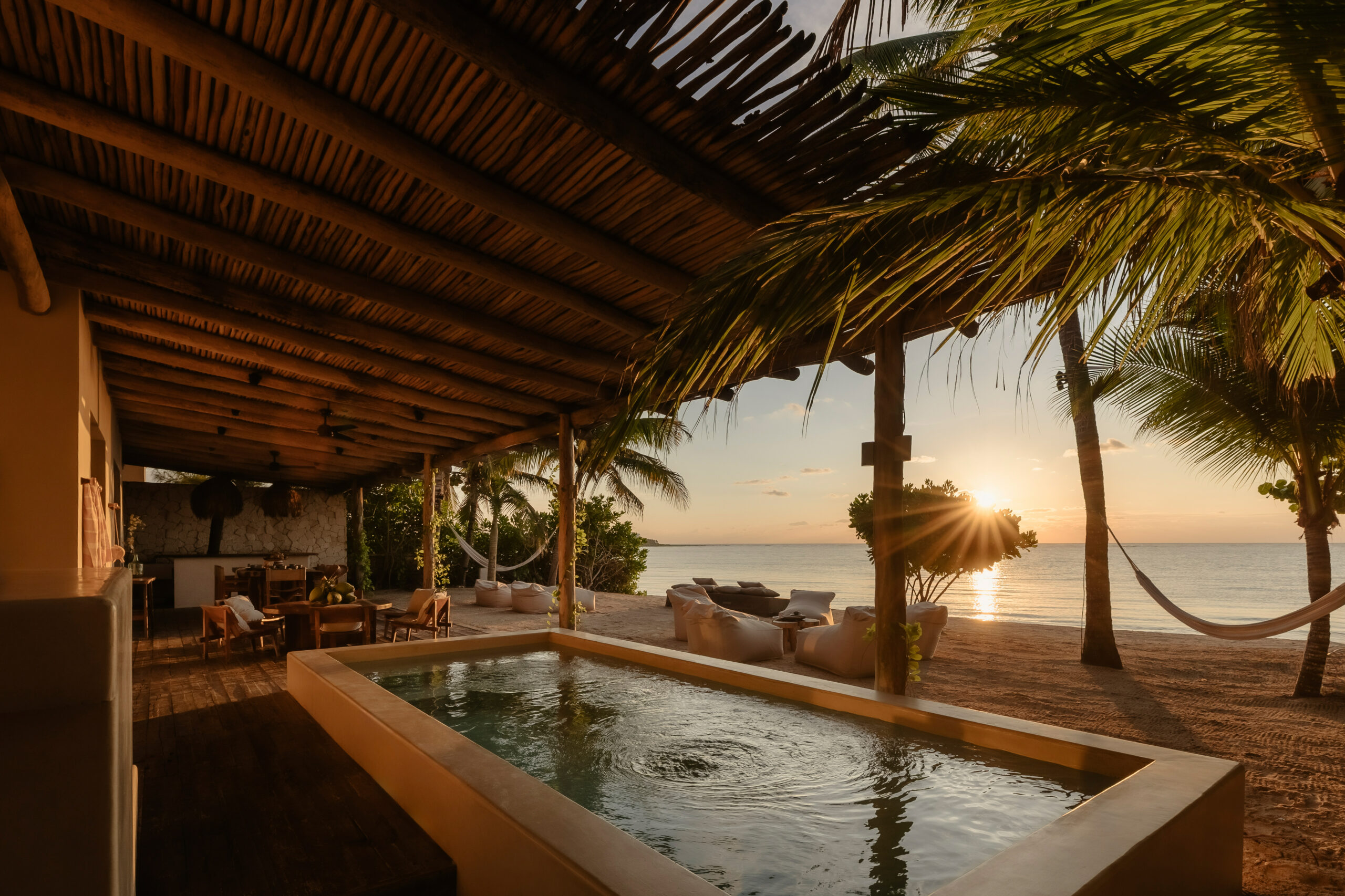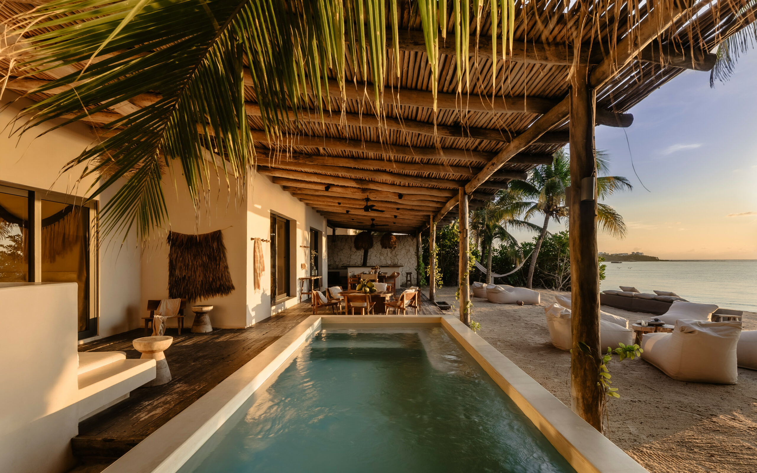 The living spaces are relaxed and purposefully organic — a sunlit living room with a built-in sectional sofa and macramé wall art, an indoor dining room with a terracotta accent wall and a wooden table for eight, and a modern U-shaped kitchen with a wood island and bar stools. An outdoor palapa dining area with straw pendant lights doubles as the main social space, positioned between the plunge pool and the beach. A sandbox bocce court and children’s wooden playground are tucked among the palms for families.