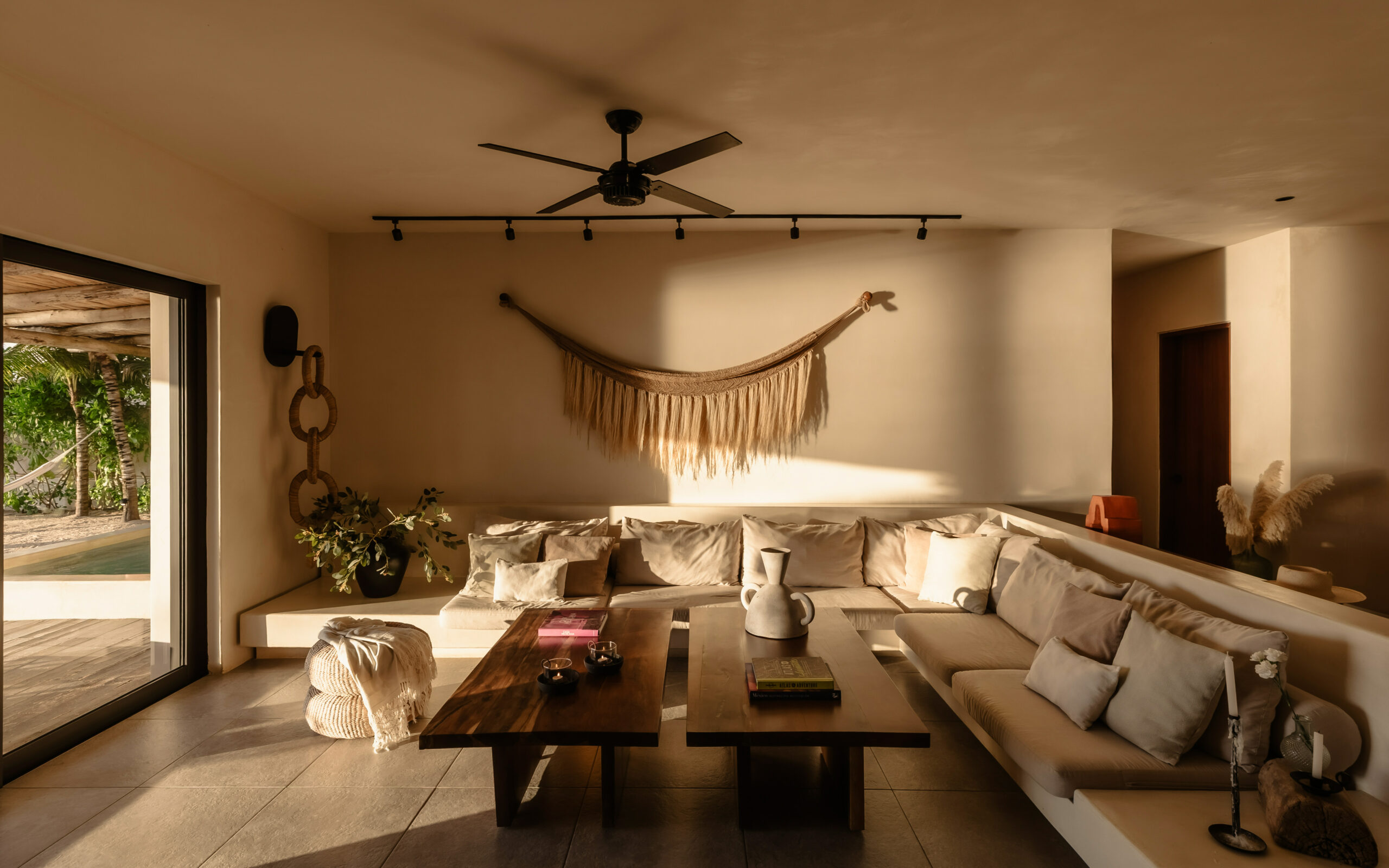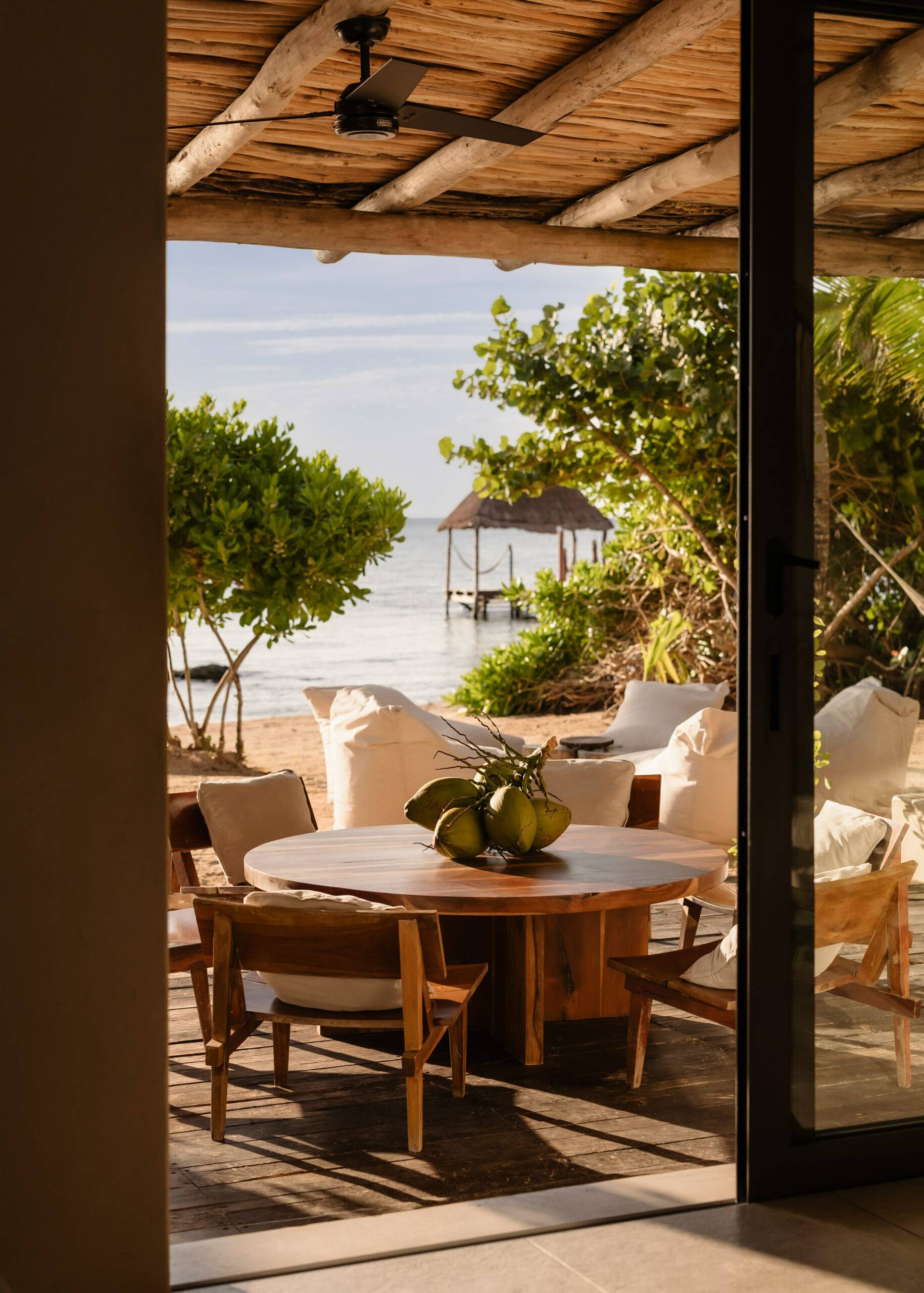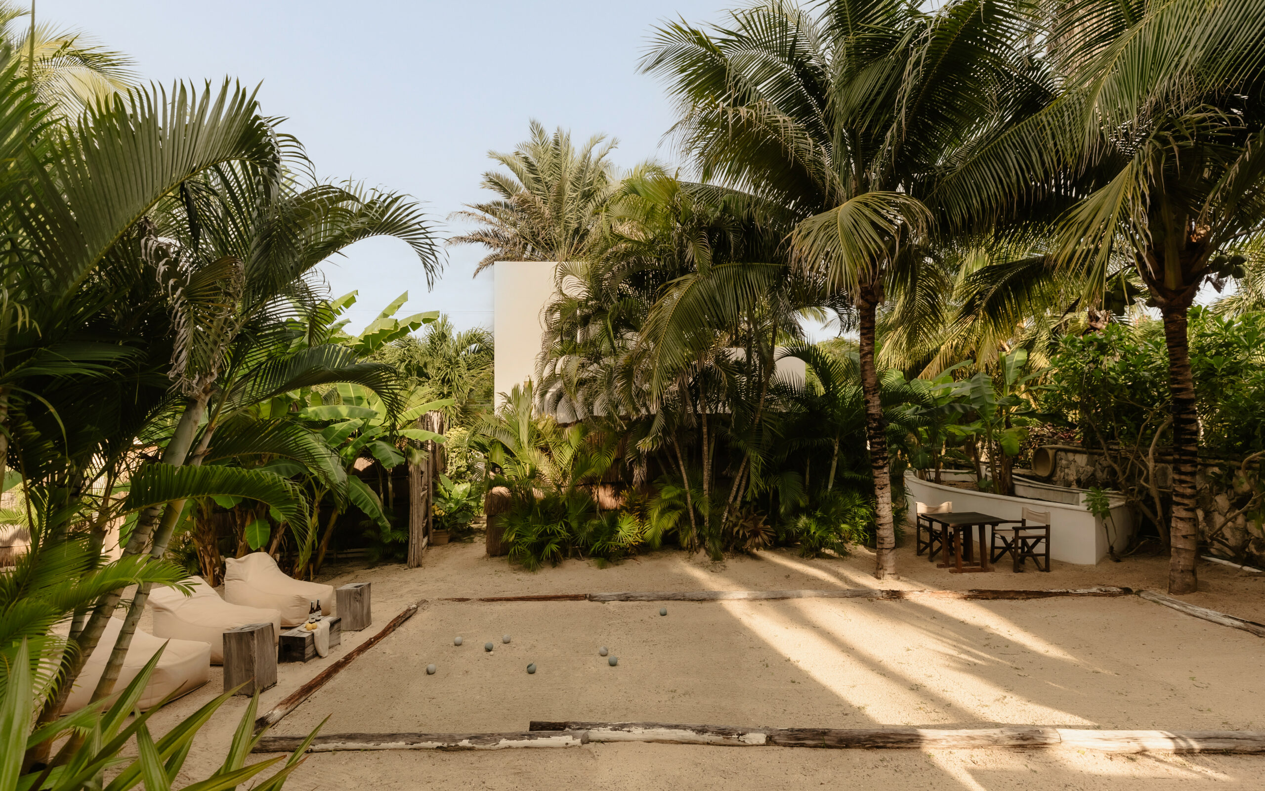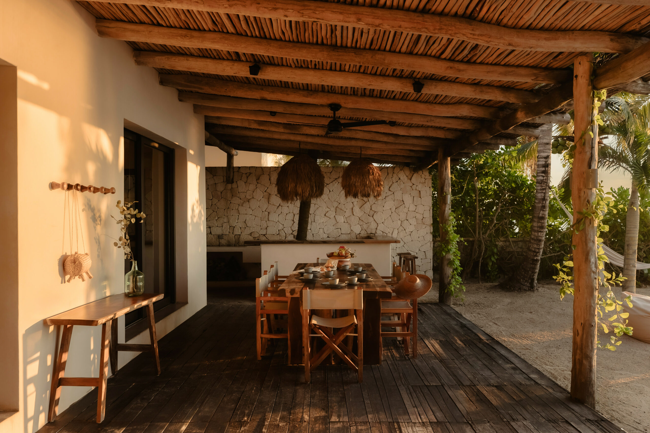 The living spaces are relaxed and purposefully organic — a sunlit living room with a built-in sectional sofa and macramé wall art, an indoor dining room with a terracotta accent wall and a wooden table for eight, and a modern U-shaped kitchen with a wood island and bar stools. An outdoor palapa dining area with straw pendant lights doubles as the main social space, positioned between the plunge pool and the beach. A sandbox bocce court and children’s wooden playground are tucked among the palms for families.