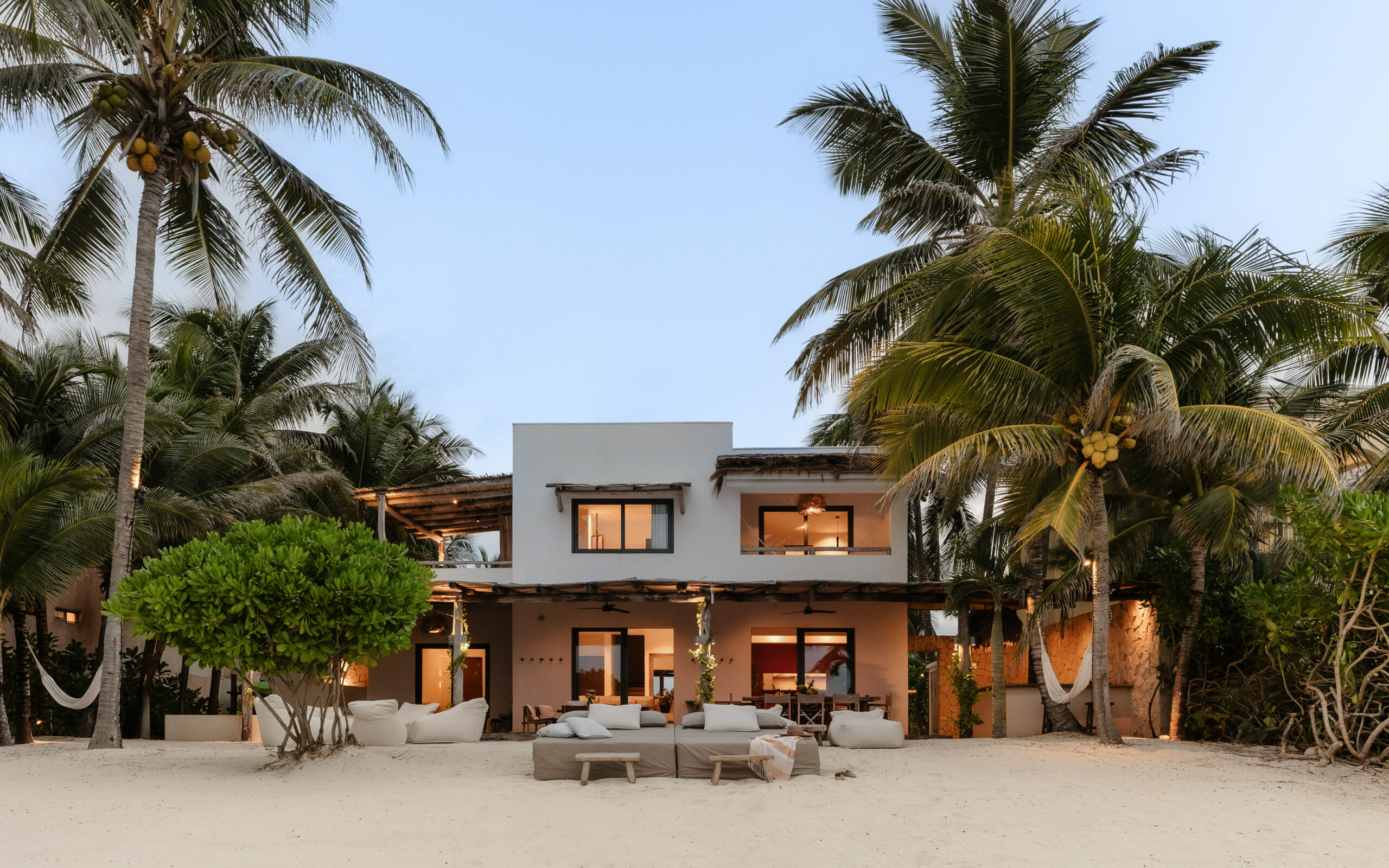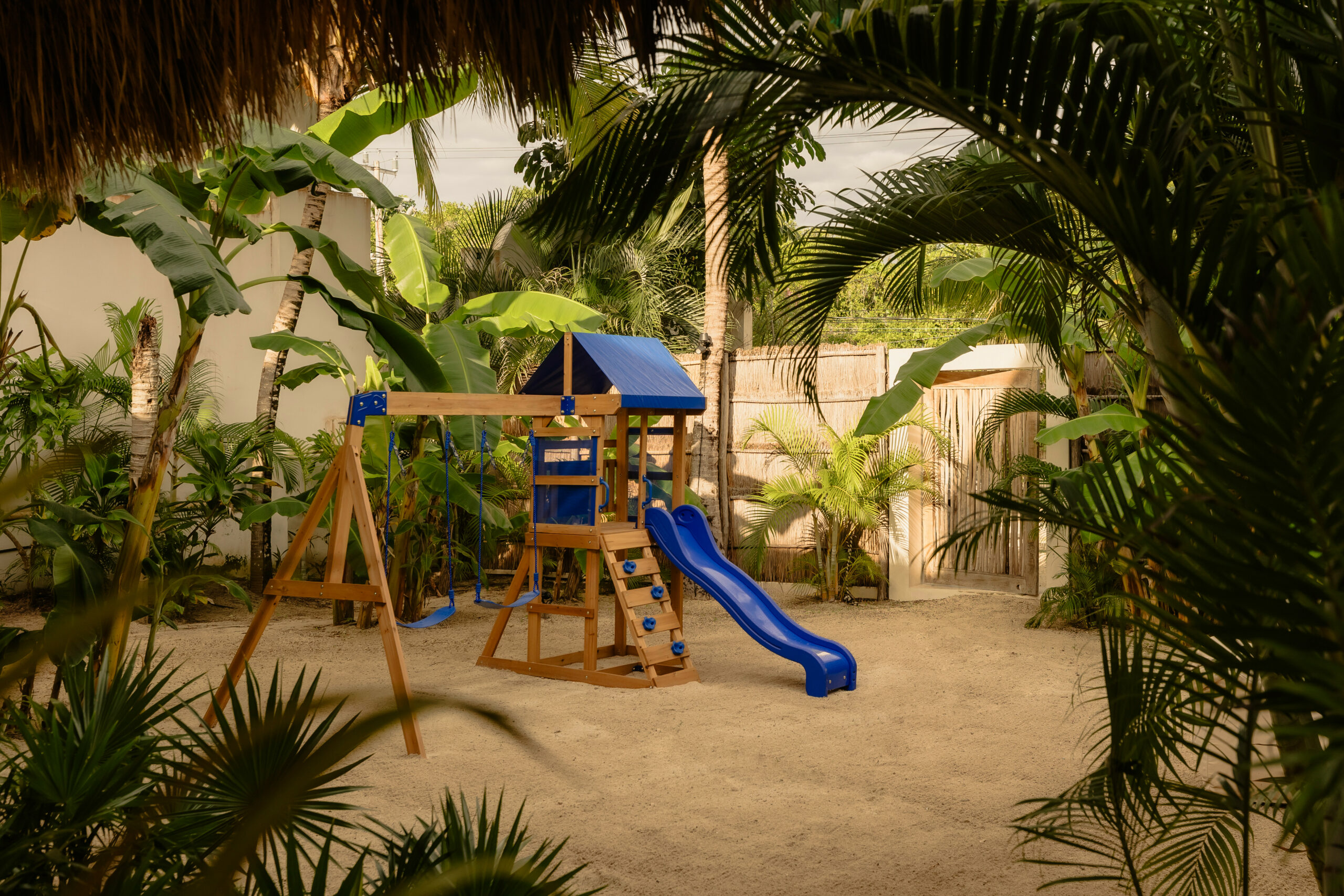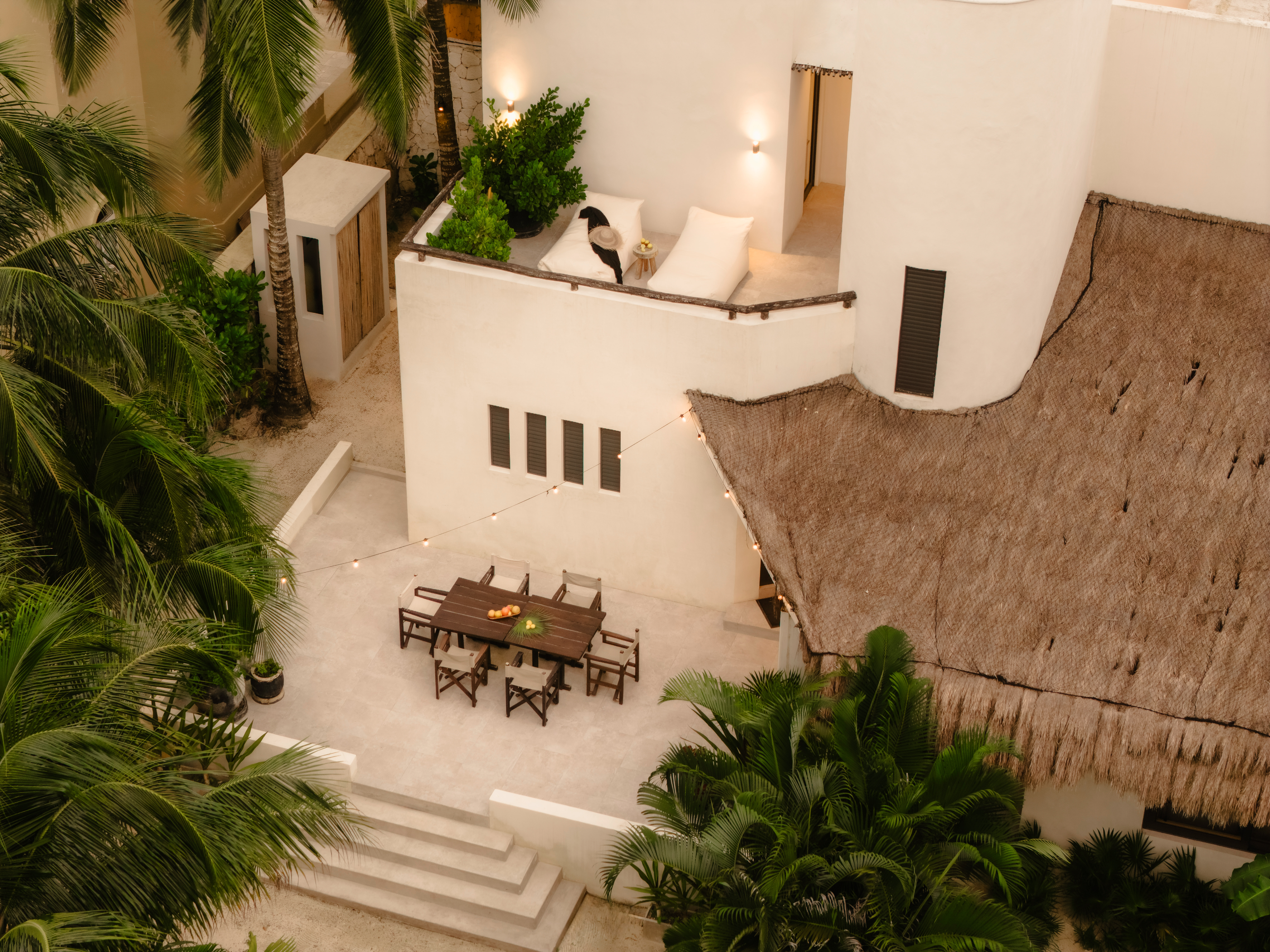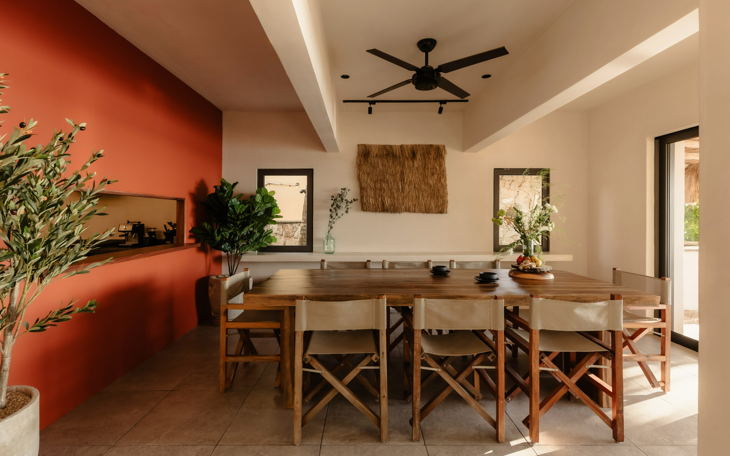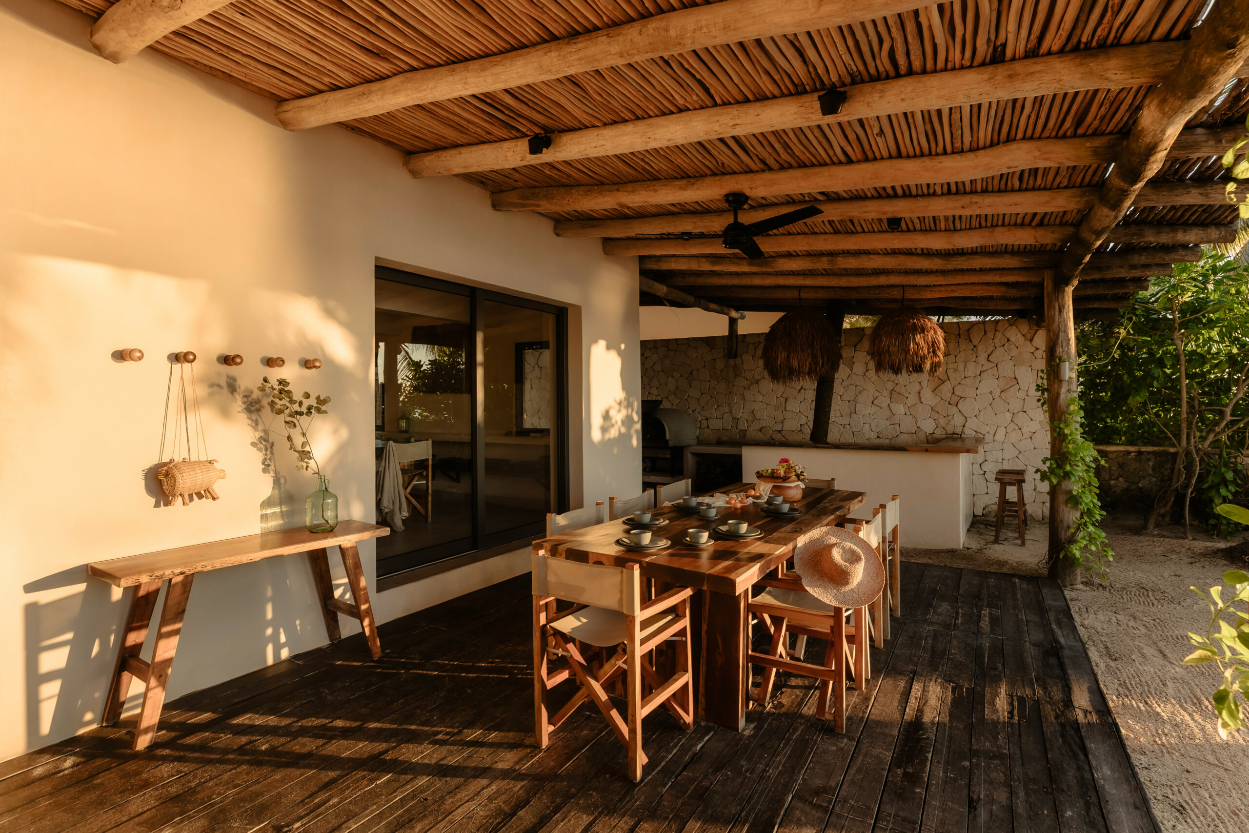 The living spaces are relaxed and purposefully organic — a sunlit living room with a built-in sectional sofa and macramé wall art, an indoor dining room with a terracotta accent wall and a wooden table for eight, and a modern U-shaped kitchen with a wood island and bar stools. An outdoor palapa dining area with straw pendant lights doubles as the main social space, positioned between the plunge pool and the beach. A sandbox bocce court and children’s wooden playground are tucked among the palms for families.