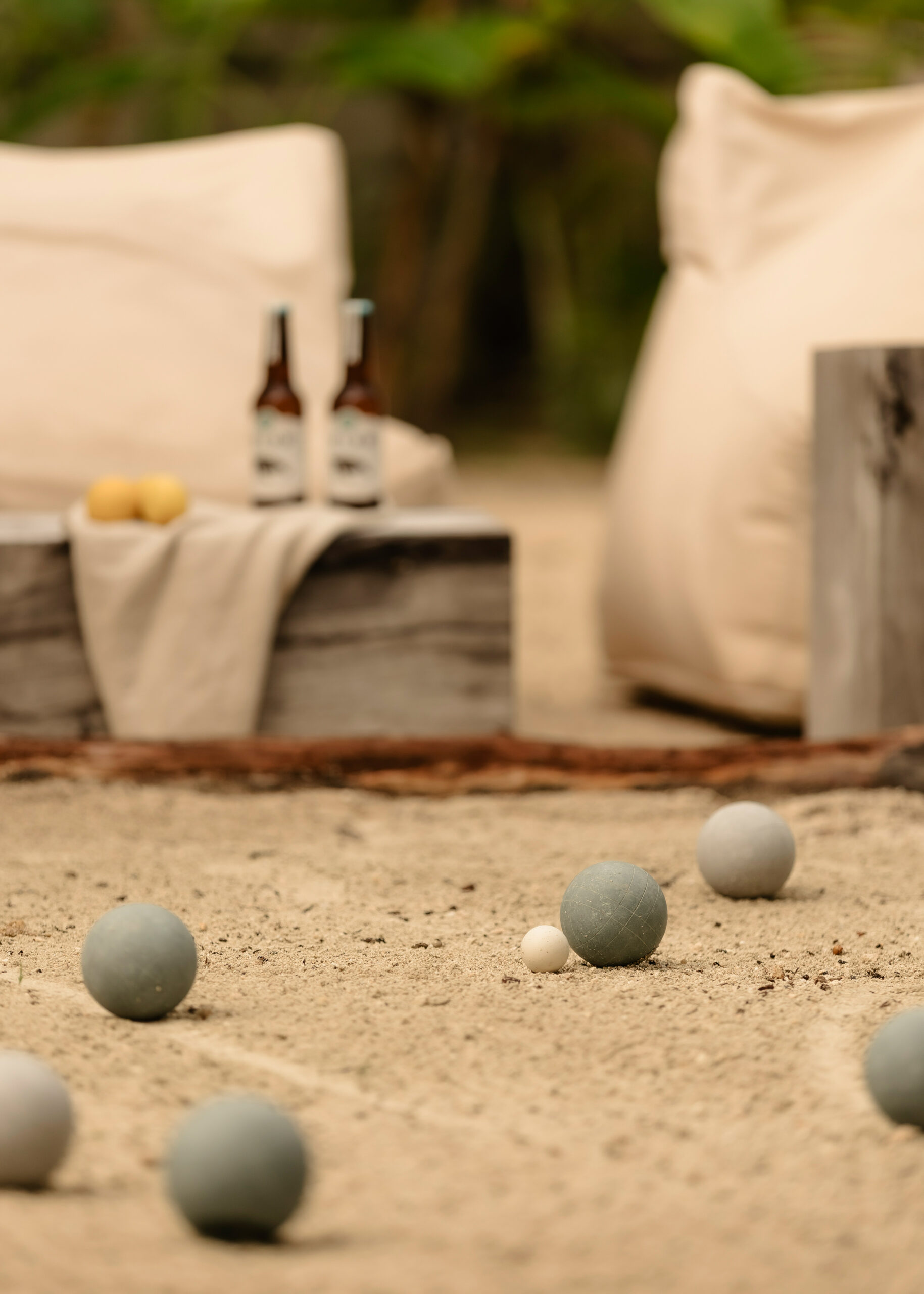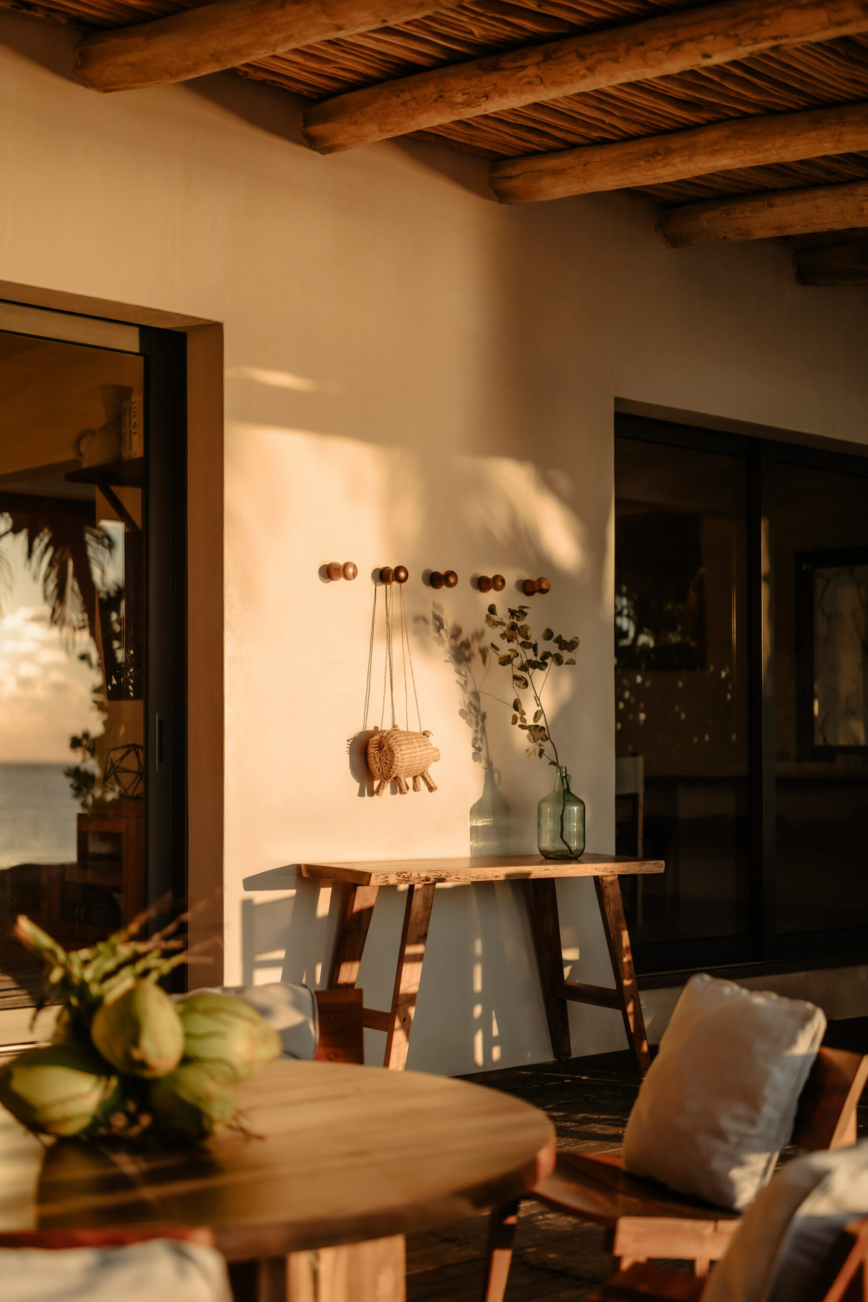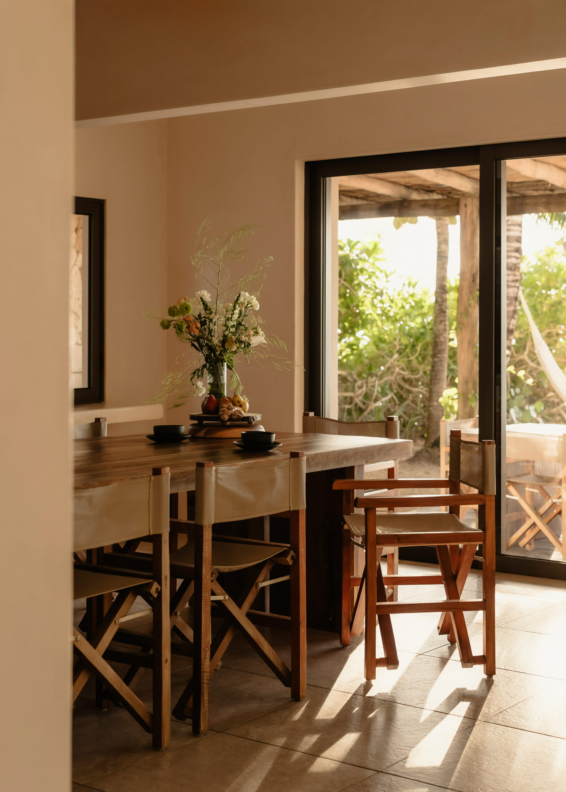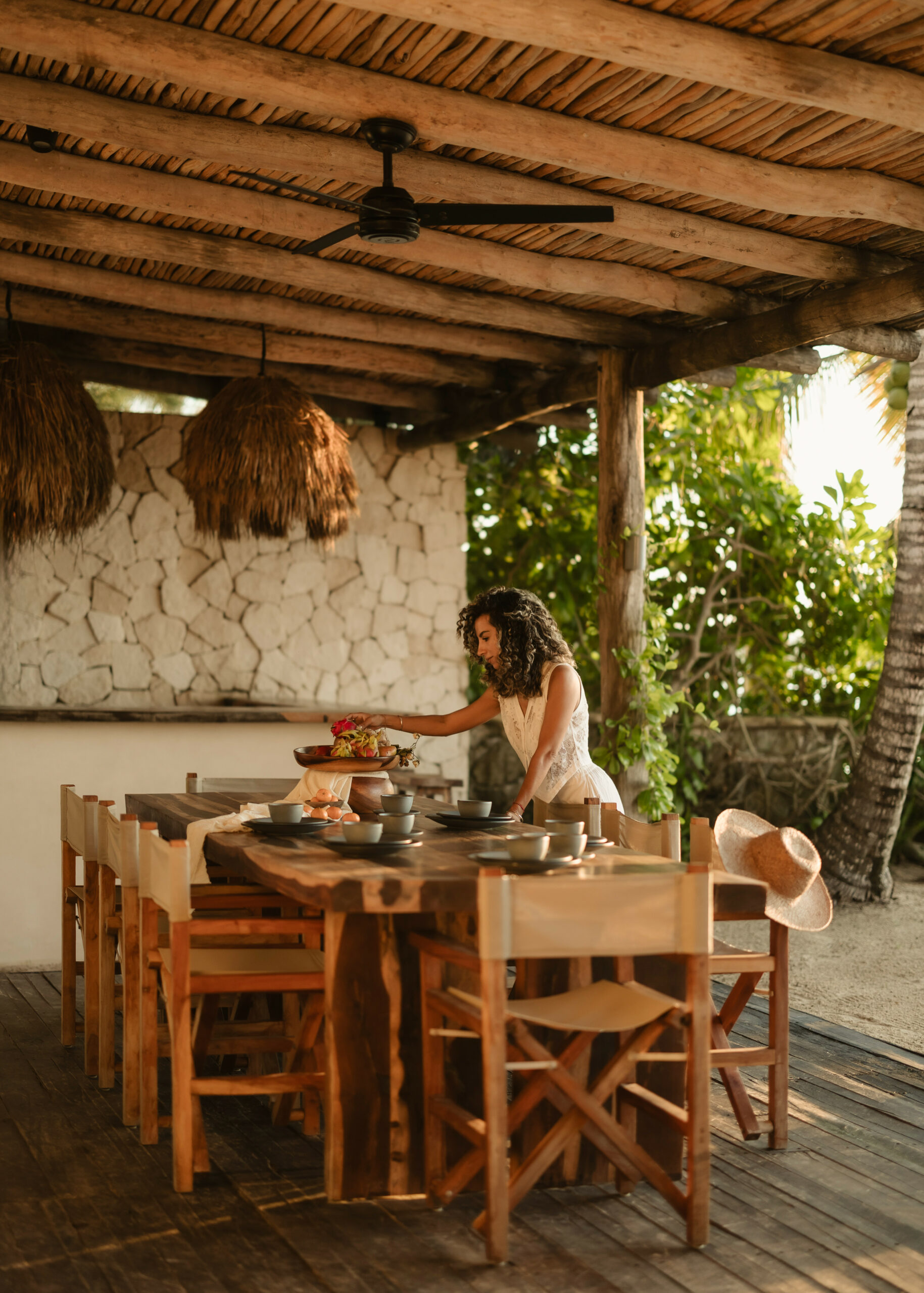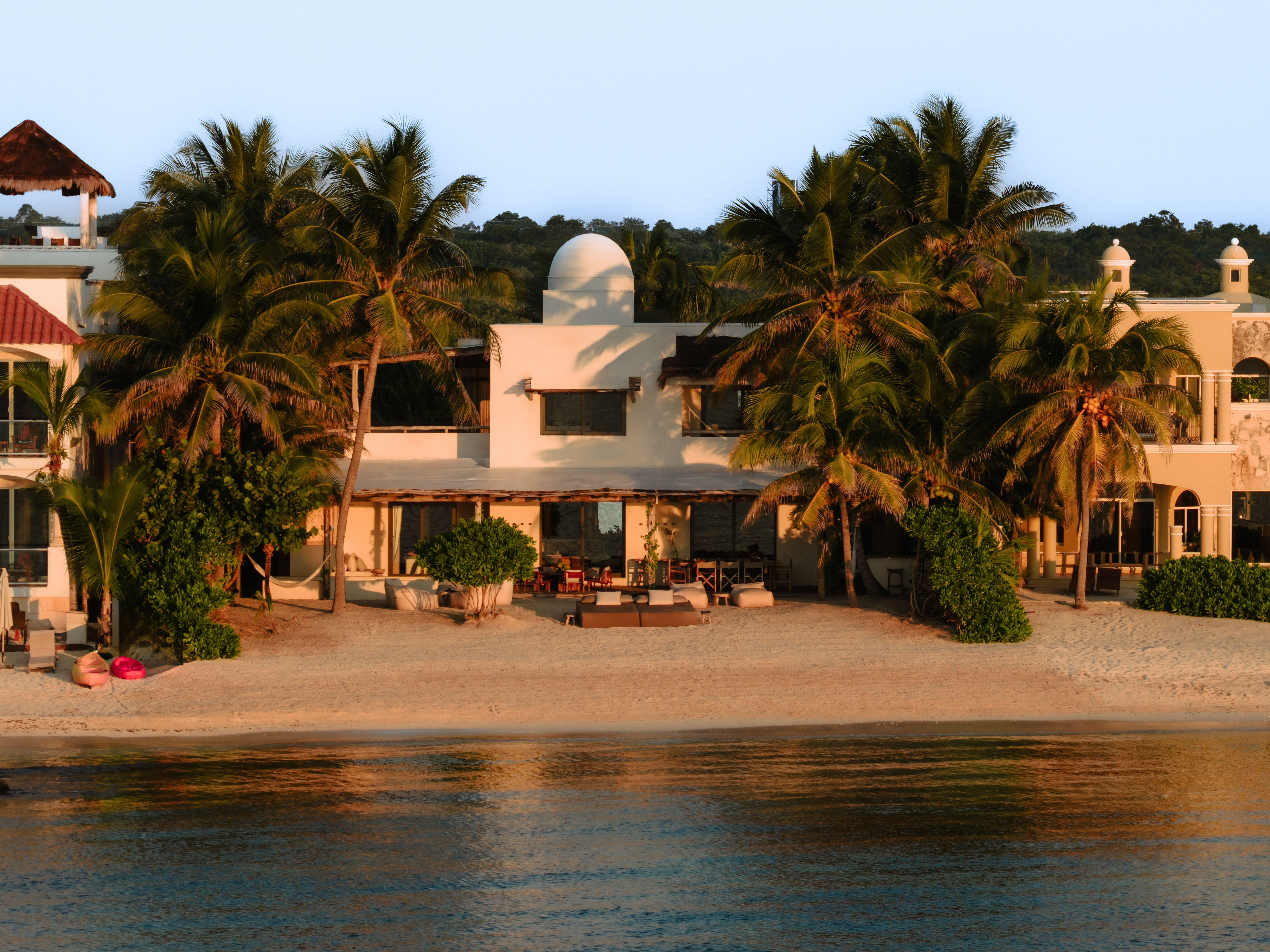 The living spaces are relaxed and purposefully organic — a sunlit living room with a built-in sectional sofa and macramé wall art, an indoor dining room with a terracotta accent wall and a wooden table for eight, and a modern U-shaped kitchen with a wood island and bar stools. An outdoor palapa dining area with straw pendant lights doubles as the main social space, positioned between the plunge pool and the beach. A sandbox bocce court and children’s wooden playground are tucked among the palms for families.