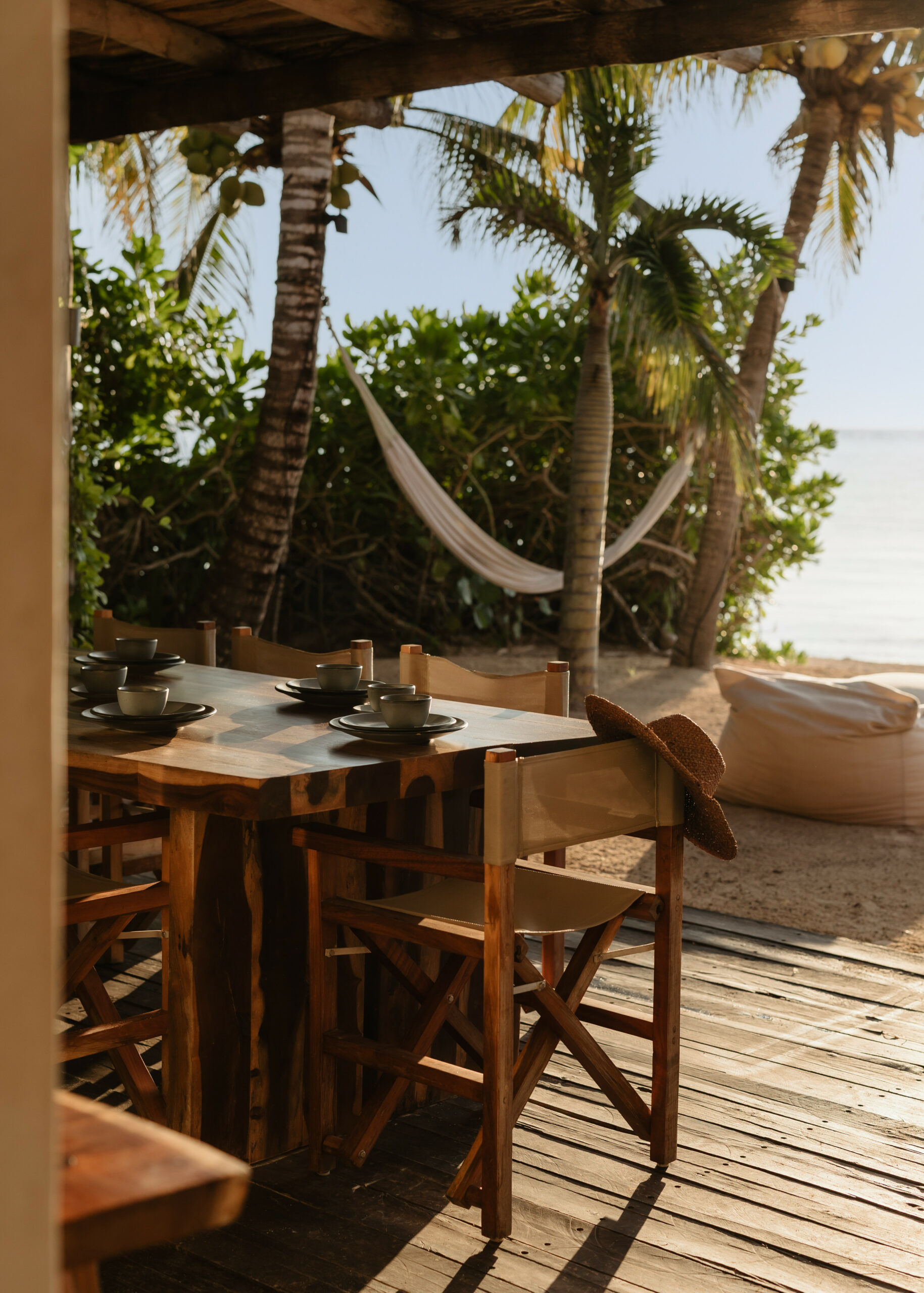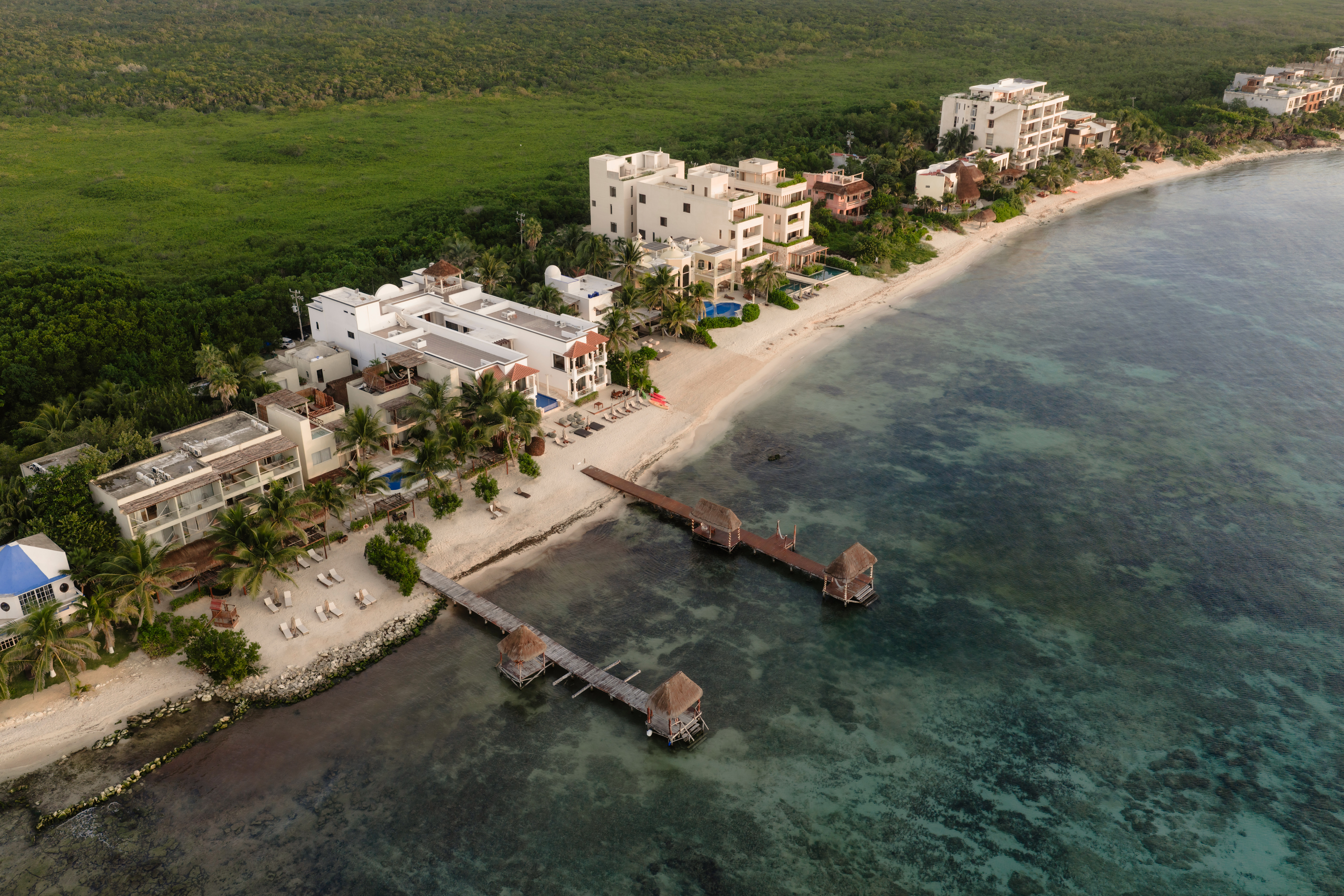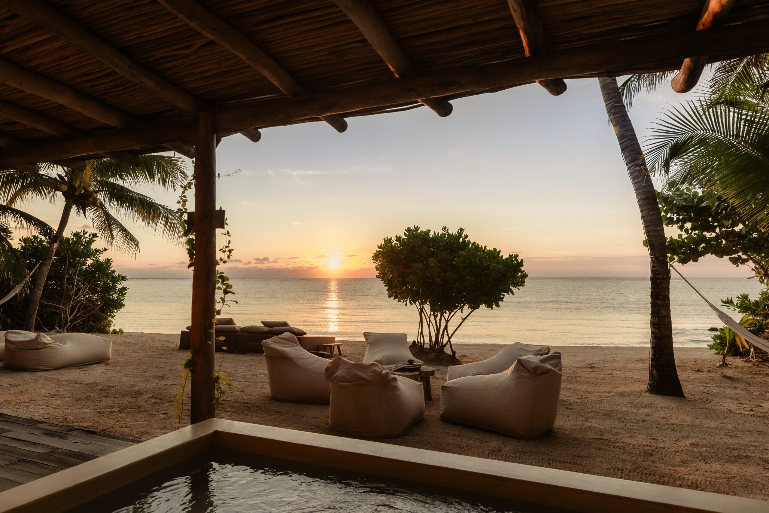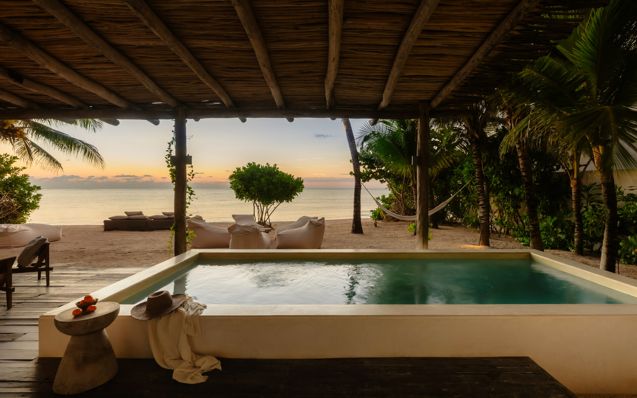 The cenote on the property is a rare feature — a natural freshwater pool connected to the underground river system that runs beneath the Yucatán Peninsula and emerges at the sea’s edge here in Tankah Bay. Guests can snorkel directly into the cenote from the beach, swimming between the freshwater cave system and the open Caribbean within a few meters. The overwater palapa pier extends from the beach into the bay with a hammock suspended above the water — a place to read, nap, or simply watch the light change over the reef. Kayaks are stored beachside for further exploration.