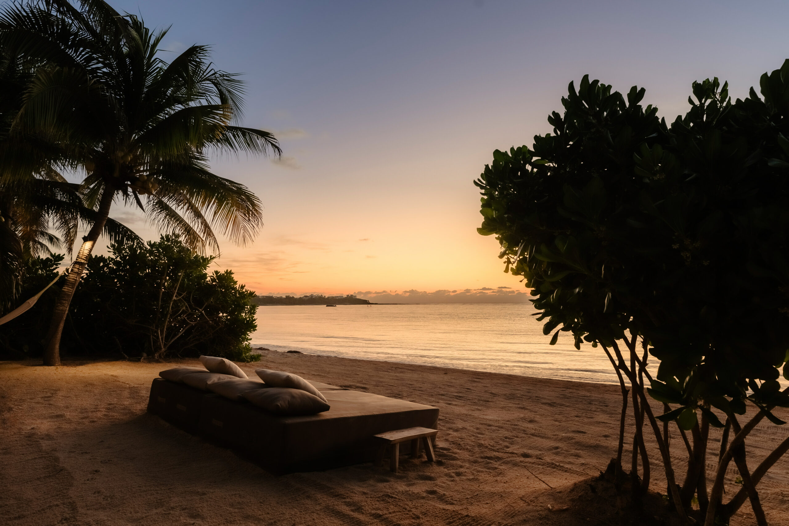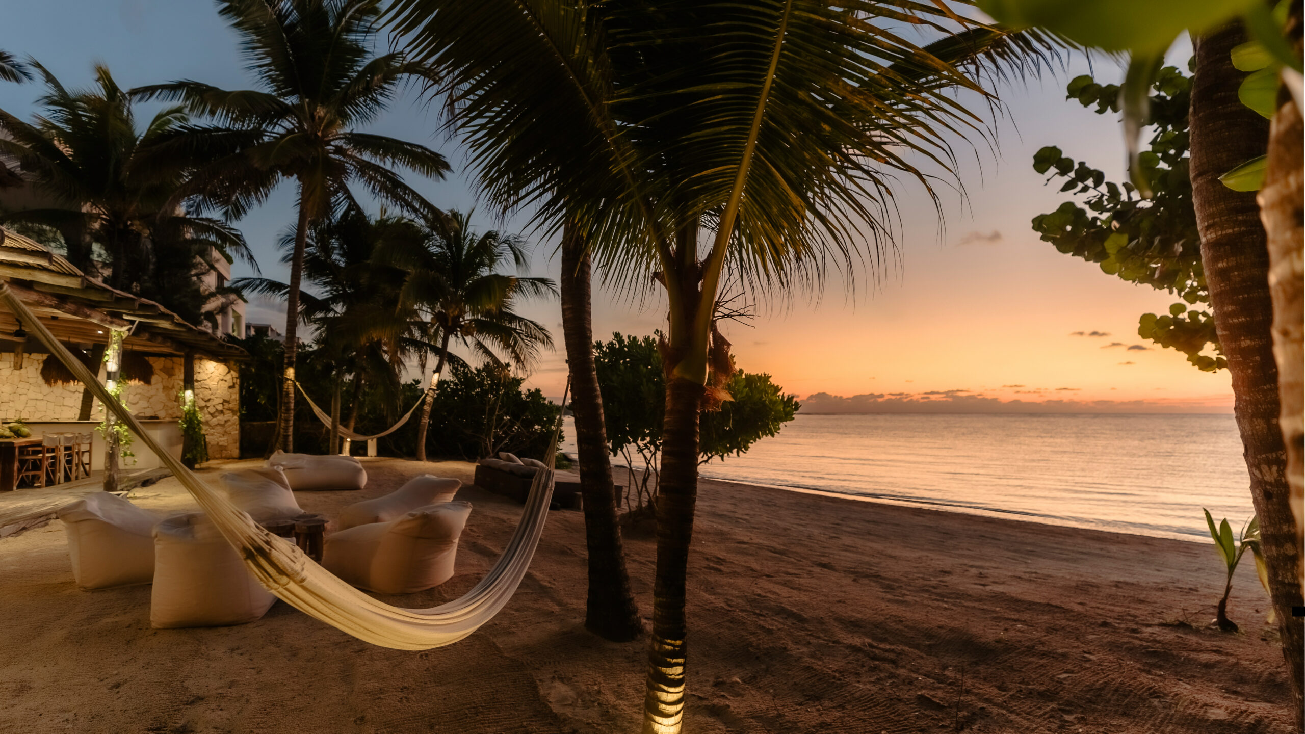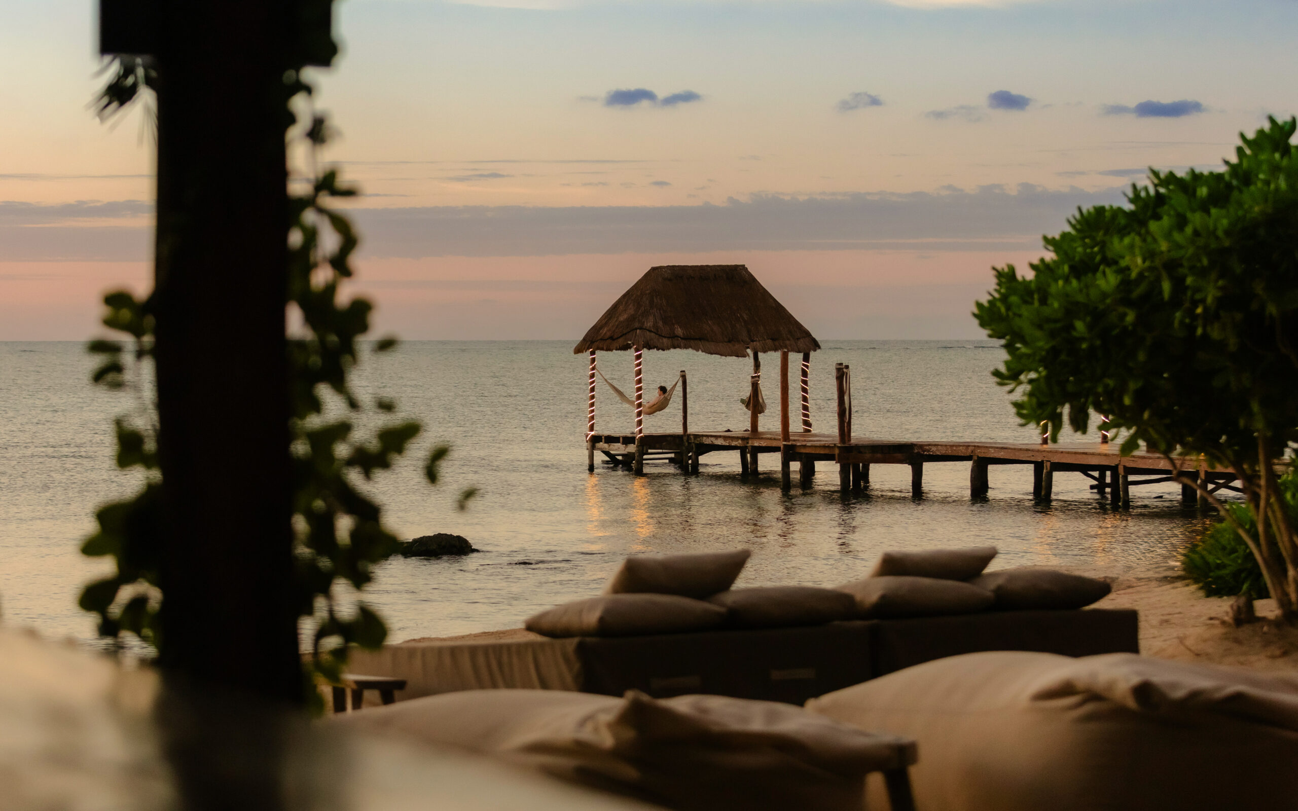 The cenote on the property is a rare feature — a natural freshwater pool connected to the underground river system that runs beneath the Yucatán Peninsula and emerges at the sea’s edge here in Tankah Bay. Guests can snorkel directly into the cenote from the beach, swimming between the freshwater cave system and the open Caribbean within a few meters. The overwater palapa pier extends from the beach into the bay with a hammock suspended above the water — a place to read, nap, or simply watch the light change over the reef. Kayaks are stored beachside for further exploration.