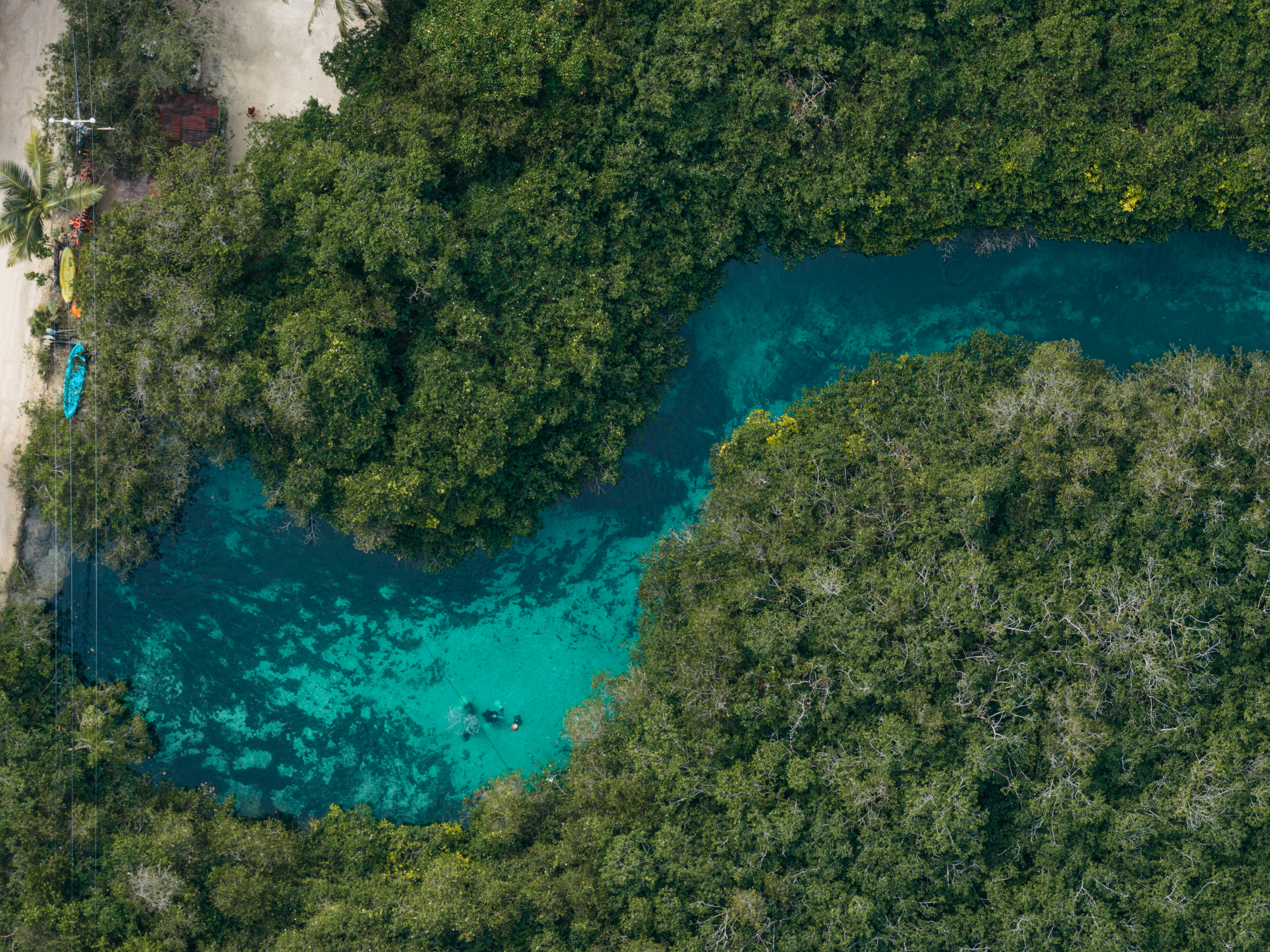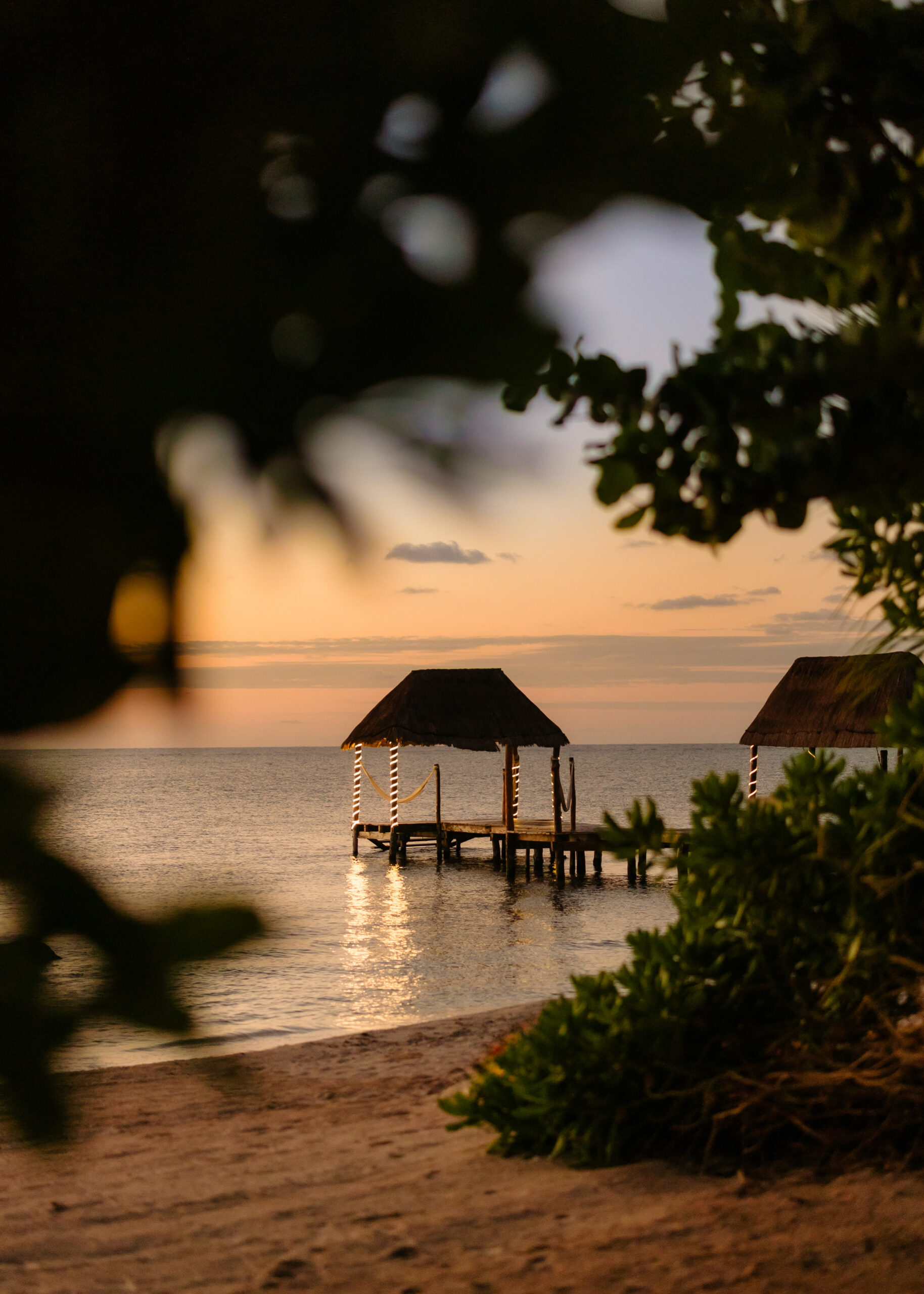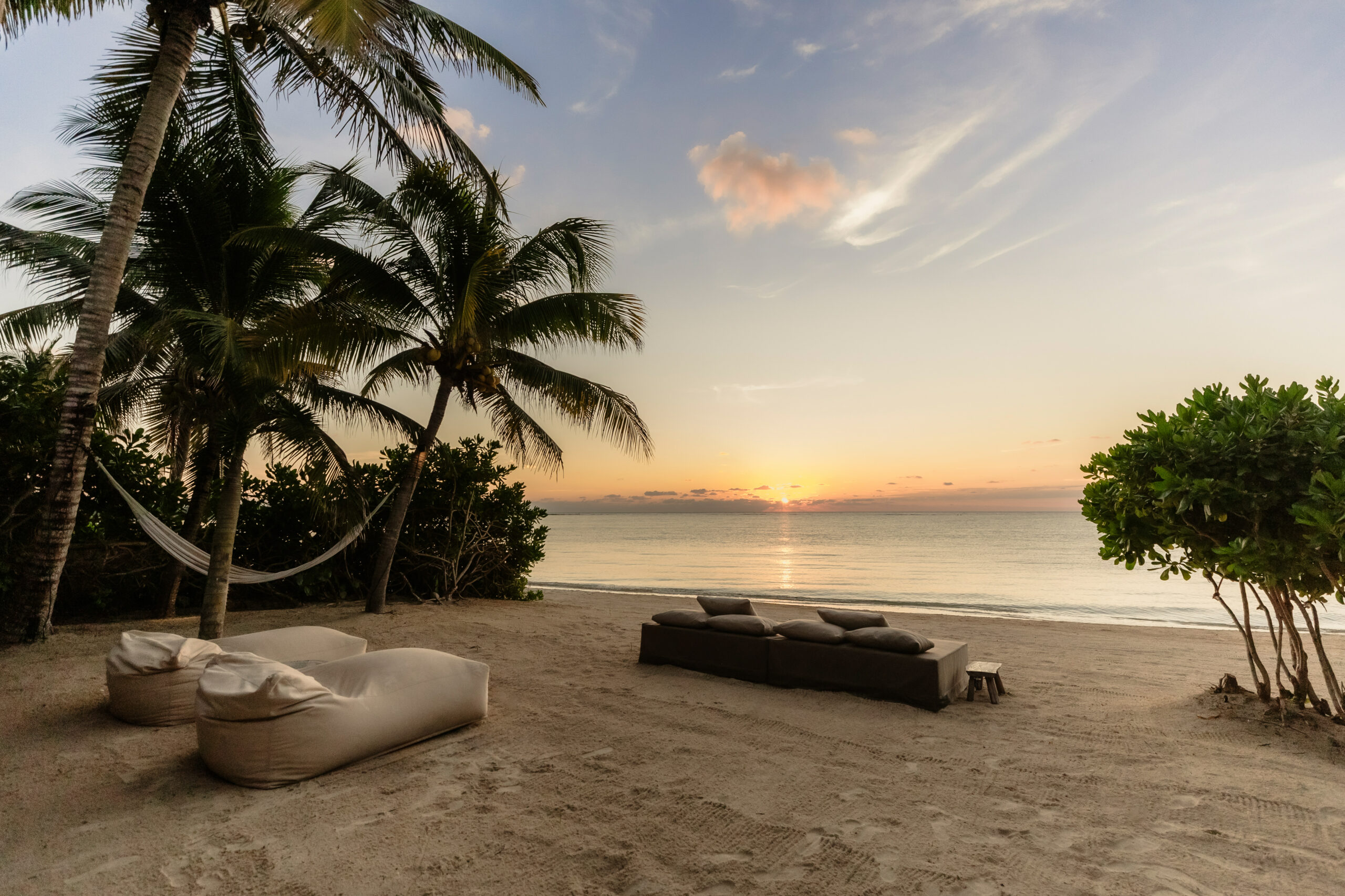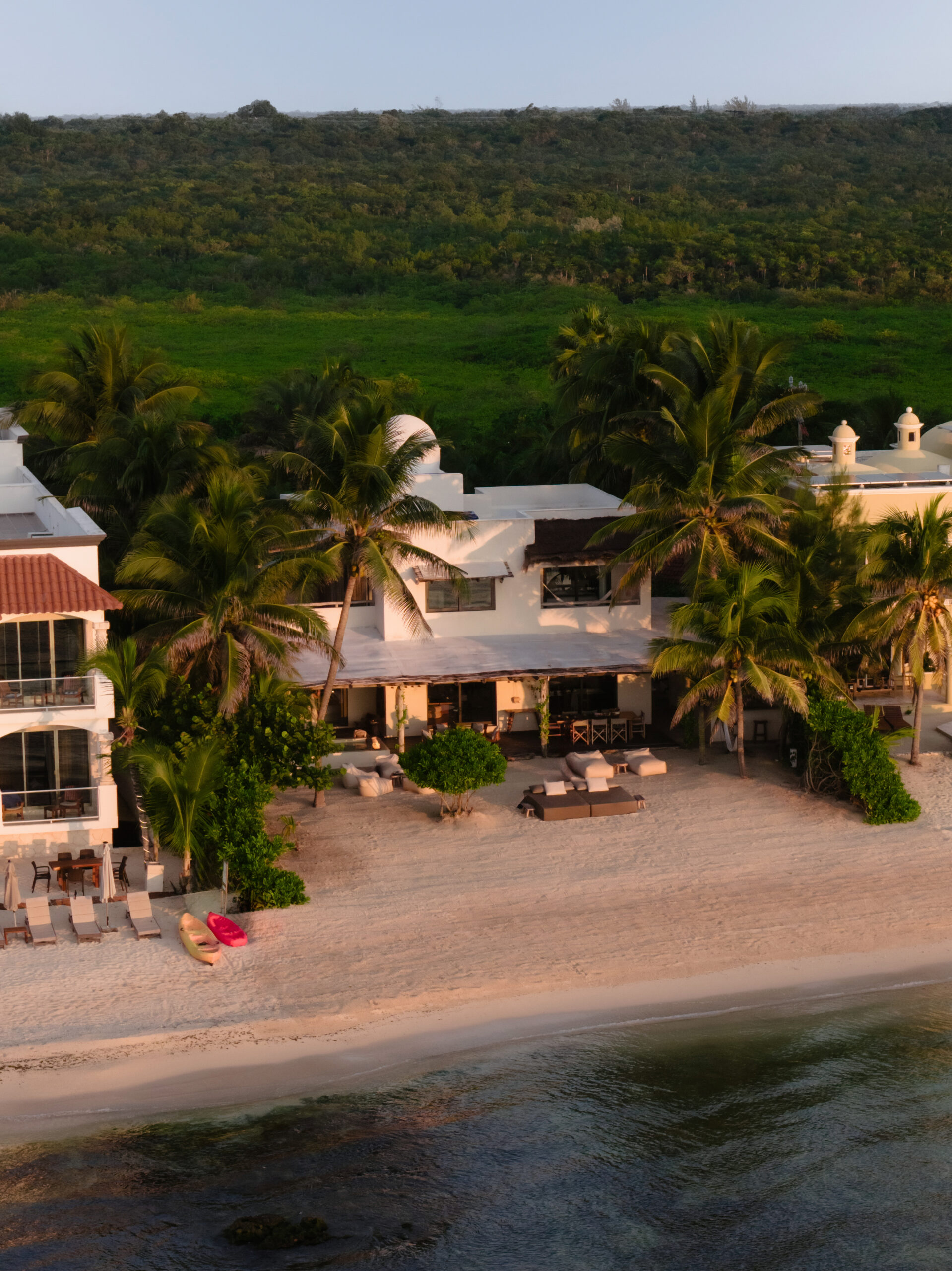 The cenote on the property is a rare feature — a natural freshwater pool connected to the underground river system that runs beneath the Yucatán Peninsula and emerges at the sea’s edge here in Tankah Bay. Guests can snorkel directly into the cenote from the beach, swimming between the freshwater cave system and the open Caribbean within a few meters. The overwater palapa pier extends from the beach into the bay with a hammock suspended above the water — a place to read, nap, or simply watch the light change over the reef. Kayaks are stored beachside for further exploration.