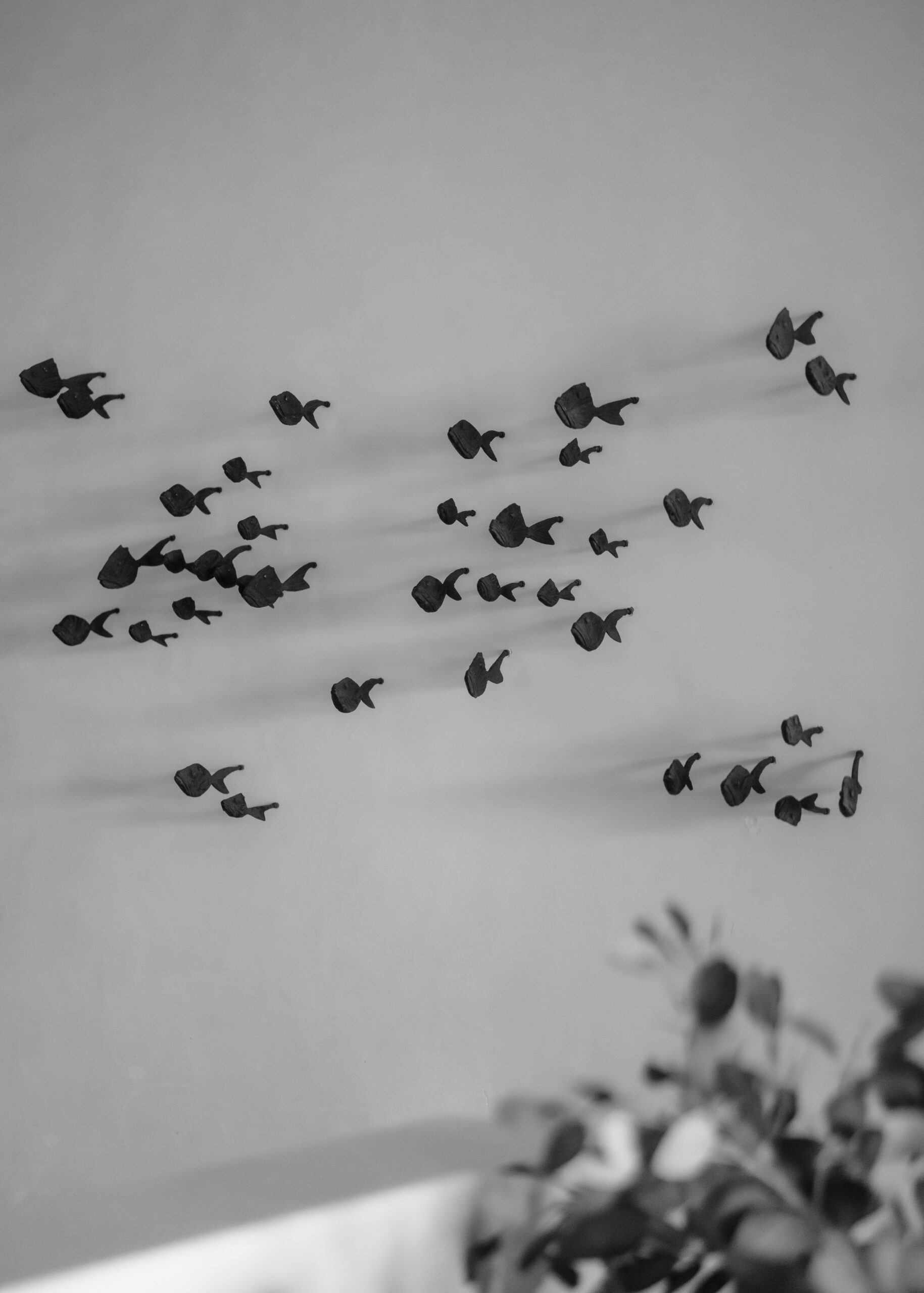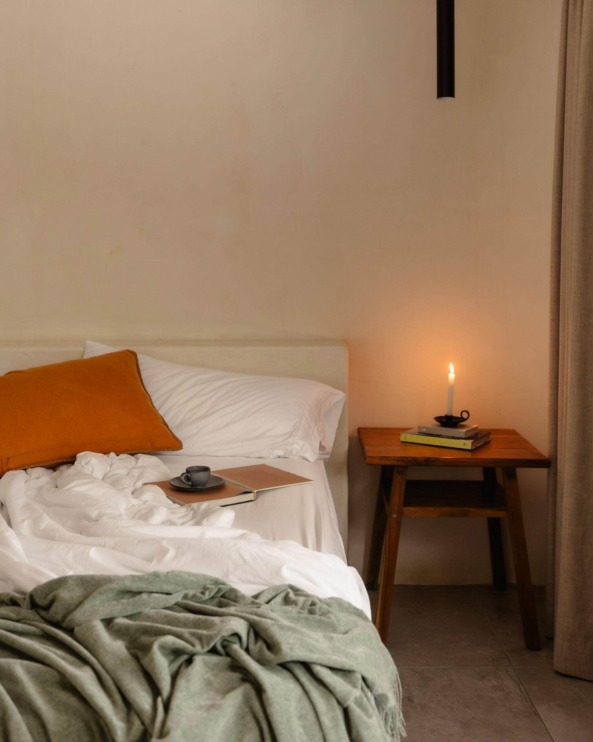 King bed, bohemian art, macramé wall hanging, ensuite bathroom with concrete vanity and black fixtures, air conditioning, WiFi