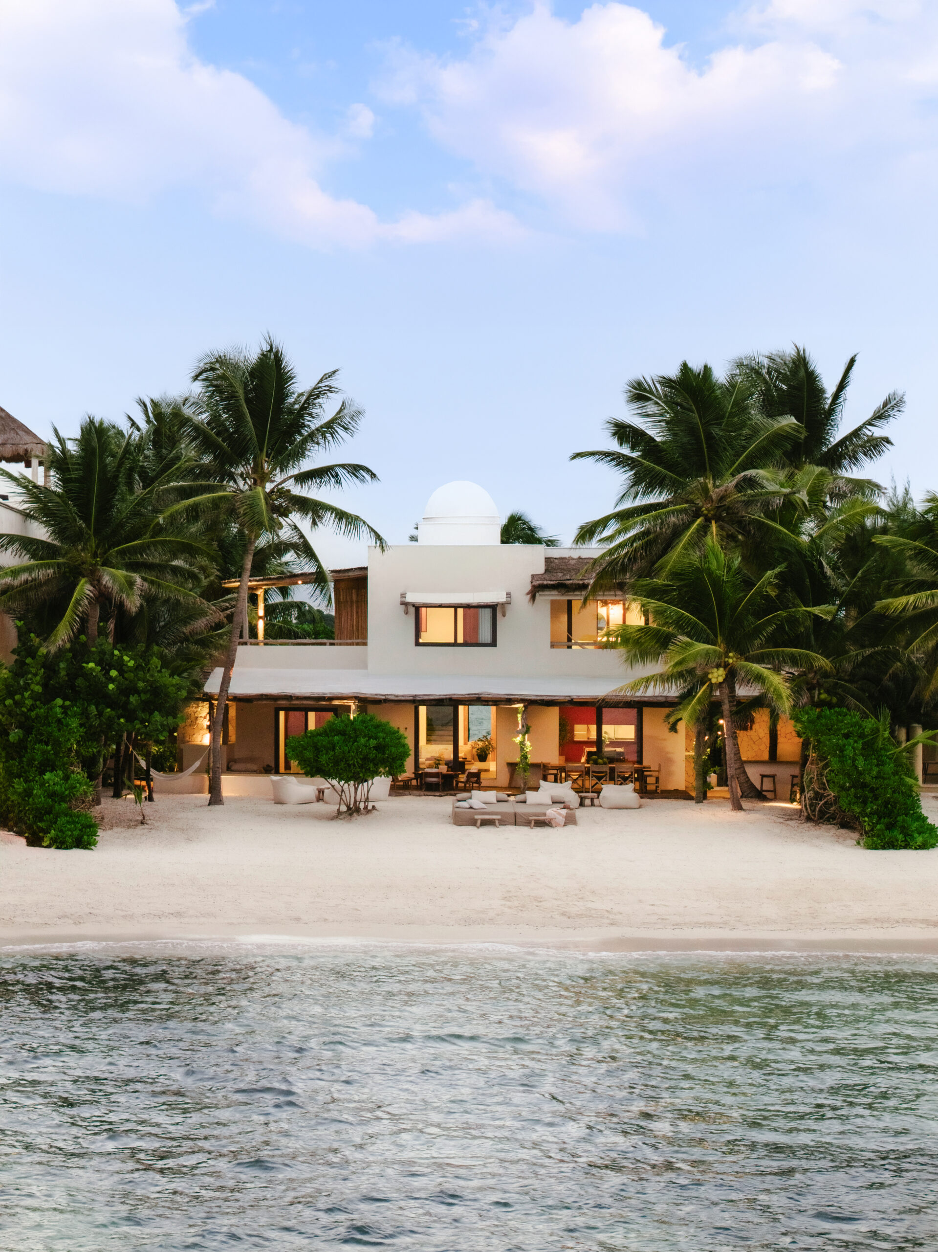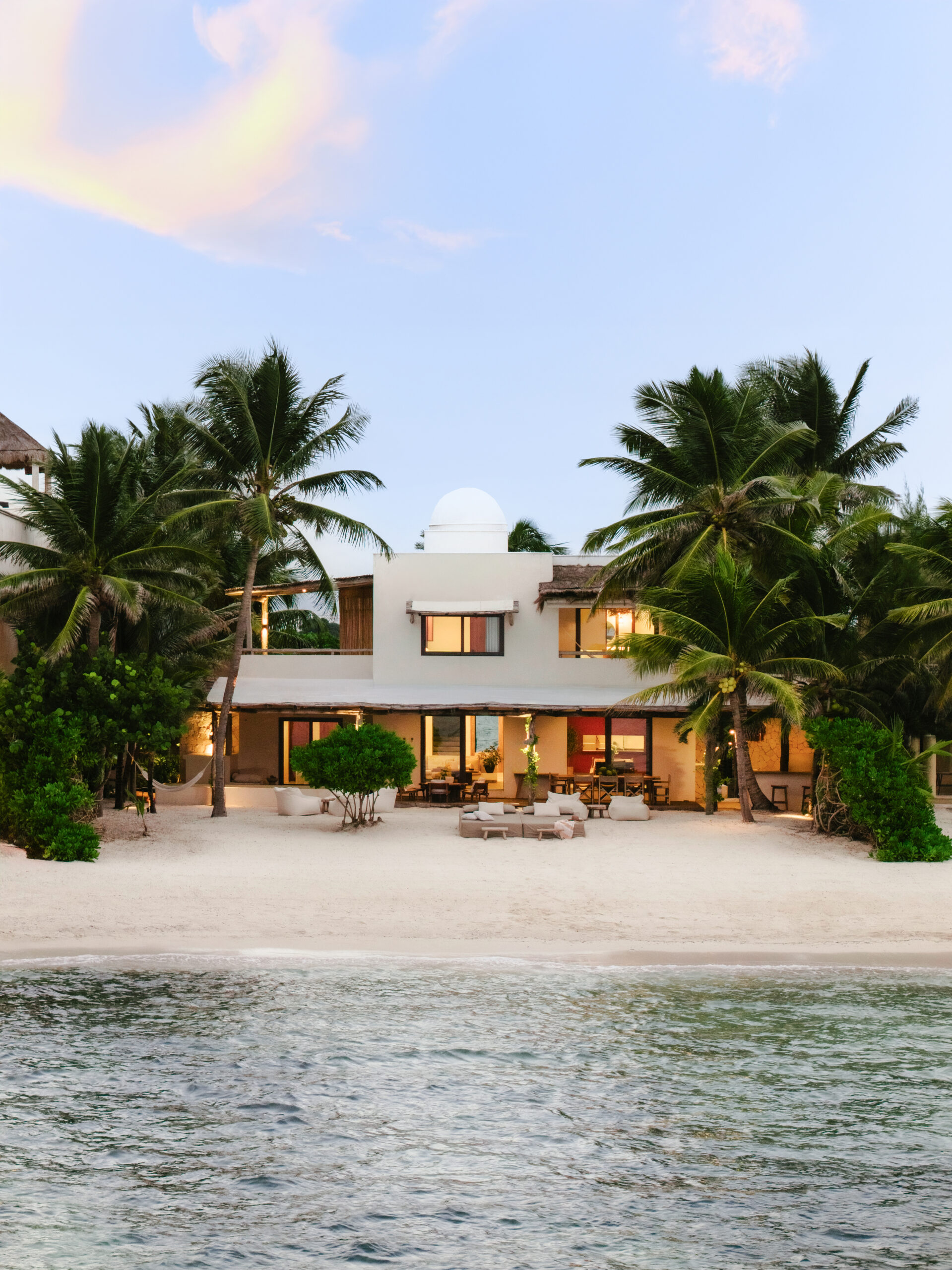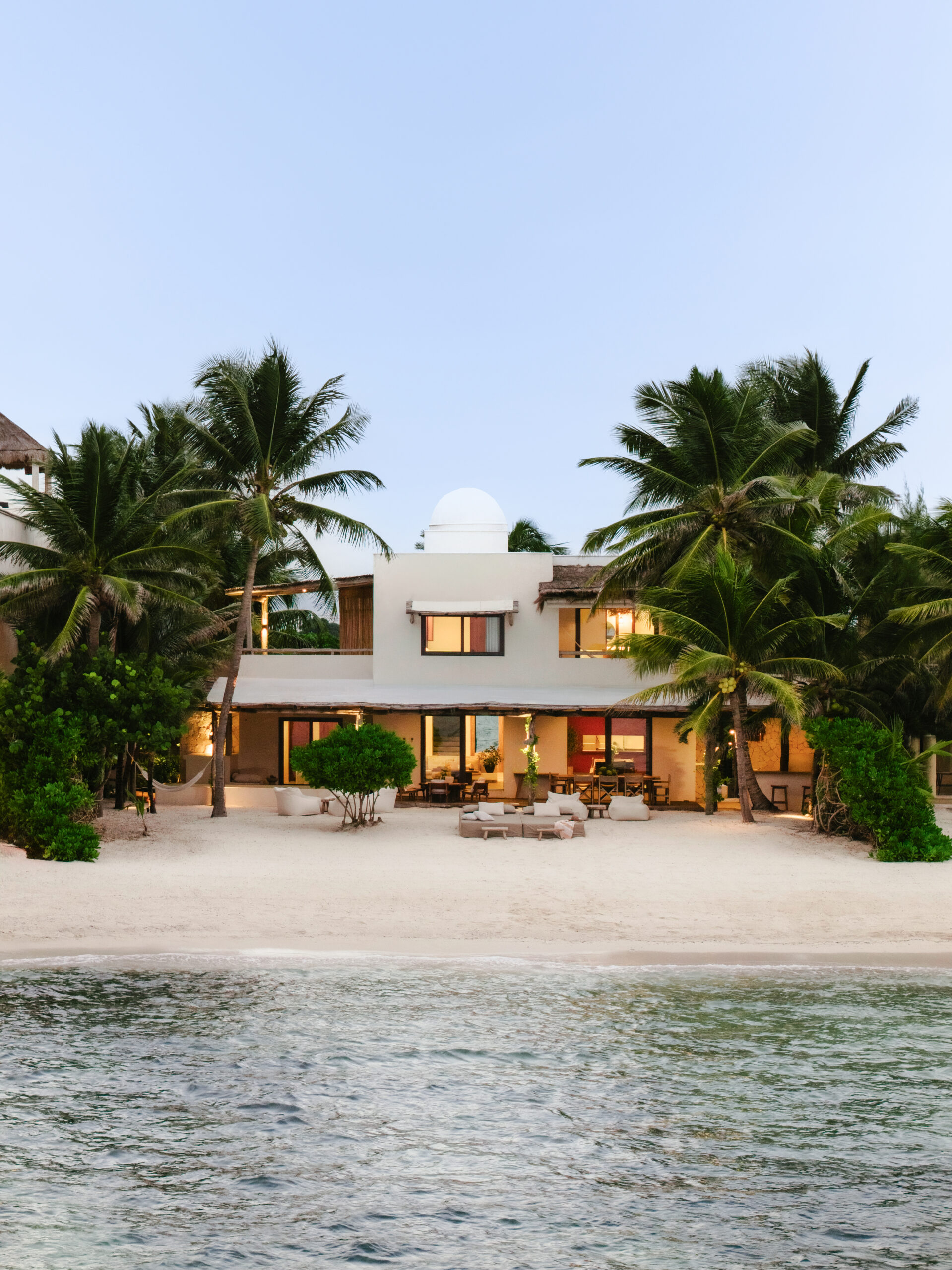 Villa Blanca is a four-bedroom beachfront bohemian villa on Tankah Bay, Tulum, accommodating up to 8 guests in a setting defined by whitewashed walls, natural textures, and a connection to nature that goes well beyond the usual tropical villa experience. The property sits directly on the beach with a private cenote accessible on the grounds — one of the only beachfront villas in the area with this feature — as well as a palapa-roofed overwater pier that stretches into the turquoise bay, a plunge pool with ocean views, and a wood-fired pizza oven built into a natural stone wall.