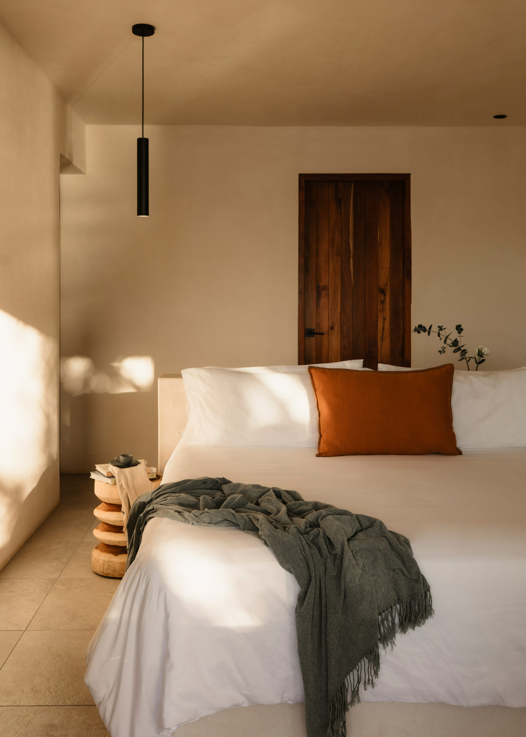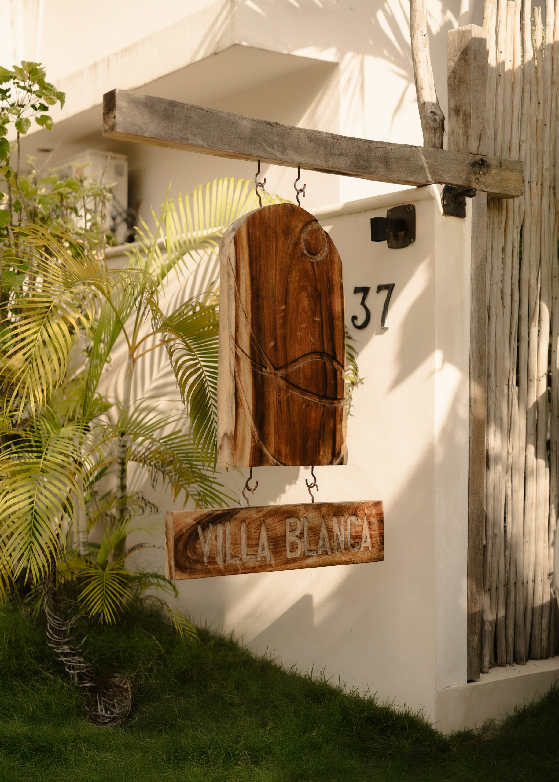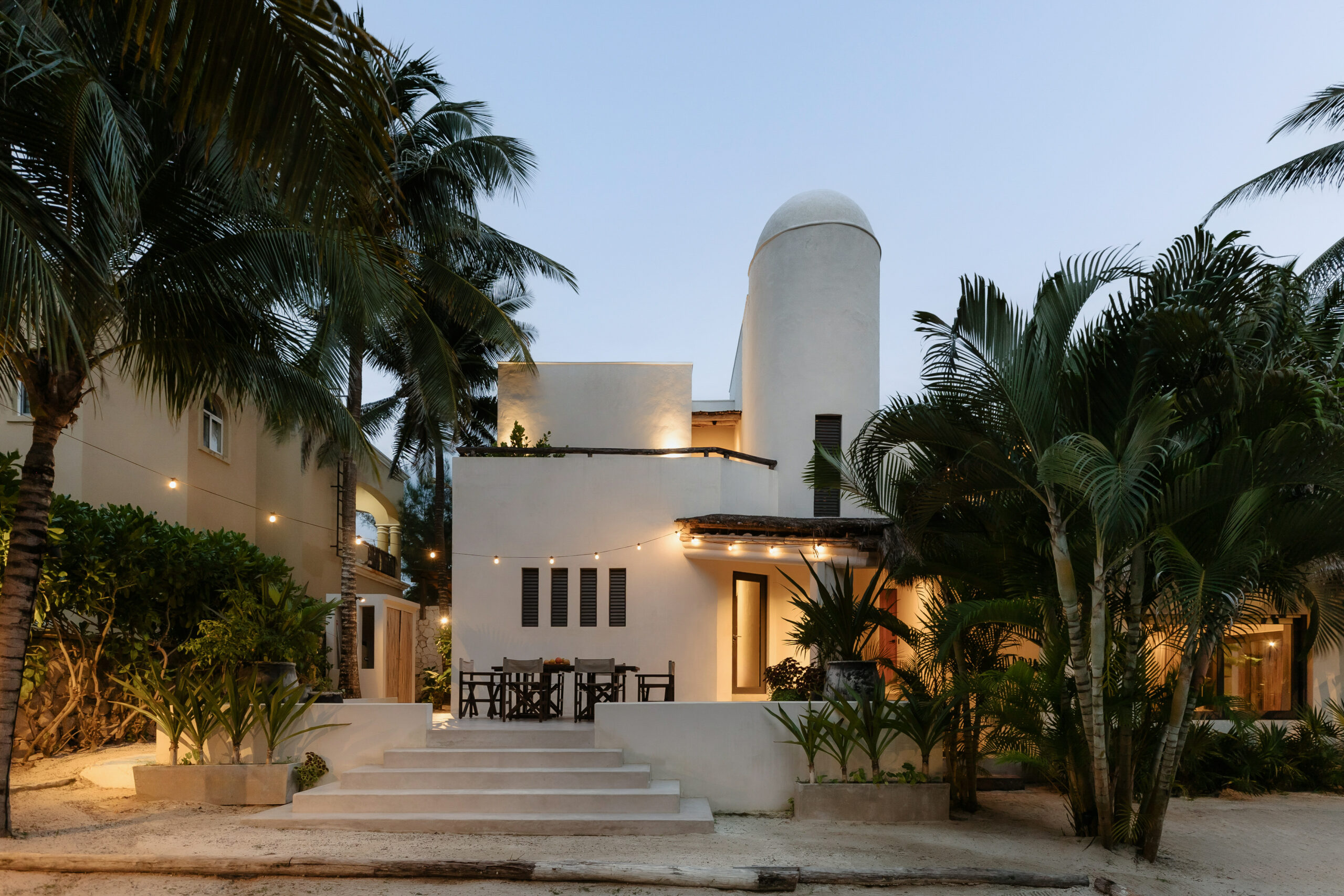 Villa Blanca is a four-bedroom beachfront bohemian villa on Tankah Bay, Tulum, accommodating up to 8 guests in a setting defined by whitewashed walls, natural textures, and a connection to nature that goes well beyond the usual tropical villa experience. The property sits directly on the beach with a private cenote accessible on the grounds — one of the only beachfront villas in the area with this feature — as well as a palapa-roofed overwater pier that stretches into the turquoise bay, a plunge pool with ocean views, and a wood-fired pizza oven built into a natural stone wall.