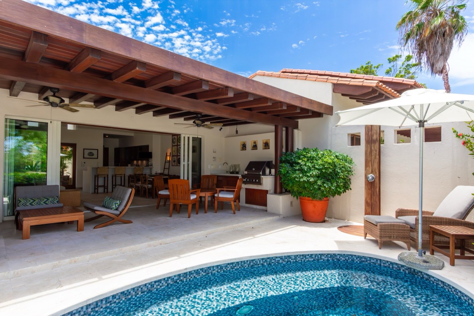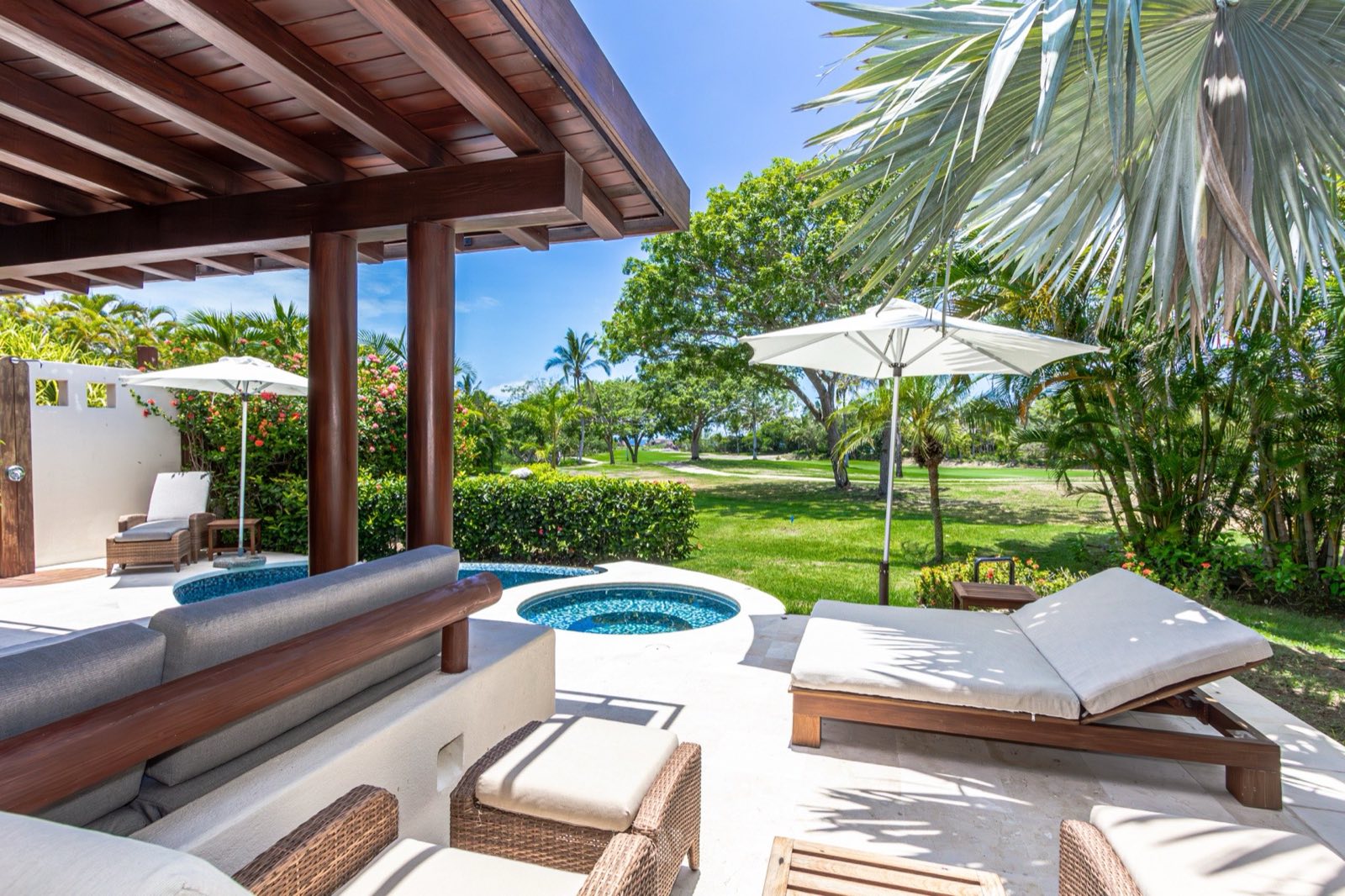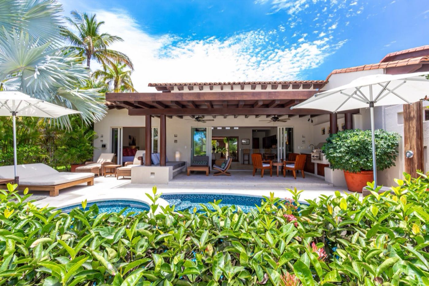 Villa Cazadores is a beautifully designed single-level three-bedroom villa set within the prestigious Las Palmas community at Punta Mita, also known as Las Palmas Villa 13. This residence is the ideal choice for families or groups seeking comfort, privacy, and resort-style services within the gated Punta Mita community. The spacious living and dining area opens onto a large, partially covered terrace with outdoor dining, a Viking BBQ grill, a private plunge pool, and a jacuzzi, all set against the backdrop of the Jack Nicklaus Signature Pacífico Golf Course with stunning views including the famous Tail of the Whale island green.
