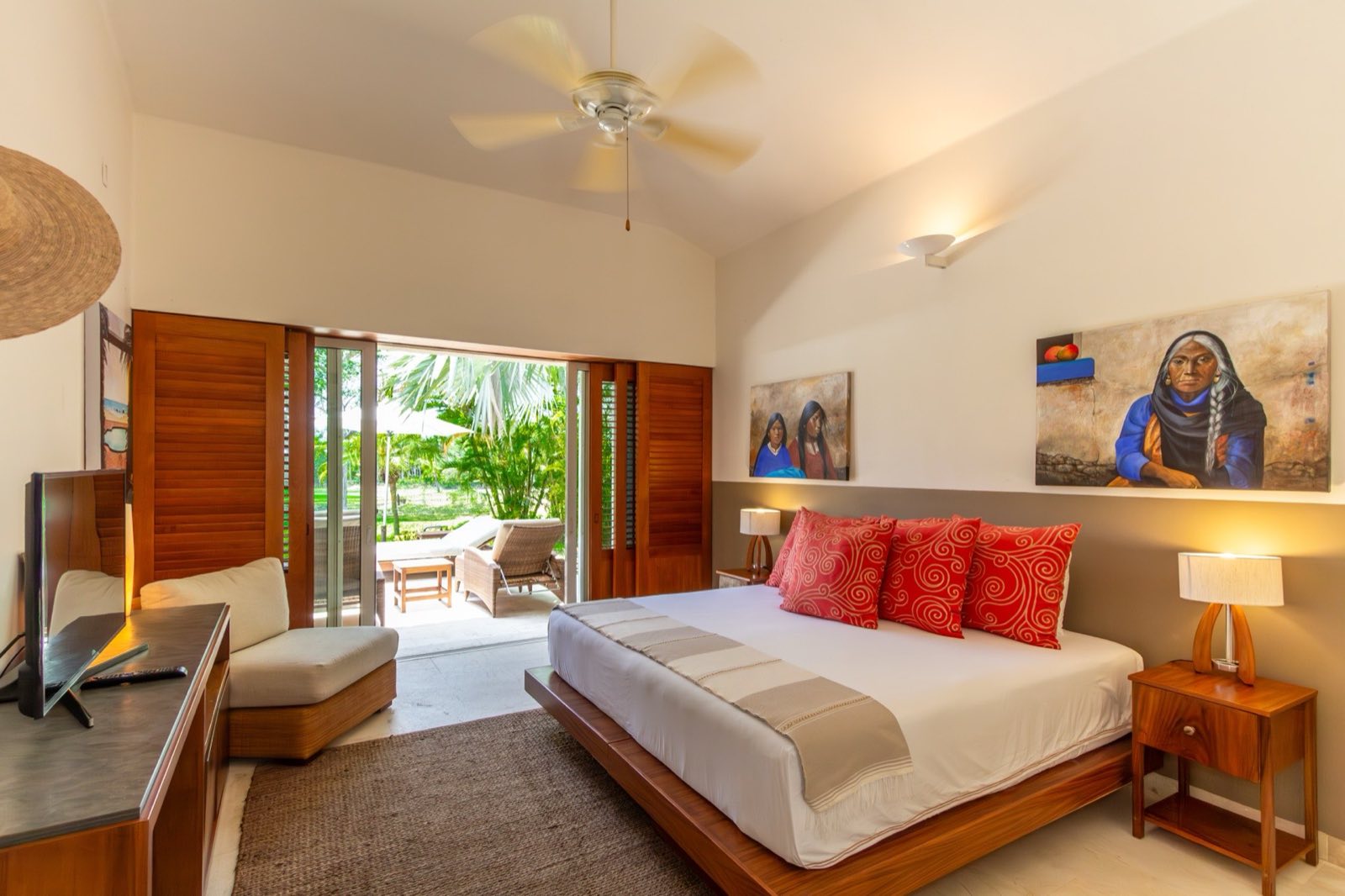 King bed, ensuite bathroom with tub and shower, walk-in closet, direct access to main terrace and garden, air conditioning
