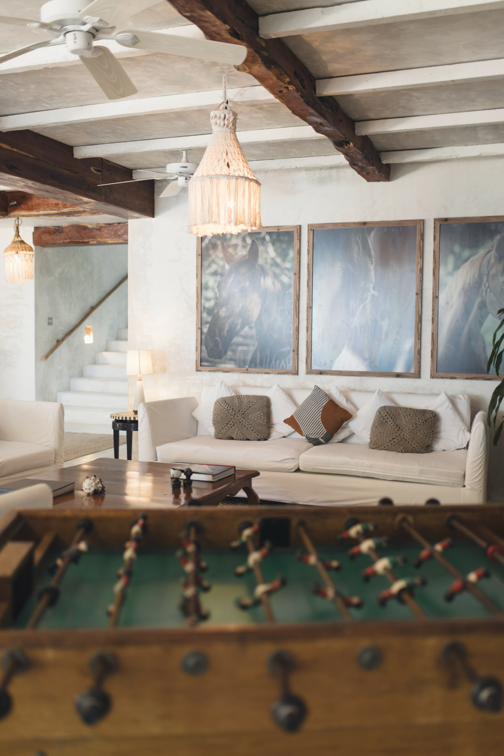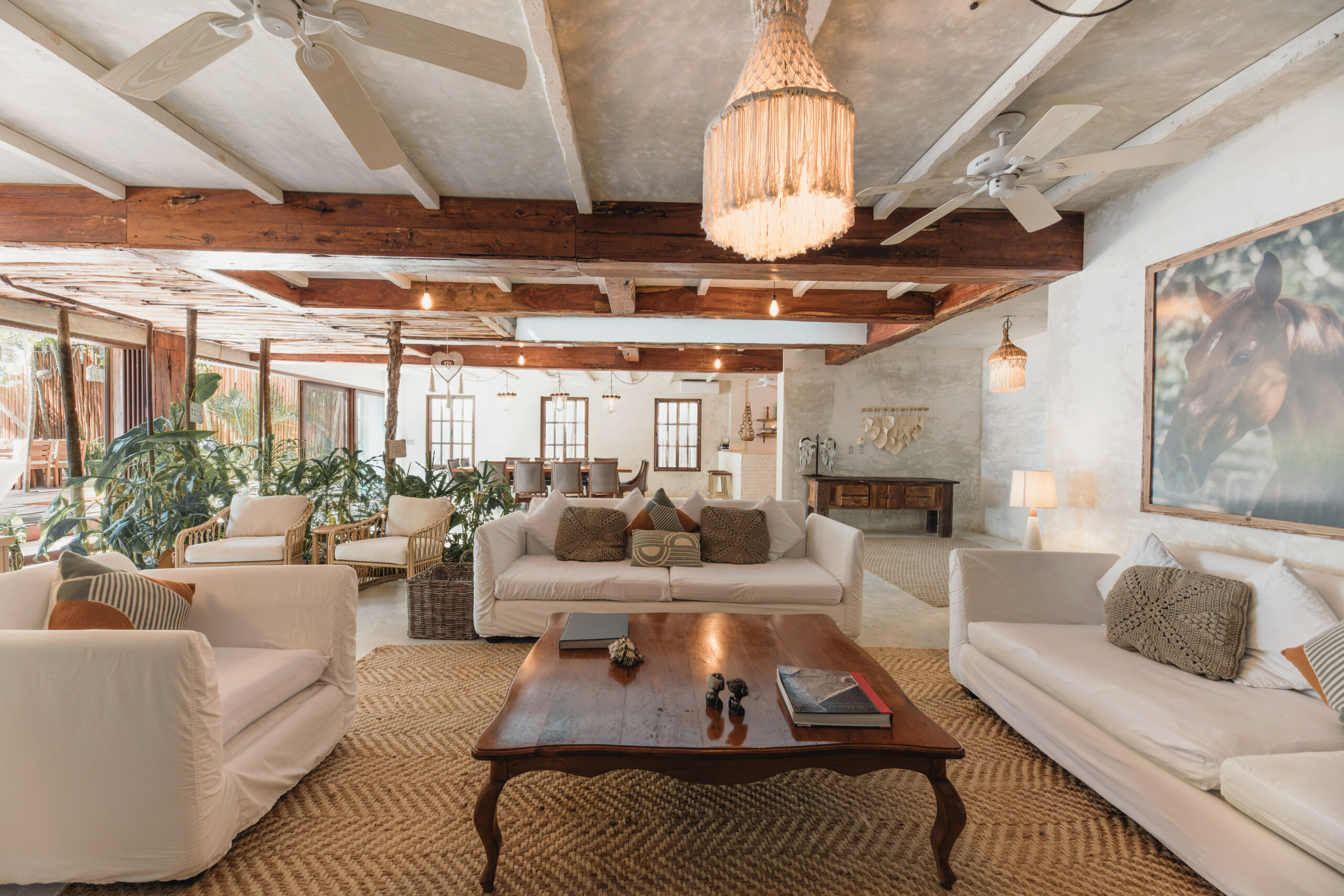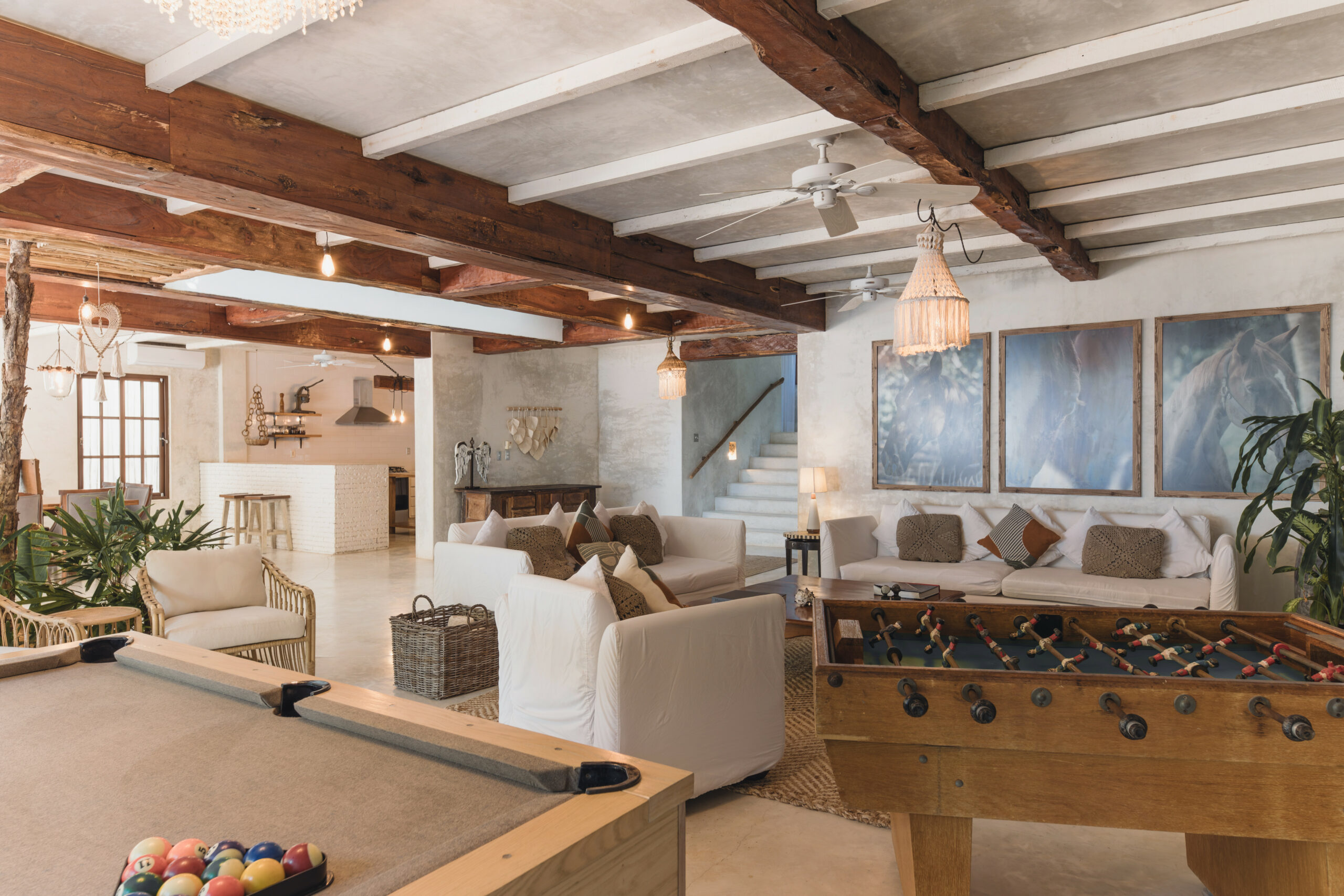Villa La Semilla is a five-bedroom beachfront bohemian villa on Soliman Bay, Tulum, accommodating up to 16 guests across three levels of rustic-luxe architecture — exposed wood beam ceilings, white-plastered walls, carved barn doors, crystal chandeliers, and vintage horse photography throughout. The villa is as much social destination as it is retreat: a full game room with pool table and foosball on the ground level, a bocce court in the garden, ping pong by the pool, and a rooftop plunge pool that looks out over the treetops to the Caribbean.