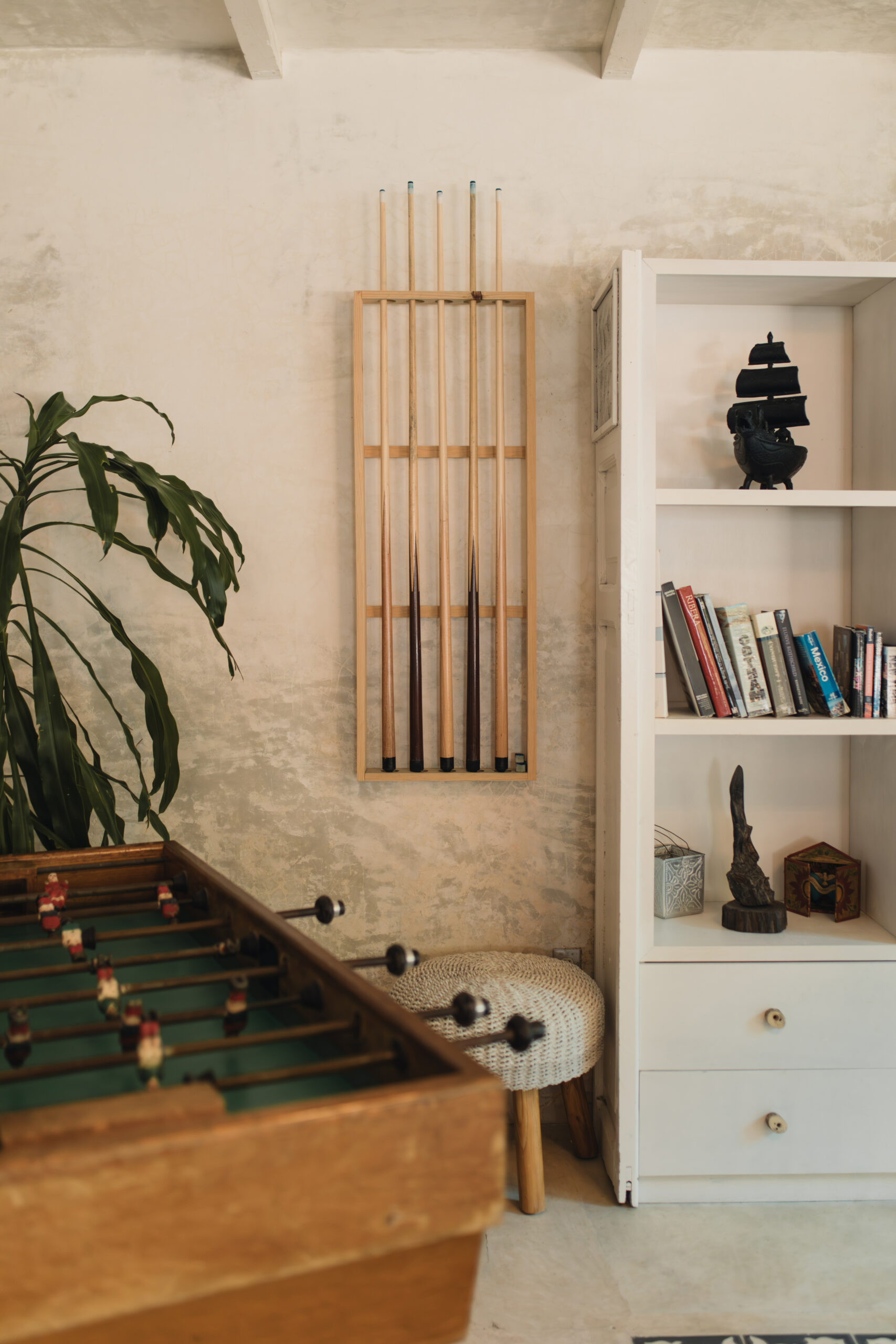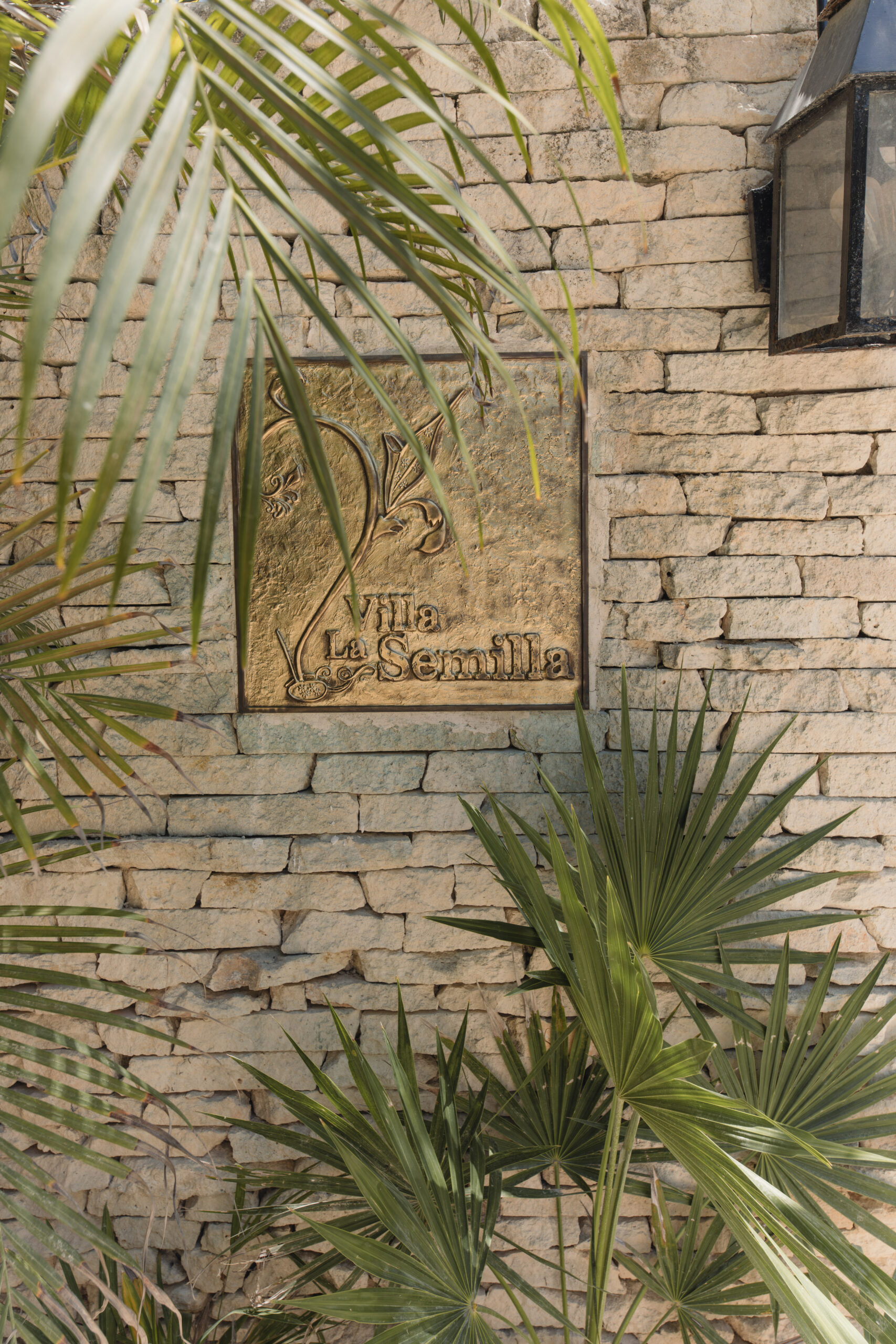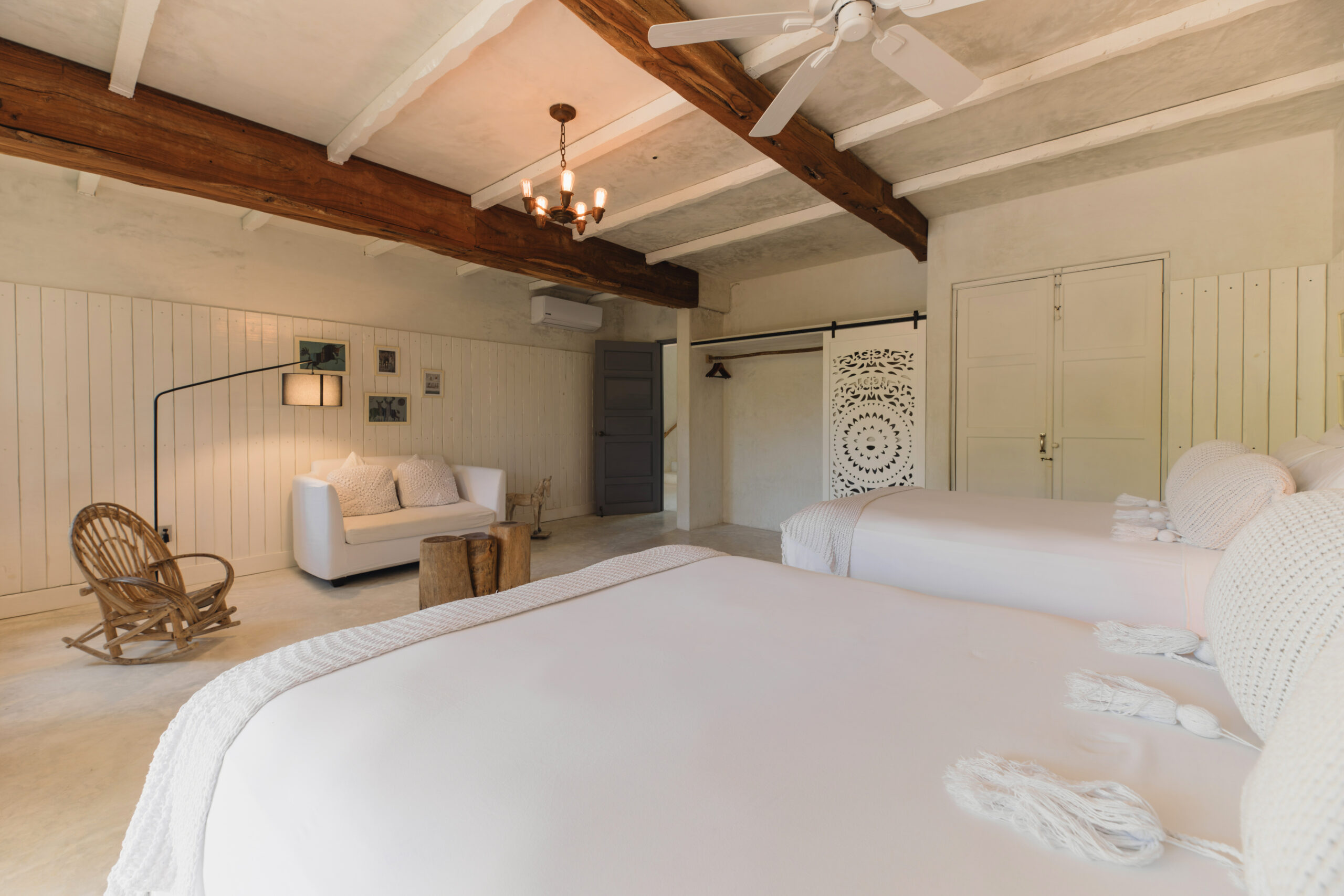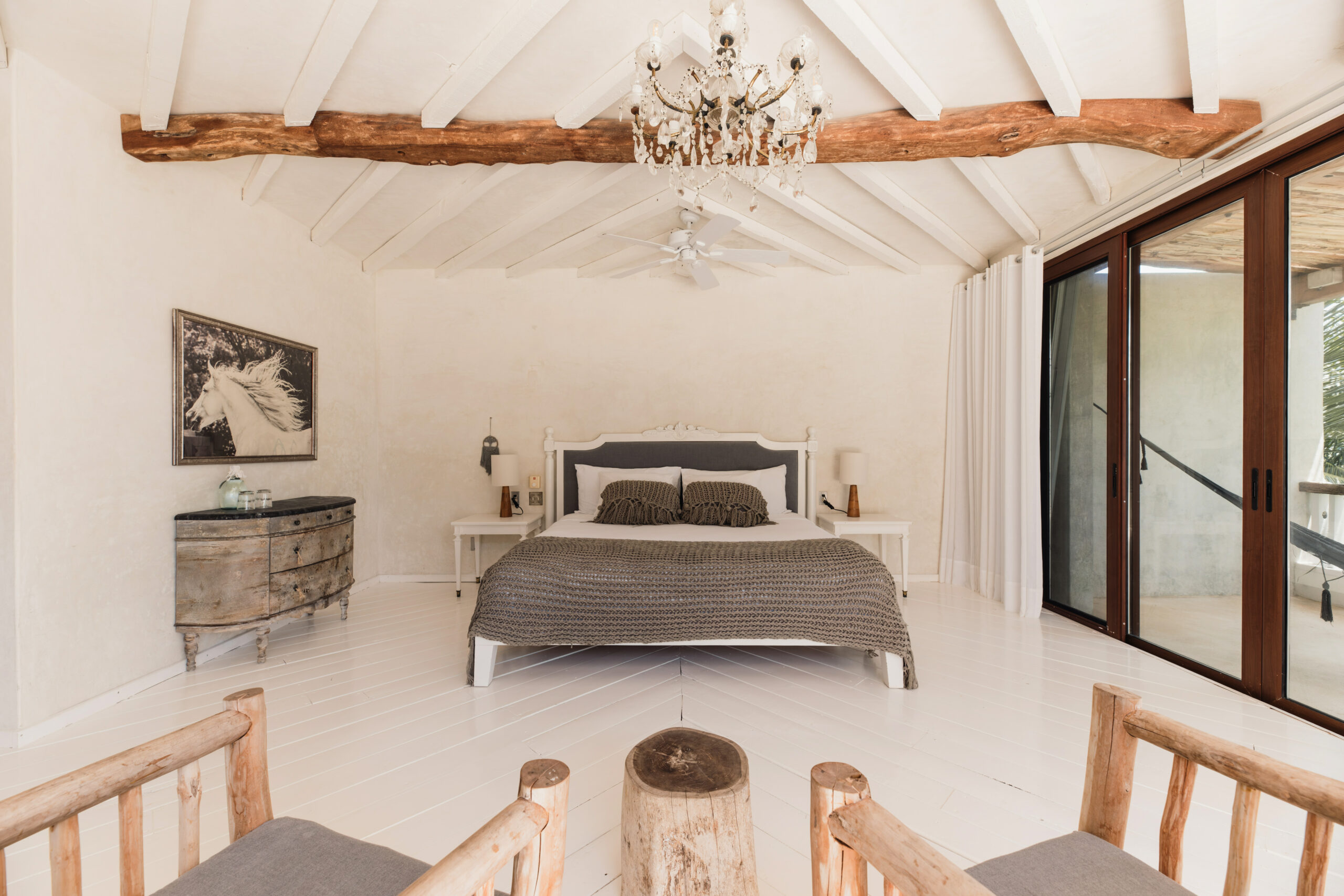 Villa La Semilla is a five-bedroom beachfront bohemian villa on Soliman Bay, Tulum, accommodating up to 16 guests across three levels of rustic-luxe architecture — exposed wood beam ceilings, white-plastered walls, carved barn doors, crystal chandeliers, and vintage horse photography throughout. The villa is as much social destination as it is retreat: a full game room with pool table and foosball on the ground level, a bocce court in the garden, ping pong by the pool, and a rooftop plunge pool that looks out over the treetops to the Caribbean.