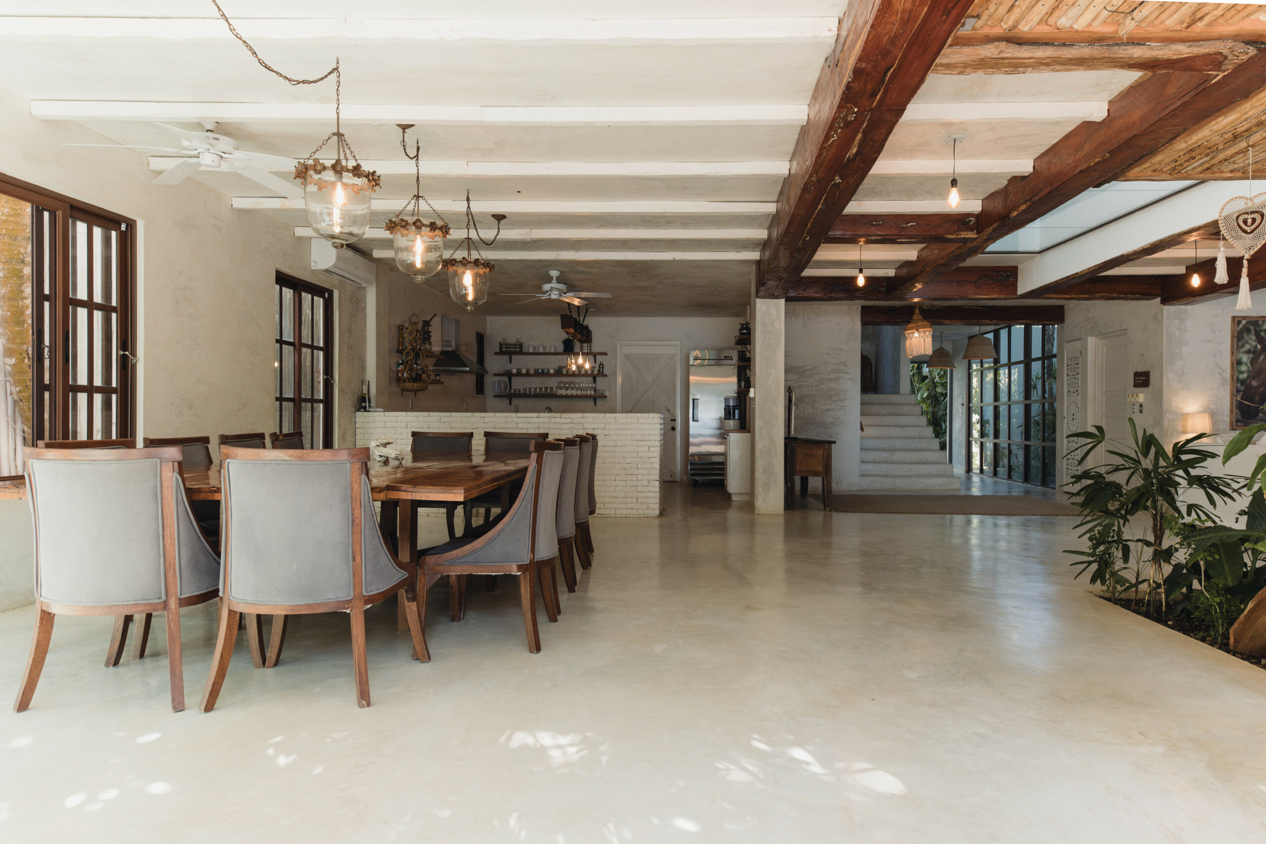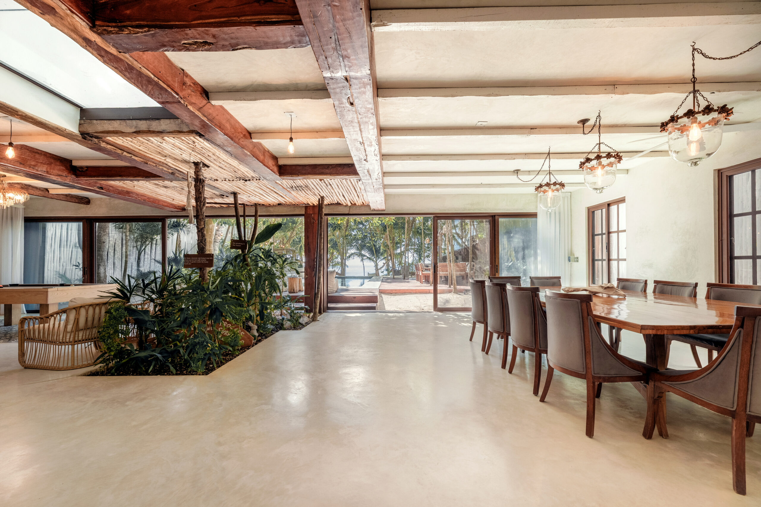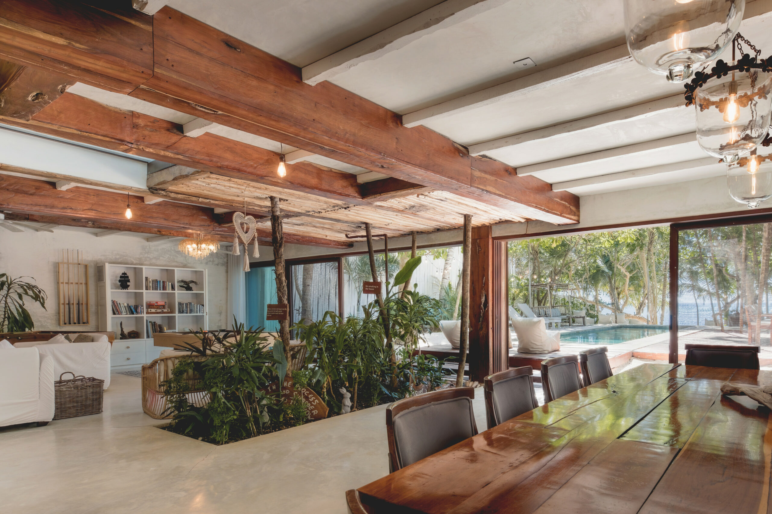 The open-plan kitchen and dining area features a large wood island with Edison bulb pendants, open glassware shelving, a rustic bar with barn door, and a live-edge wood dining table beside the pool. A second indoor dining area with an indoor garden opens directly to the beach. White sofas with horse photography prints, rattan armchairs, jute rugs, and a macramé chandelier define the living spaces. The villa sleeps 16 without feeling crowded — there is room to gather and room to disappear.