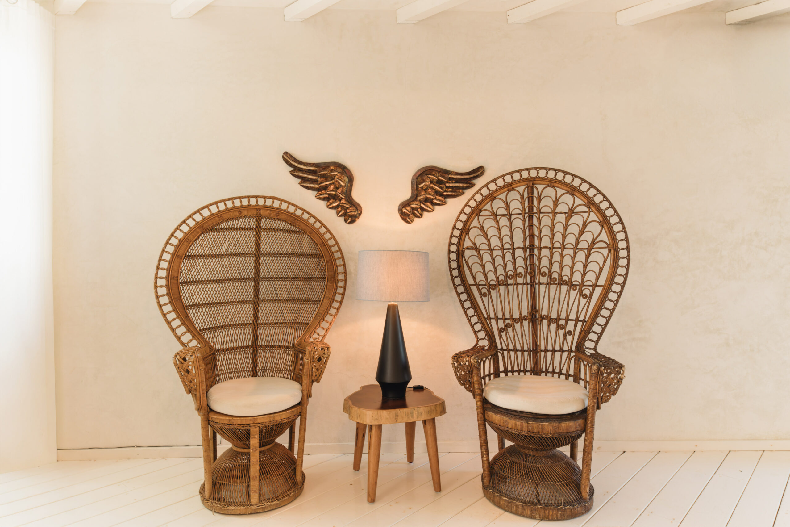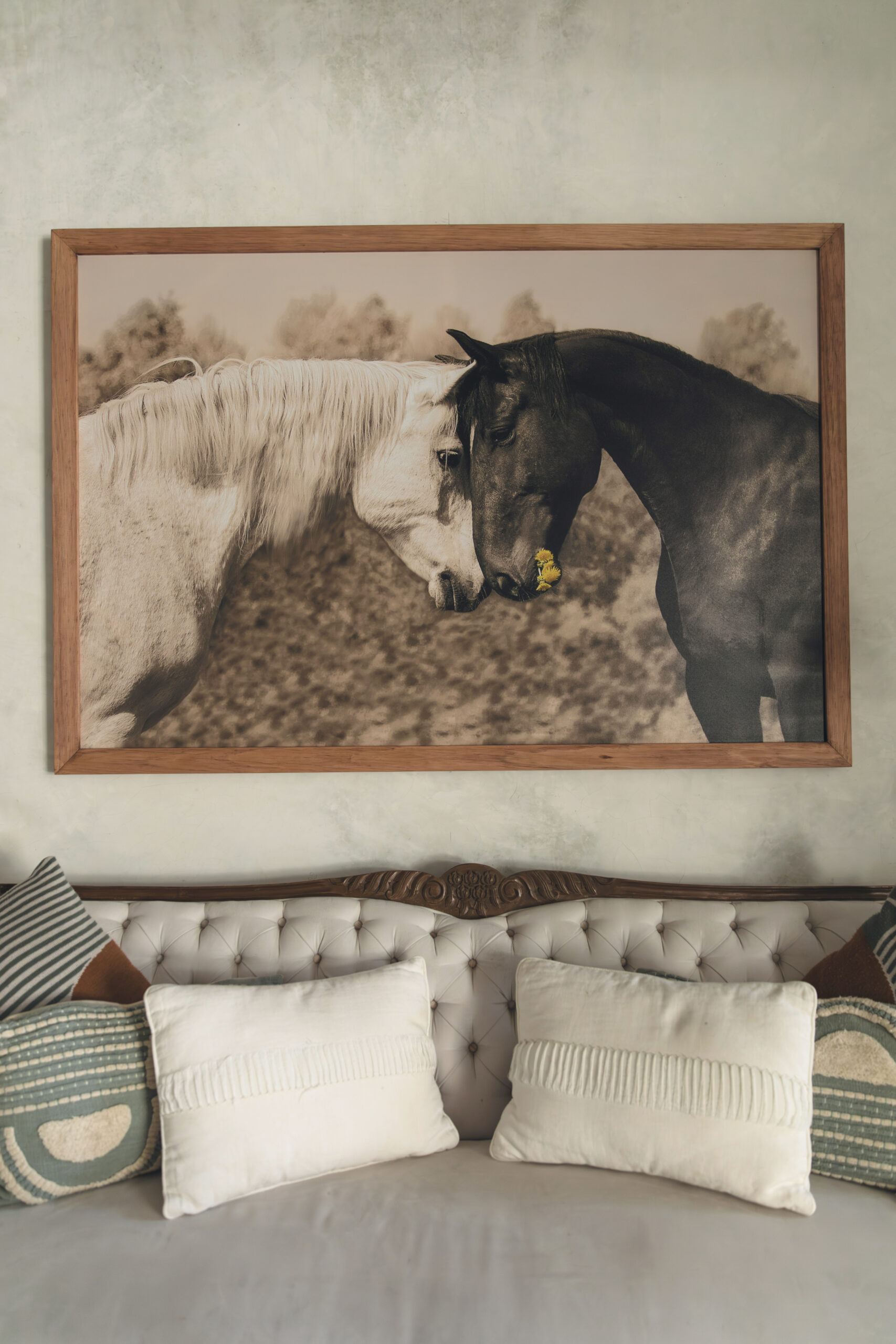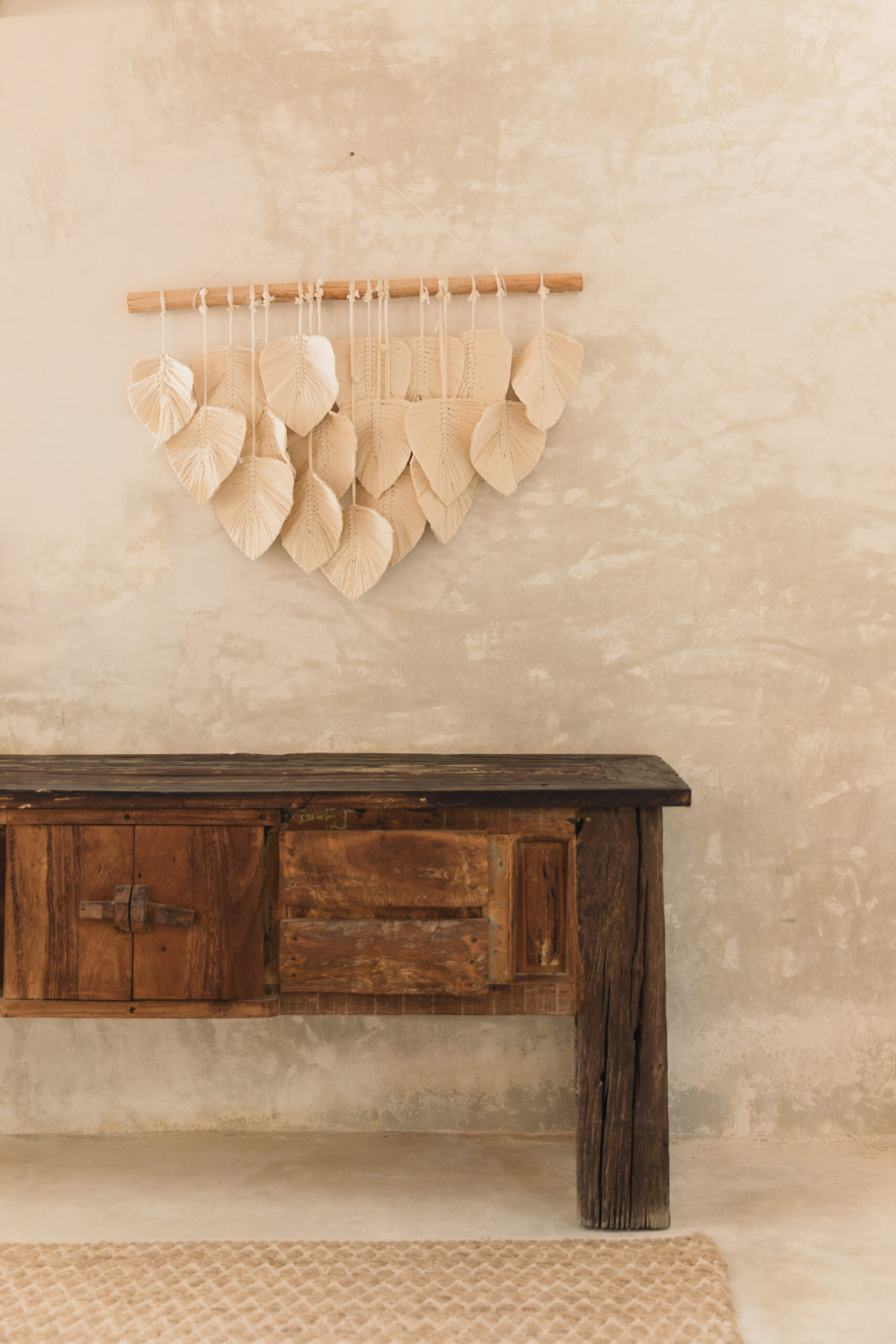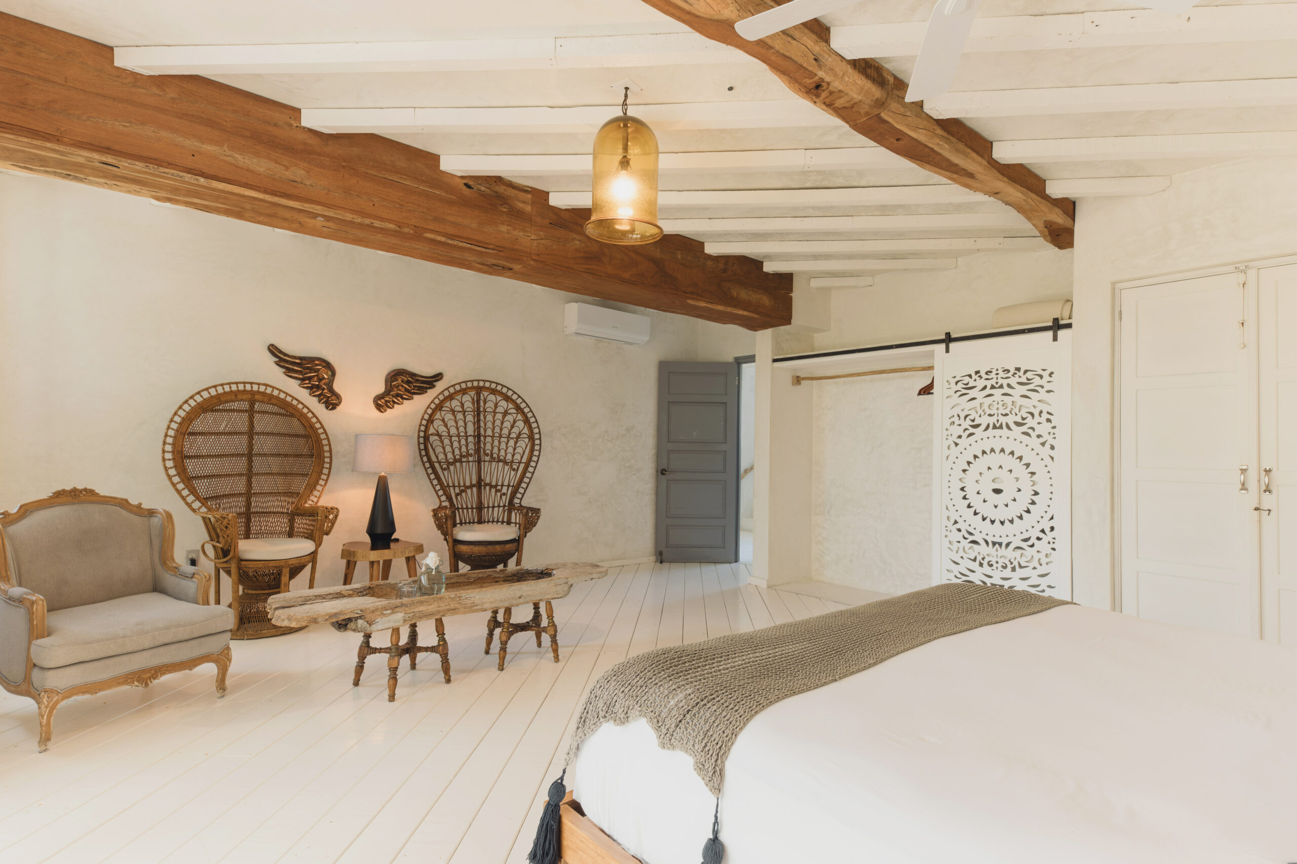 The open-plan kitchen and dining area features a large wood island with Edison bulb pendants, open glassware shelving, a rustic bar with barn door, and a live-edge wood dining table beside the pool. A second indoor dining area with an indoor garden opens directly to the beach. White sofas with horse photography prints, rattan armchairs, jute rugs, and a macramé chandelier define the living spaces. The villa sleeps 16 without feeling crowded — there is room to gather and room to disappear.