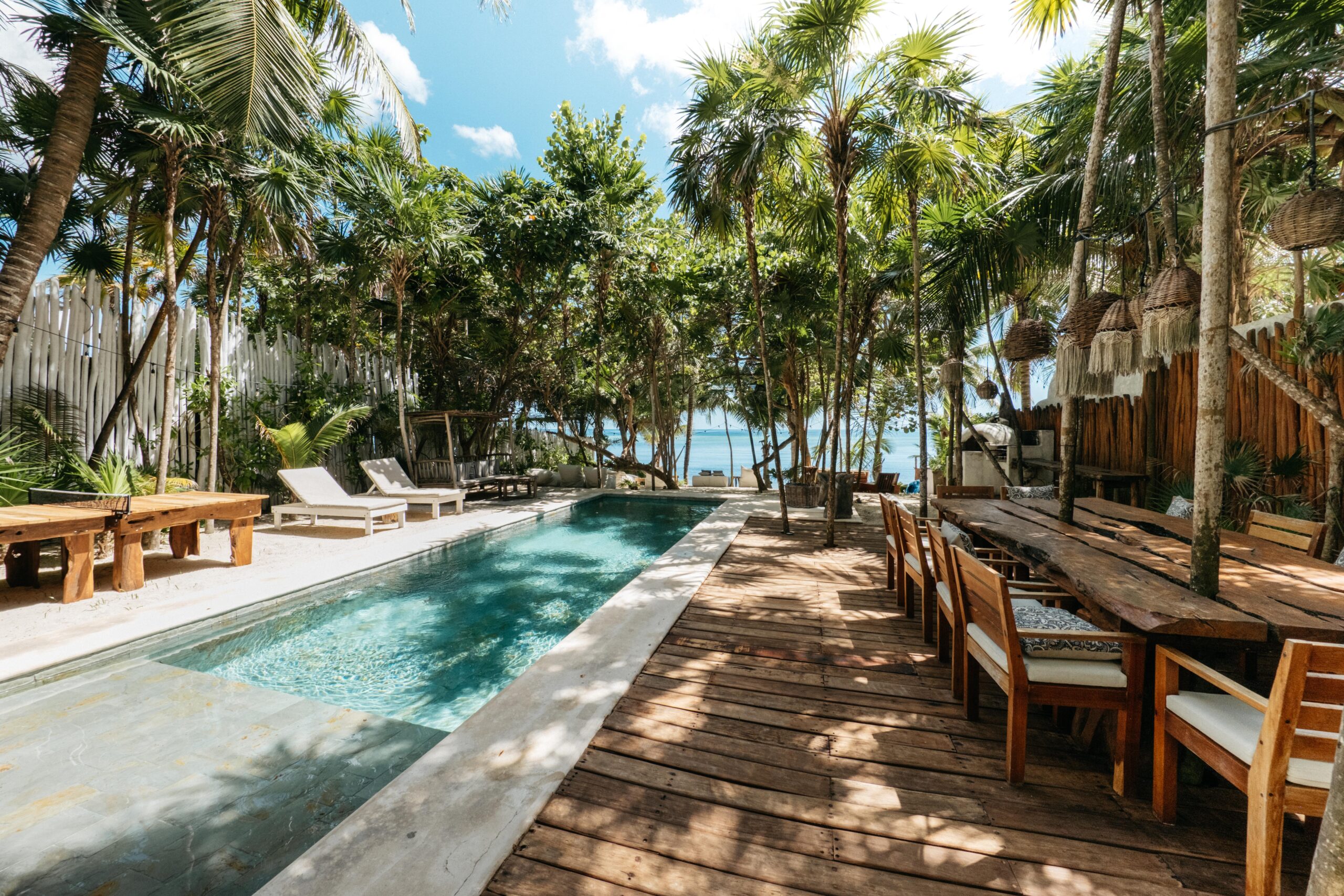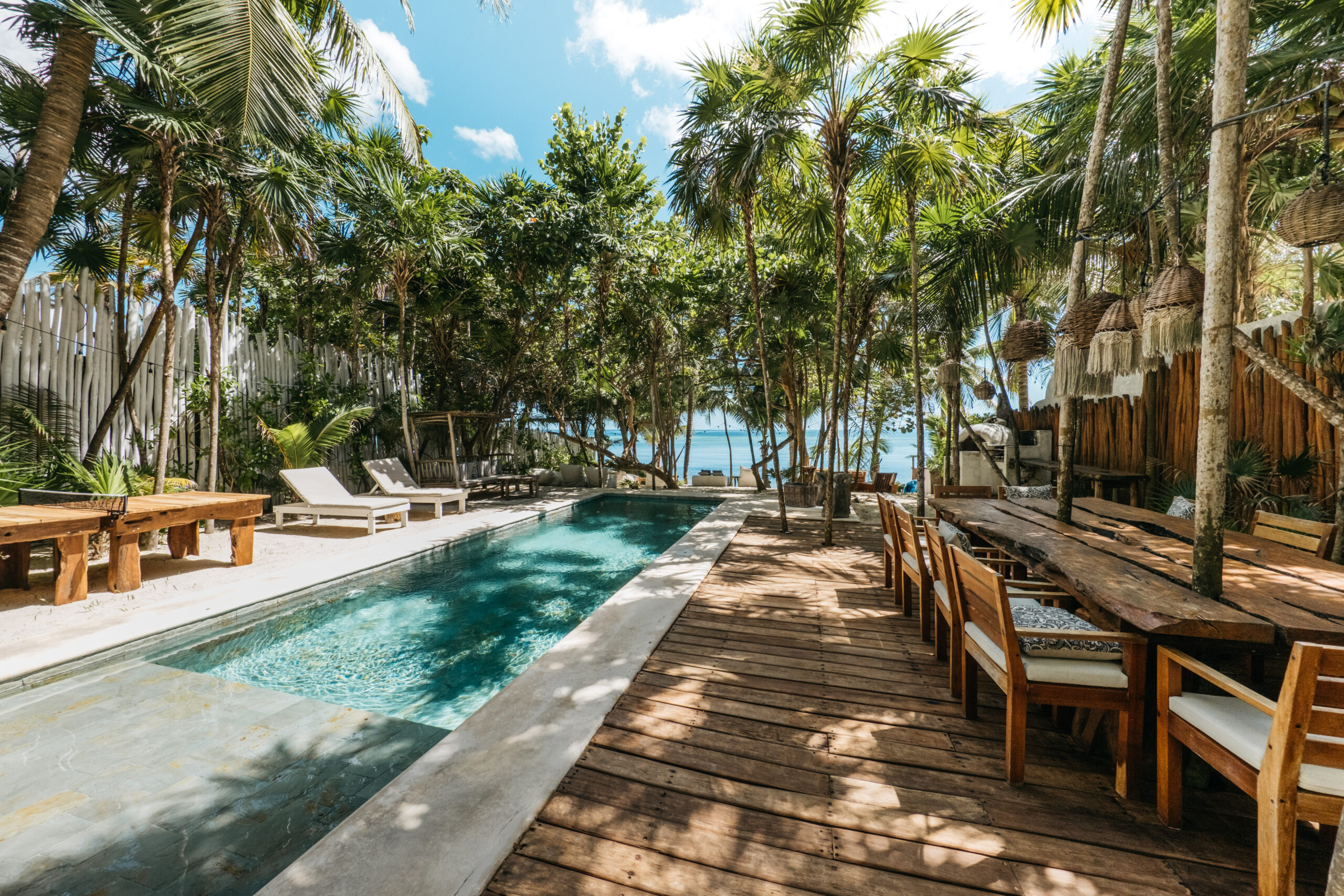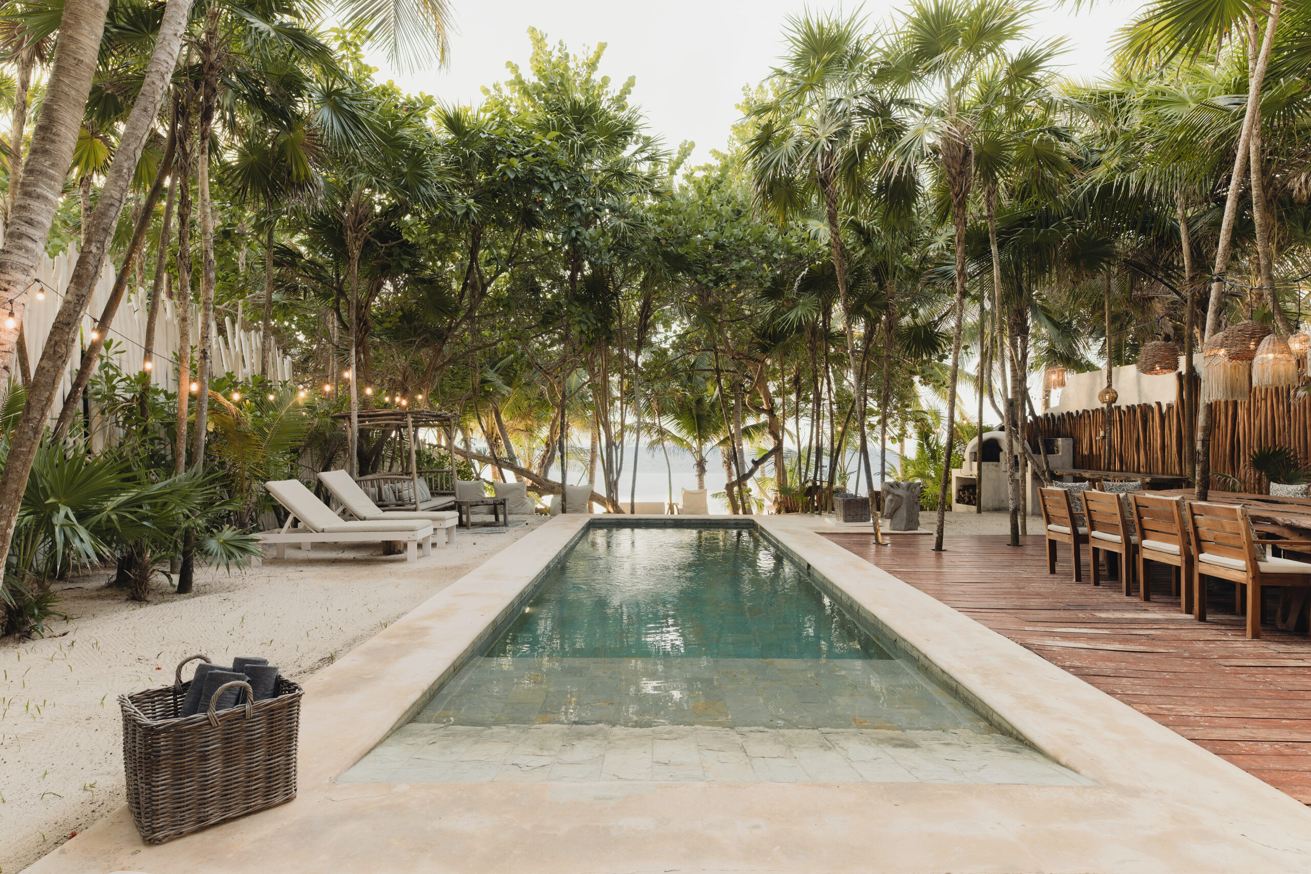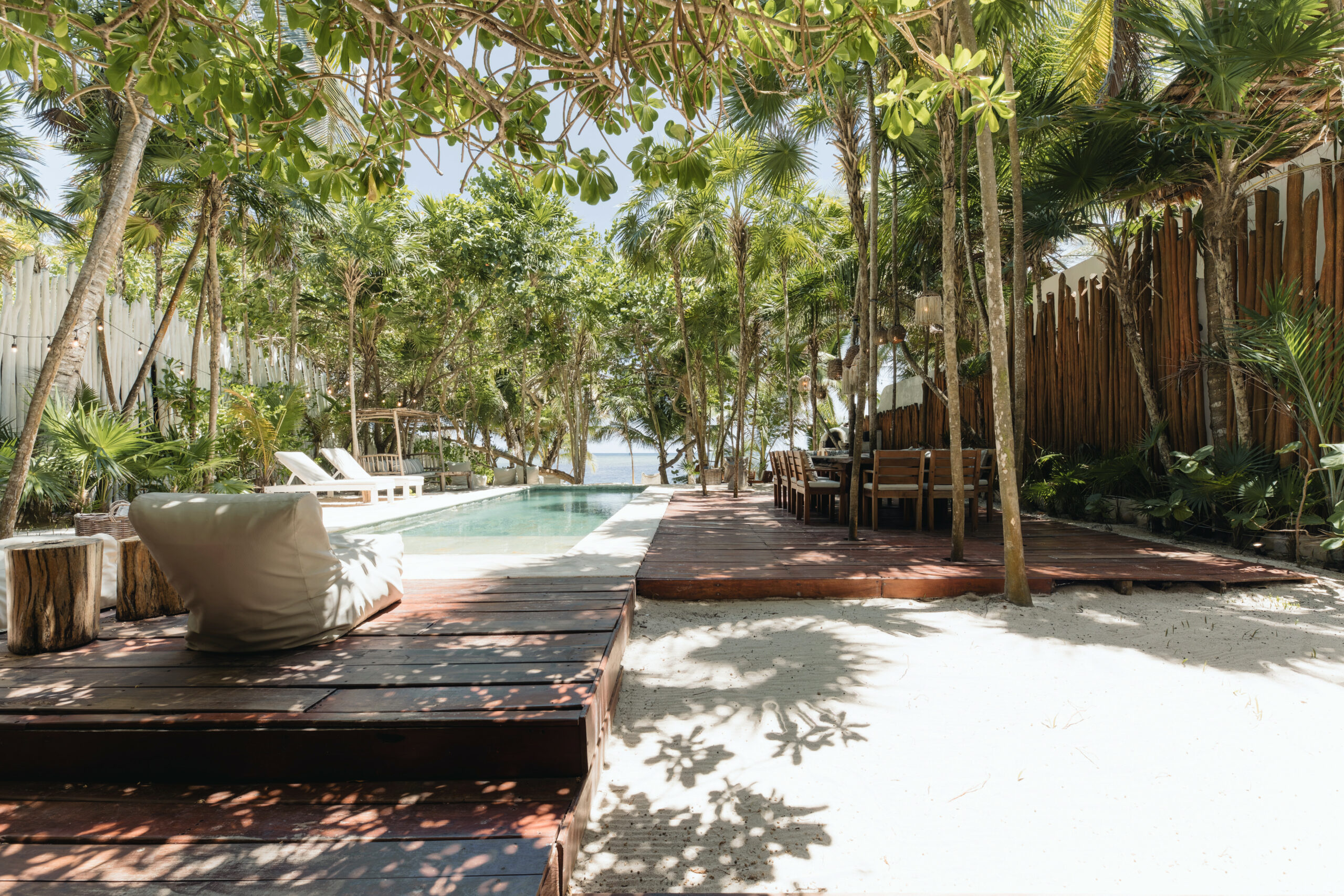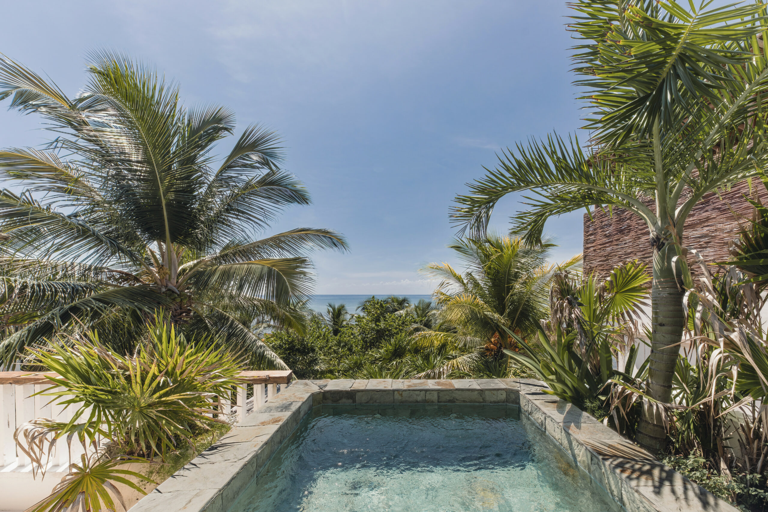 The bocce court, ping pong table, and pool table make Villa La Semilla one of the most activity-rich villas in Soliman Bay — genuinely suited to multi-family trips and group buyouts where different generations need different things. The rooftop plunge pool with its palapa shade and 270-degree views of jungle and ocean is the quiet counterpoint to all of it: a place where the day’s last light and a cold drink are enough. The beach at Soliman Bay has no vendors, no crowds, and no seaweed — just palm shadows and calm Caribbean water.