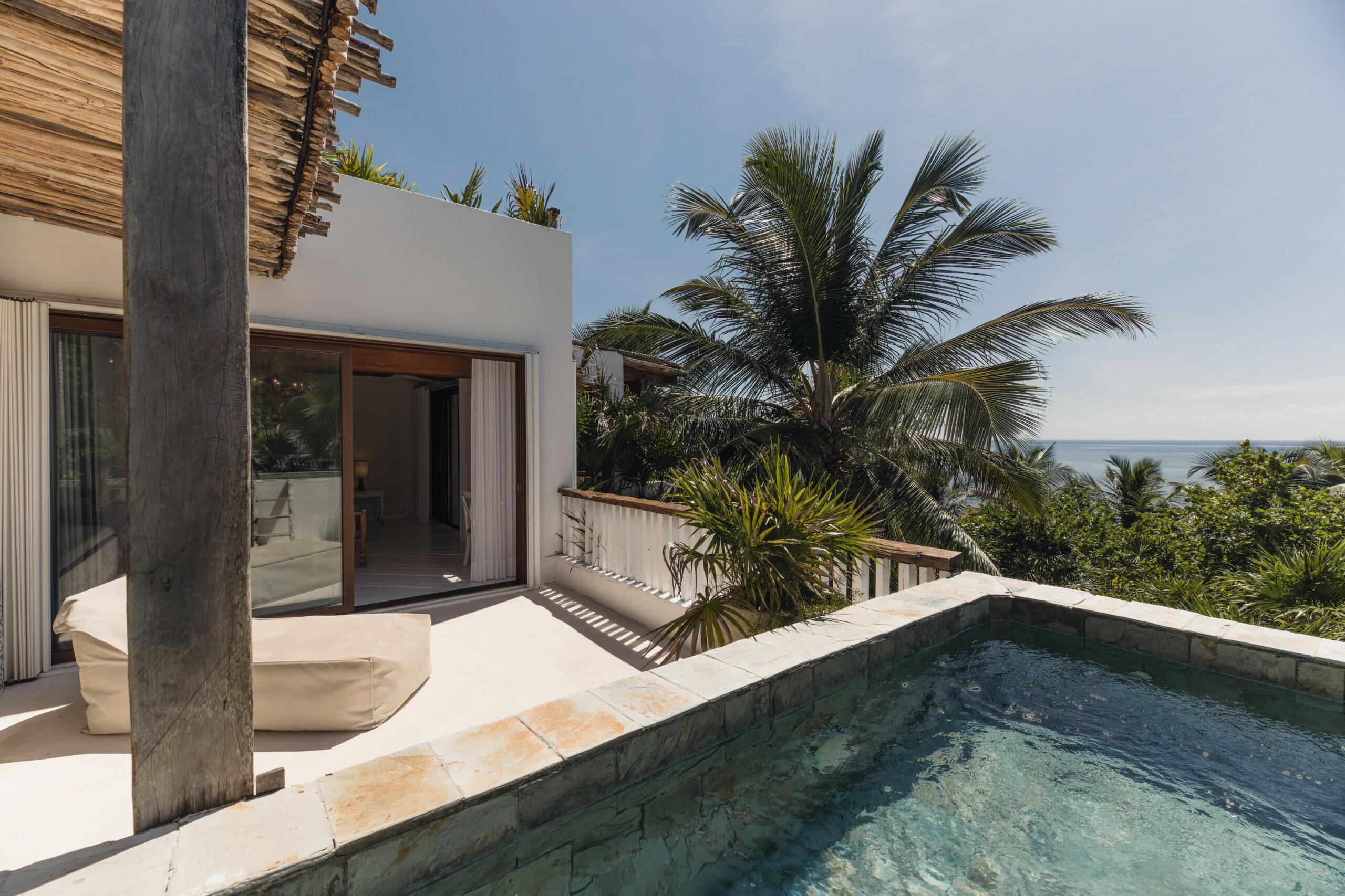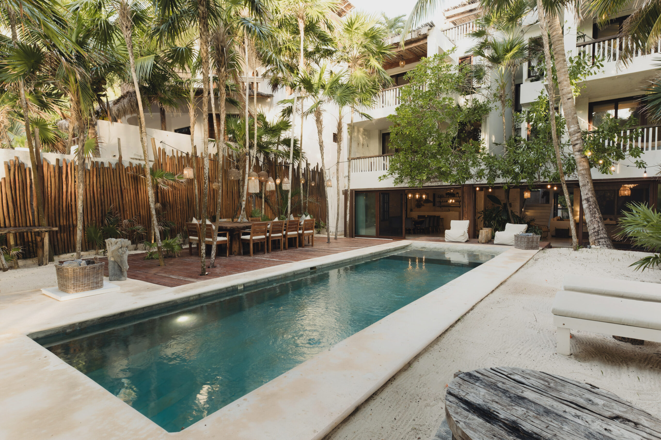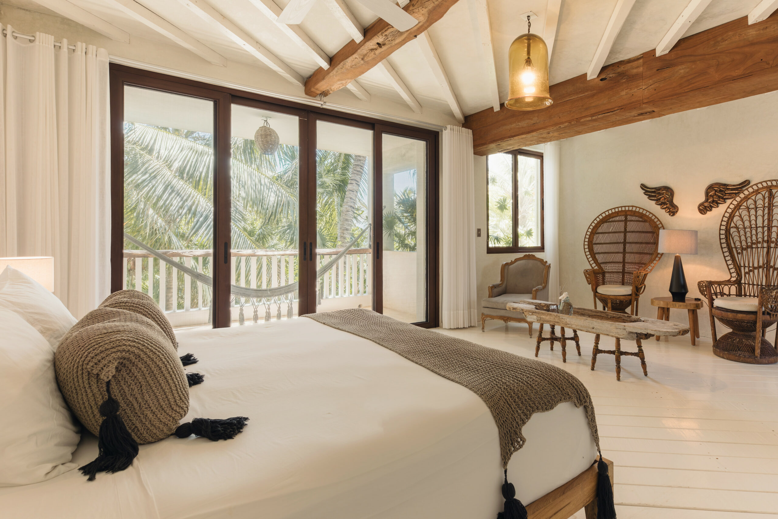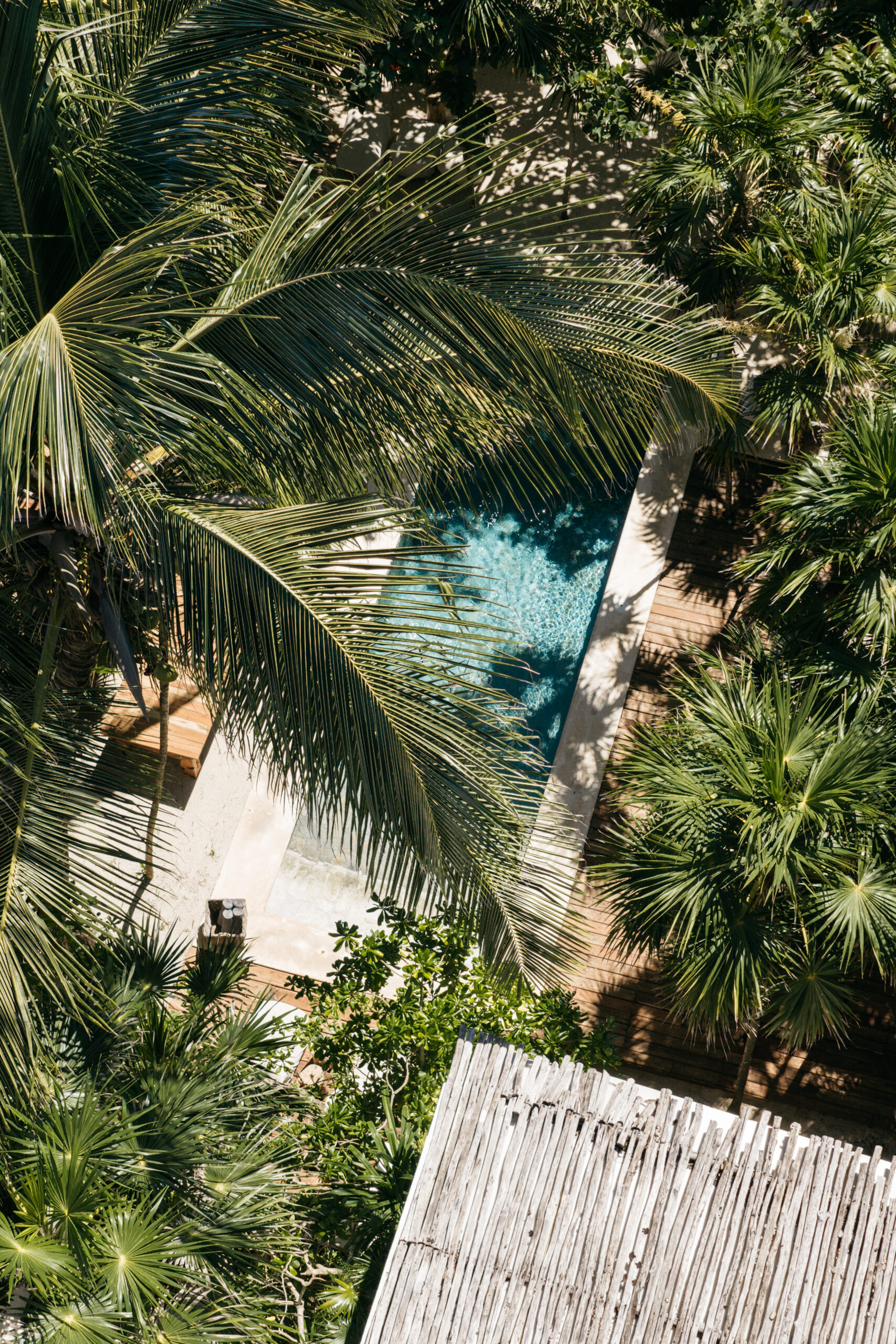 The bocce court, ping pong table, and pool table make Villa La Semilla one of the most activity-rich villas in Soliman Bay — genuinely suited to multi-family trips and group buyouts where different generations need different things. The rooftop plunge pool with its palapa shade and 270-degree views of jungle and ocean is the quiet counterpoint to all of it: a place where the day’s last light and a cold drink are enough. The beach at Soliman Bay has no vendors, no crowds, and no seaweed — just palm shadows and calm Caribbean water.