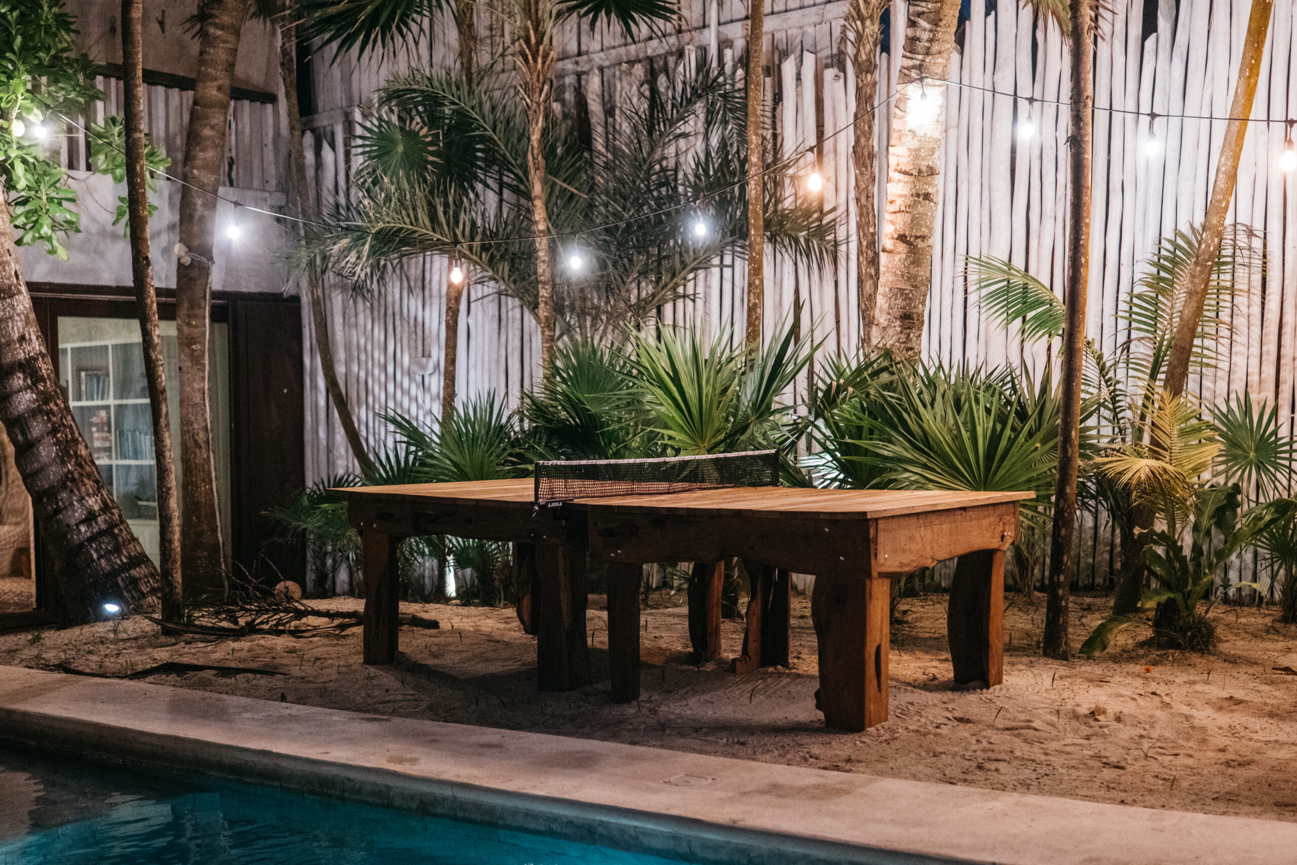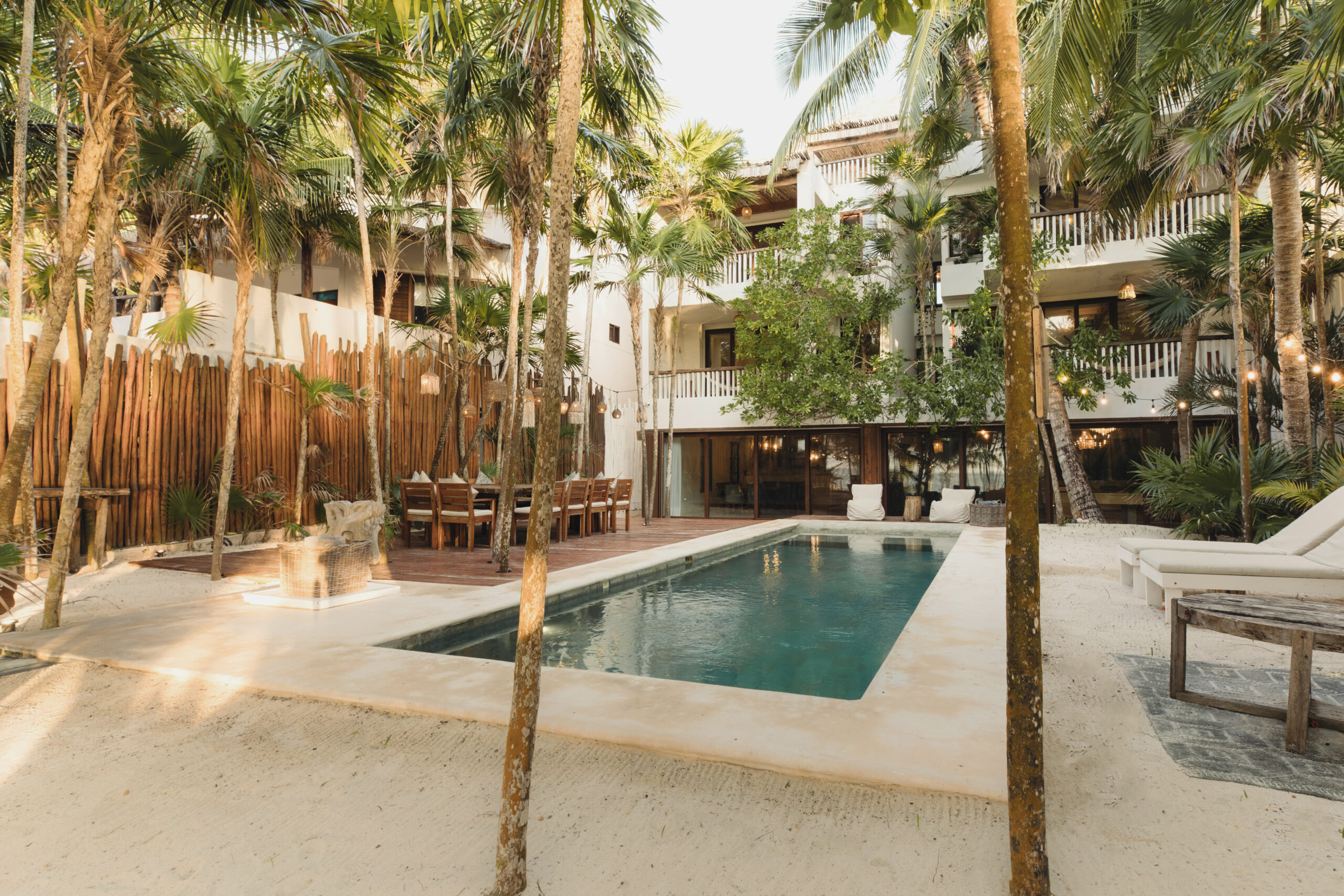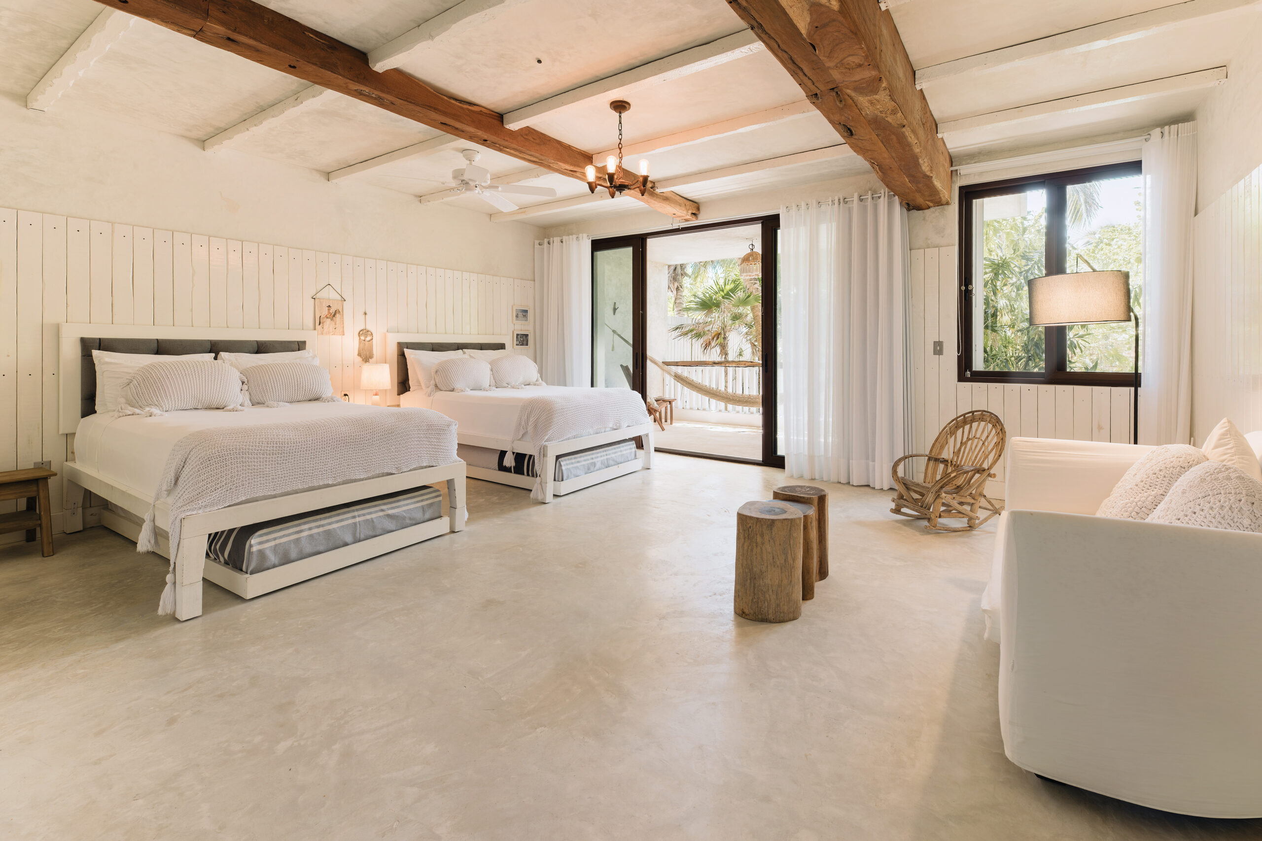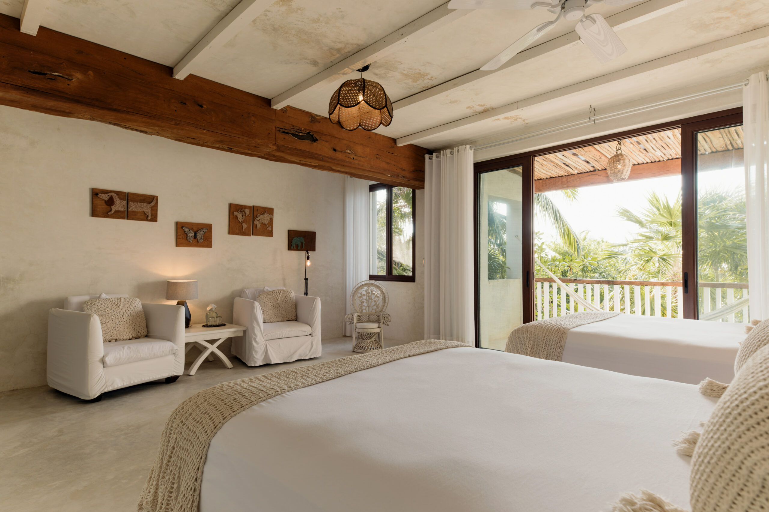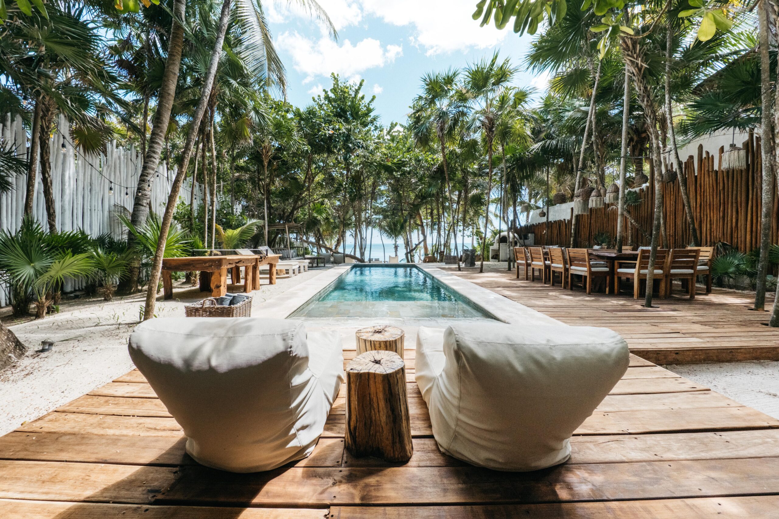 The bocce court, ping pong table, and pool table make Villa La Semilla one of the most activity-rich villas in Soliman Bay — genuinely suited to multi-family trips and group buyouts where different generations need different things. The rooftop plunge pool with its palapa shade and 270-degree views of jungle and ocean is the quiet counterpoint to all of it: a place where the day’s last light and a cold drink are enough. The beach at Soliman Bay has no vendors, no crowds, and no seaweed — just palm shadows and calm Caribbean water.