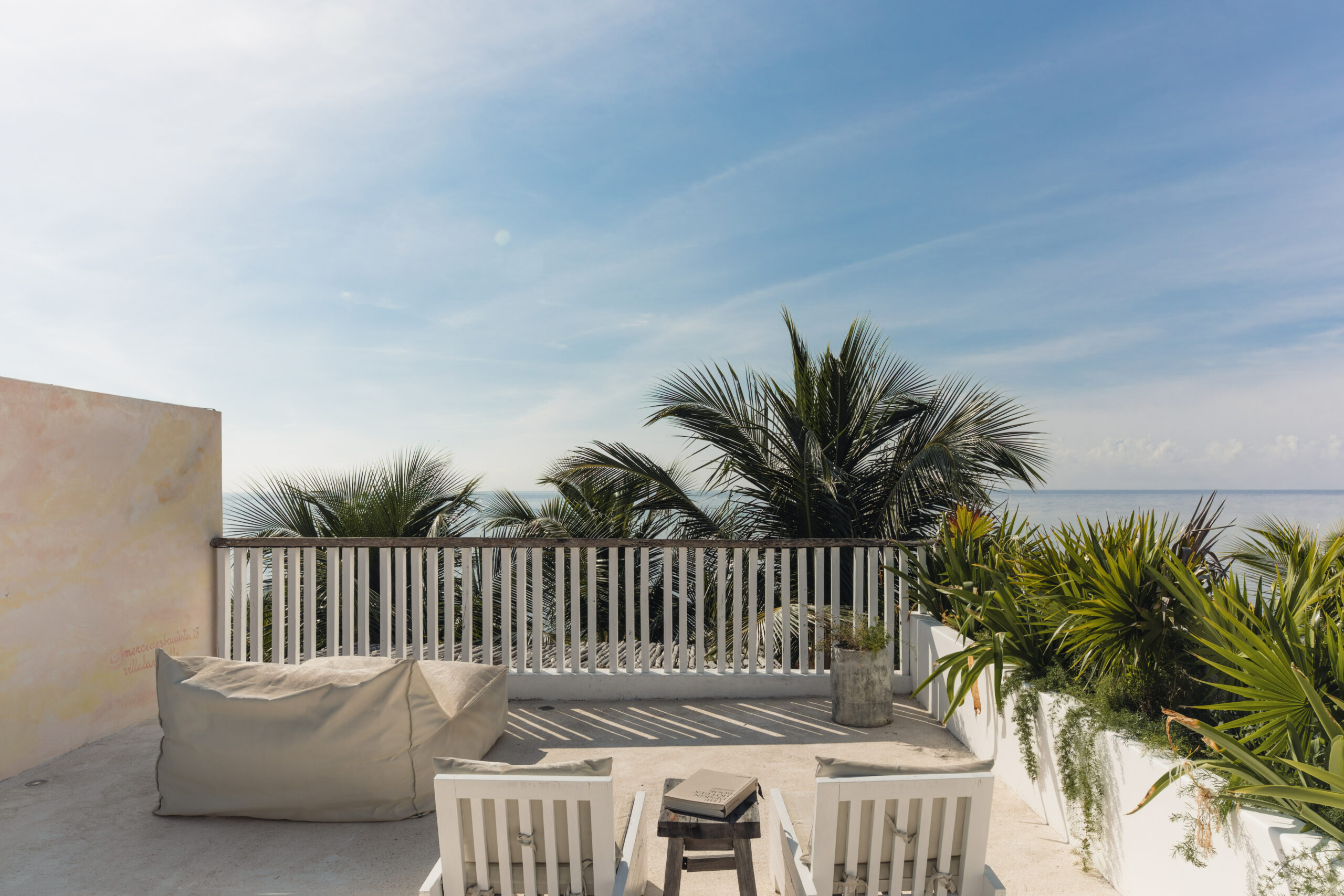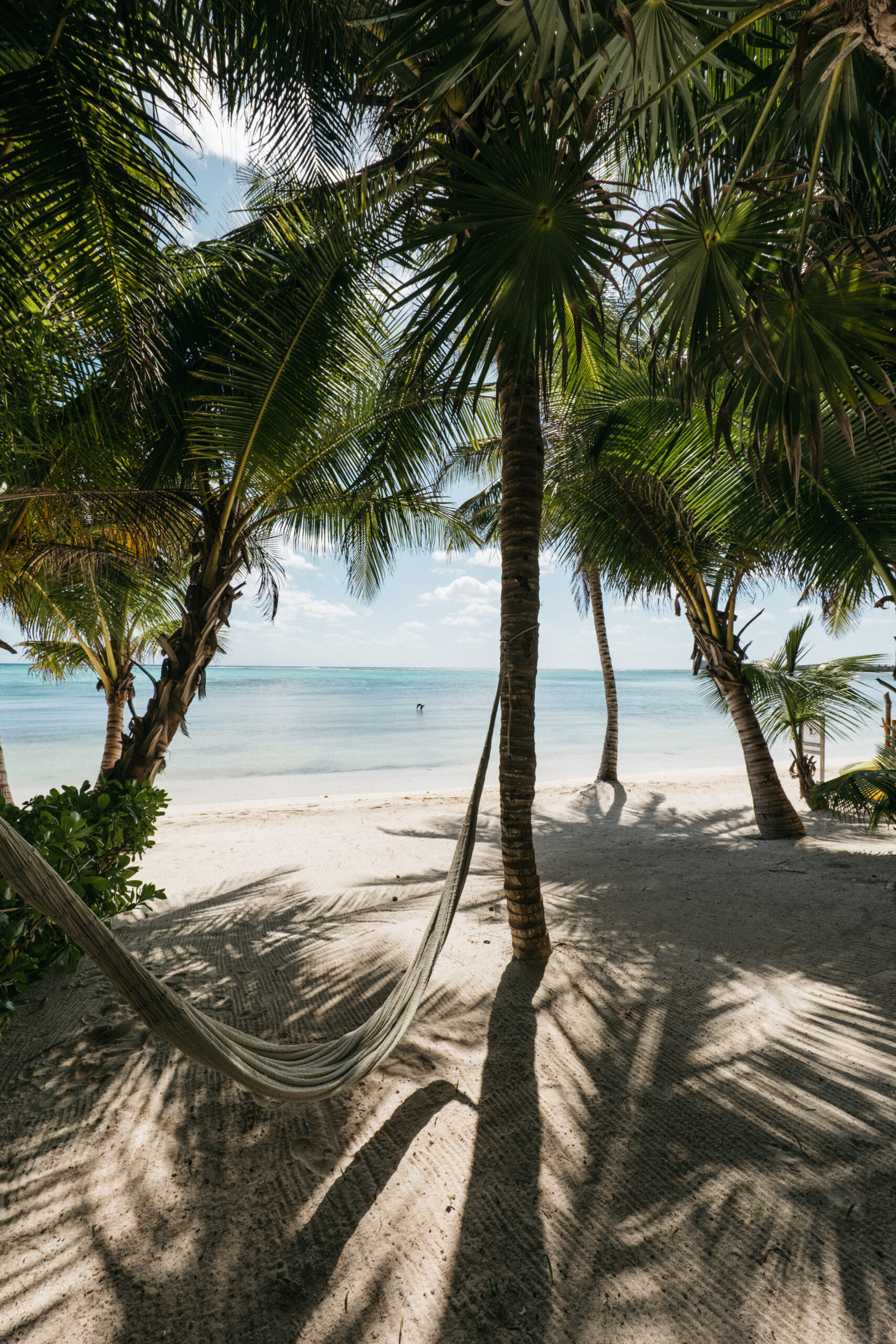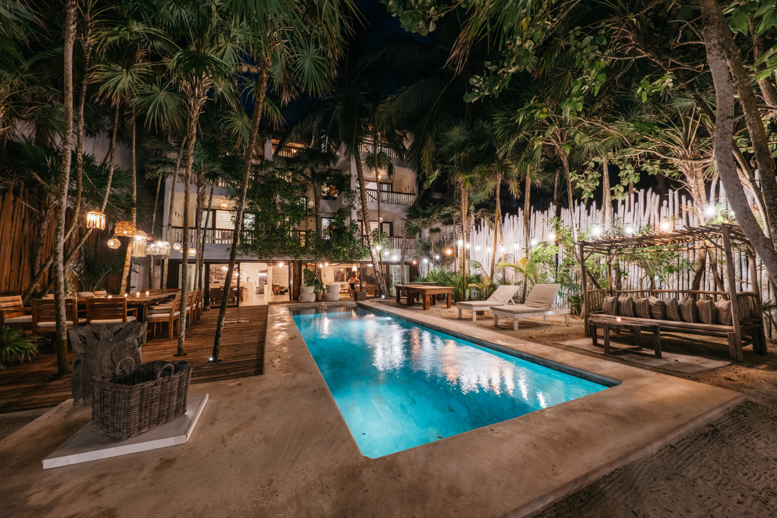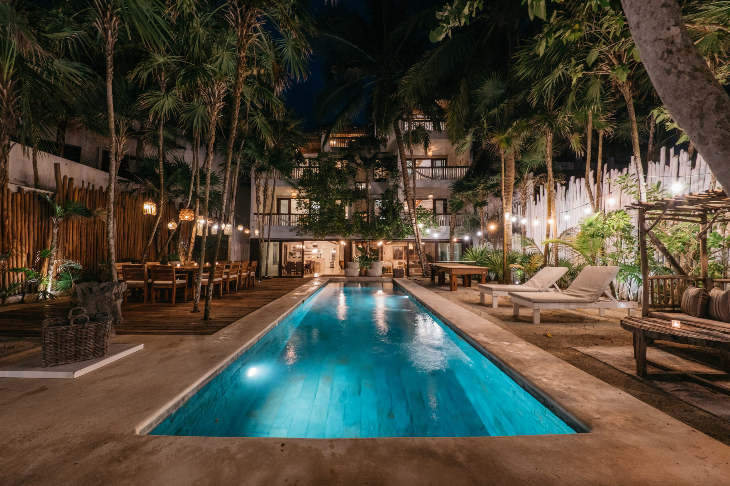 The bocce court, ping pong table, and pool table make Villa La Semilla one of the most activity-rich villas in Soliman Bay — genuinely suited to multi-family trips and group buyouts where different generations need different things. The rooftop plunge pool with its palapa shade and 270-degree views of jungle and ocean is the quiet counterpoint to all of it: a place where the day’s last light and a cold drink are enough. The beach at Soliman Bay has no vendors, no crowds, and no seaweed — just palm shadows and calm Caribbean water.