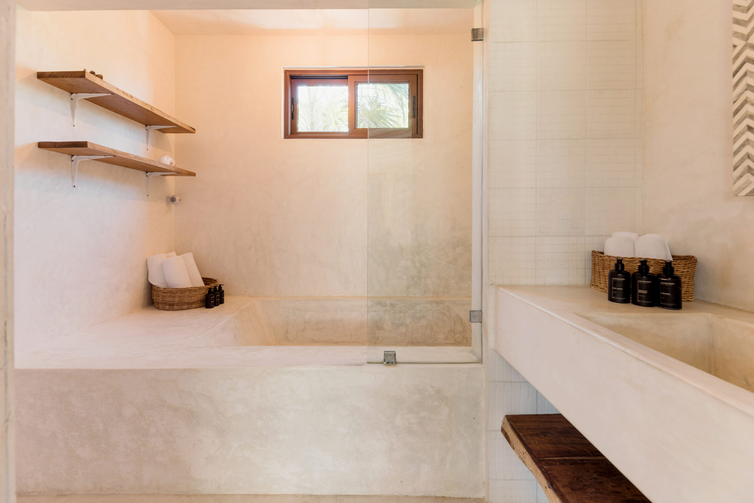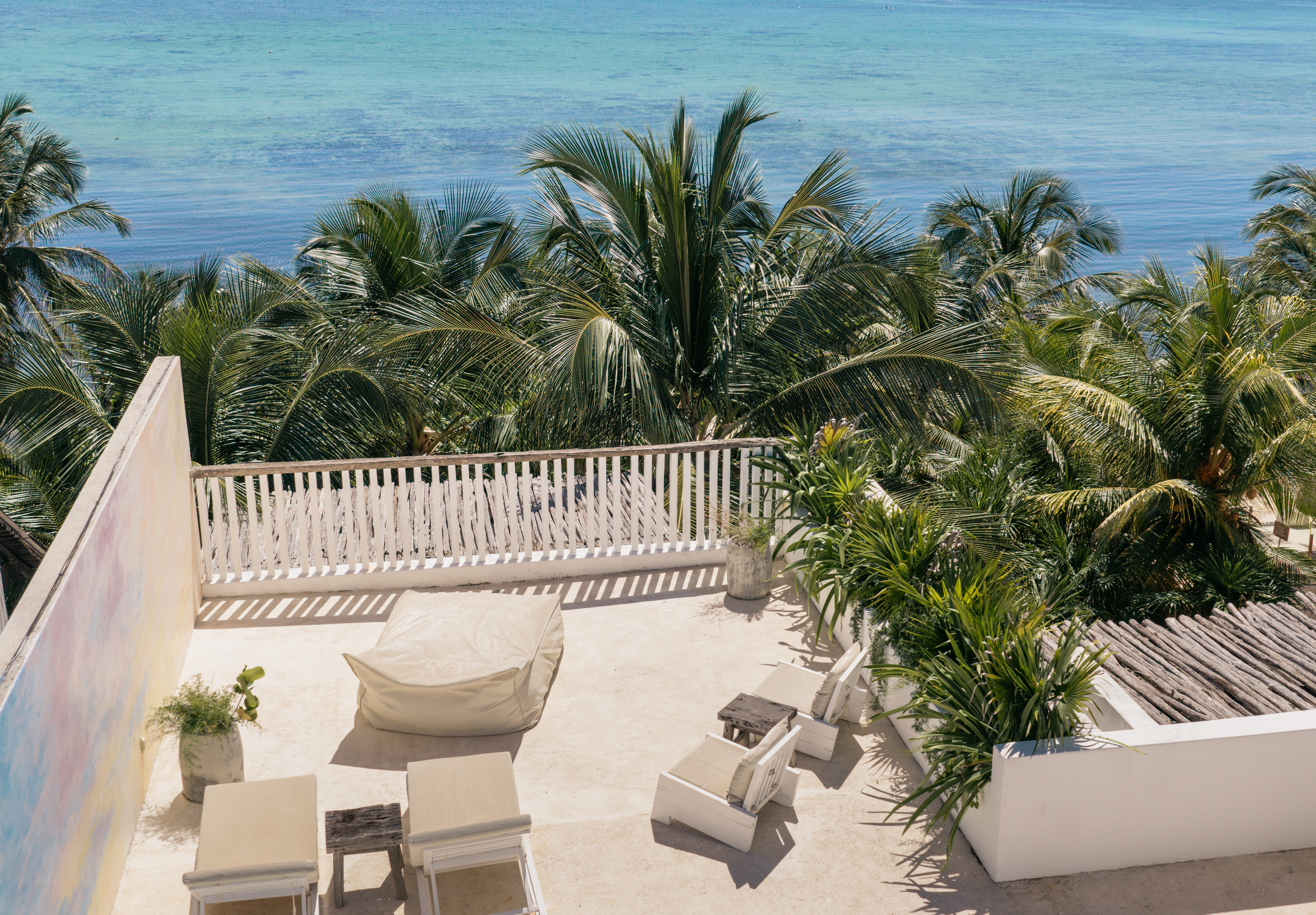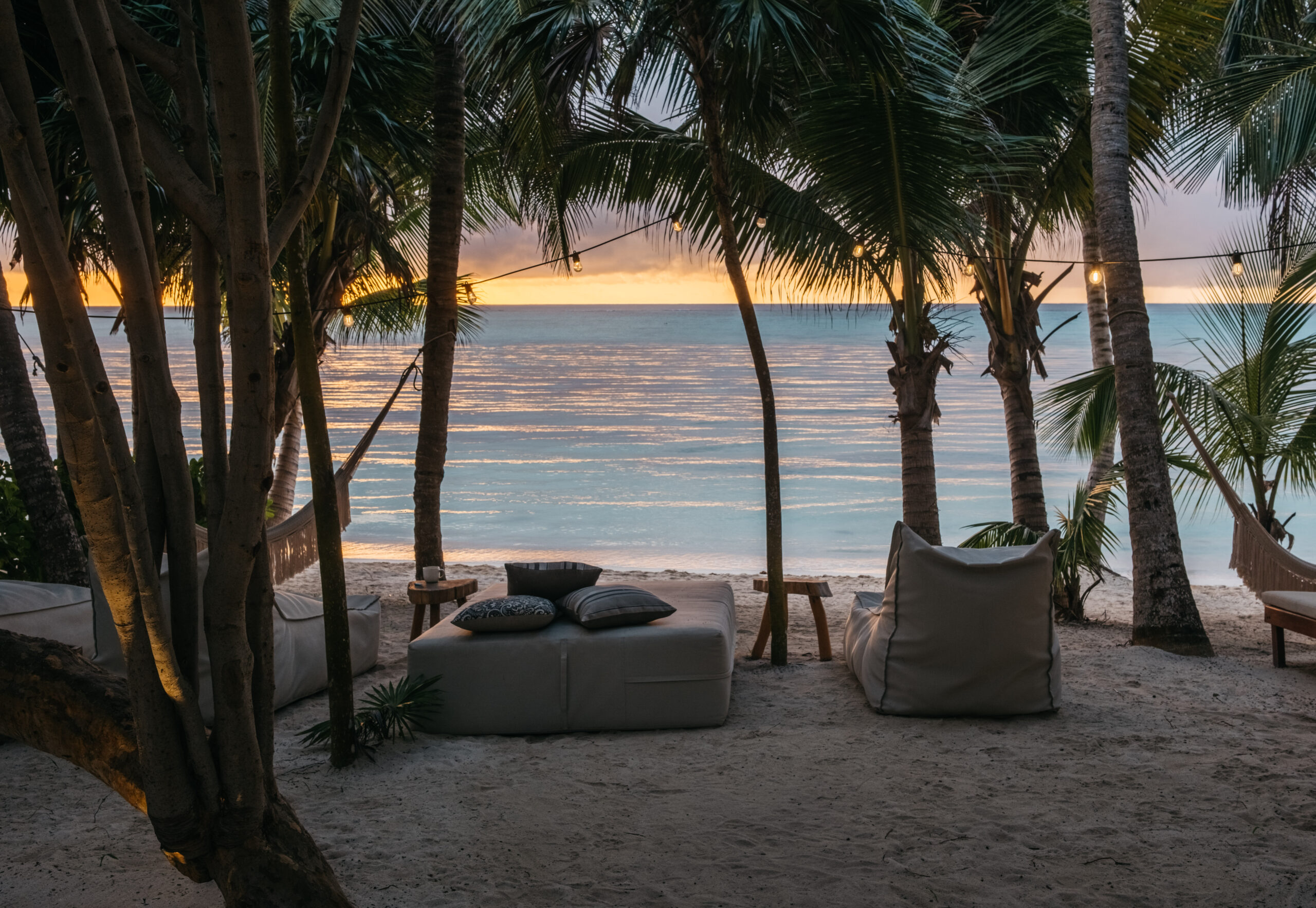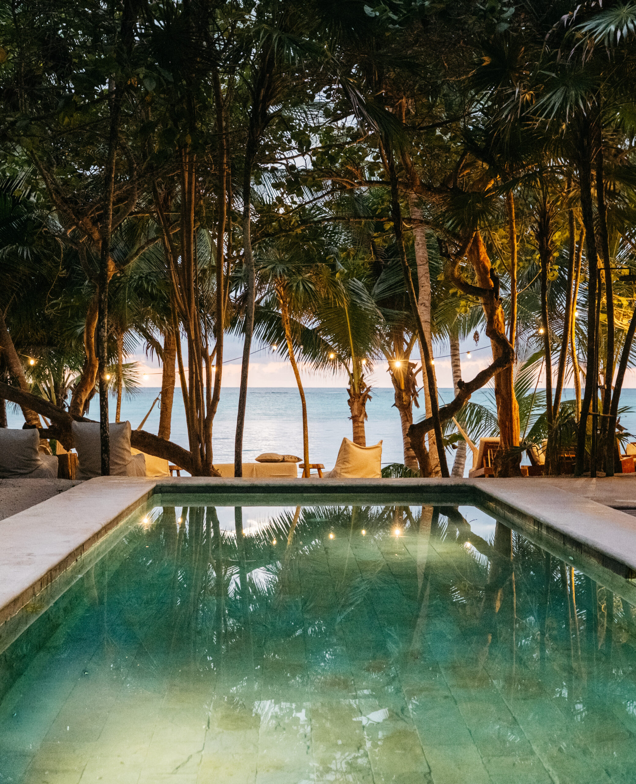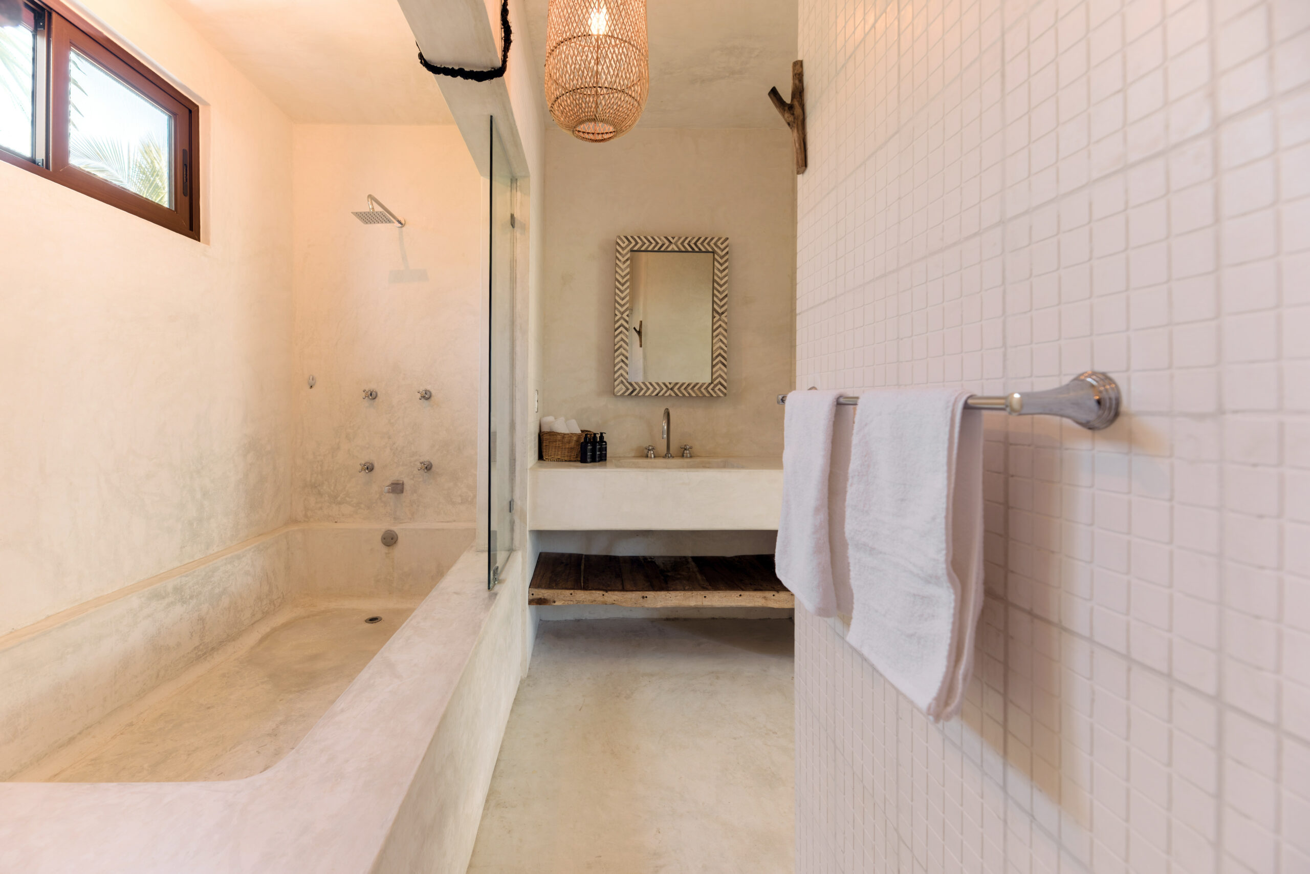 The bocce court, ping pong table, and pool table make Villa La Semilla one of the most activity-rich villas in Soliman Bay — genuinely suited to multi-family trips and group buyouts where different generations need different things. The rooftop plunge pool with its palapa shade and 270-degree views of jungle and ocean is the quiet counterpoint to all of it: a place where the day’s last light and a cold drink are enough. The beach at Soliman Bay has no vendors, no crowds, and no seaweed — just palm shadows and calm Caribbean water.
