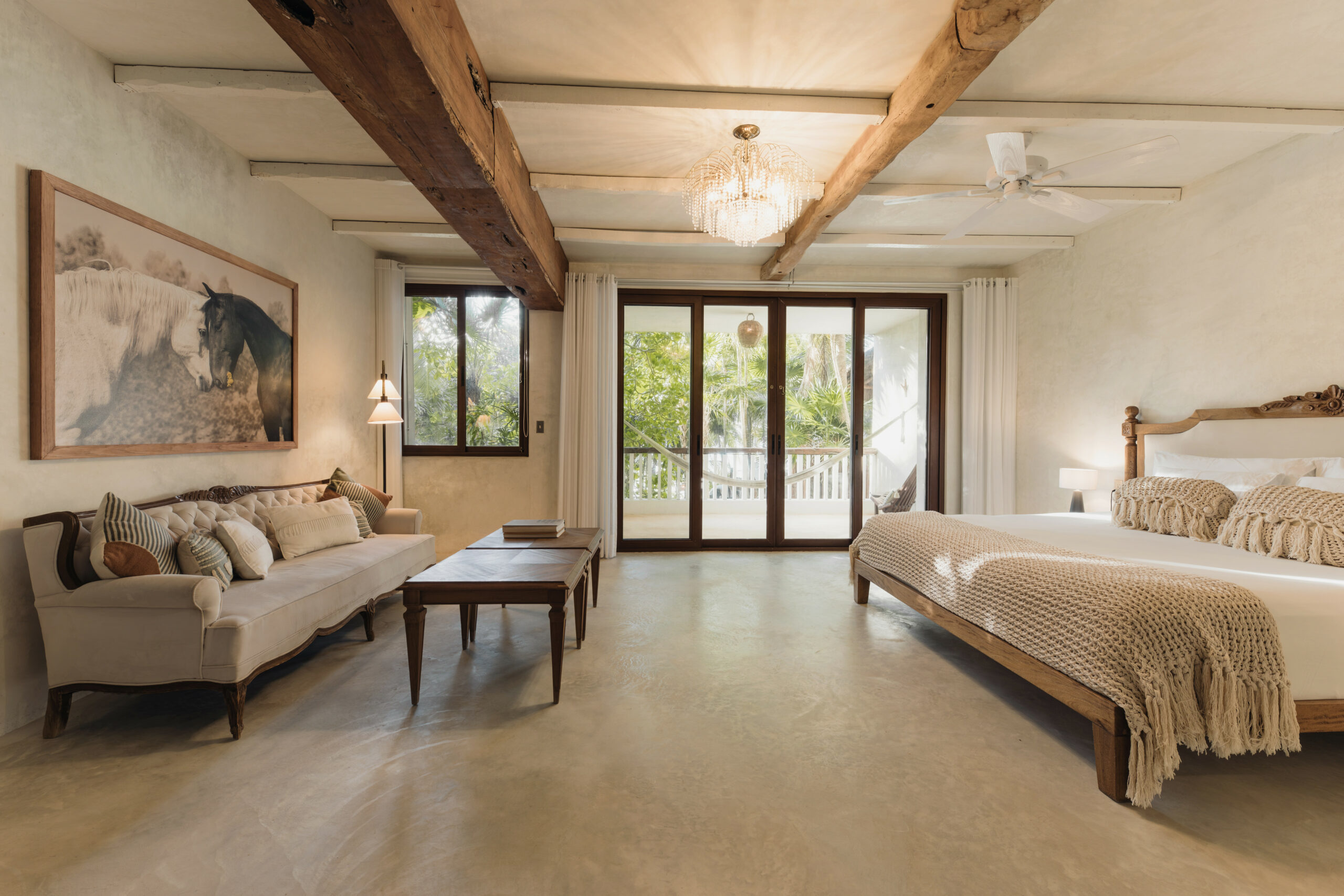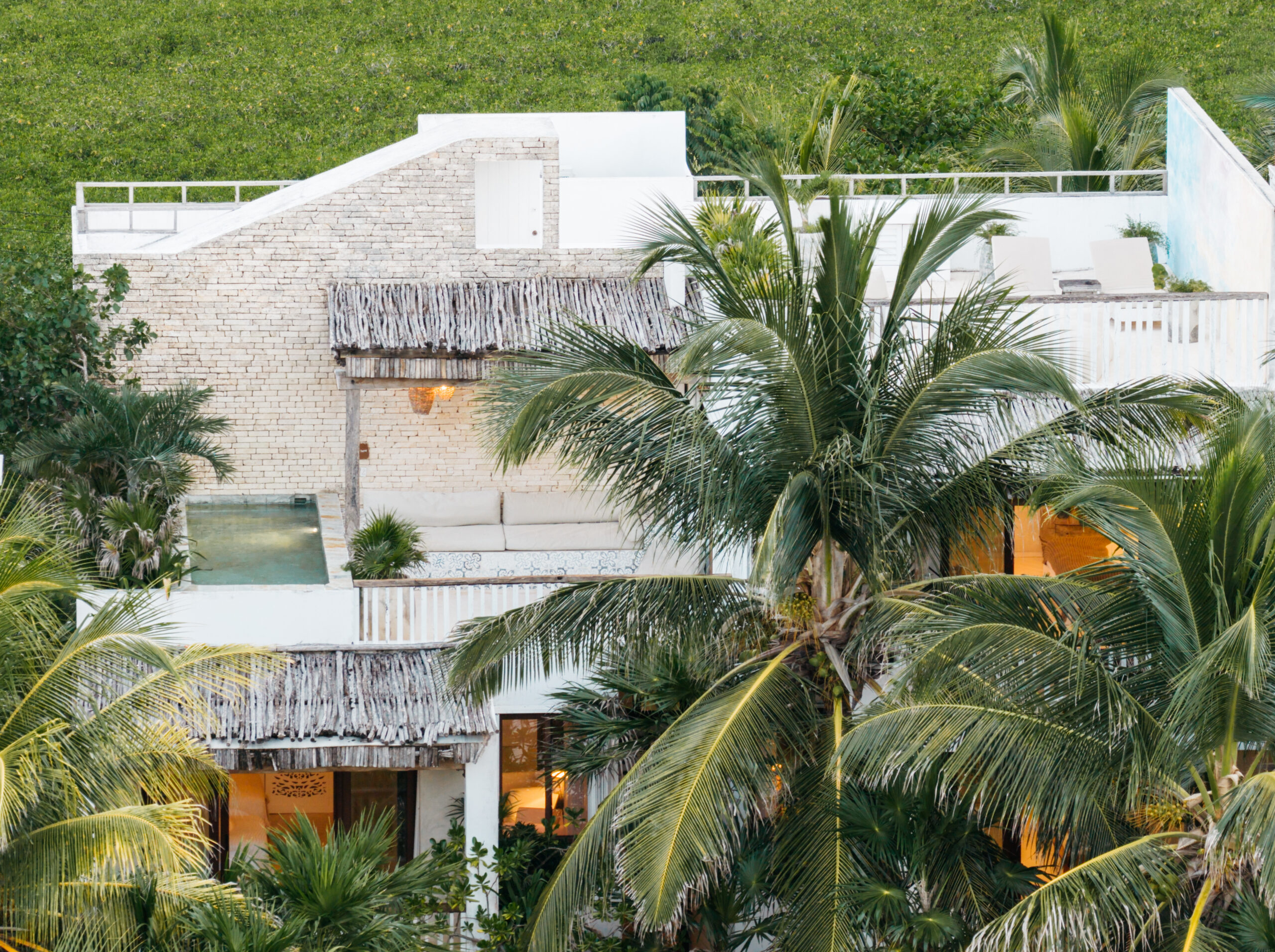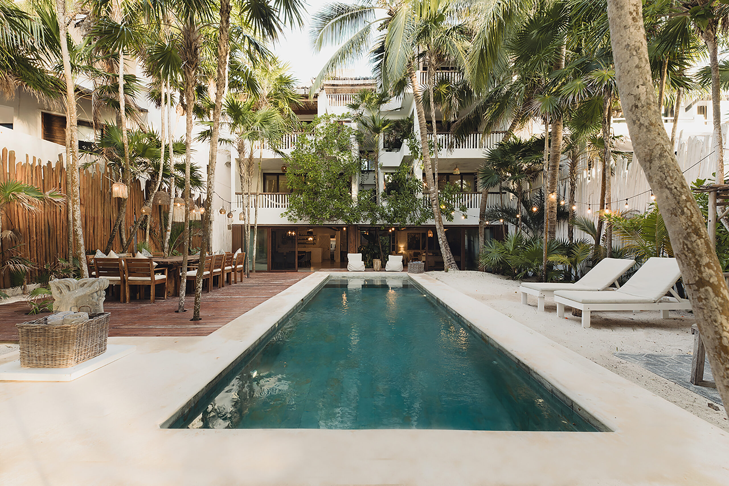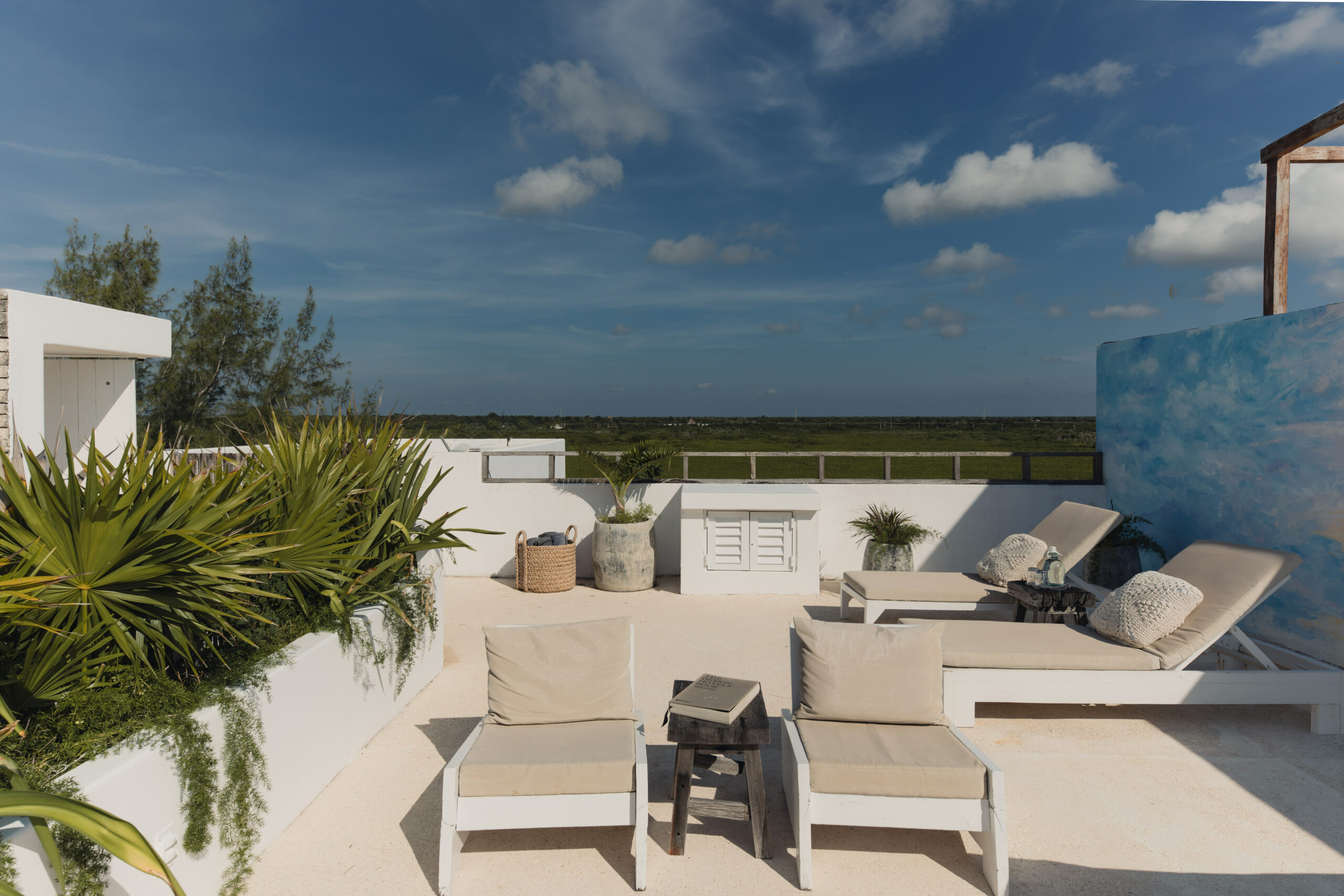 The bocce court, ping pong table, and pool table make Villa La Semilla one of the most activity-rich villas in Soliman Bay — genuinely suited to multi-family trips and group buyouts where different generations need different things. The rooftop plunge pool with its palapa shade and 270-degree views of jungle and ocean is the quiet counterpoint to all of it: a place where the day’s last light and a cold drink are enough. The beach at Soliman Bay has no vendors, no crowds, and no seaweed — just palm shadows and calm Caribbean water.