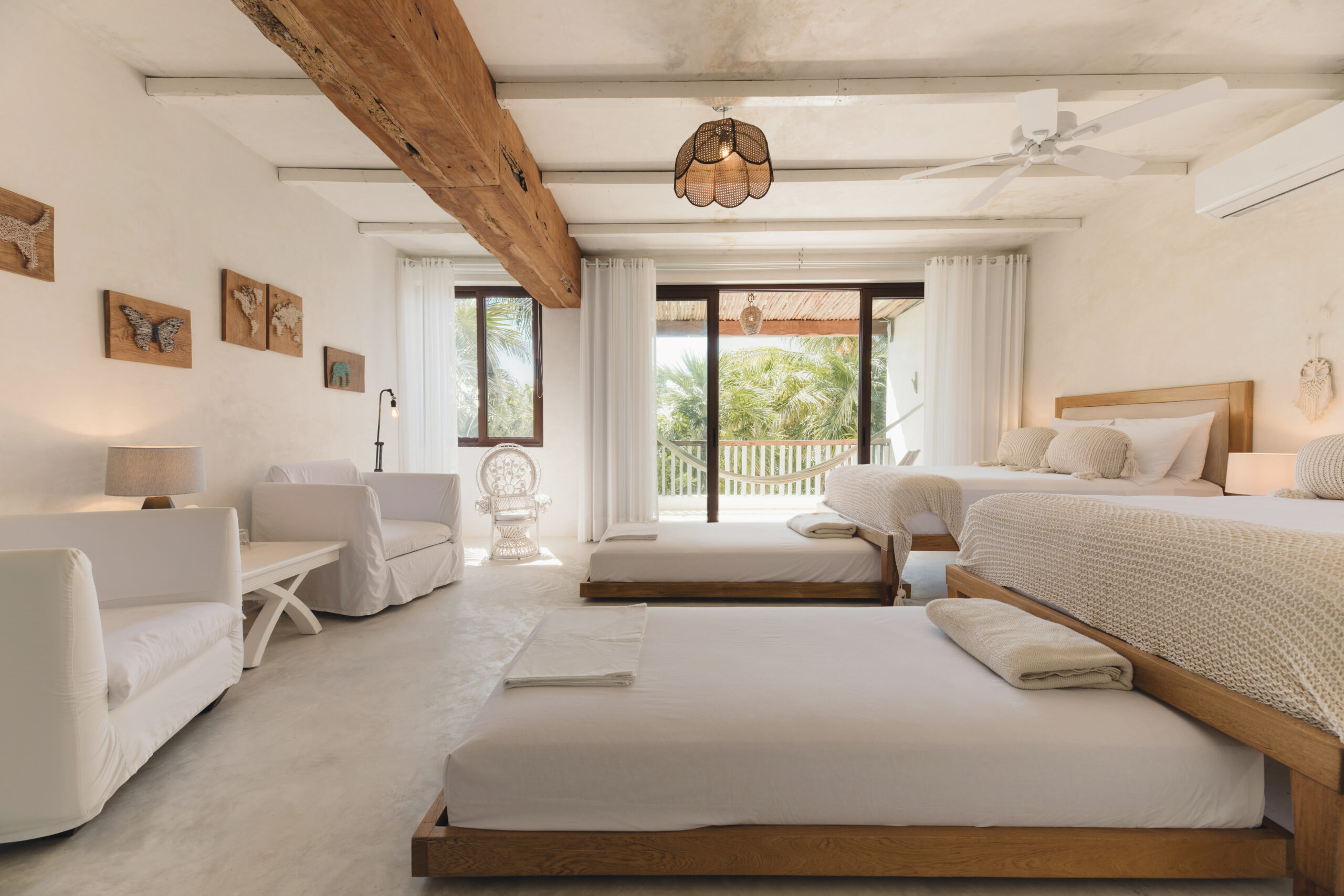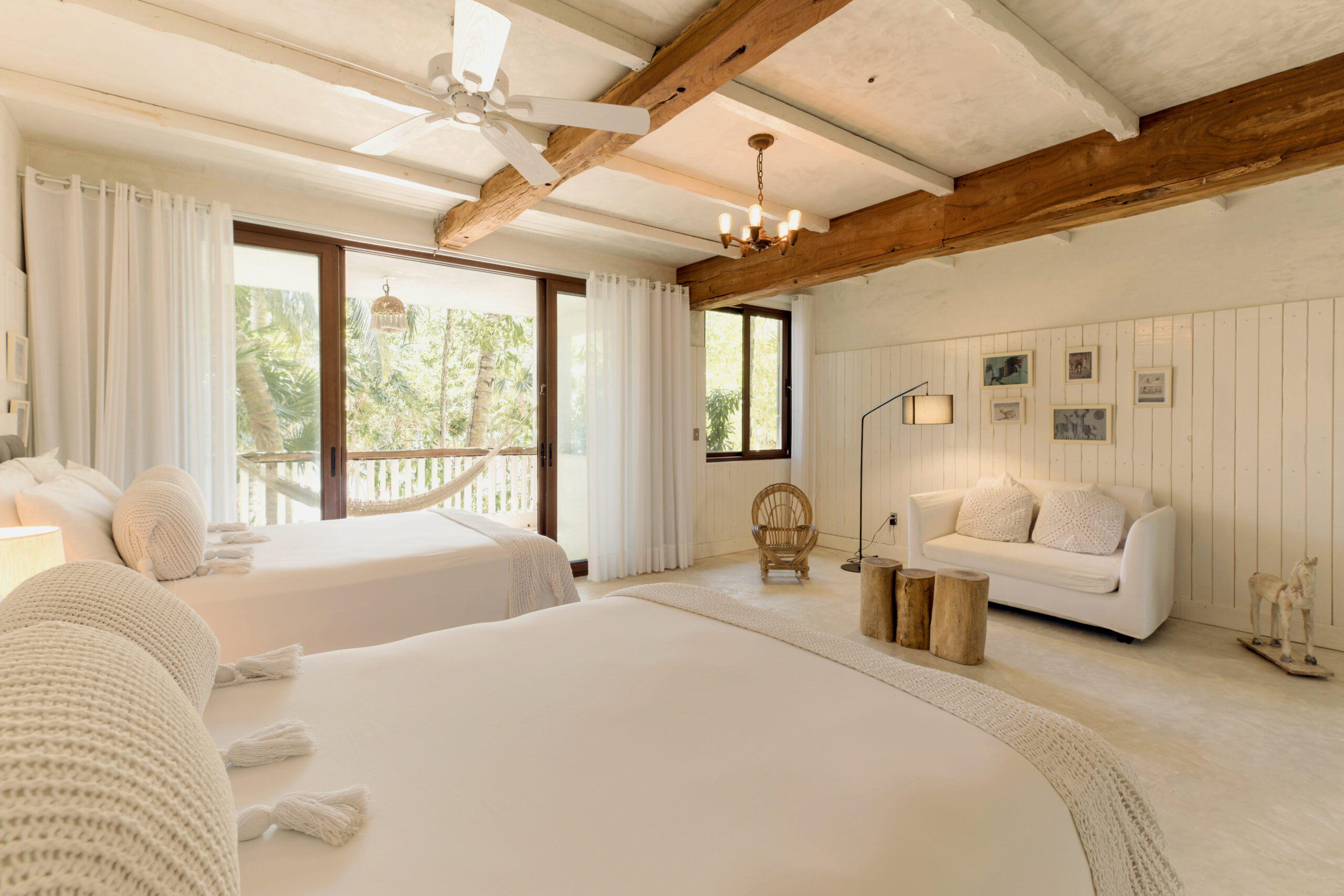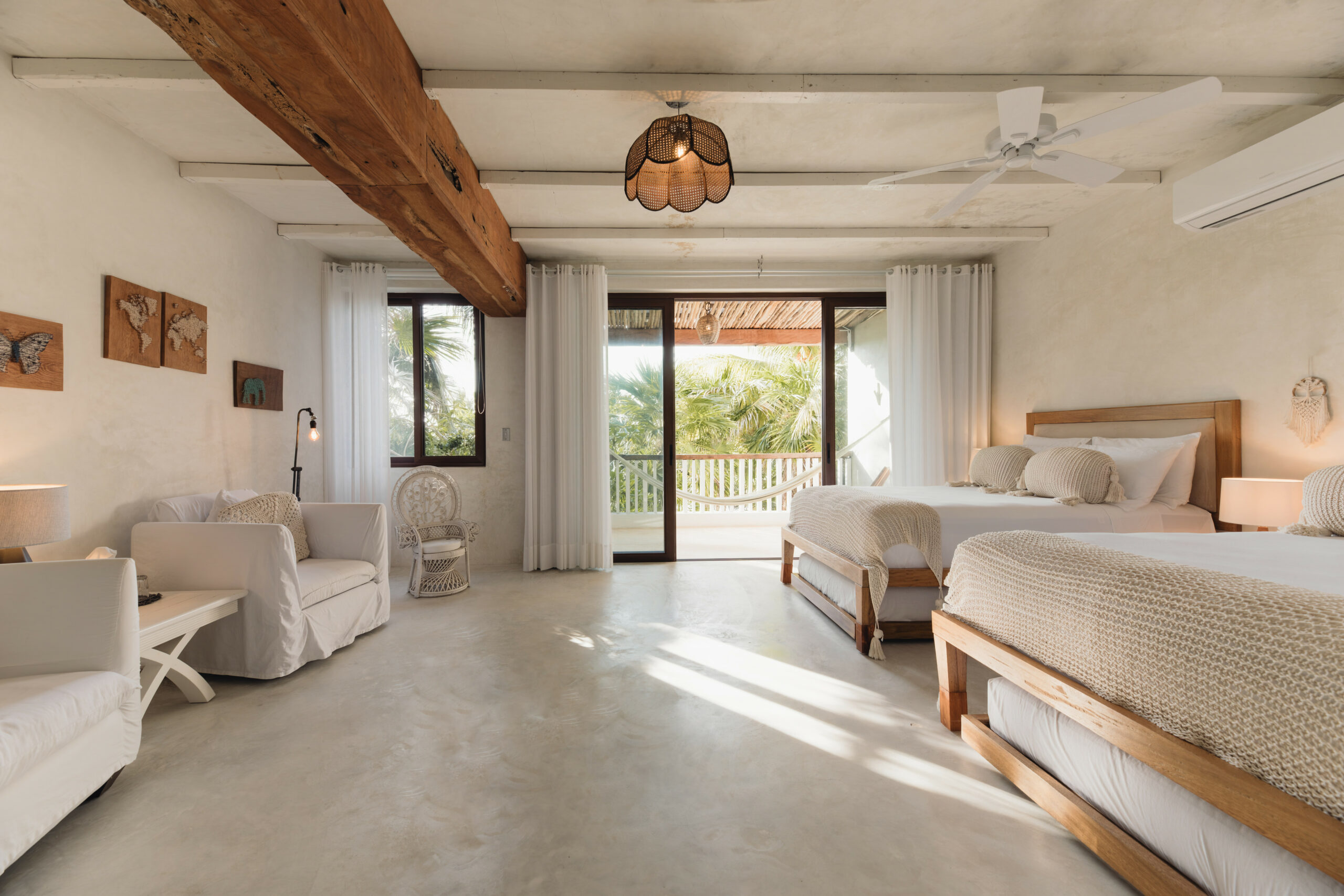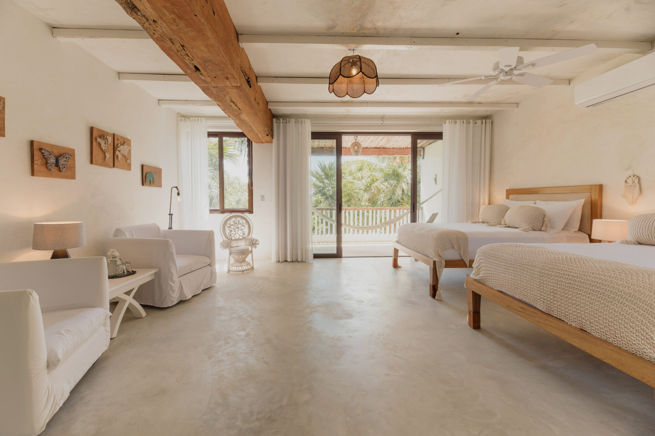 Two double beds and one extra single bed, air conditioning, blackout shades, ceiling fan, ensuite bathroom with bathtub and shower, hairdryer, hammock, ocean views with private terrace, safety box, toiletries, window screen
