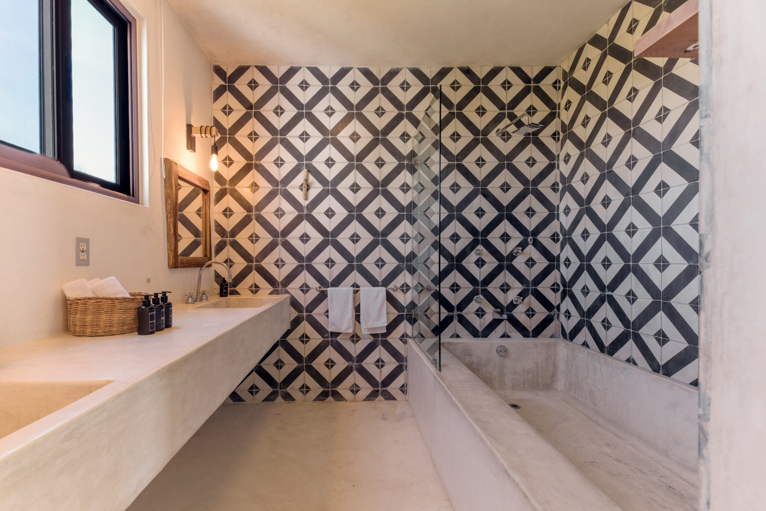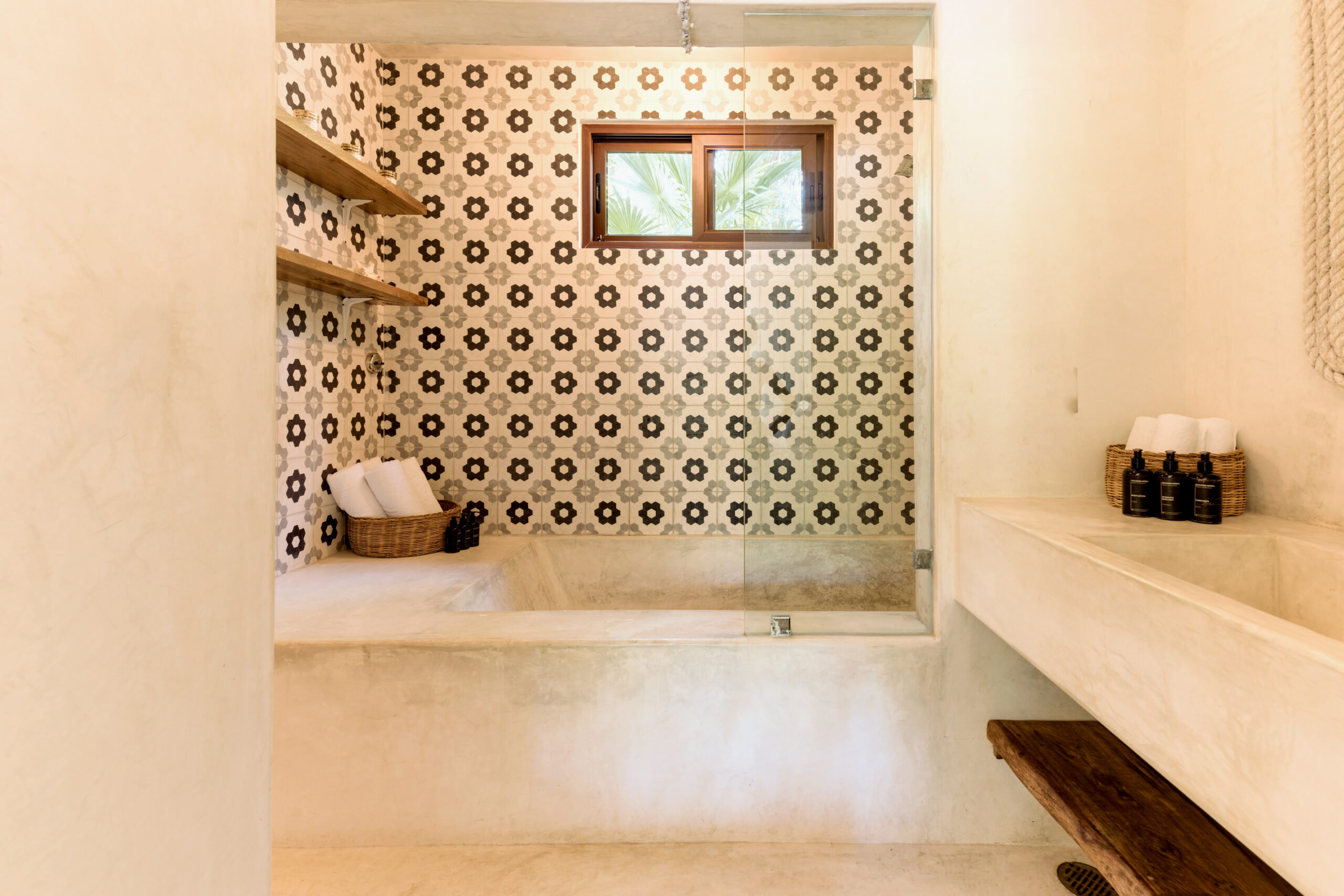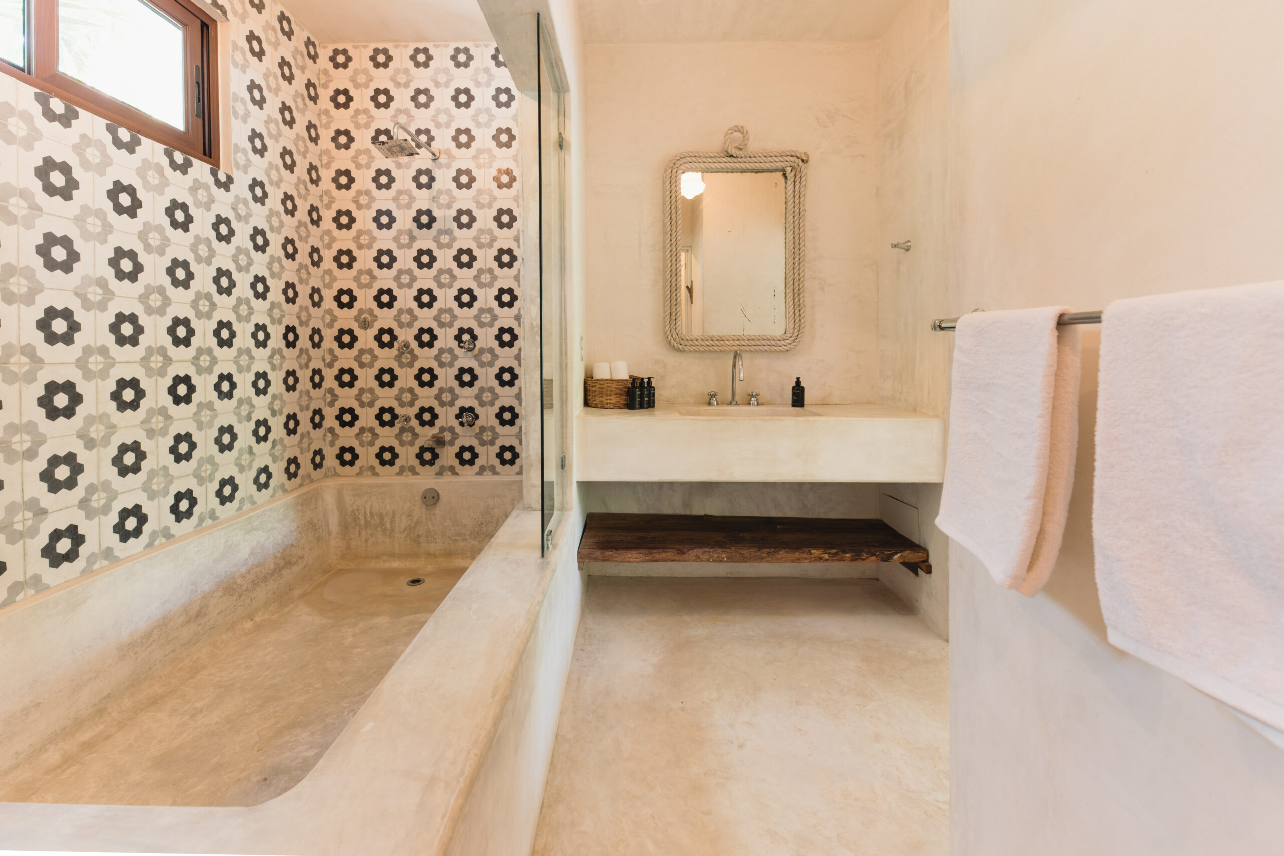 The five bedrooms are spread across the three levels, sleeping up to 16 guests in a mix of king beds, queen beds, and multi-bed configurations. Each bedroom has carved wood headboards or peacock chairs, hammock balconies, and ensuite bathrooms with patterned Talavera tile — blue geometric, black and white, florals — hand-painted and each different. Some bathrooms have freestanding concrete soaking tubs, others have rain showers with exposed wood accents.