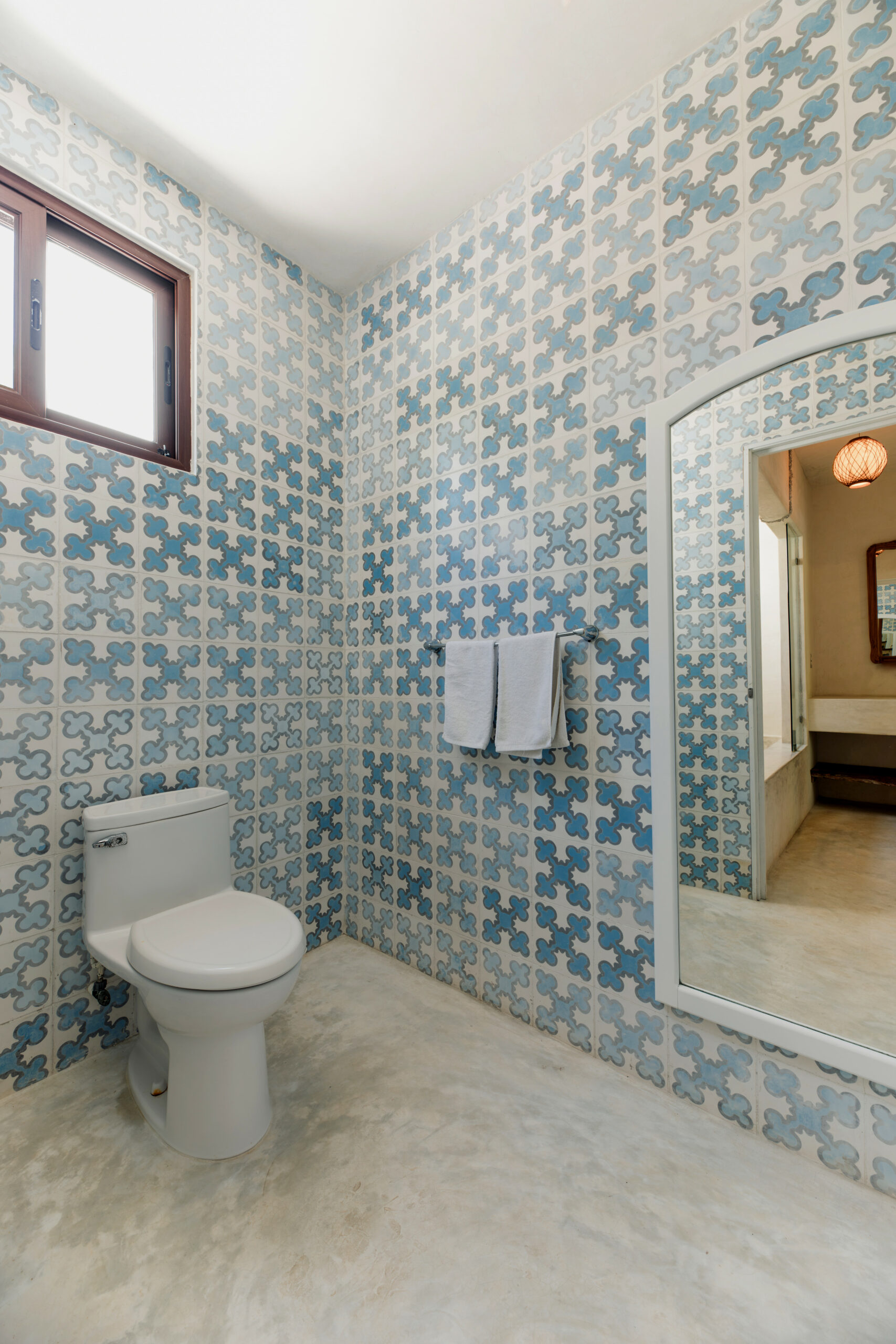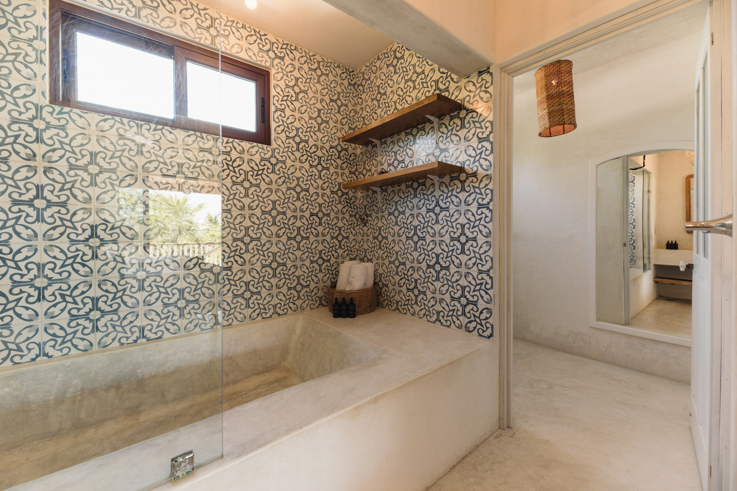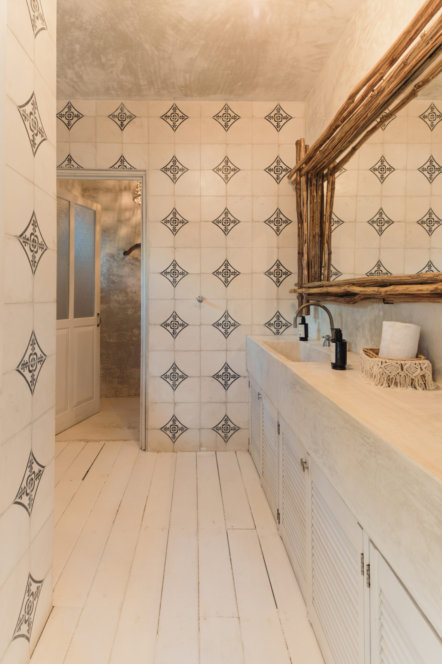 The five bedrooms are spread across the three levels, sleeping up to 16 guests in a mix of king beds, queen beds, and multi-bed configurations. Each bedroom has carved wood headboards or peacock chairs, hammock balconies, and ensuite bathrooms with patterned Talavera tile — blue geometric, black and white, florals — hand-painted and each different. Some bathrooms have freestanding concrete soaking tubs, others have rain showers with exposed wood accents.