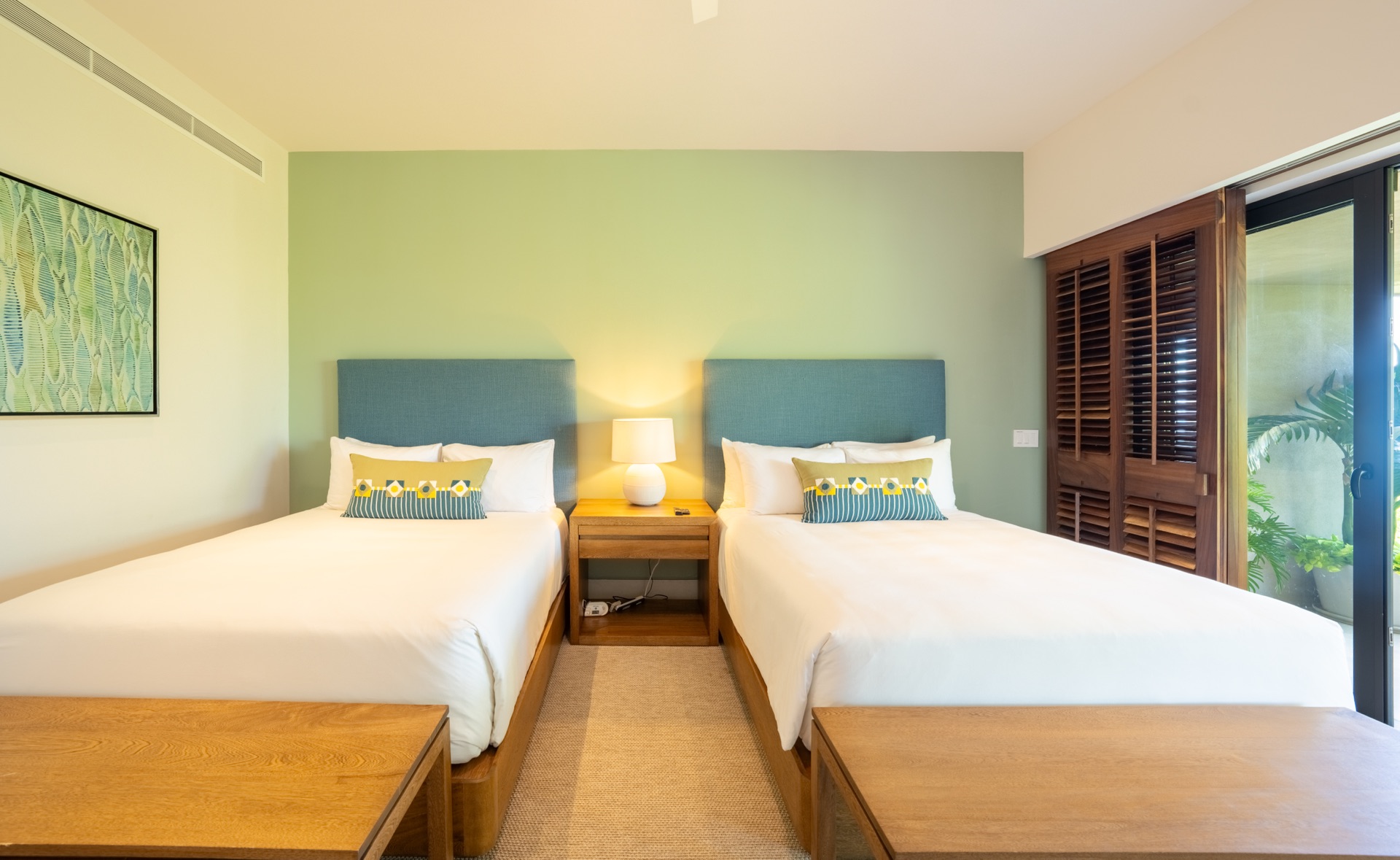 Two queen beds, full ensuite bathroom, TV, desk, air conditioning, ceiling fan