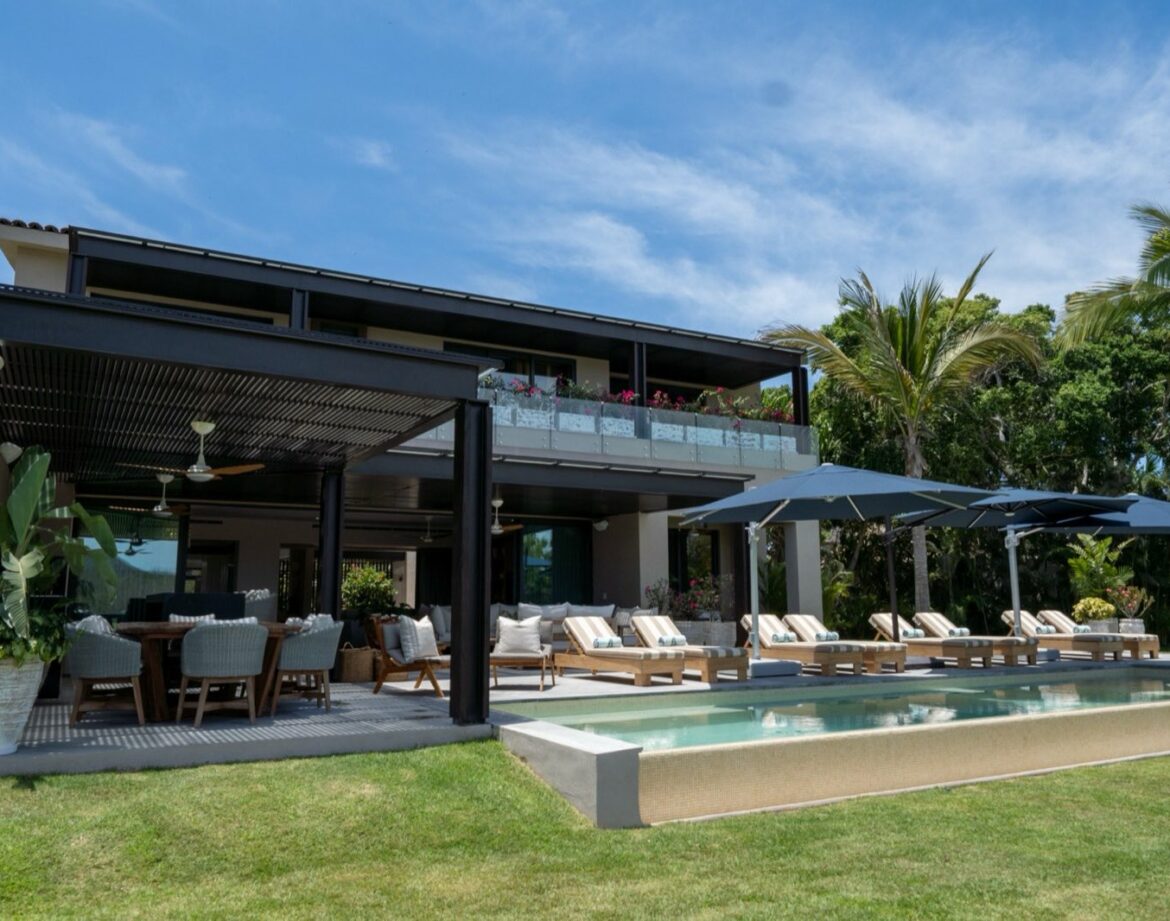 Villa Porta Fortuna 6 is a newly designed four-bedroom luxury home tucked within the exclusive Porta Fortuna enclave of Punta Mita, where contemporary elegance meets the lush tranquility of nature. This single-level residence welcomes up to eight adults and four children under twelve, offering panoramic views of the Jack Nicklaus Signature golf course, a surrounding lake, and the Sierra Madre mountains. The design blends clean architectural lines with tropical materials and textures, creating spaces that feel both luxurious and grounded — from the open-plan living areas with their warm natural tones to the private pool where mornings begin with coffee and mountain views and evenings linger over al fresco dinners in the golden hour light.